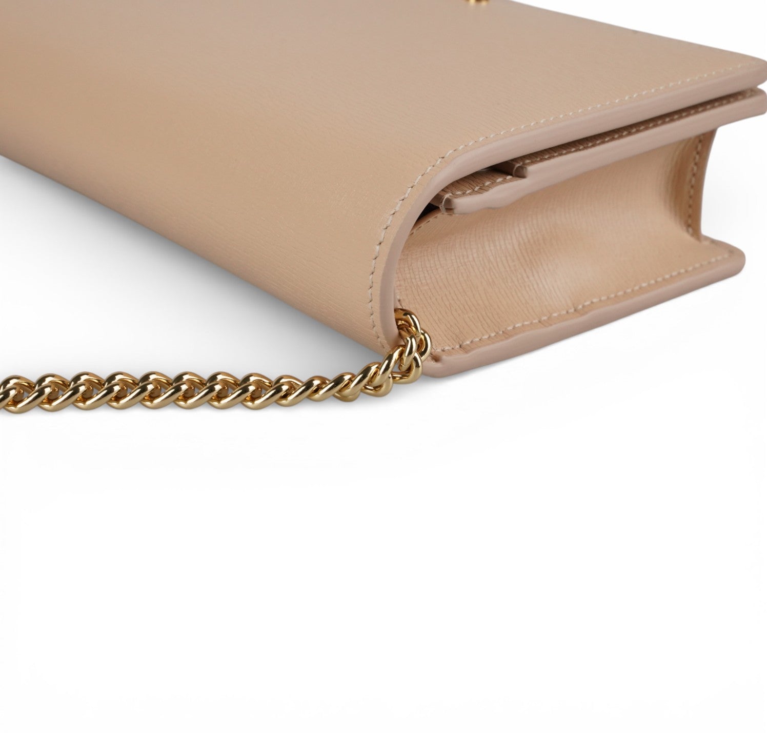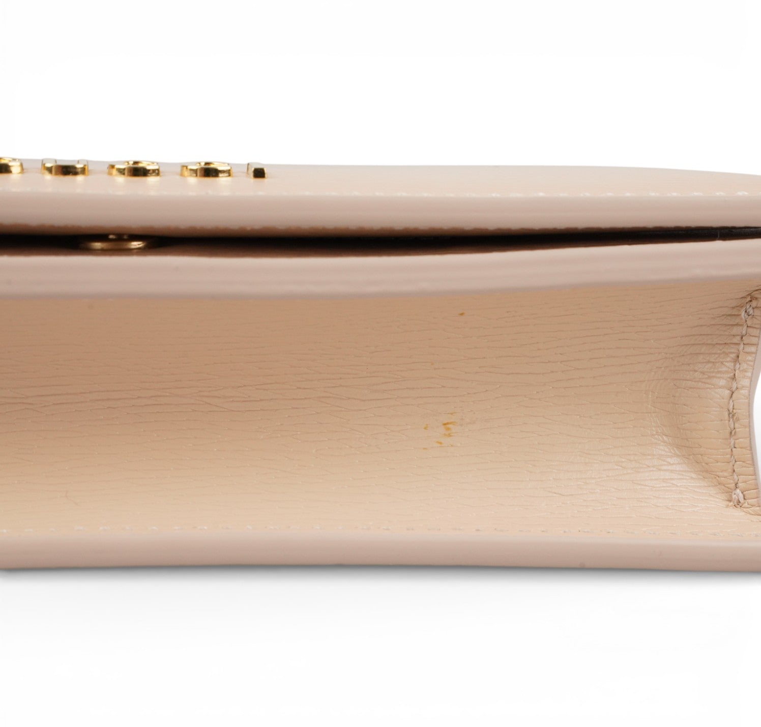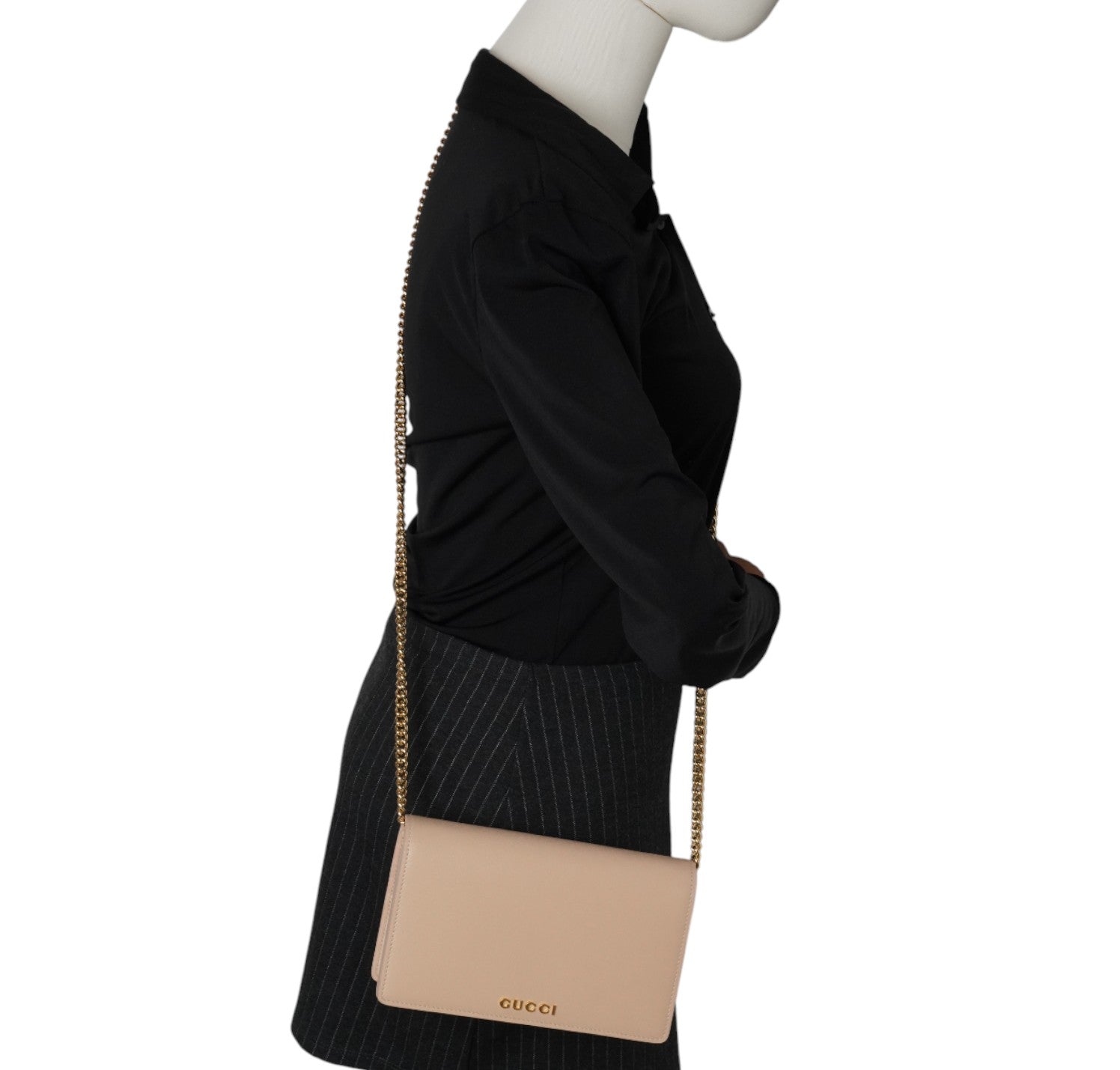 Borsa Gucci, modello Chain Wallet, realizzata in pelle martellata color Rosa Cipria. Design essenziale impreziosito da logo GUCCI applicato sul fronte in metallo color Oro. Compatta e versatile munita di catena amovibile per utilizzarla come borsa o come pochette a mano. Interno organizzato con scomparti porta carte e tasca con zip, specchietto . Nuova, mai utilizzata, presenta un micro segno di stoccaggio di sfregamento sul fondo.