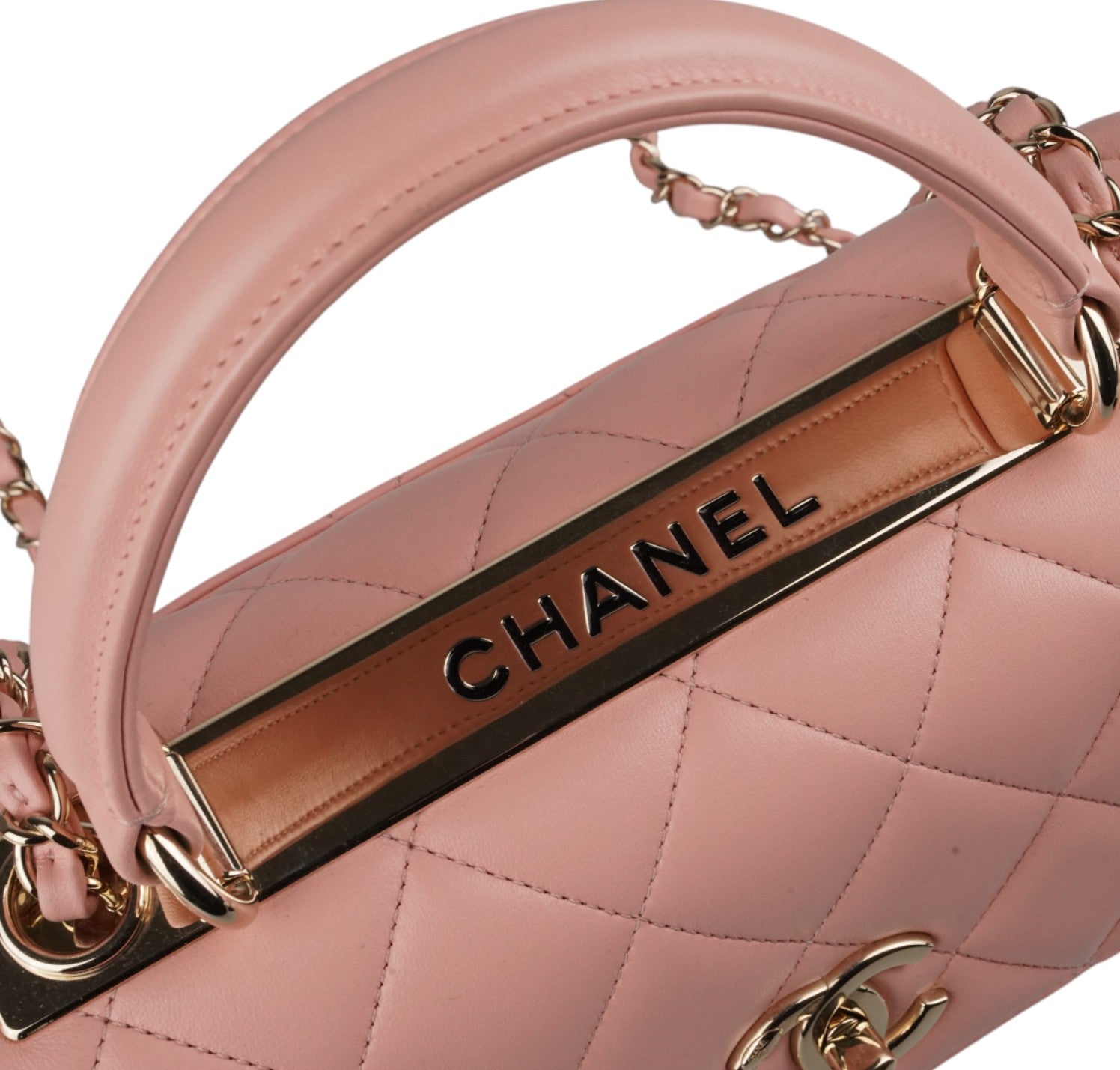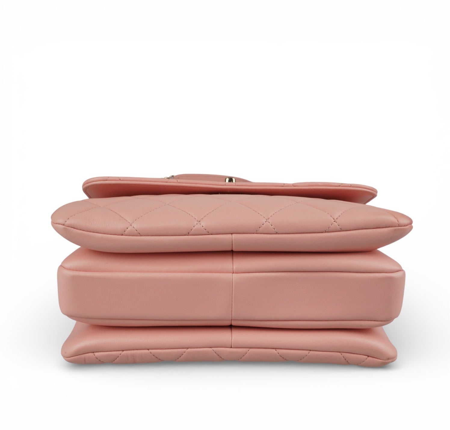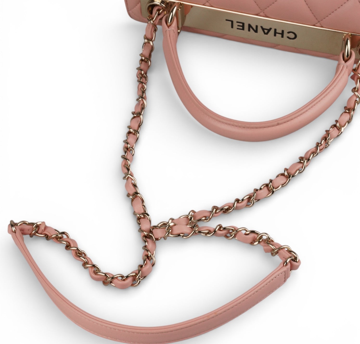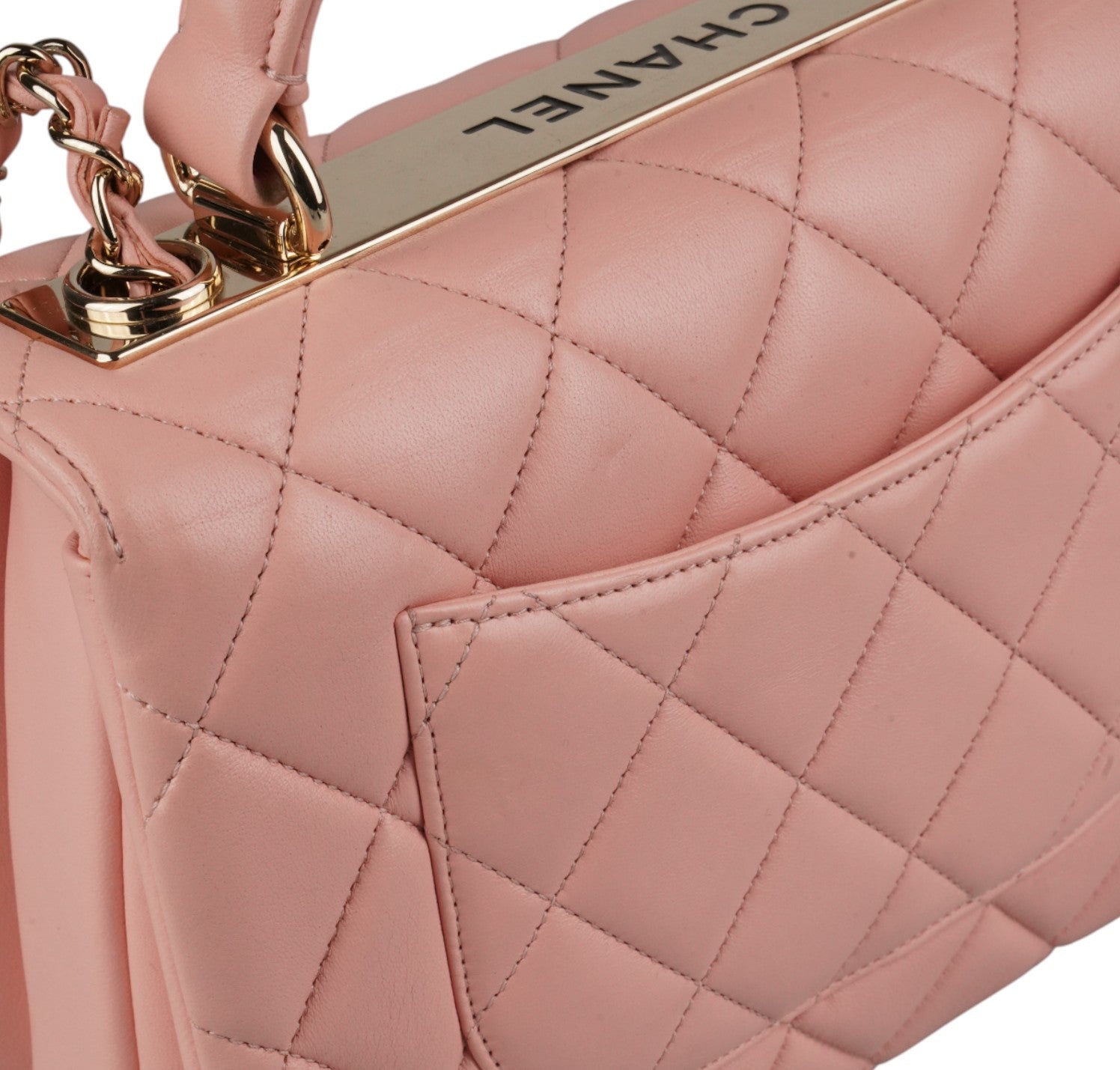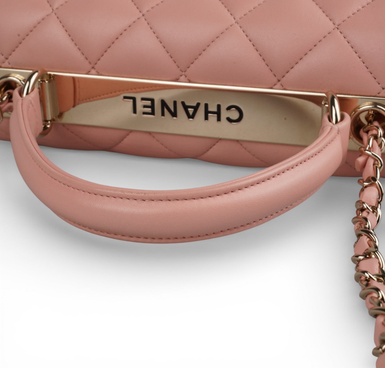 Borsa Chanel, modello Trendy CC, realizzata in Pelle Rosa. Finiture in metallo dorato. Metalleria con placca superiore incisa. Chiusura con patta anteriore e turn-lock CC. Interno foderato in pelle, suddiviso in scomparti. Munita di manico superiore rigido e tracolla in pelle con catena. Con sticker interno e card coordinata. Presenta minimi segni di pressione sotto la patta e lievi graffi generali. Minimi segni metalleria.