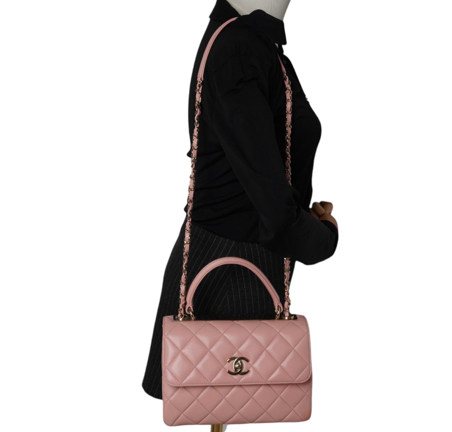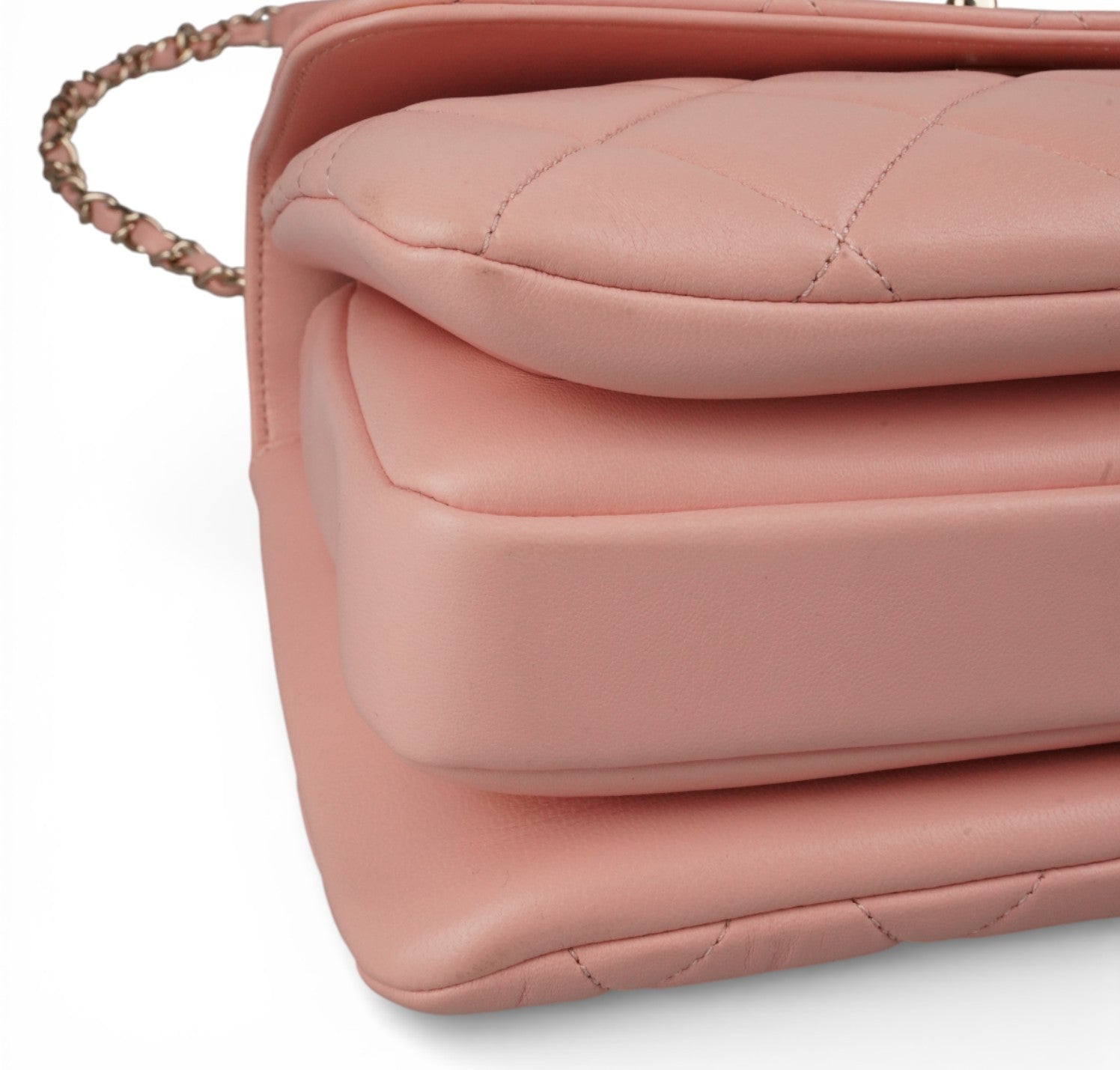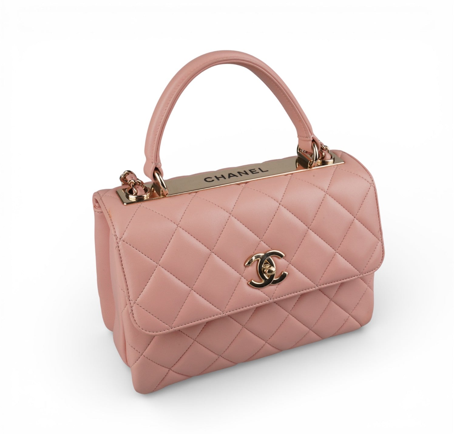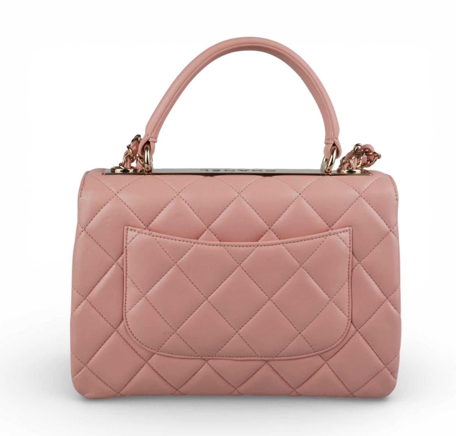 Borsa Chanel, modello Trendy CC, realizzata in Pelle Rosa. Finiture in metallo dorato. Metalleria con placca superiore incisa. Chiusura con patta anteriore e turn-lock CC. Interno foderato in pelle, suddiviso in scomparti. Munita di manico superiore rigido e tracolla in pelle con catena. Con sticker interno e card coordinata. Presenta minimi segni di pressione sotto la patta e lievi graffi generali. Minimi segni metalleria.