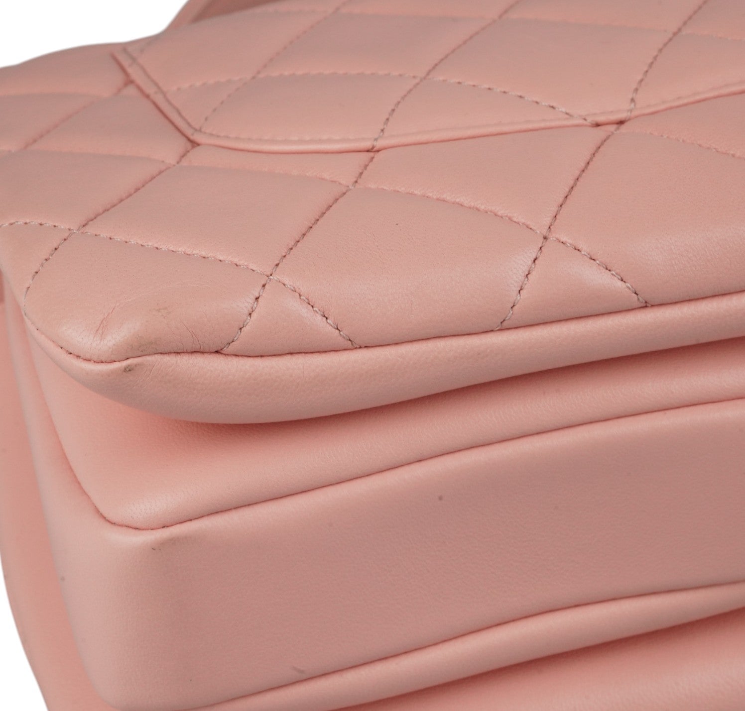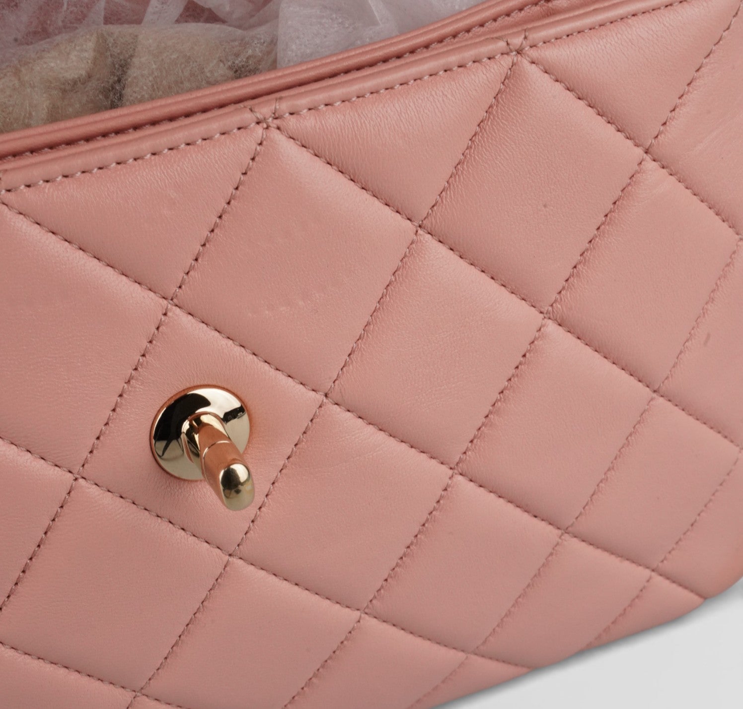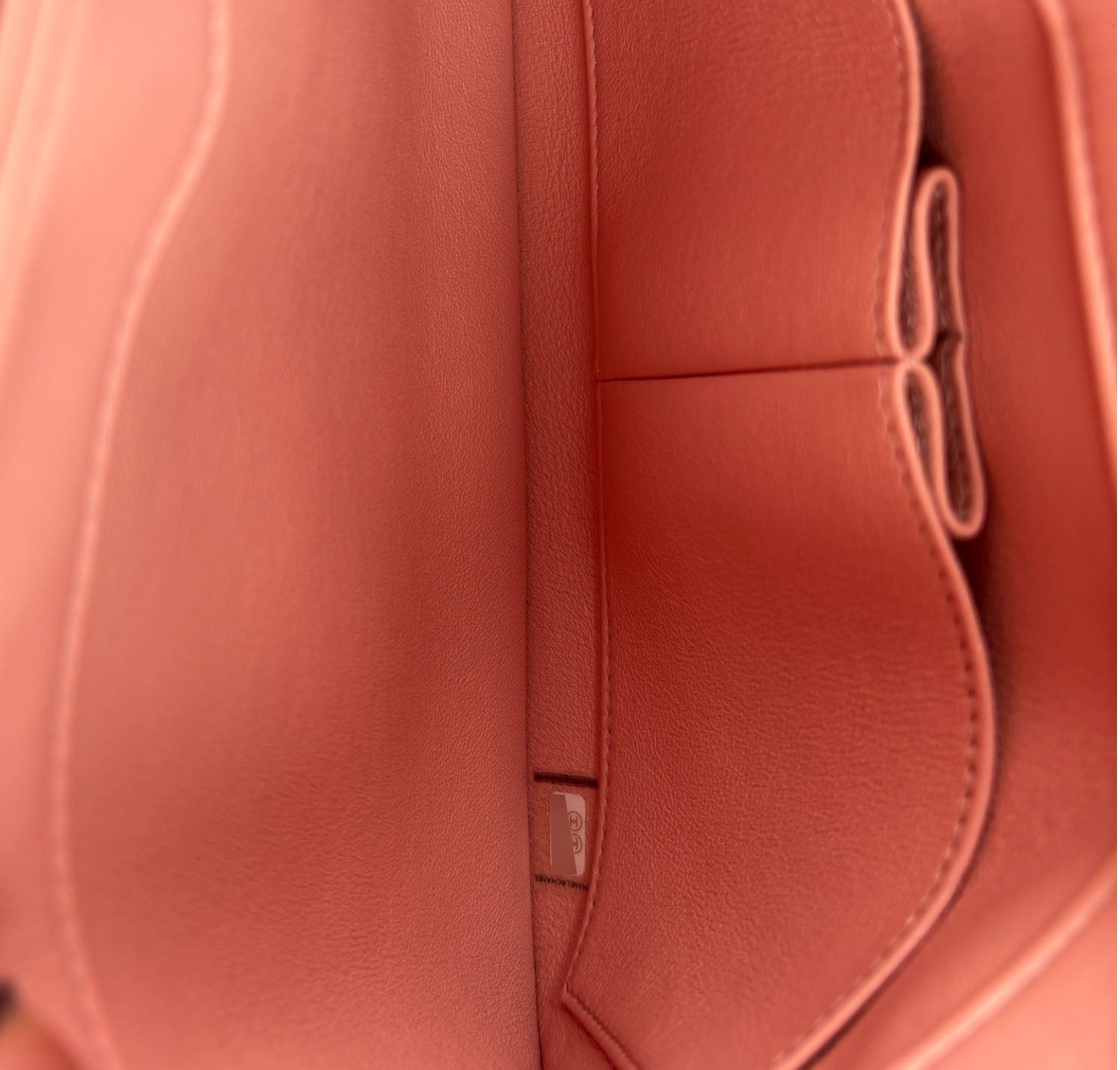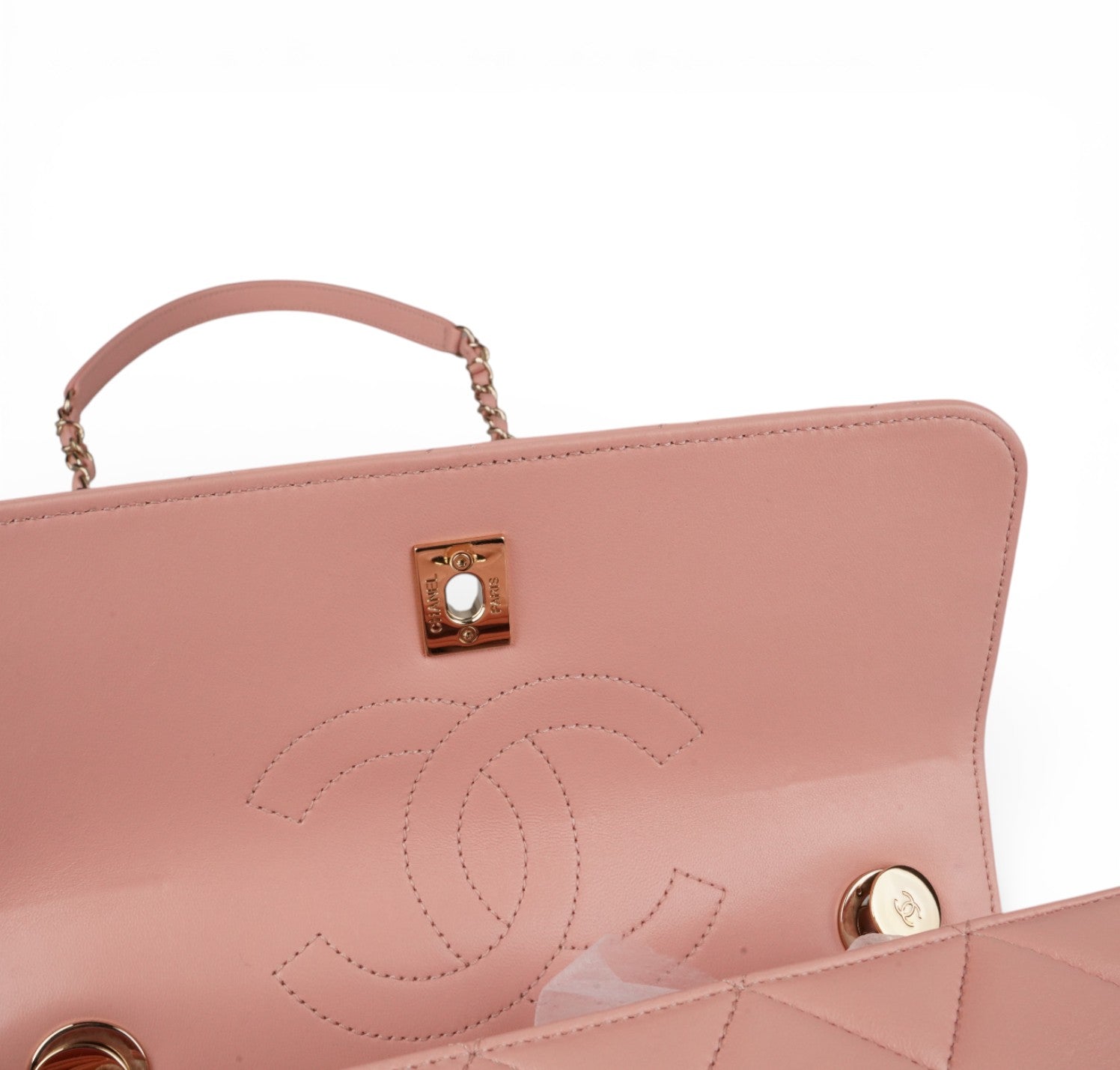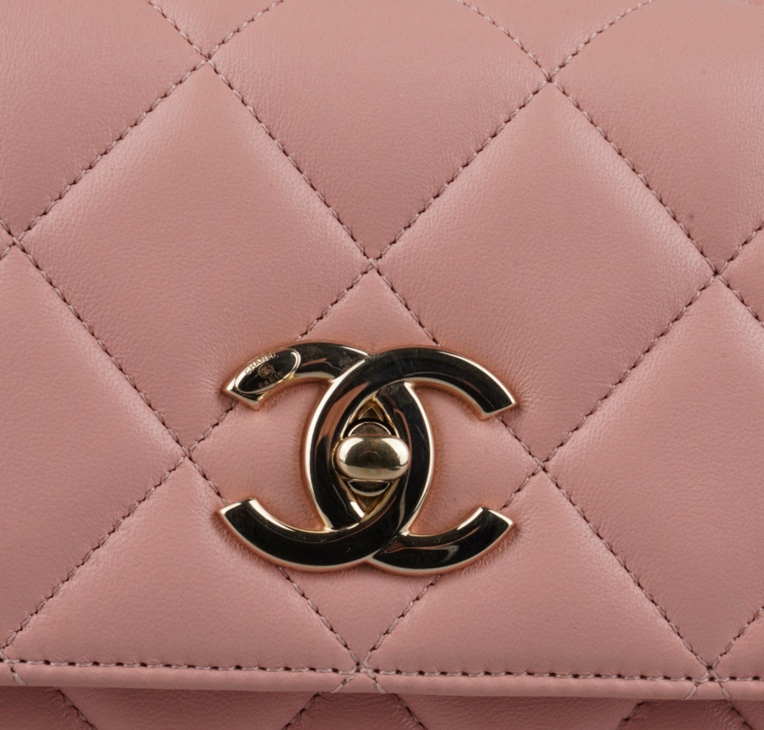 Borsa Chanel, modello Trendy CC, realizzata in Pelle Rosa. Finiture in metallo dorato. Metalleria con placca superiore incisa. Chiusura con patta anteriore e turn-lock CC. Interno foderato in pelle, suddiviso in scomparti. Munita di manico superiore rigido e tracolla in pelle con catena. Con sticker interno e card coordinata. Presenta minimi segni di pressione sotto la patta e lievi graffi generali. Minimi segni metalleria.