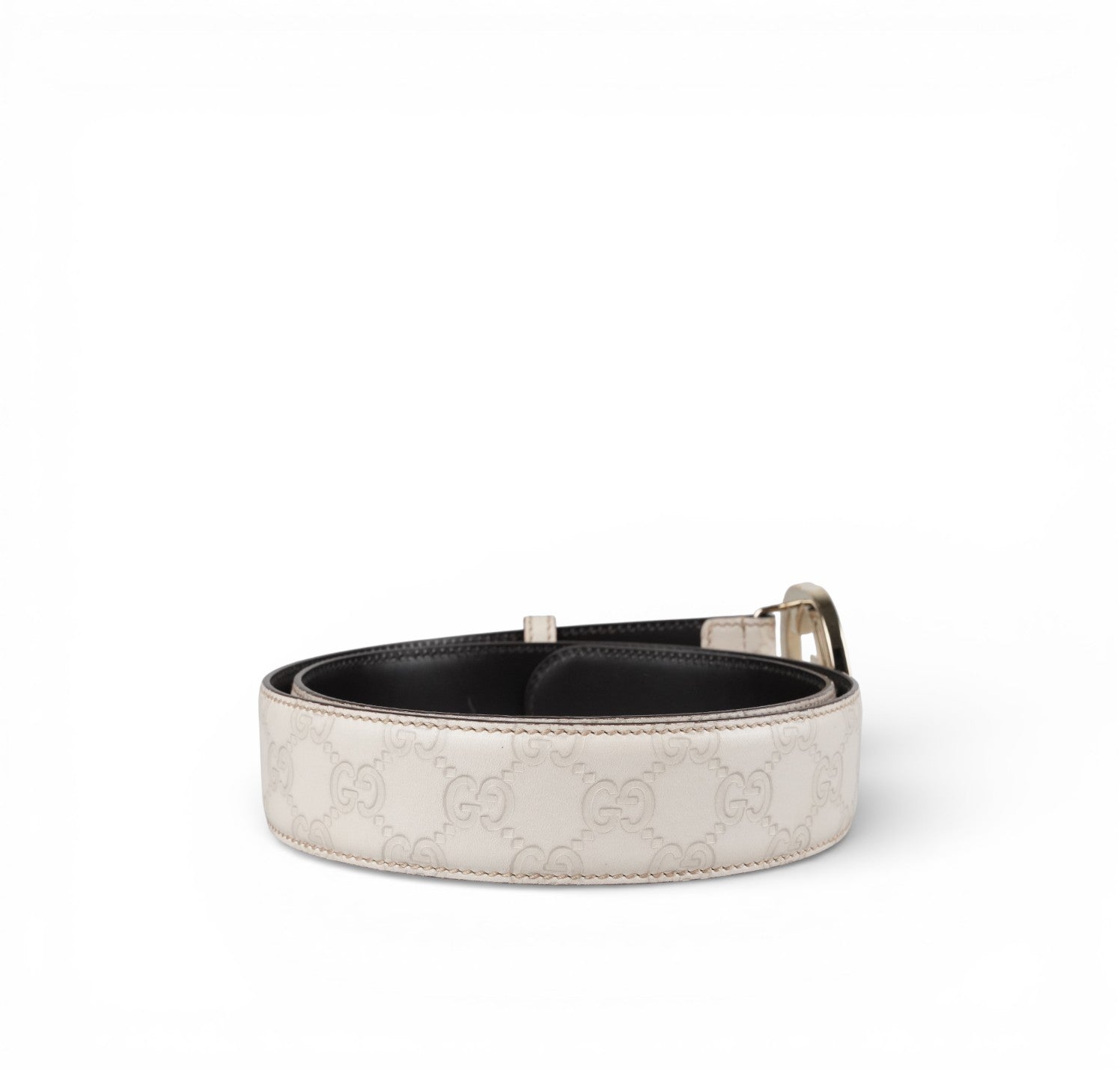 Cintura Gucci, realizzata in pelle con monogram Microguccissima tonalità Off White (bianco sporco) con fibbia GG Interlocking in metallo color Oro Pallido. Interno a contrasto color Testa di Moro. Elegante e versatile, adatto sia a look casual che più raffinati. Presenta un foro aggiuntivo per una vestibilità più comoda. Ottimo stato complessivo, con lievissimi segni compatibili con il normale utilizzo. Altezza 4 cm, lunghezza totale 105.