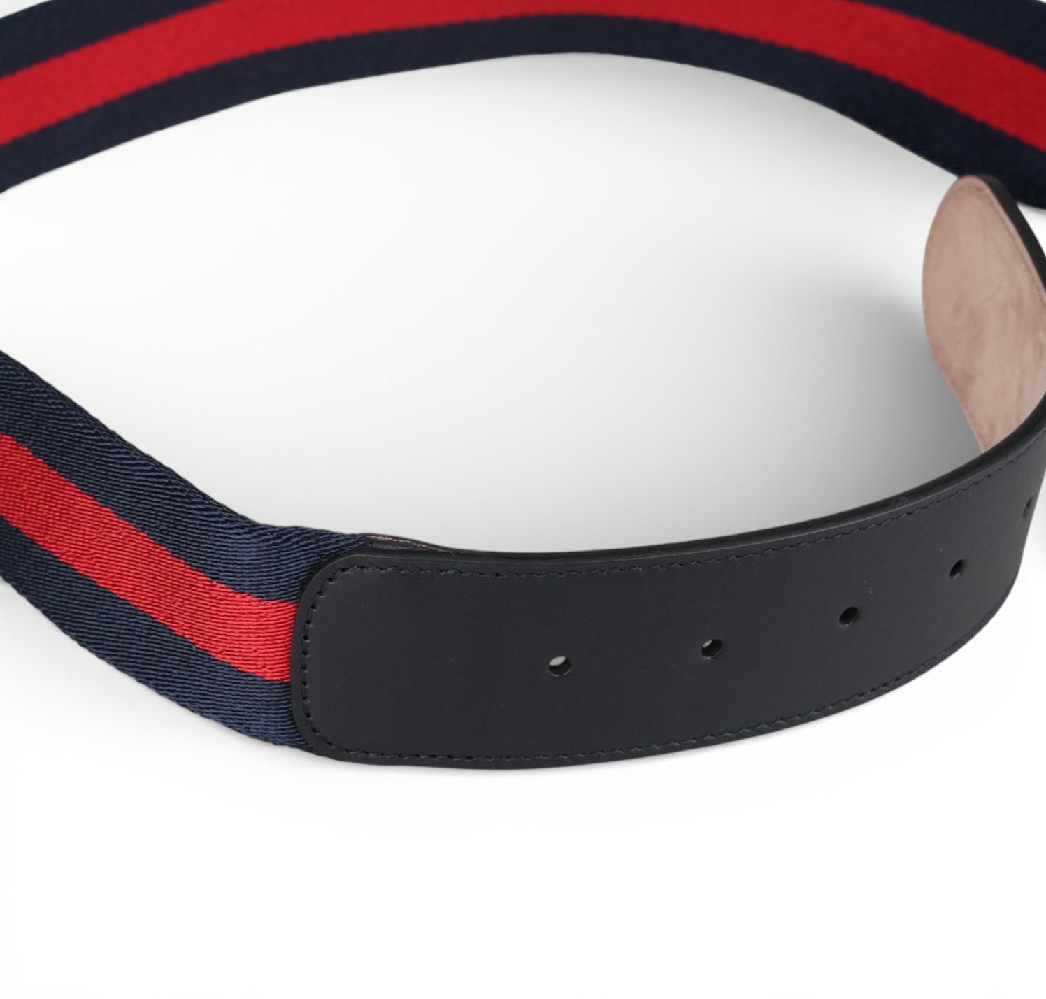 Cintura Gucci, realizzata in Tela GG Interlocking con fascia Web Blu e Rossa. Finiture in pelle Blu. Chiusura con fibbia logo in metallo argentato. Misura indicata 75. Mai stata indossata. Potrebbe presentare micro segni di stoccaggio. Lunghezza totale cinghia 85, altezza 4 cm.