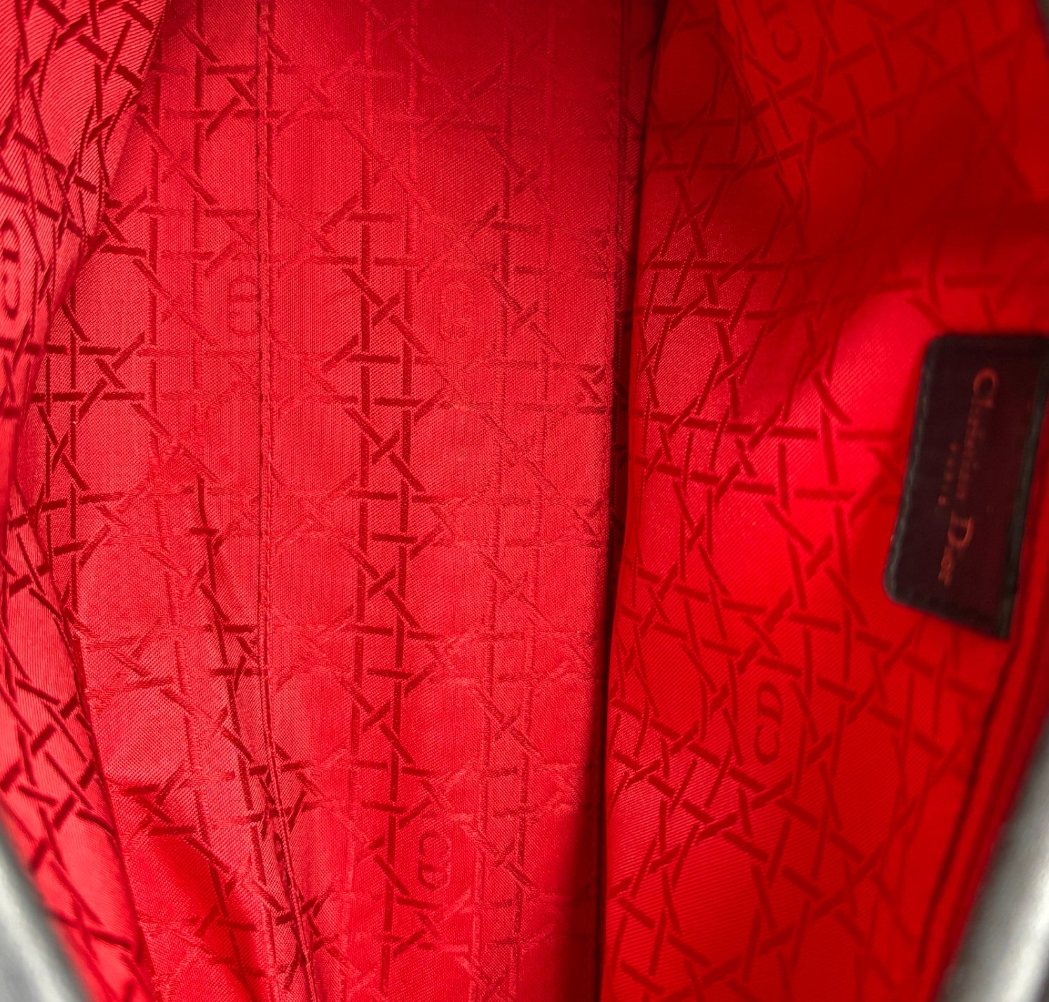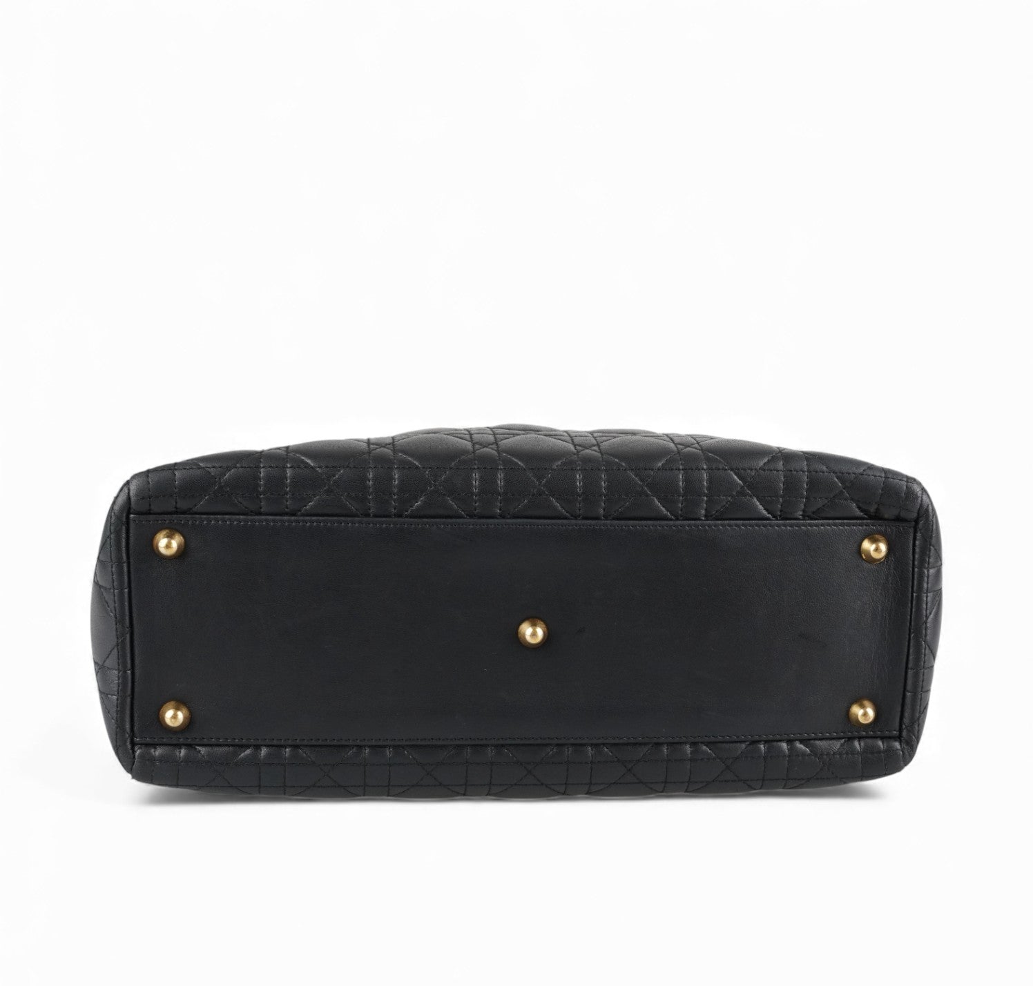 Borsa Dior, modello Lady, misura Large realizzata in pelle di agnello Nera impreziosita da cuciture Cannage che riproducono l'iconico motivo geometrico trapuntato. Hardware color Oro. Impreziosita dai ciondoli D.I.O.R. in metallo. Interni in Tessuto Rosso con dettagli in pelle, tasca con zip. Lievi segni d'uso generali su pelle, interni, micro graffi alla metalleria.