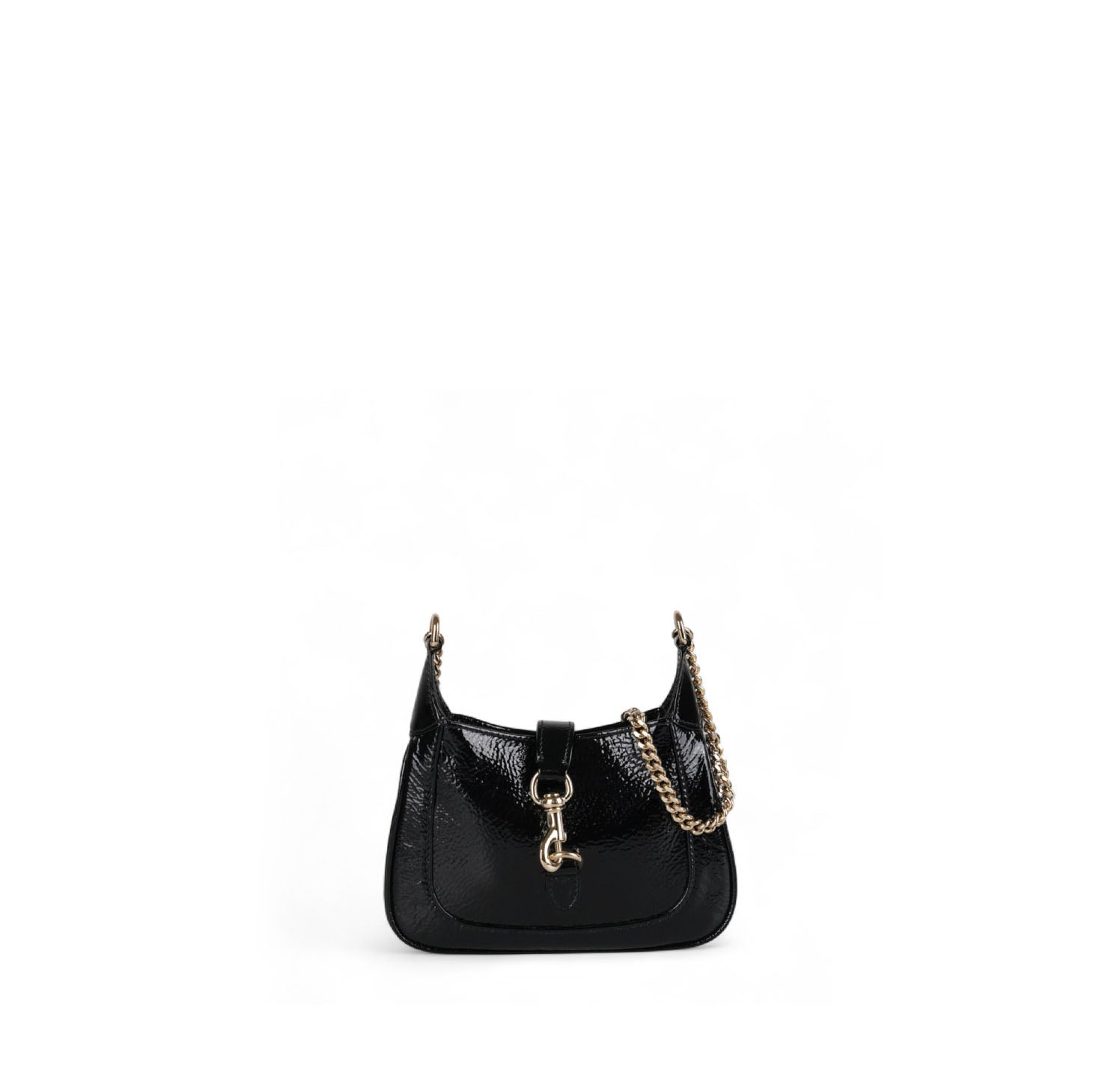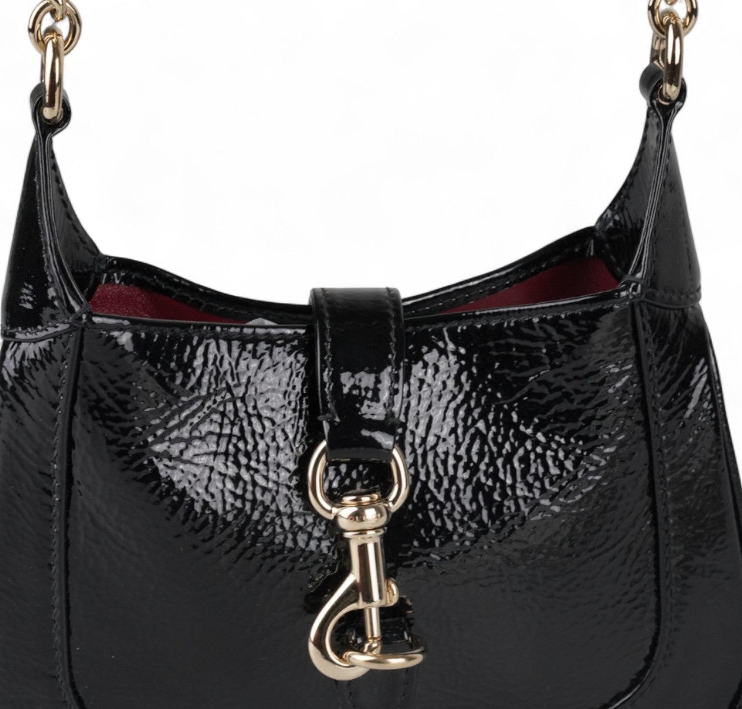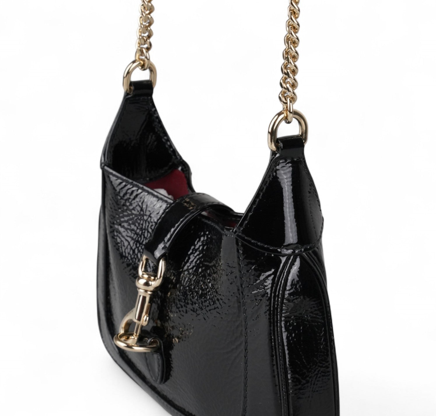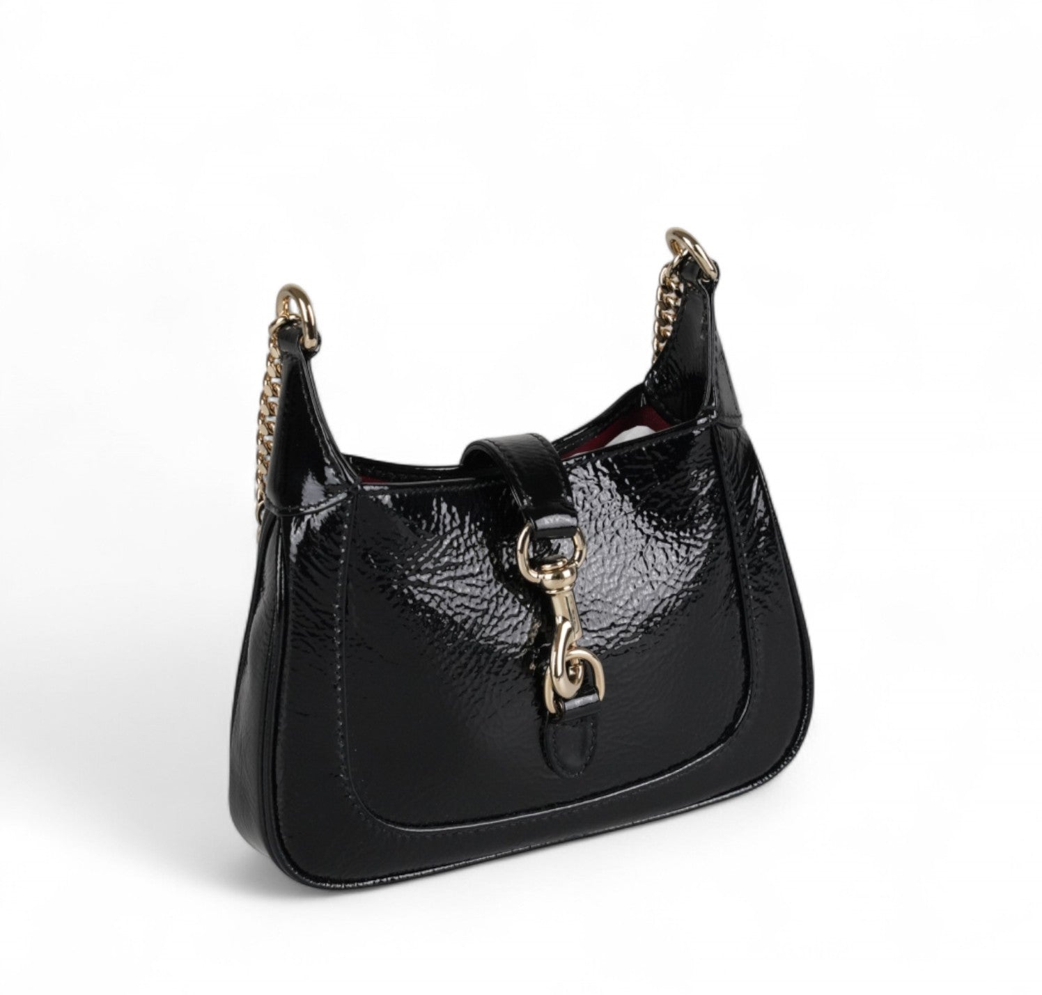 Borsa Gucci, modello Jackie Notte, realizzata in Pelle Lucida Nera con dettagli in metallo dorato. Il design è valorizzato dall’interno in pelle rossa. Ideale per l'uso a spalla o bandoliera. Chiusura frontale metallica push-to-open. Condizioni pari al nuovo, potrebbero essere presenti micro segni di stoccaggio.