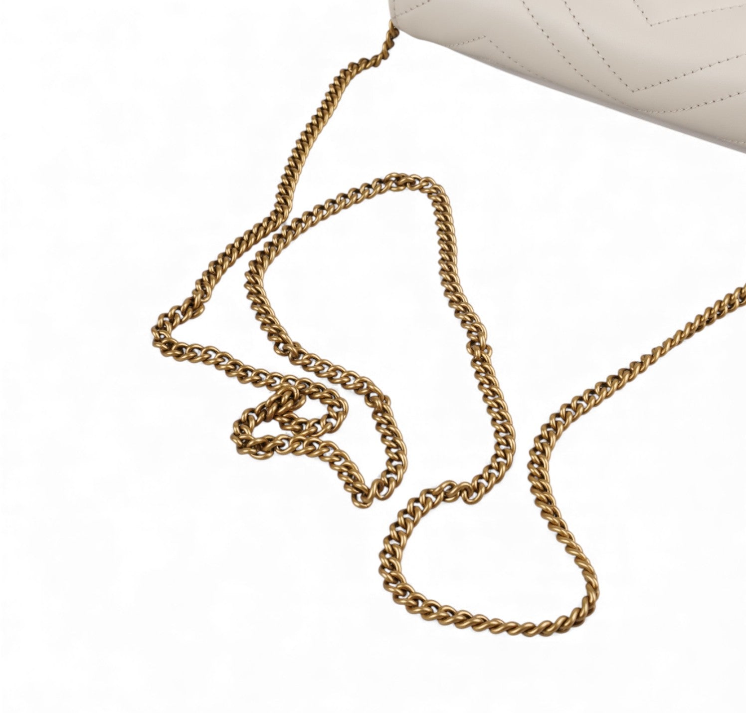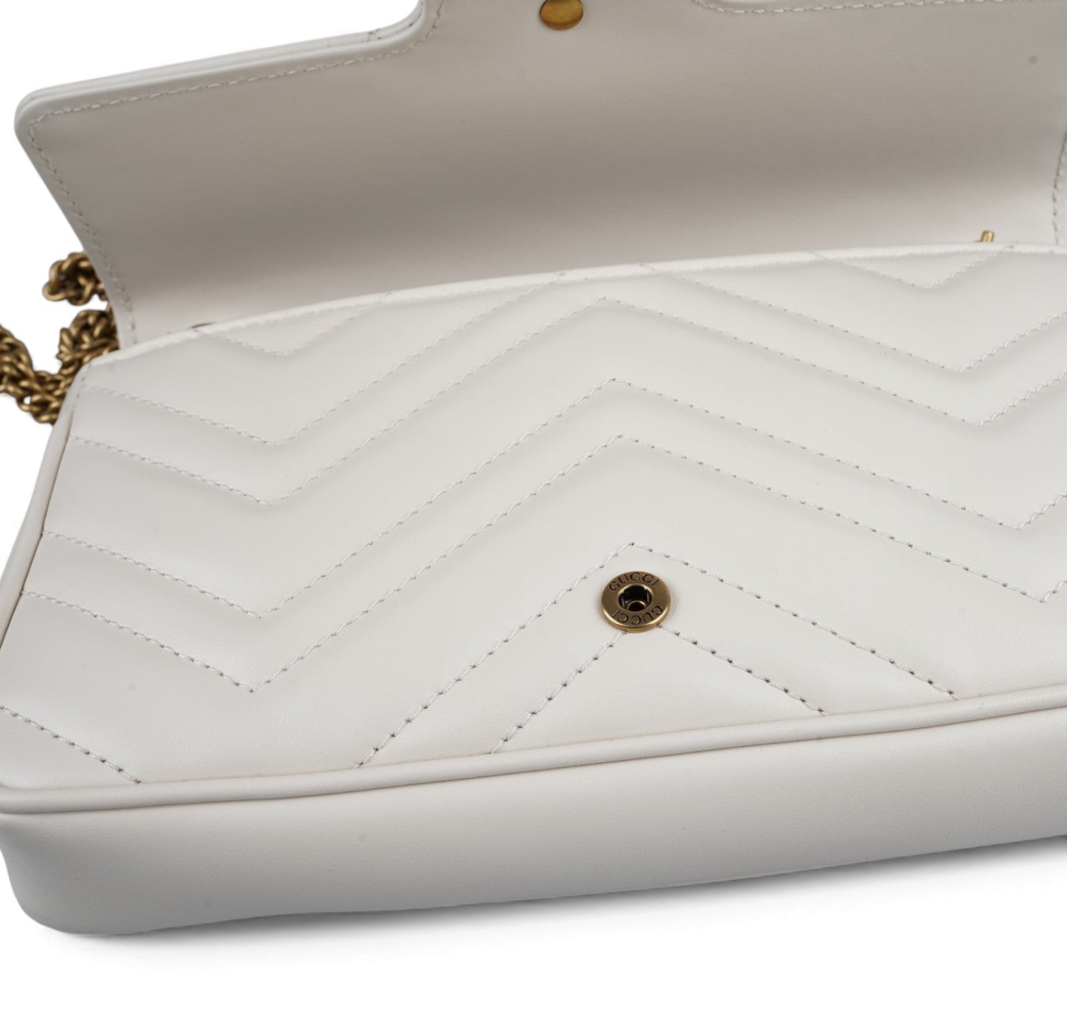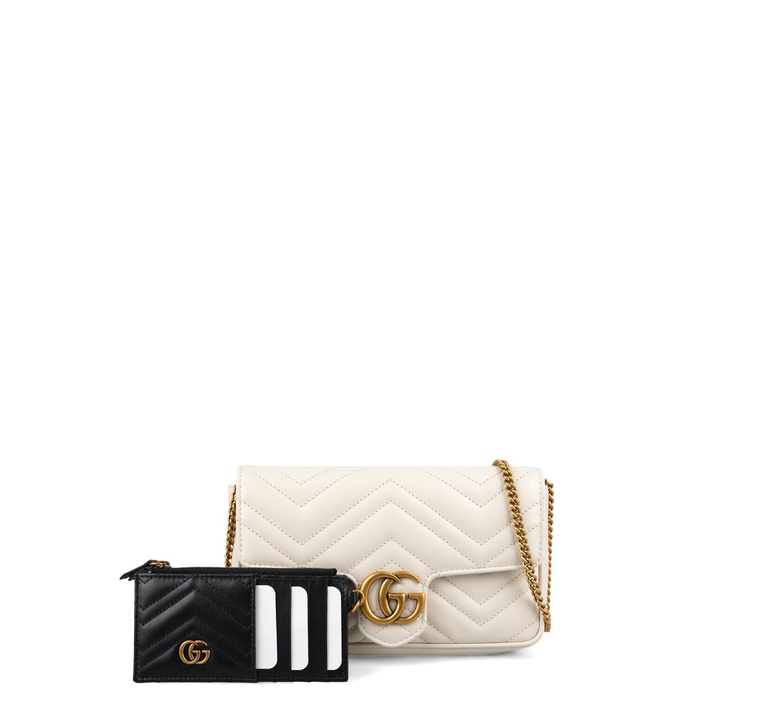 Borsa Gucci, modello GG Marmont Mini, realizzata in morbida Pelle matelassé color Bianco (Avorio). Impreziosita dal logo doppia G frontale e metalleria color Oro anticato. Chiusura con pattina e bottone a pressione. Tracolla a catena amovibile per un utilizzo a spalla, come pochette a mano o crossbody. Interno compatto e ben organizzato, con tasche porta carte. Munita di piccolo organizer a contrasto coordinato in Pelle Nera, da usare come portacarte o portadocumenti con pratica tasca centrale con zip per riporre monete. Pari al nuovo, mai indossata. Potrebbe presentare micro segni di stoccaggio.