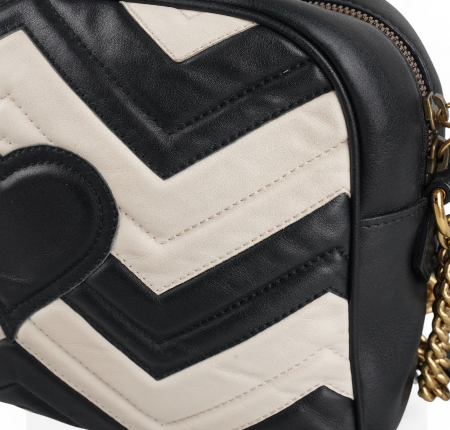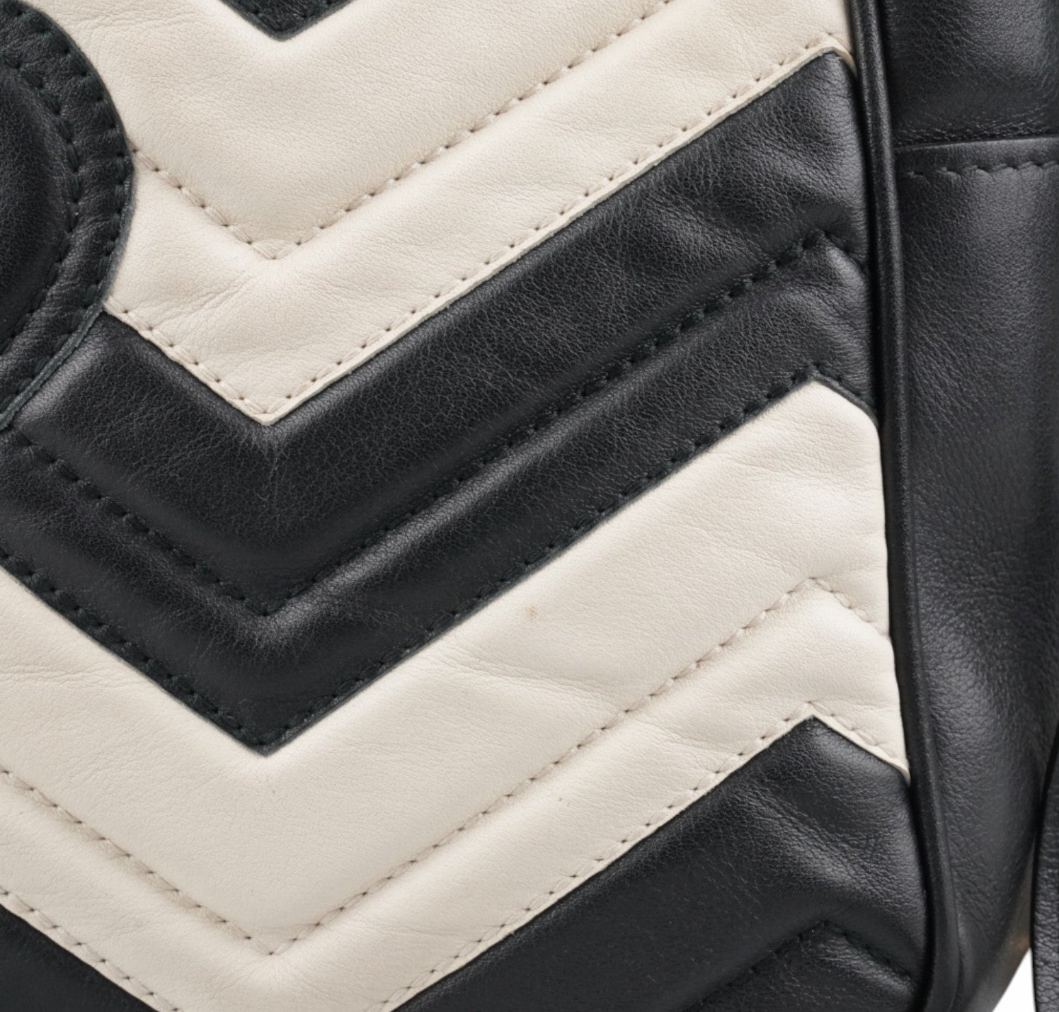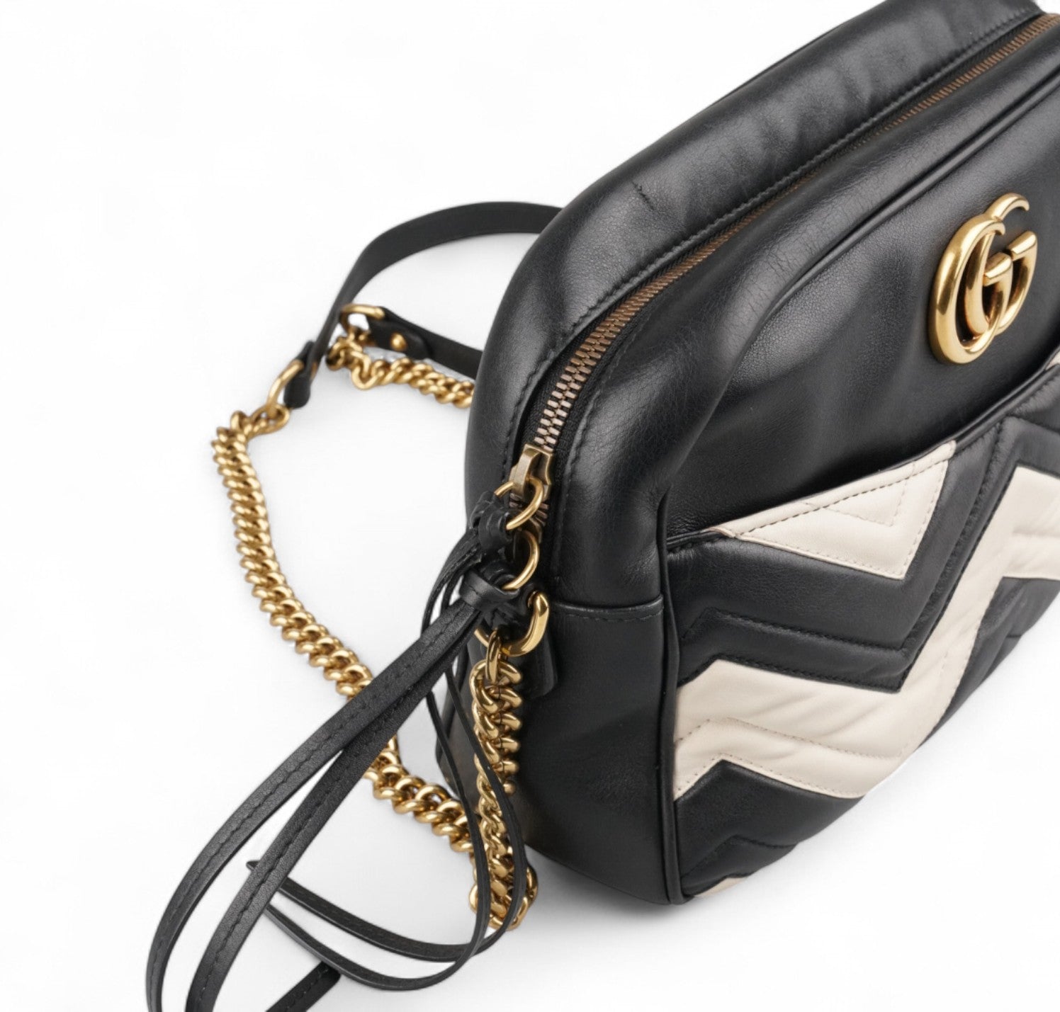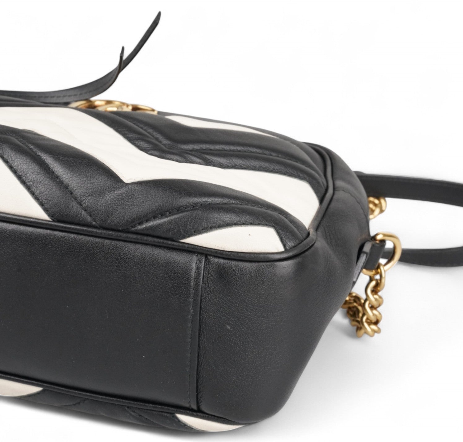 Borsa Gucci, modello GG Marmont Bicolor, realizzata in morbida Pelle nei toni del Nero e del Bianco, con motivo a chevron e iconico logo GG in metallo dorato su parte frontale. Dotata di tracolla a catena con spallaccio in pelle per una portabilità confortevole a spalla o bandoliera. Chiusura superiore con zip e interno in tessuto di tipo raso Rosa con tasca piatta. Lievi micro graffi su metalleria. Micro graffi e lievi segni d'uso su metalleria. Interno pulito, con minimi segni d’uso.