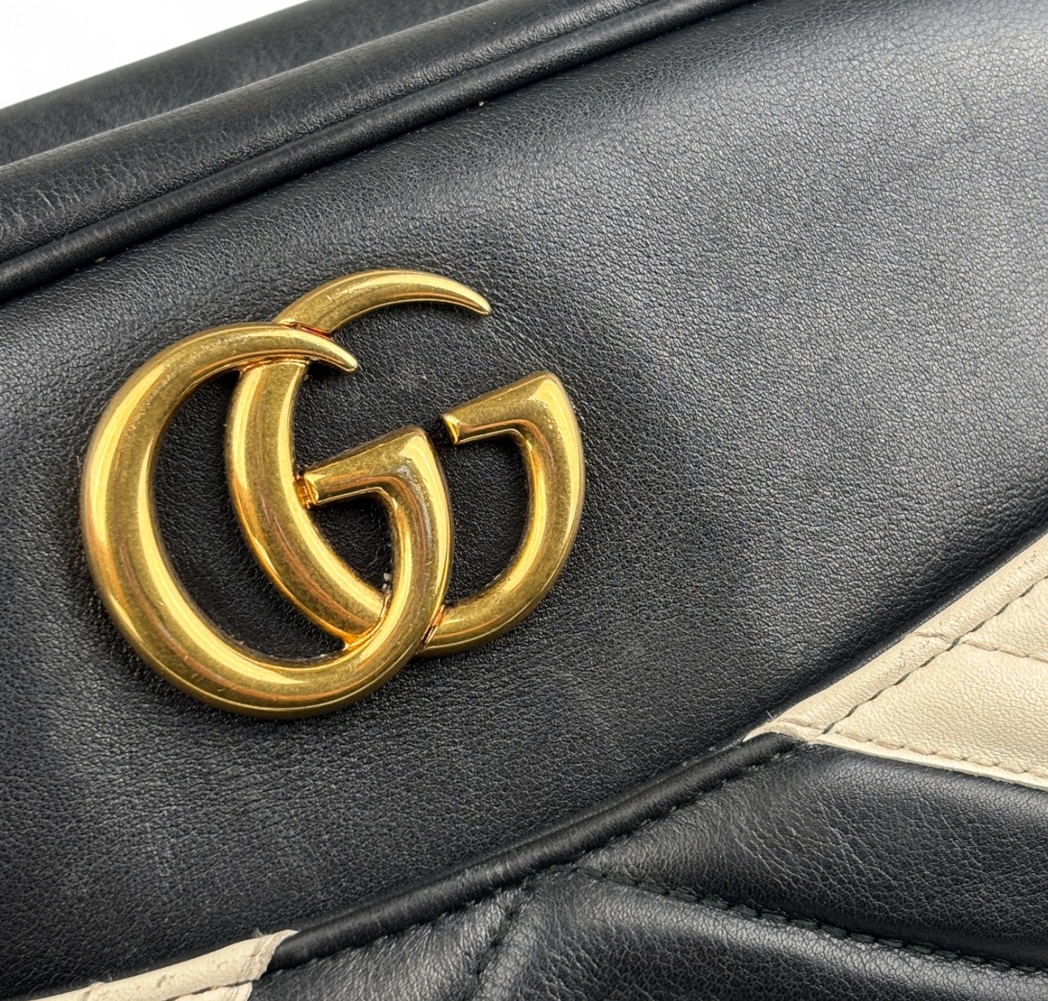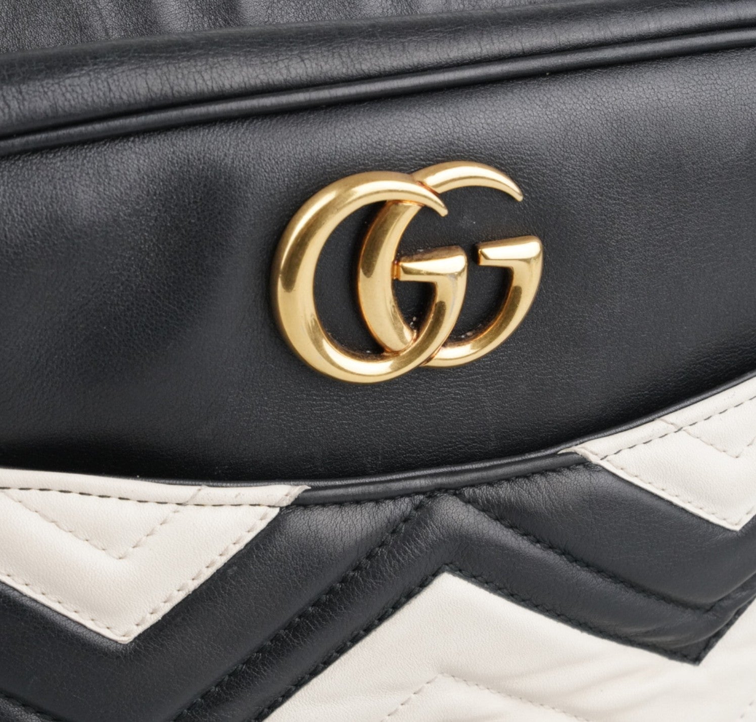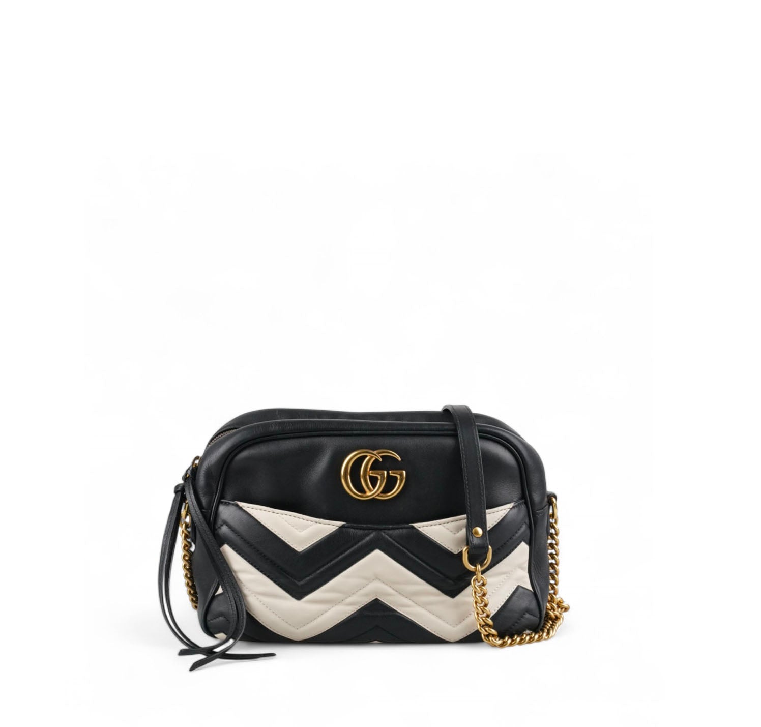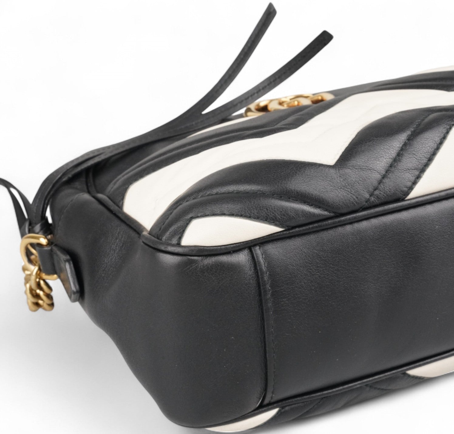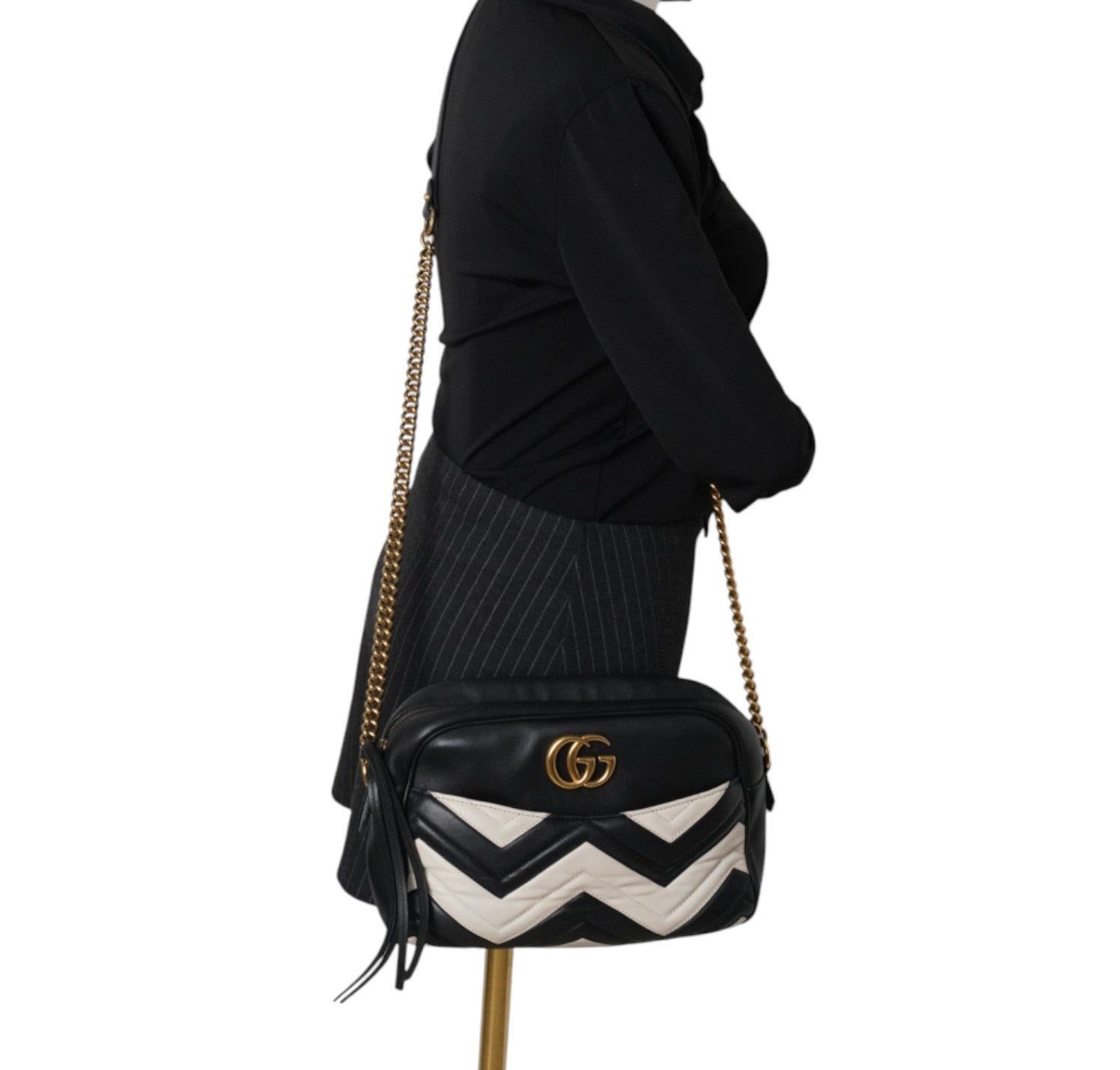 Borsa Gucci, modello GG Marmont Bicolor, realizzata in morbida Pelle nei toni del Nero e del Bianco, con motivo a chevron e iconico logo GG in metallo dorato su parte frontale. Dotata di tracolla a catena con spallaccio in pelle per una portabilità confortevole a spalla o bandoliera. Chiusura superiore con zip e interno in tessuto di tipo raso Rosa con tasca piatta. Lievi micro graffi su metalleria. Micro graffi e lievi segni d'uso su metalleria. Interno pulito, con minimi segni d’uso.