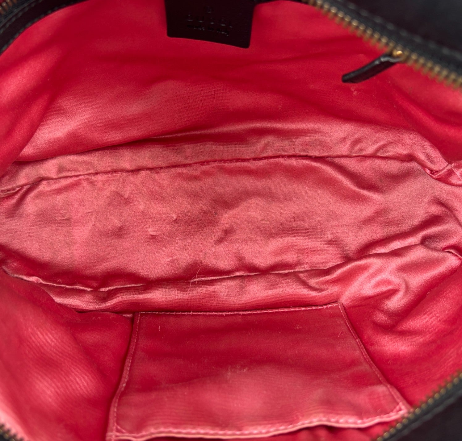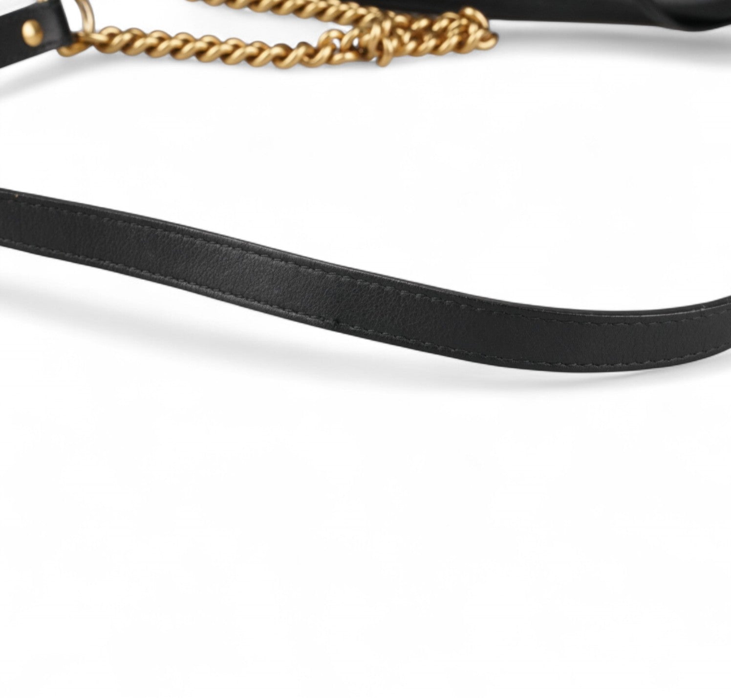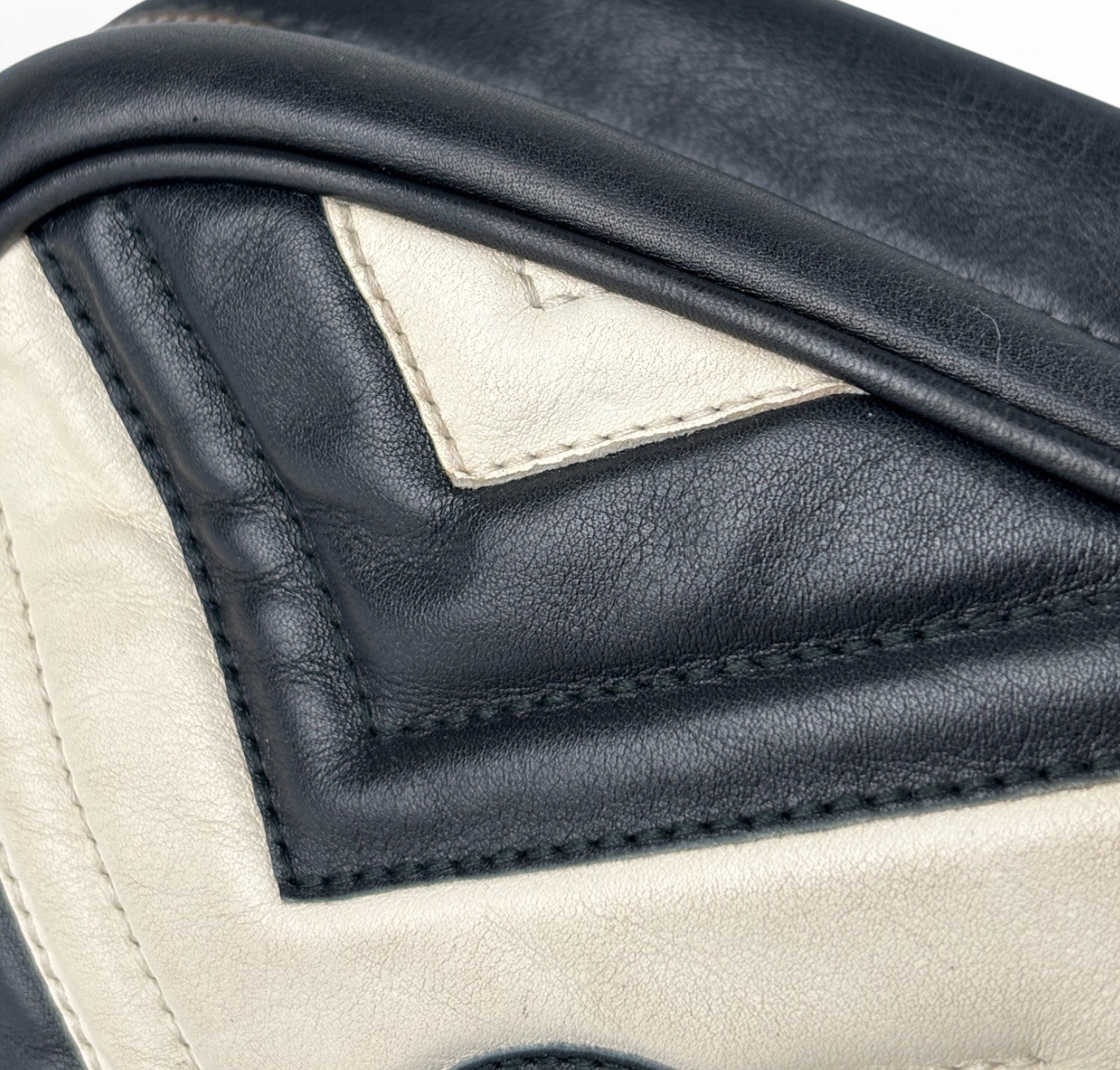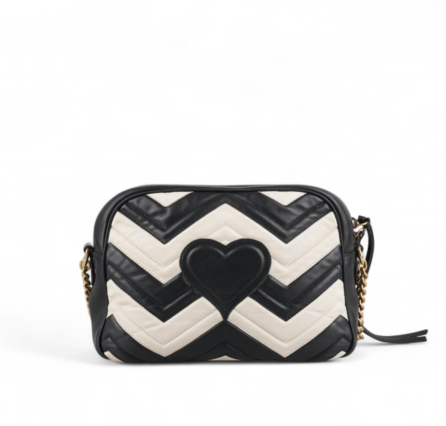 Borsa Gucci, modello GG Marmont Bicolor, realizzata in morbida Pelle nei toni del Nero e del Bianco, con motivo a chevron e iconico logo GG in metallo dorato su parte frontale. Dotata di tracolla a catena con spallaccio in pelle per una portabilità confortevole a spalla o bandoliera. Chiusura superiore con zip e interno in tessuto di tipo raso Rosa con tasca piatta. Lievi micro graffi su metalleria. Micro graffi e lievi segni d'uso su metalleria. Interno pulito, con minimi segni d’uso.