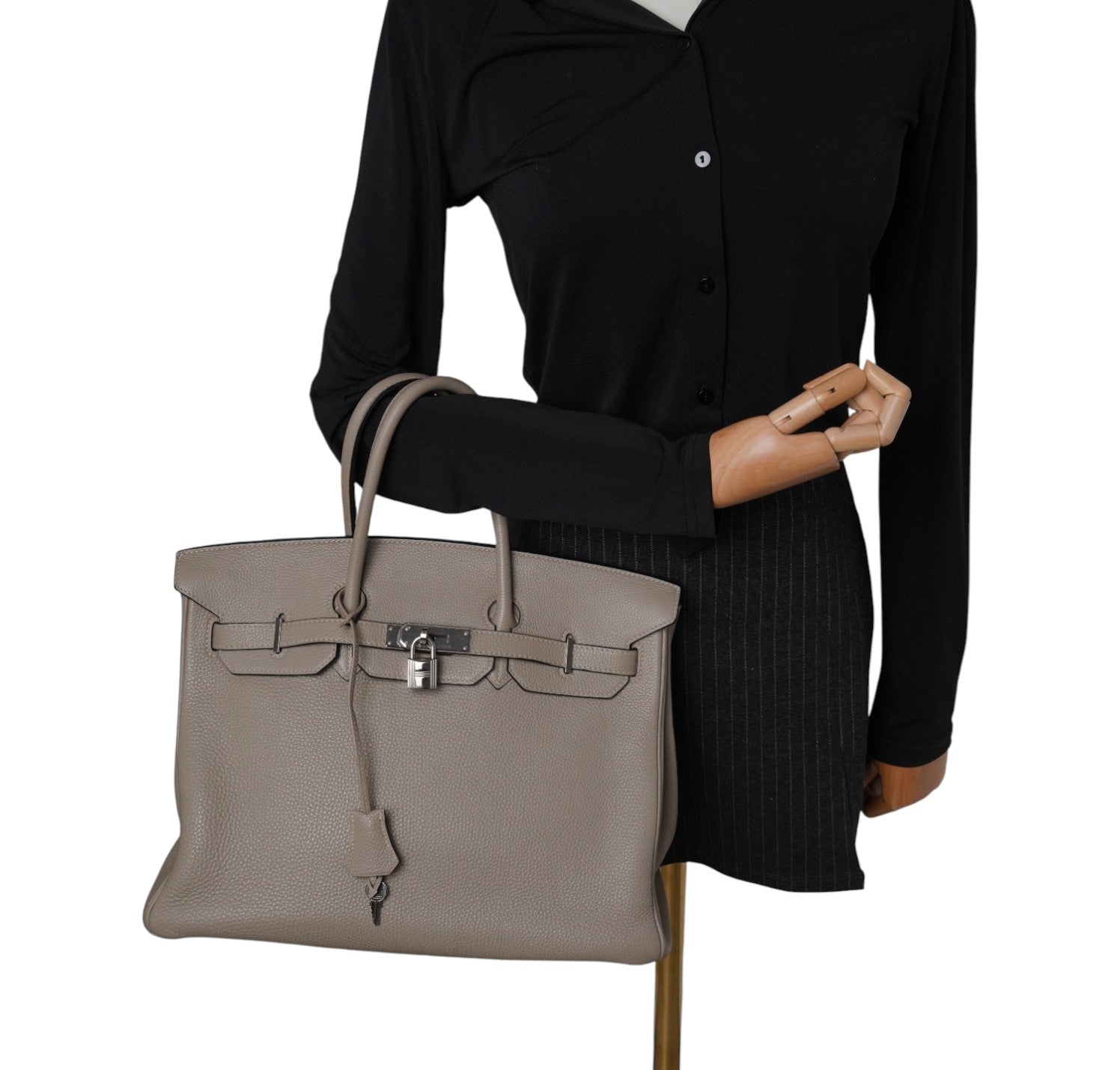 Hermès bag, Birkin model, size 35, made of Etoupe-toned Togo leather. Gold-colored hardware. C stamp, year 2018. The elegant silhouette and clean lines make it perfect for any occasion. Flap with interlocking closure on a horizontal band complete with padlock and keys. Tone-on-tone interior with applied zip pocket and comfortable pockets. It has slight general signs of use on the metal parts, normal scratches from time and use on the opening hardware. Slight micro signs of use on the leather such as micro scratches on the edge and interior.