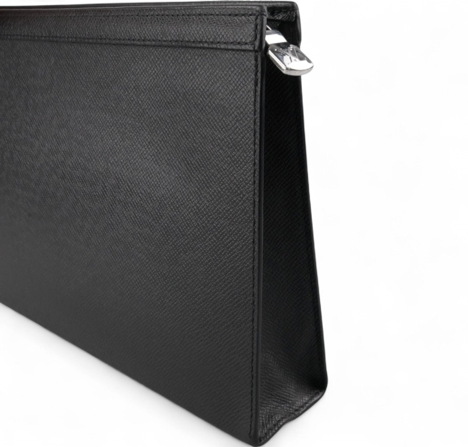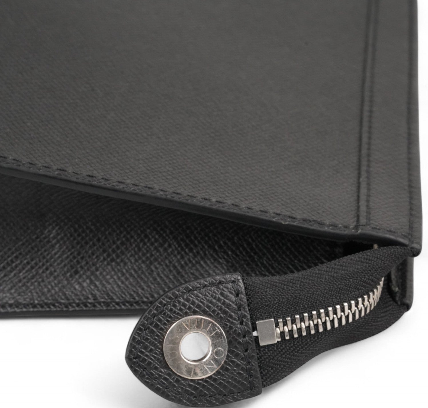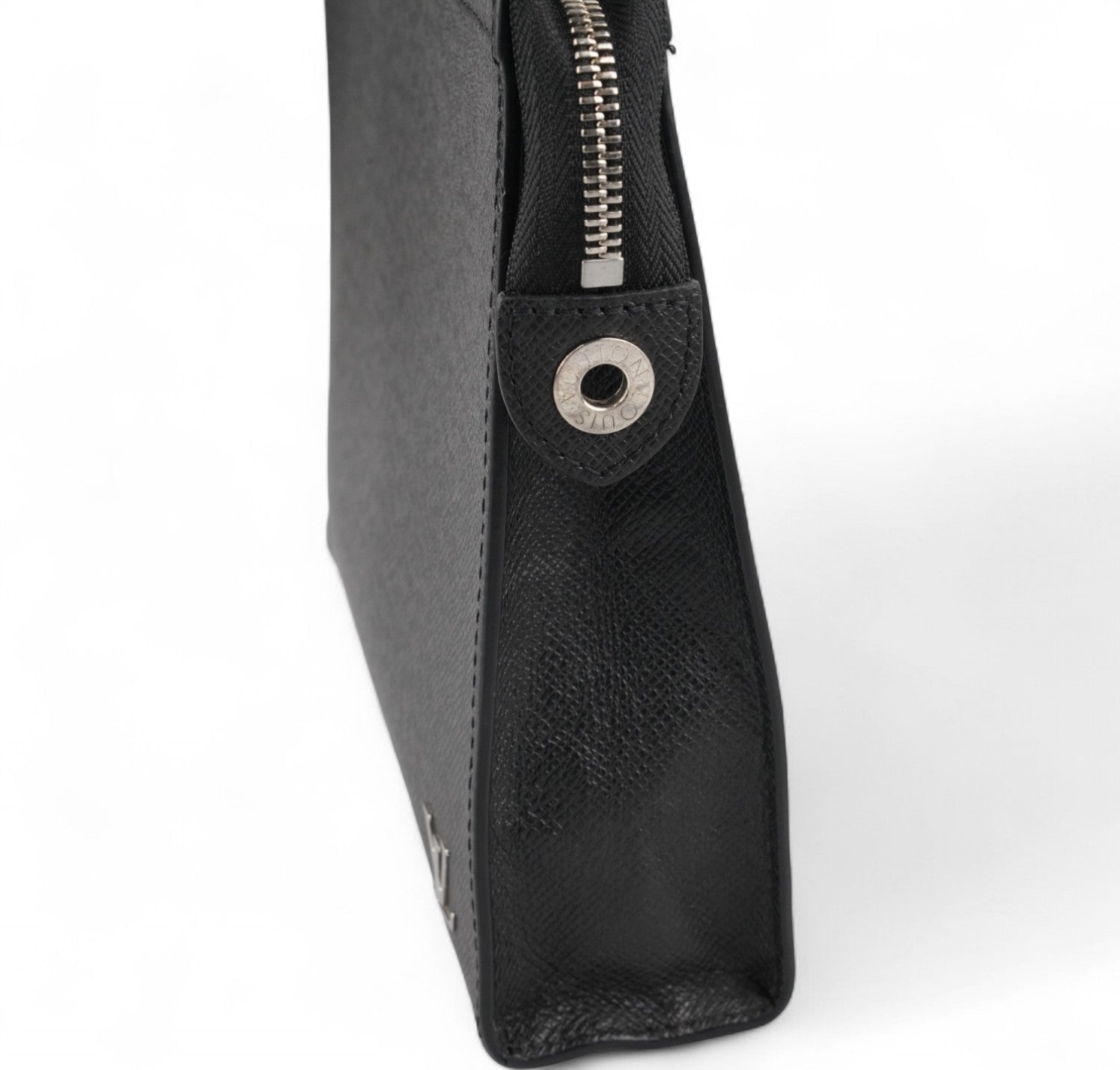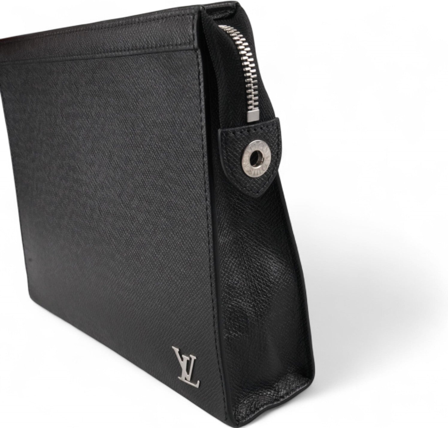 Pochette Louis Vuitton, modello Voyage MM (conosciuta anche come Toilette 26), realizzata in Pelle Taiga Nera. Decorata da iniziali LV in metallo argentato su parte frontale. Chiusura superiore con cerniera. Sei fessure per carte di credito. Scomparto piatto interno. Pratica ma versatile, può essere inserita all'interno di un'altra borsa come accessorio. Lievi segni del tempo, minimi segni d'uso generali su pelle, metalleria, interni. Presente microchip.