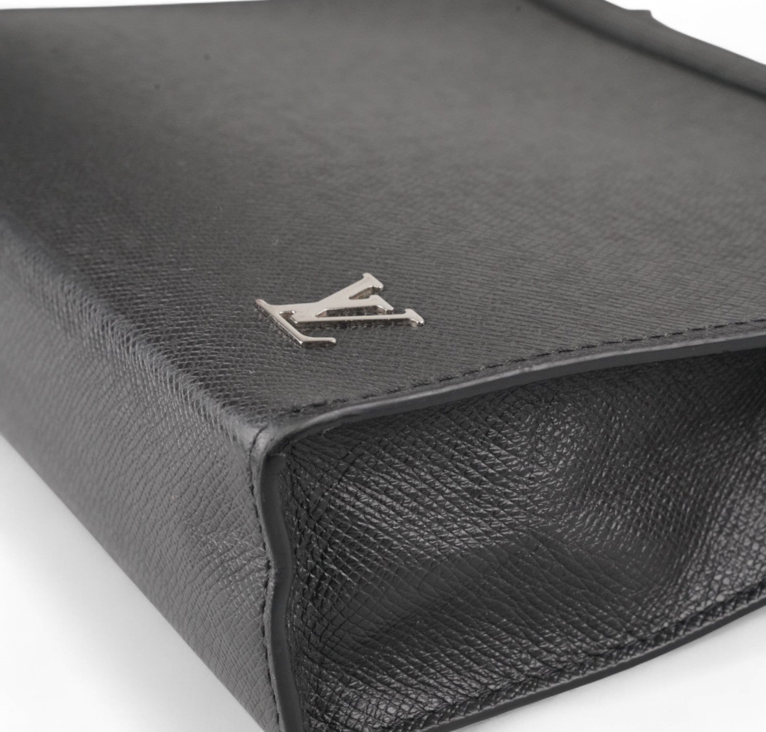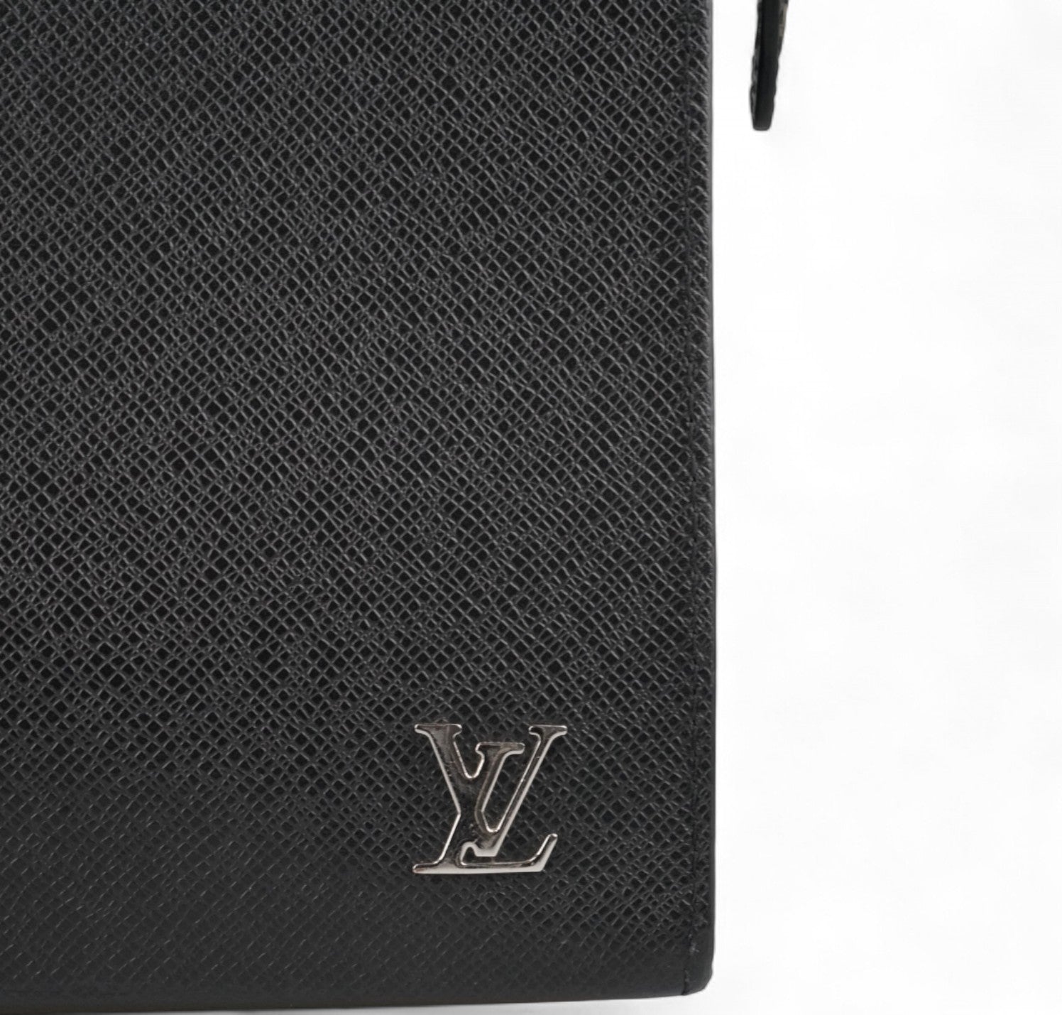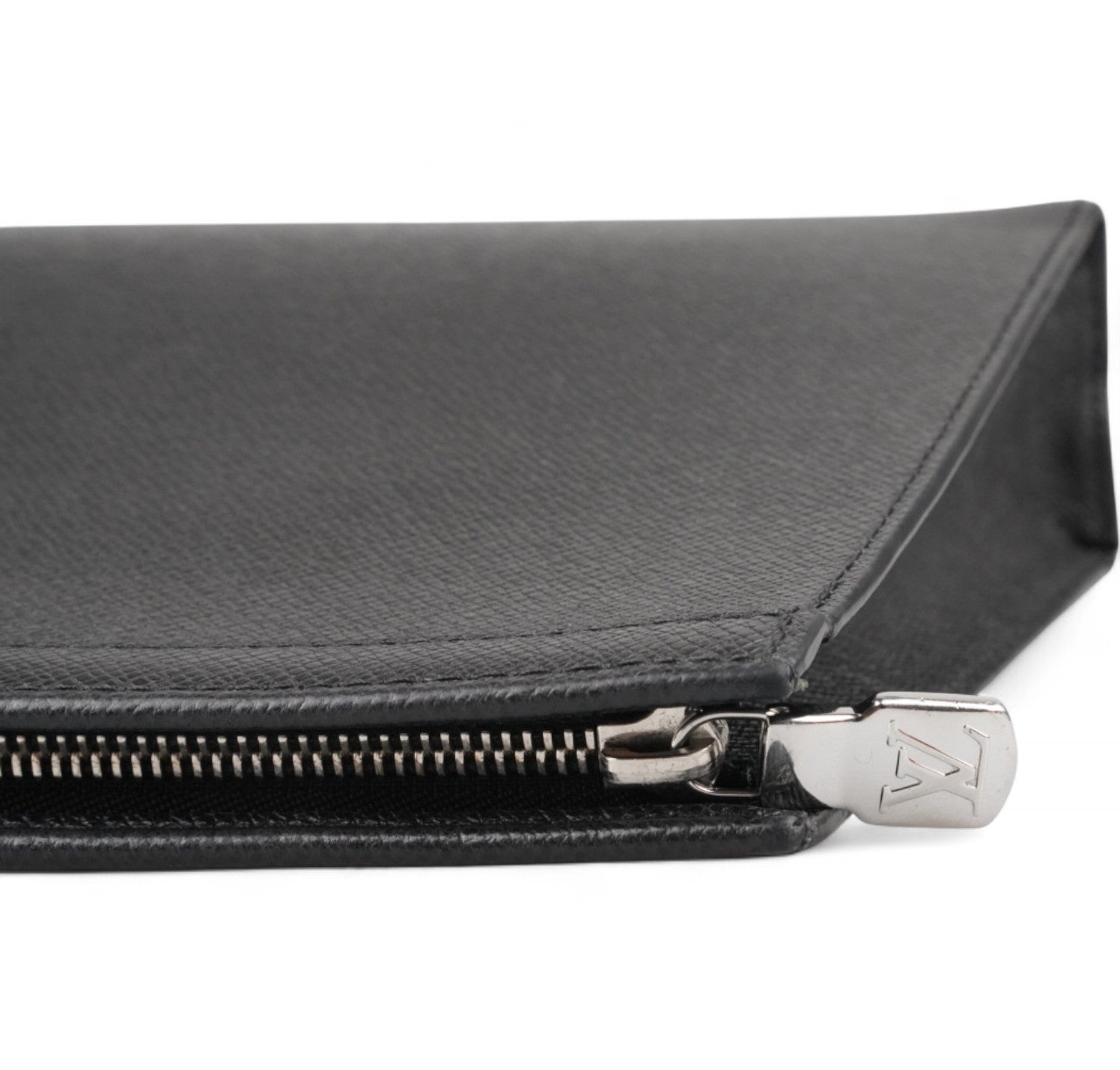 Pochette Louis Vuitton, modello Voyage MM (conosciuta anche come Toilette 26), realizzata in Pelle Taiga Nera. Decorata da iniziali LV in metallo argentato su parte frontale. Chiusura superiore con cerniera. Sei fessure per carte di credito. Scomparto piatto interno. Pratica ma versatile, può essere inserita all'interno di un'altra borsa come accessorio. Lievi segni del tempo, minimi segni d'uso generali su pelle, metalleria, interni. Presente microchip.