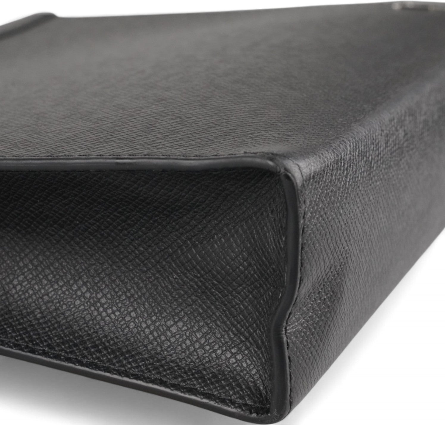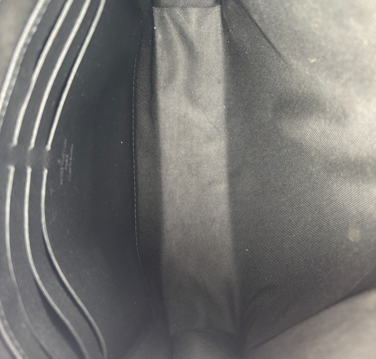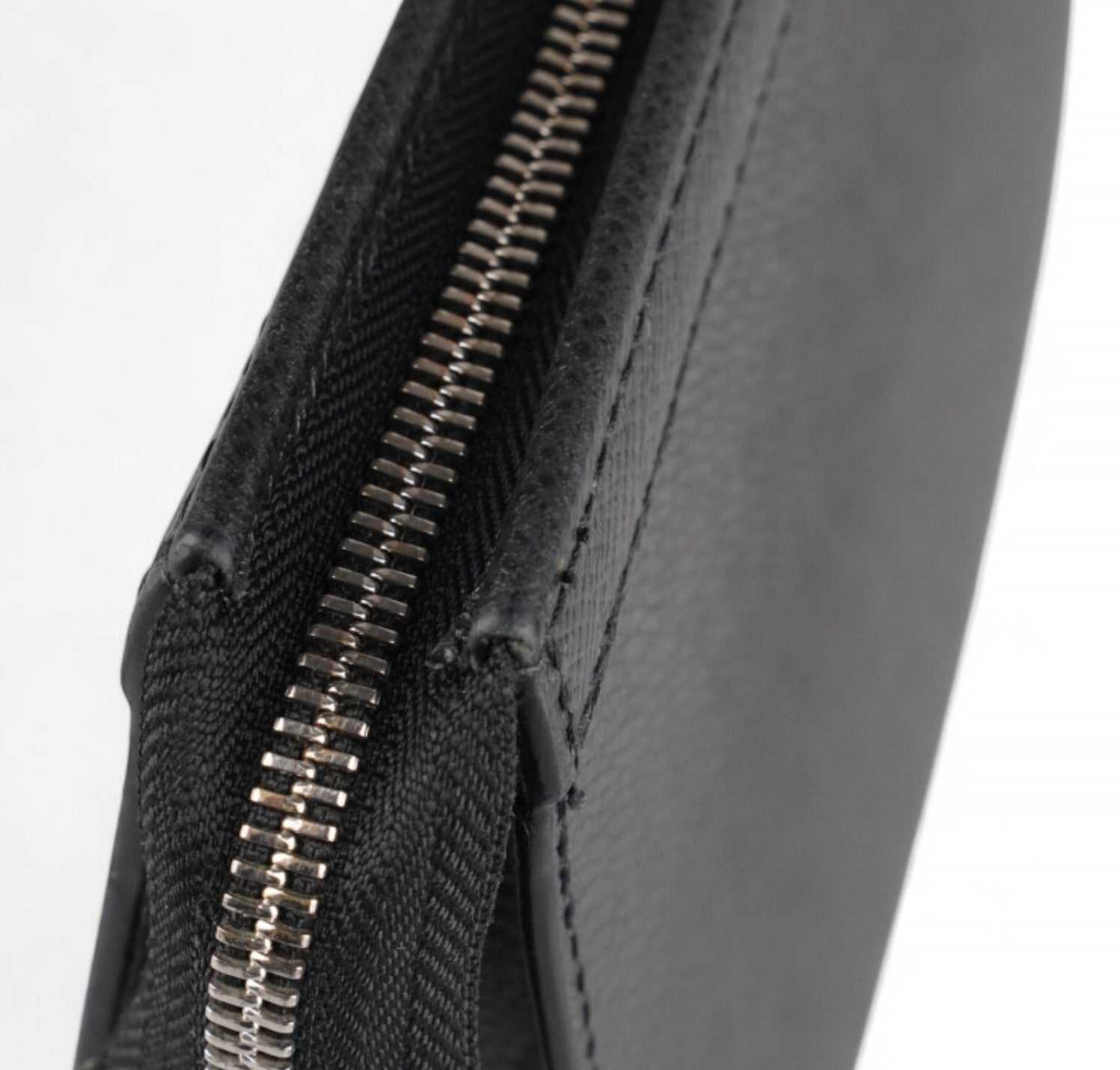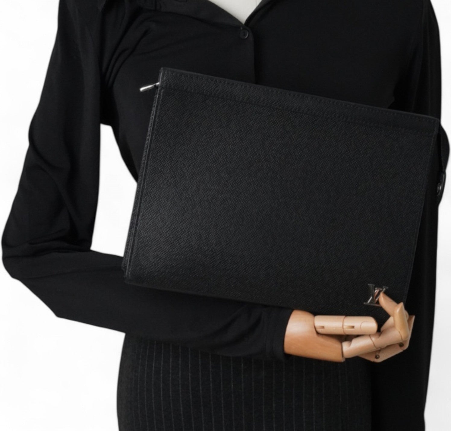 Pochette Louis Vuitton, modello Voyage MM (conosciuta anche come Toilette 26), realizzata in Pelle Taiga Nera. Decorata da iniziali LV in metallo argentato su parte frontale. Chiusura superiore con cerniera. Sei fessure per carte di credito. Scomparto piatto interno. Pratica ma versatile, può essere inserita all'interno di un'altra borsa come accessorio. Lievi segni del tempo, minimi segni d'uso generali su pelle, metalleria, interni. Presente microchip.