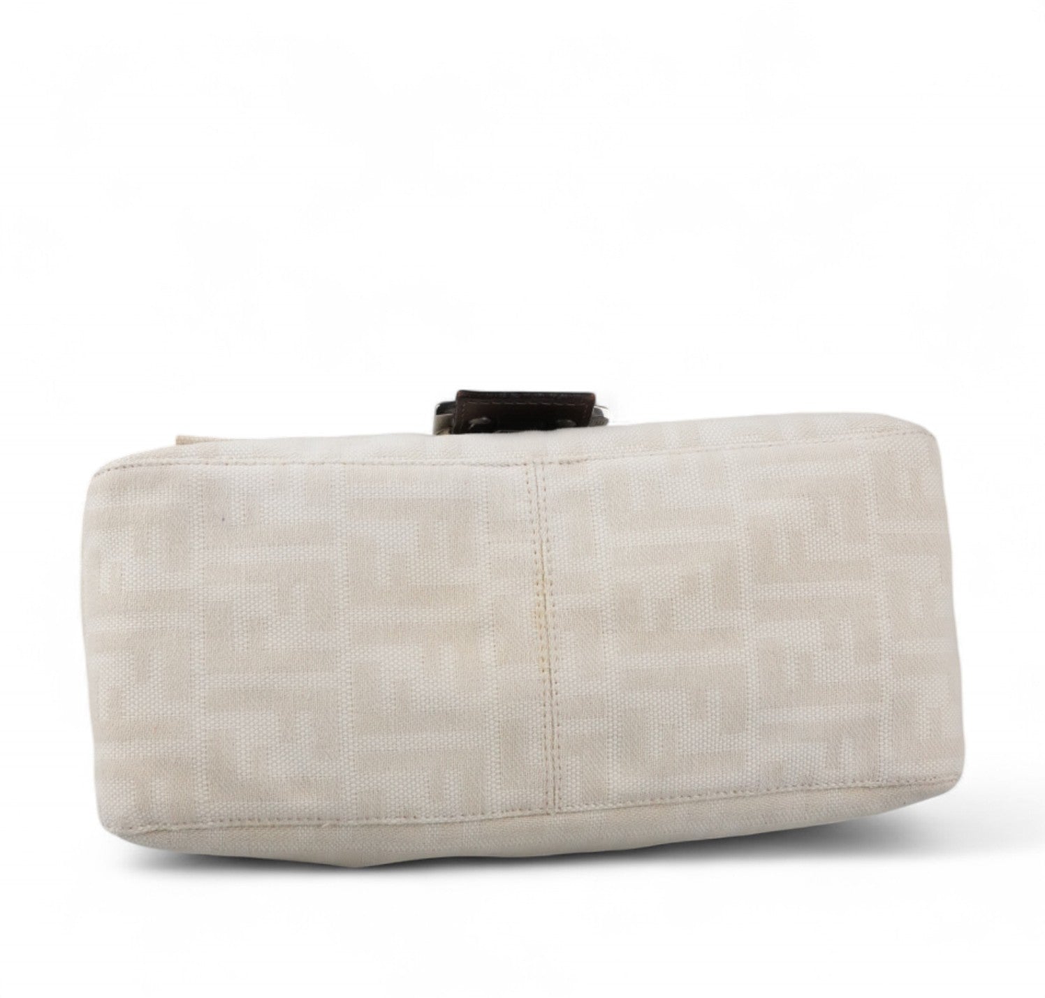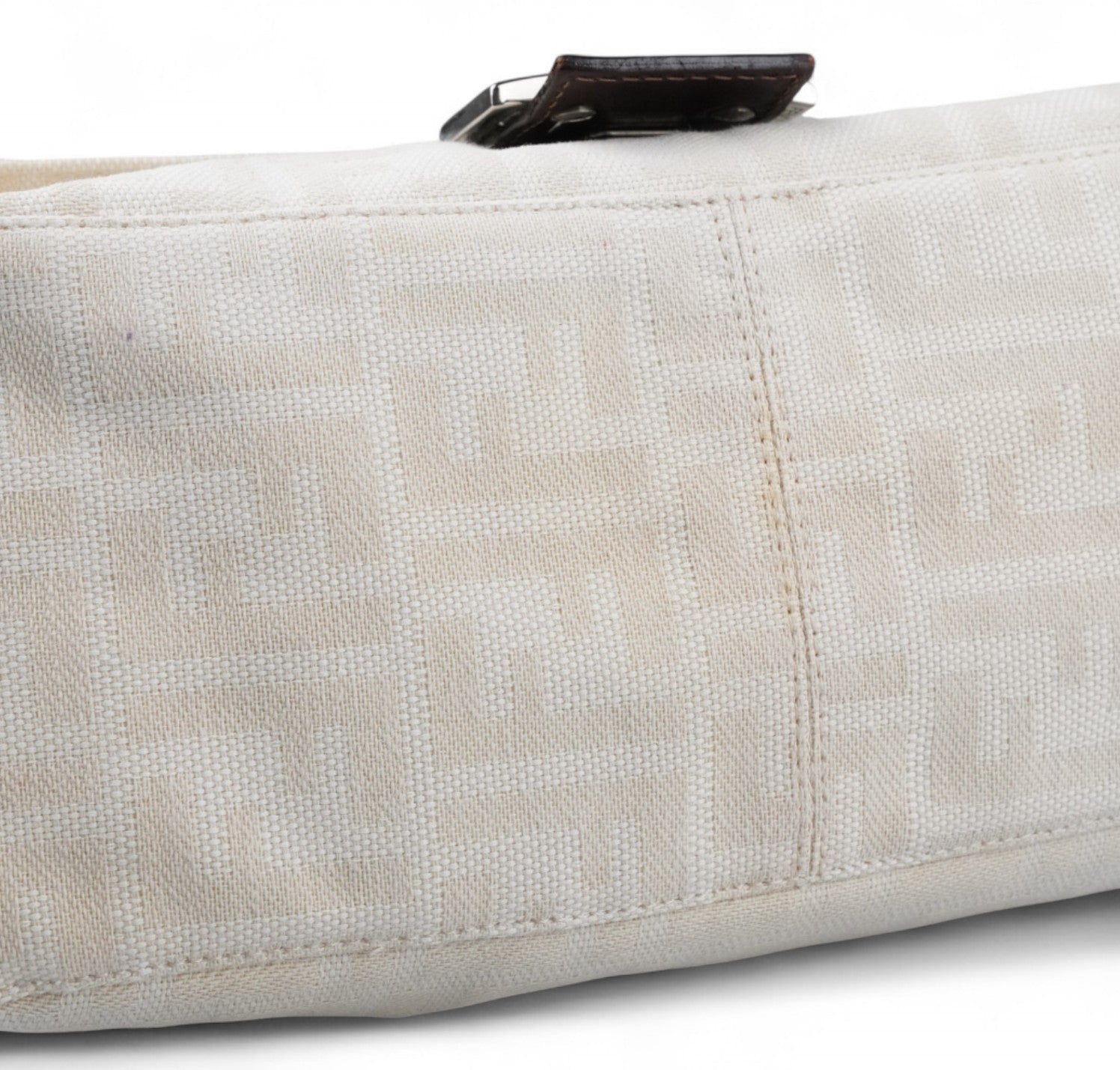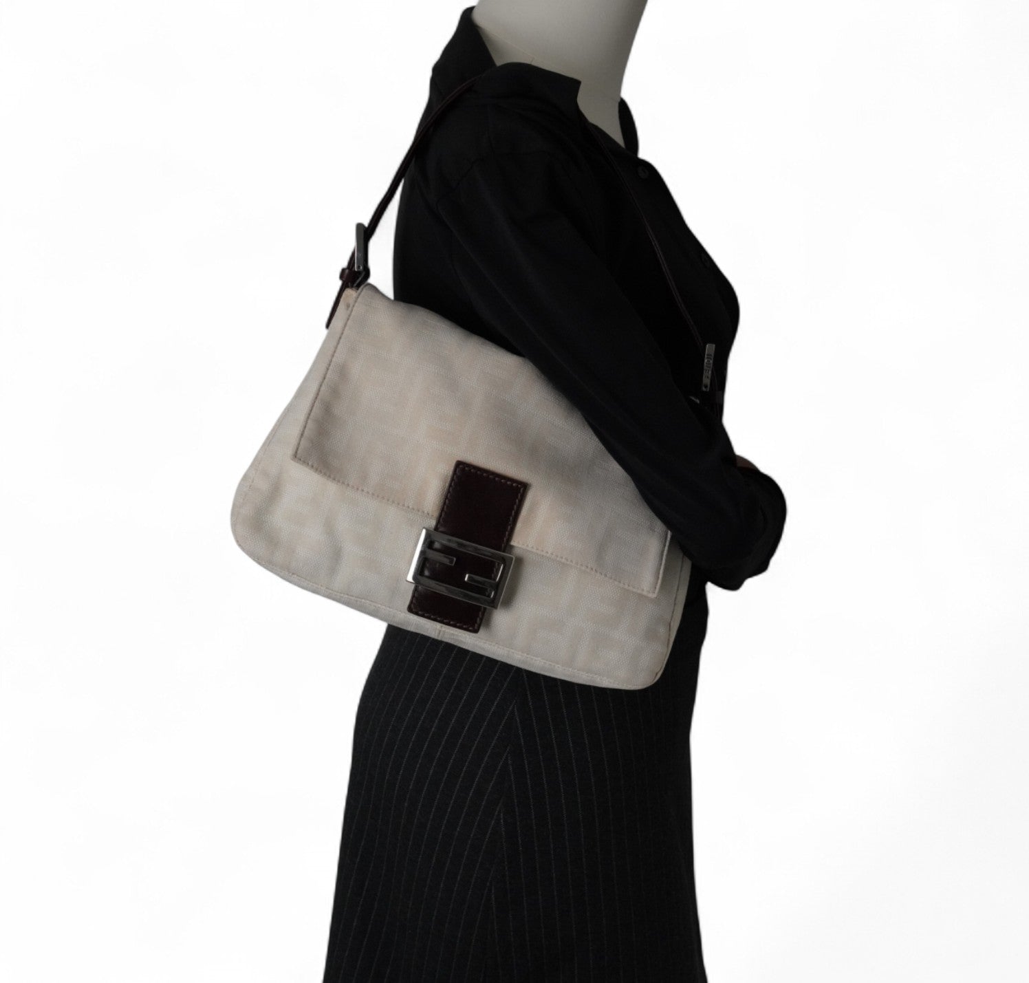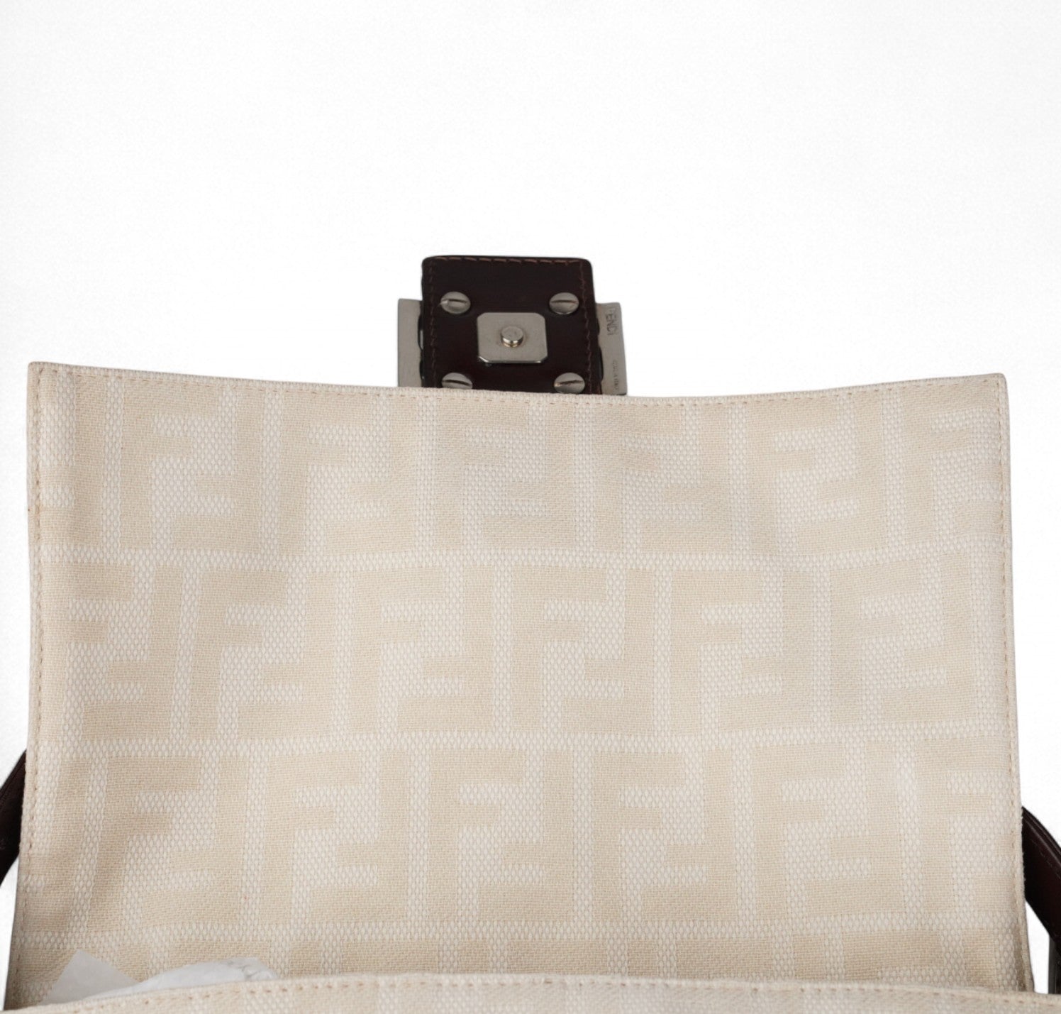 Borsa Fendi, modello Mamma Baguette, realizzata in Tela Zucca color Beige chiaro con Monogram a contrasto. Finiture in pelle Marrone. Metalleria Argento. Chiusura magnetica su patta frontale, impreziosita da logo metallico FF. Internamente foderata in tessuto marrone, tasca con zip. Lievi segni d'uso generali. Micro graffi alla metalleria. Normali segni del tempo.