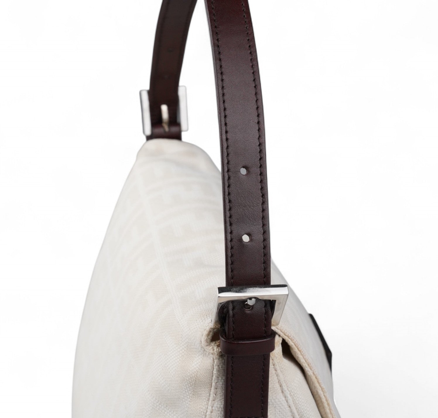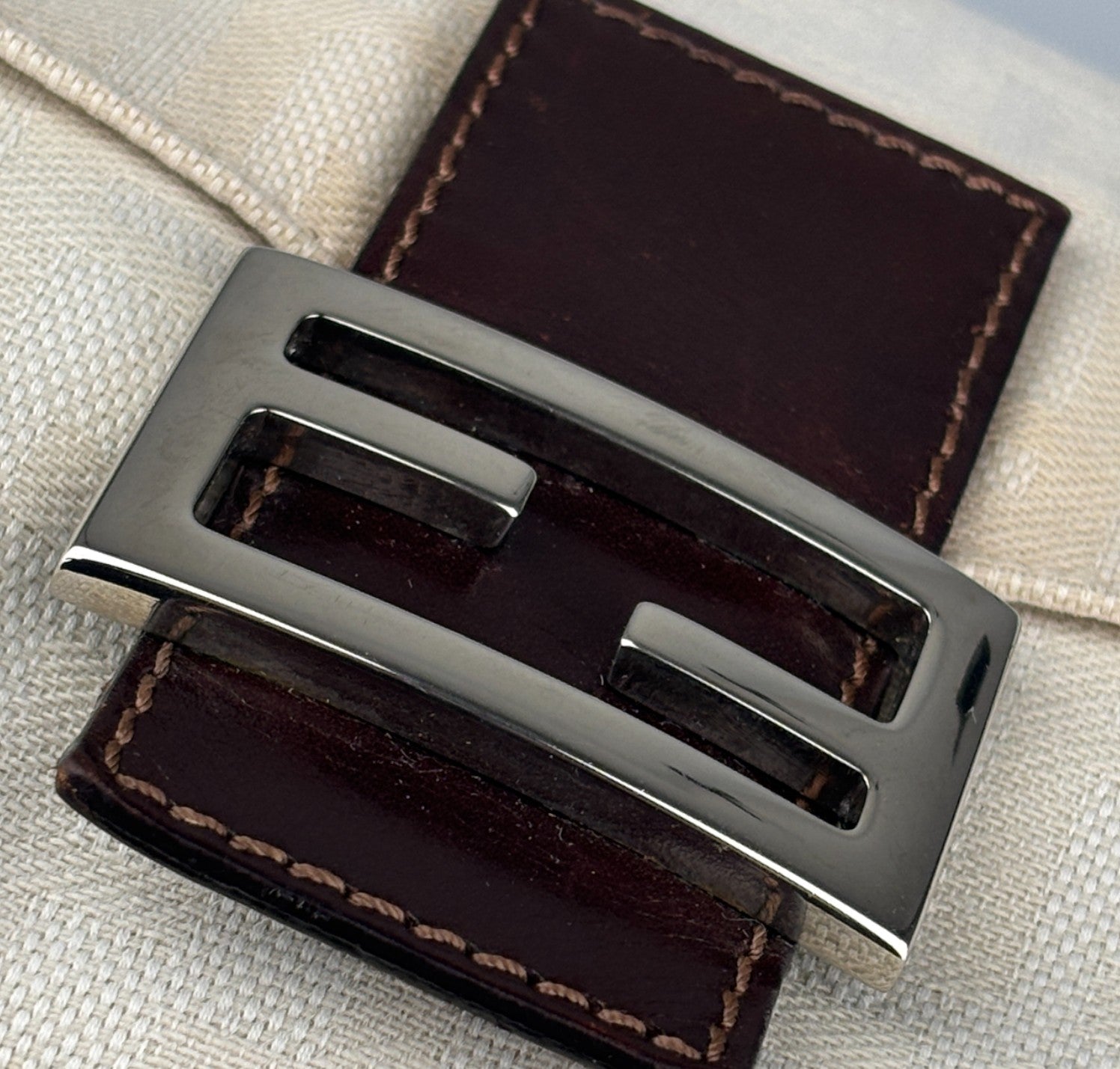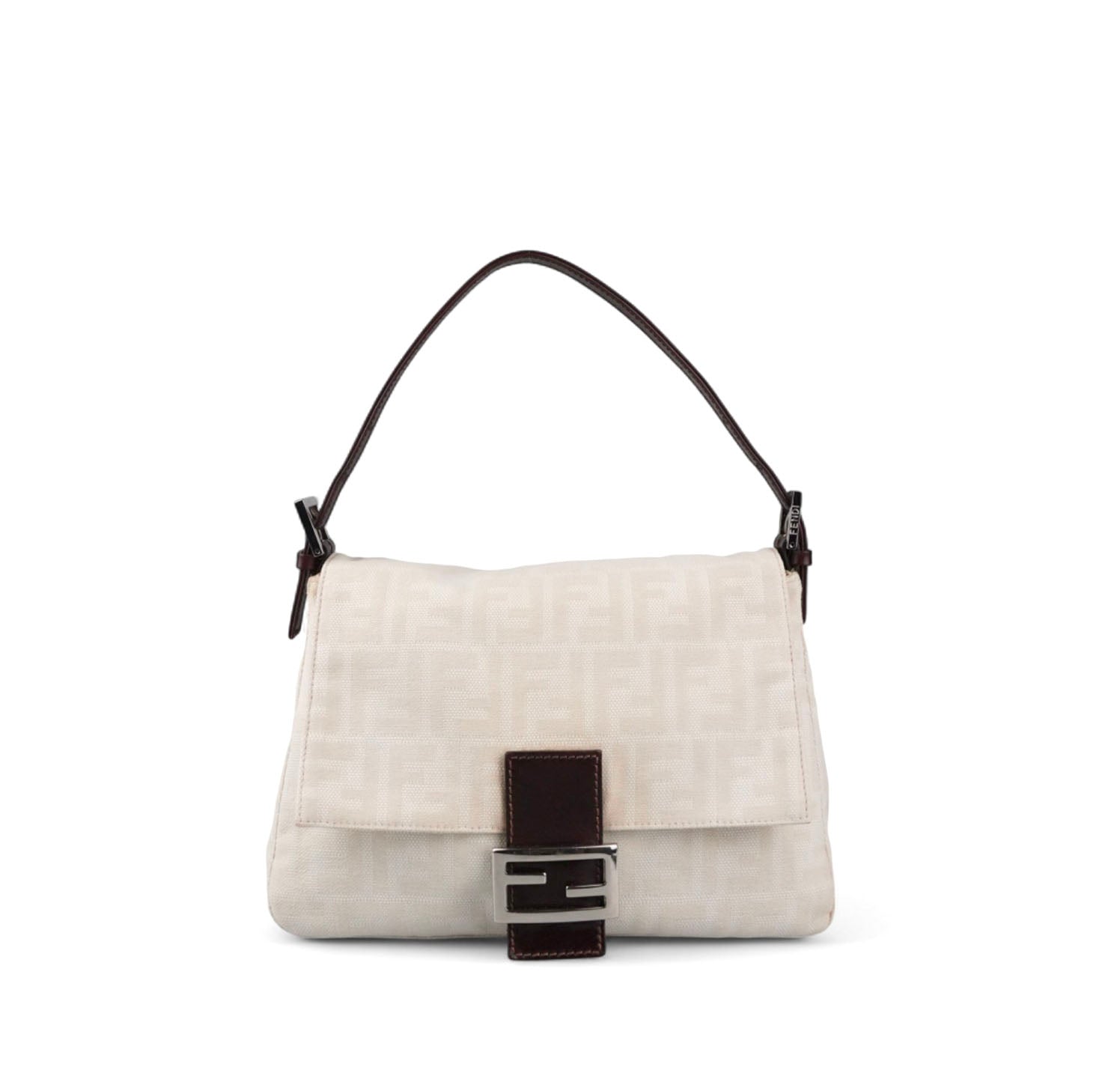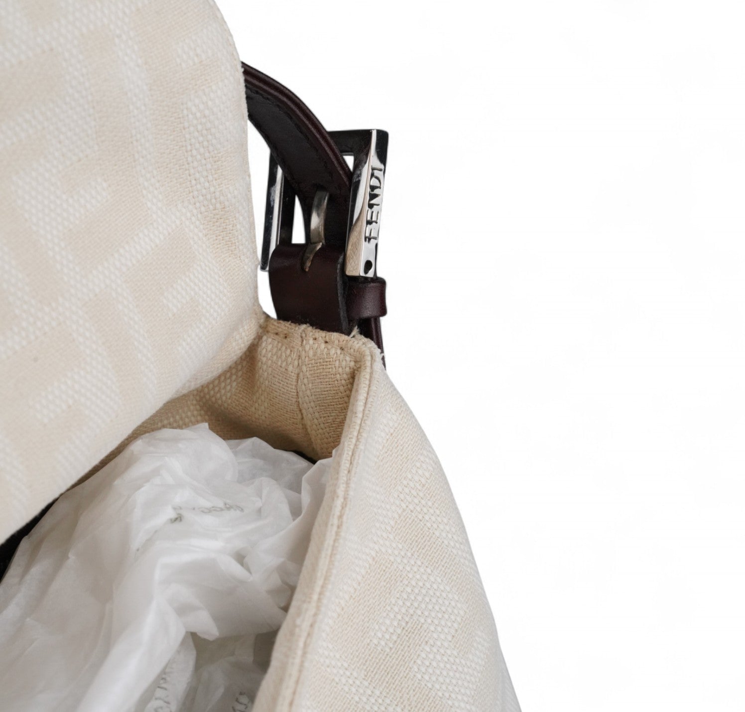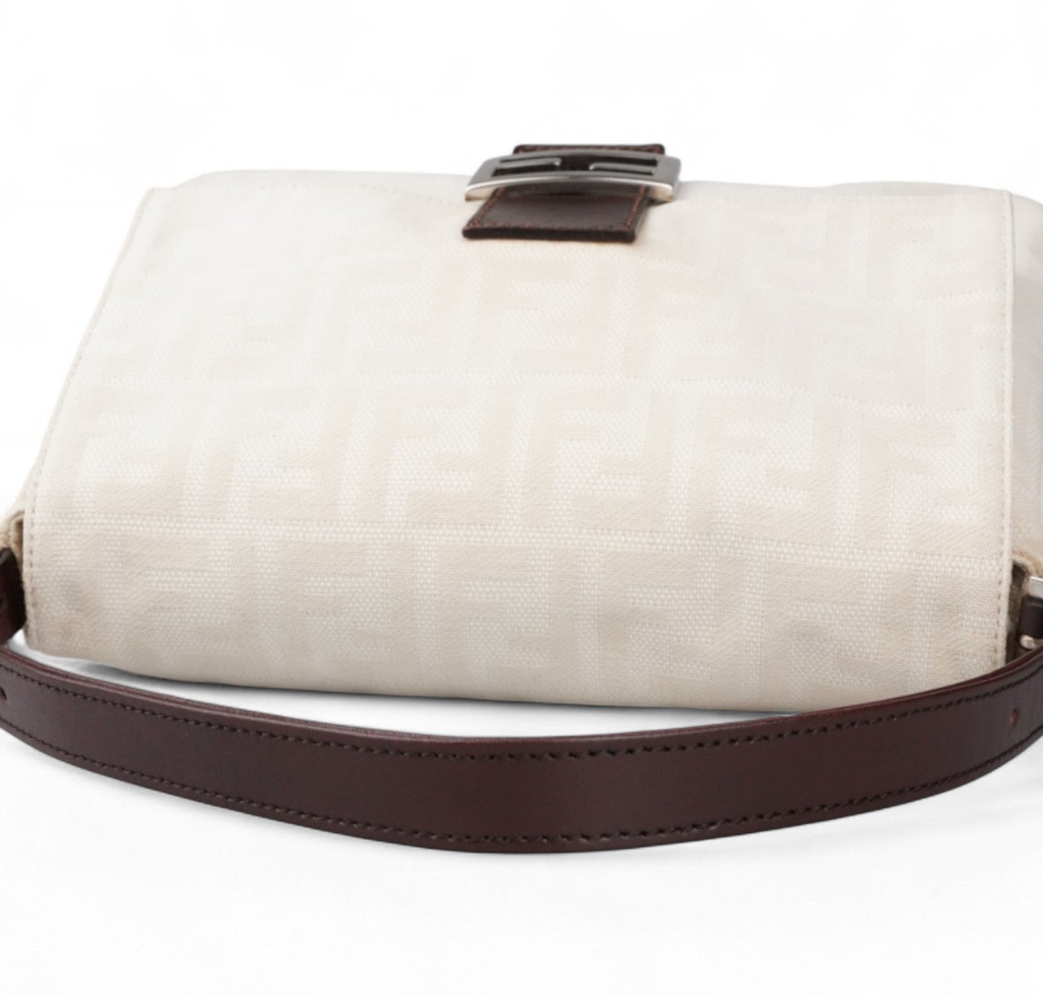 Borsa Fendi, modello Mamma Baguette, realizzata in Tela Zucca color Beige chiaro con Monogram a contrasto. Finiture in pelle Marrone. Metalleria Argento. Chiusura magnetica su patta frontale, impreziosita da logo metallico FF. Internamente foderata in tessuto marrone, tasca con zip. Lievi segni d'uso generali. Micro graffi alla metalleria. Normali segni del tempo.