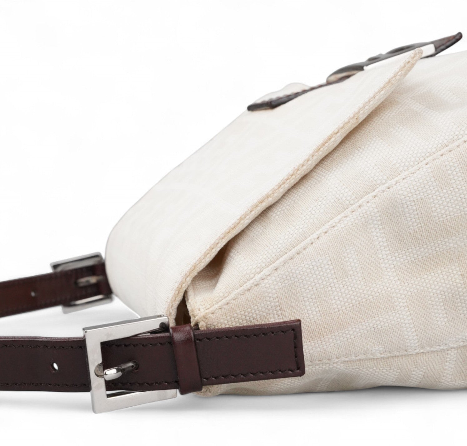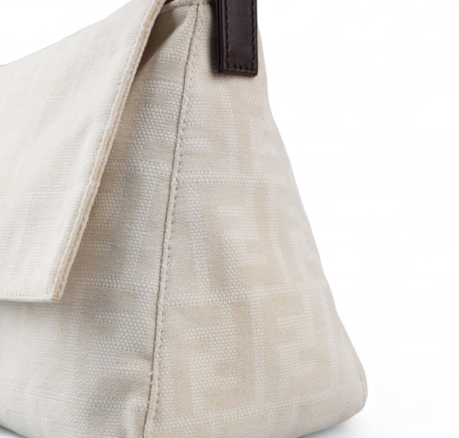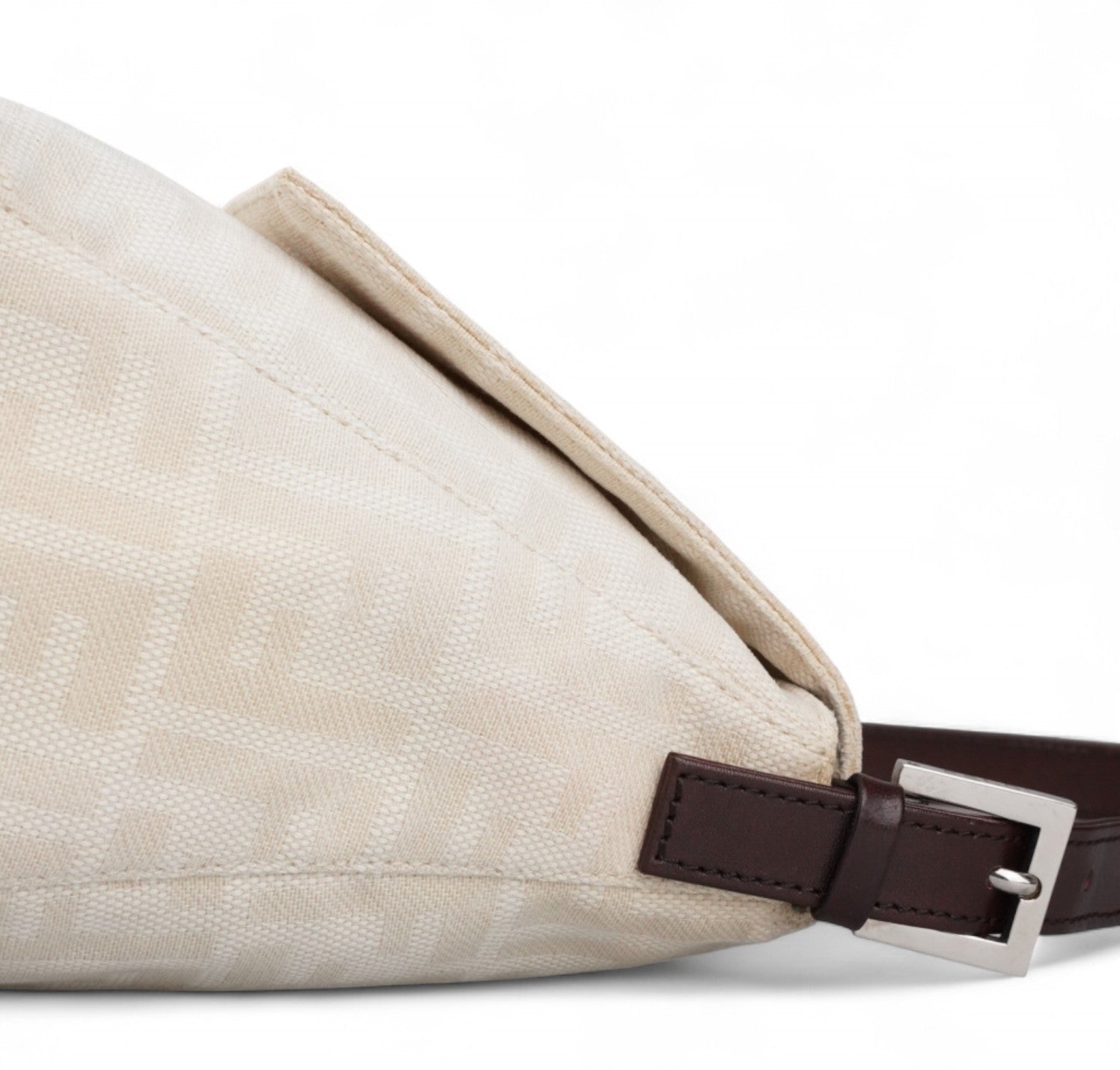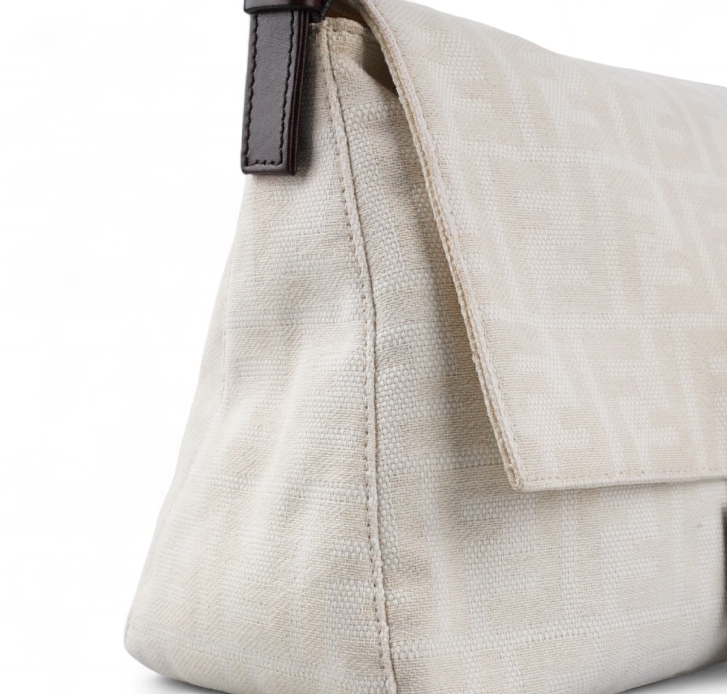 Borsa Fendi, modello Mamma Baguette, realizzata in Tela Zucca color Beige chiaro con Monogram a contrasto. Finiture in pelle Marrone. Metalleria Argento. Chiusura magnetica su patta frontale, impreziosita da logo metallico FF. Internamente foderata in tessuto marrone, tasca con zip. Lievi segni d'uso generali. Micro graffi alla metalleria. Normali segni del tempo.
