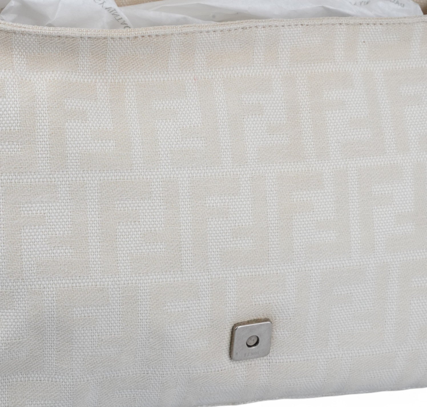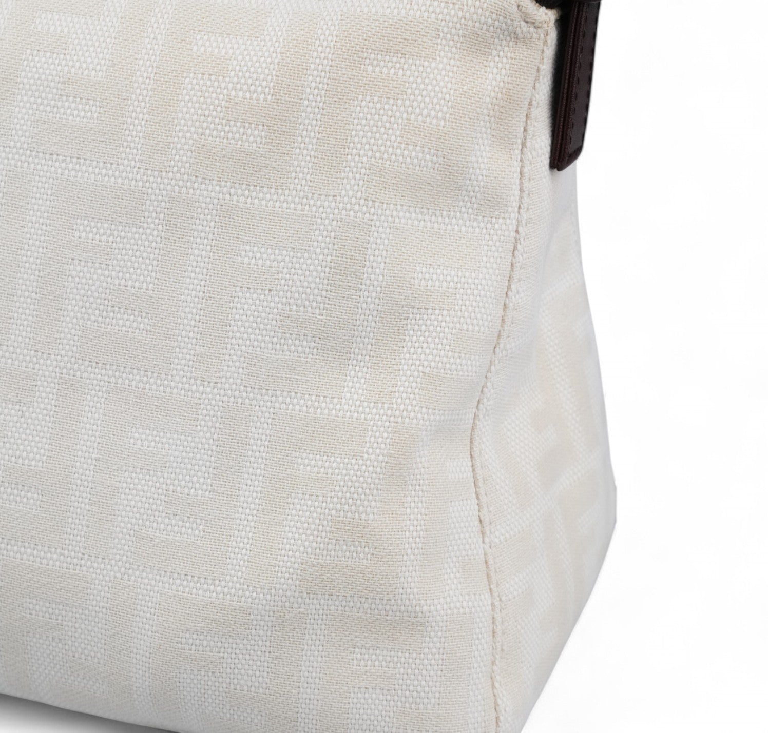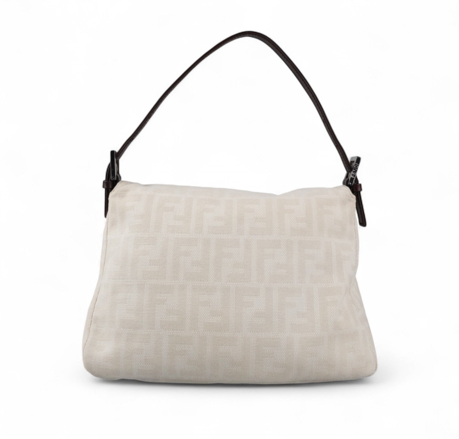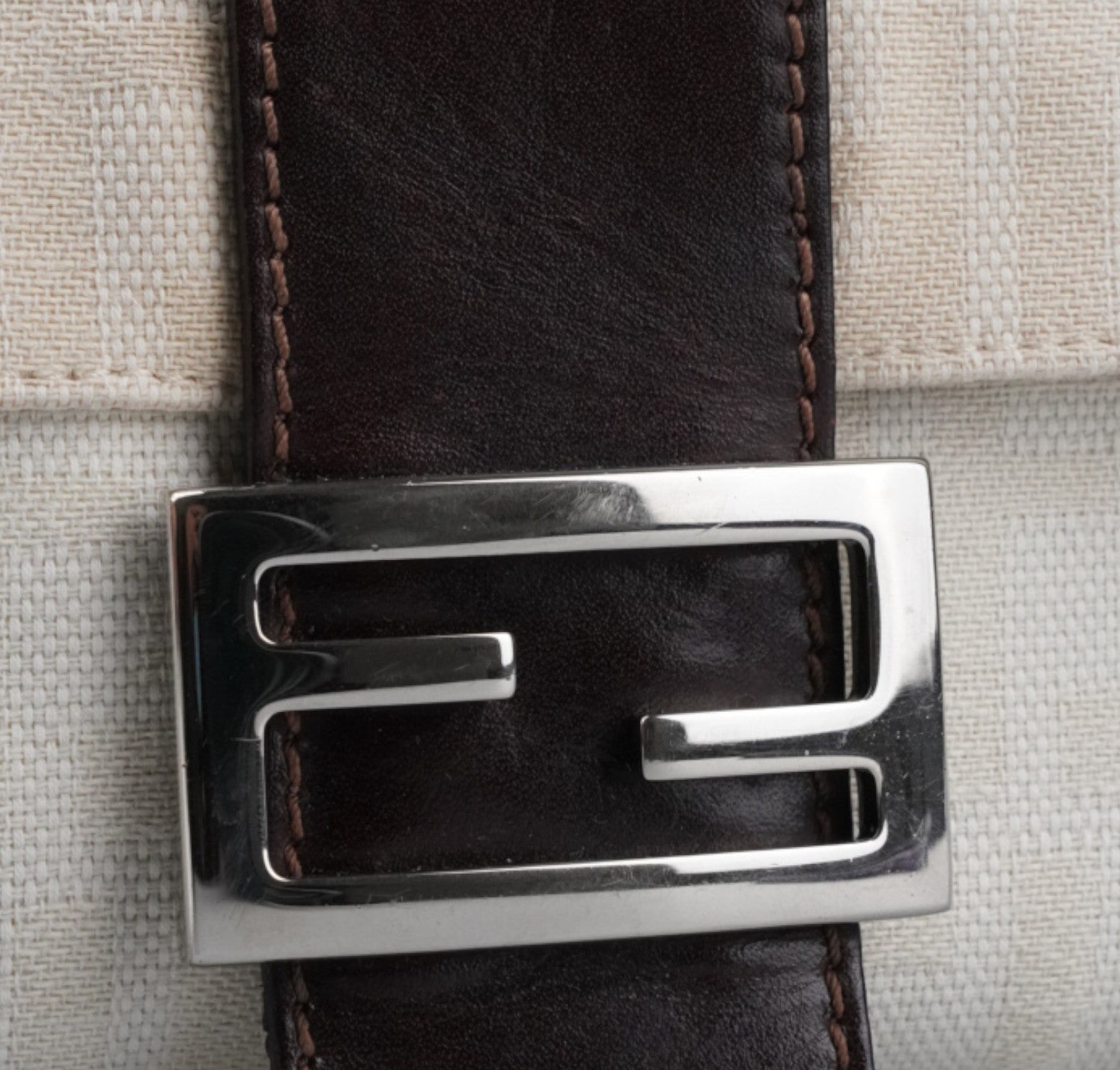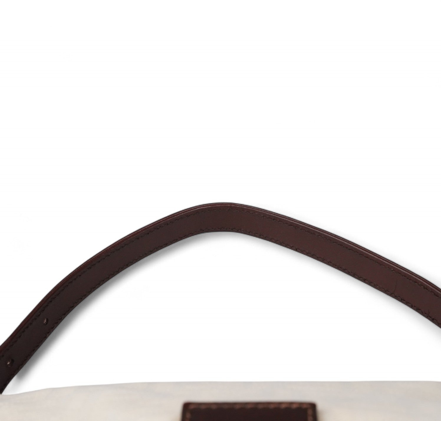 Borsa Fendi, modello Mamma Baguette, realizzata in Tela Zucca color Beige chiaro con Monogram a contrasto. Finiture in pelle Marrone. Metalleria Argento. Chiusura magnetica su patta frontale, impreziosita da logo metallico FF. Internamente foderata in tessuto marrone, tasca con zip. Lievi segni d'uso generali. Micro graffi alla metalleria. Normali segni del tempo.