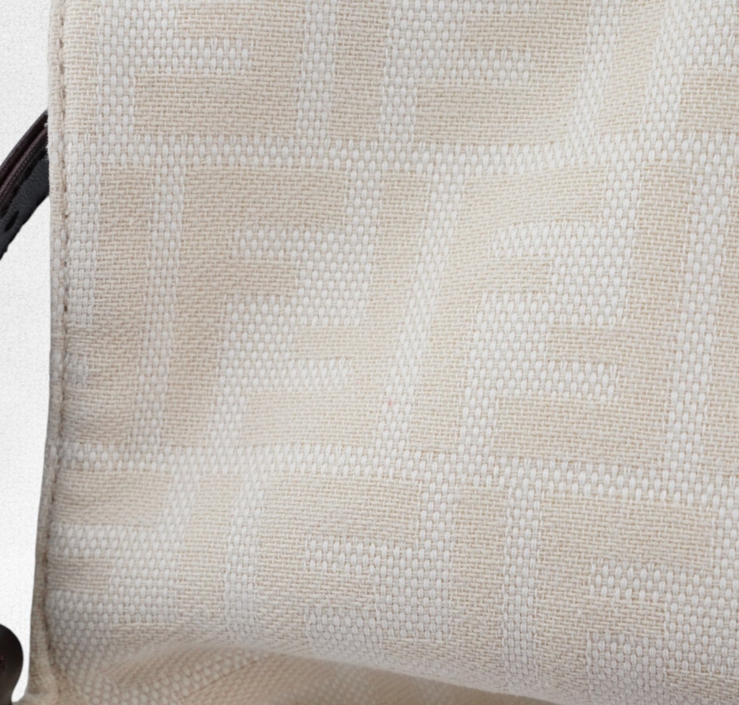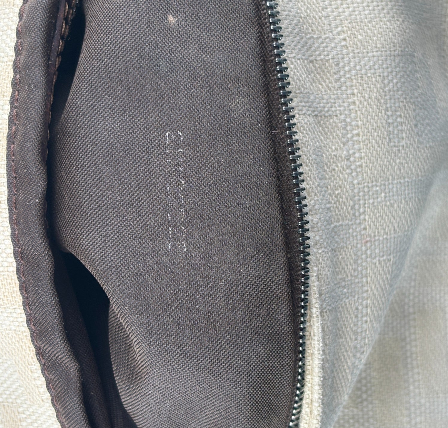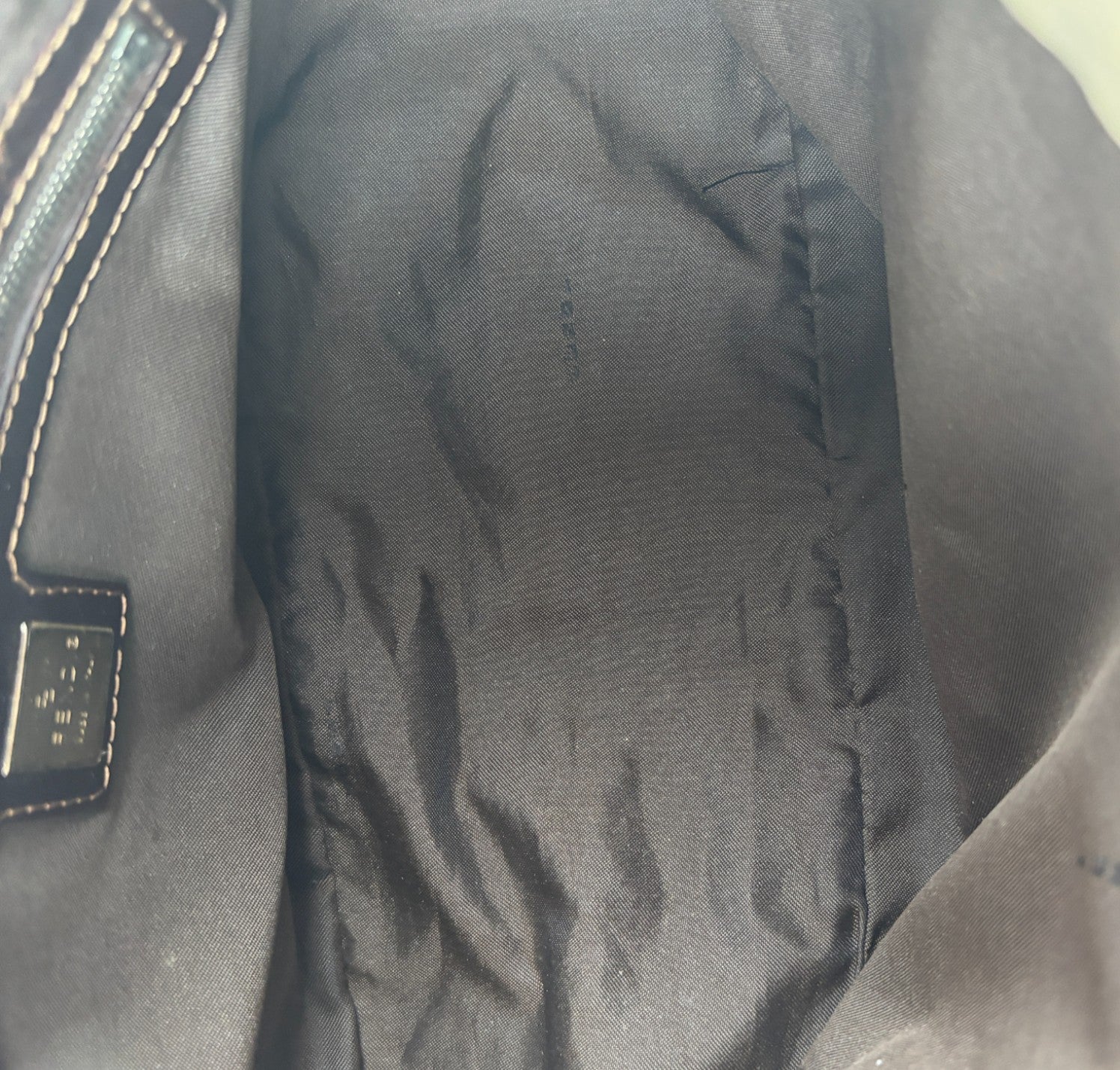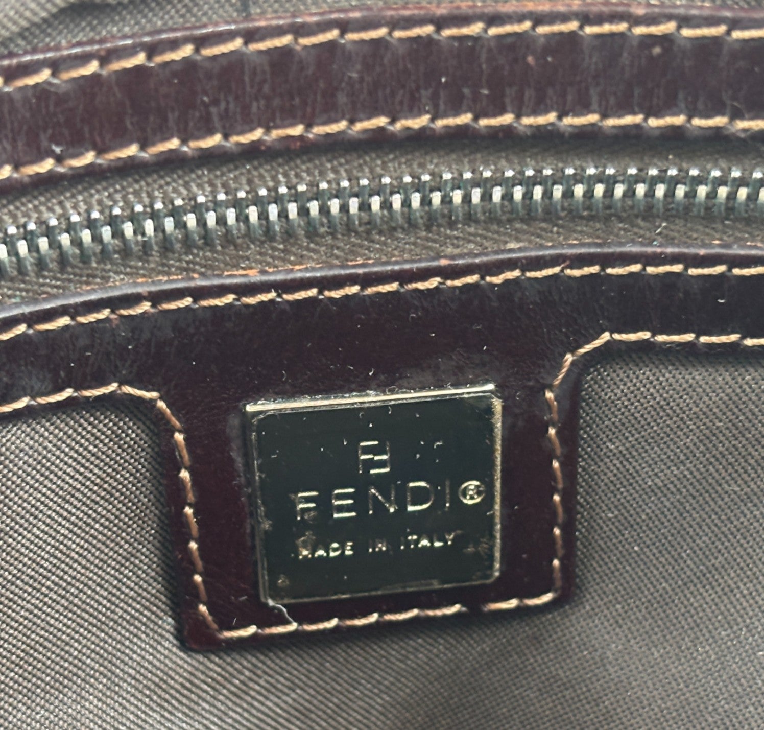 Borsa Fendi, modello Mamma Baguette, realizzata in Tela Zucca color Beige chiaro con Monogram a contrasto. Finiture in pelle Marrone. Metalleria Argento. Chiusura magnetica su patta frontale, impreziosita da logo metallico FF. Internamente foderata in tessuto marrone, tasca con zip. Lievi segni d'uso generali. Micro graffi alla metalleria. Normali segni del tempo.
