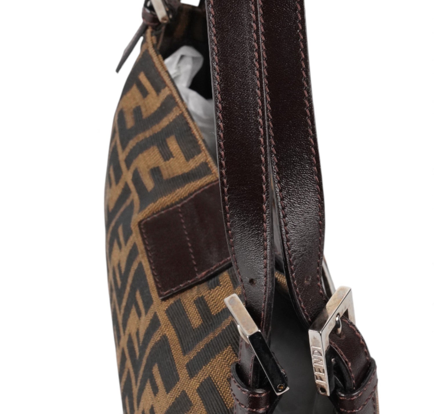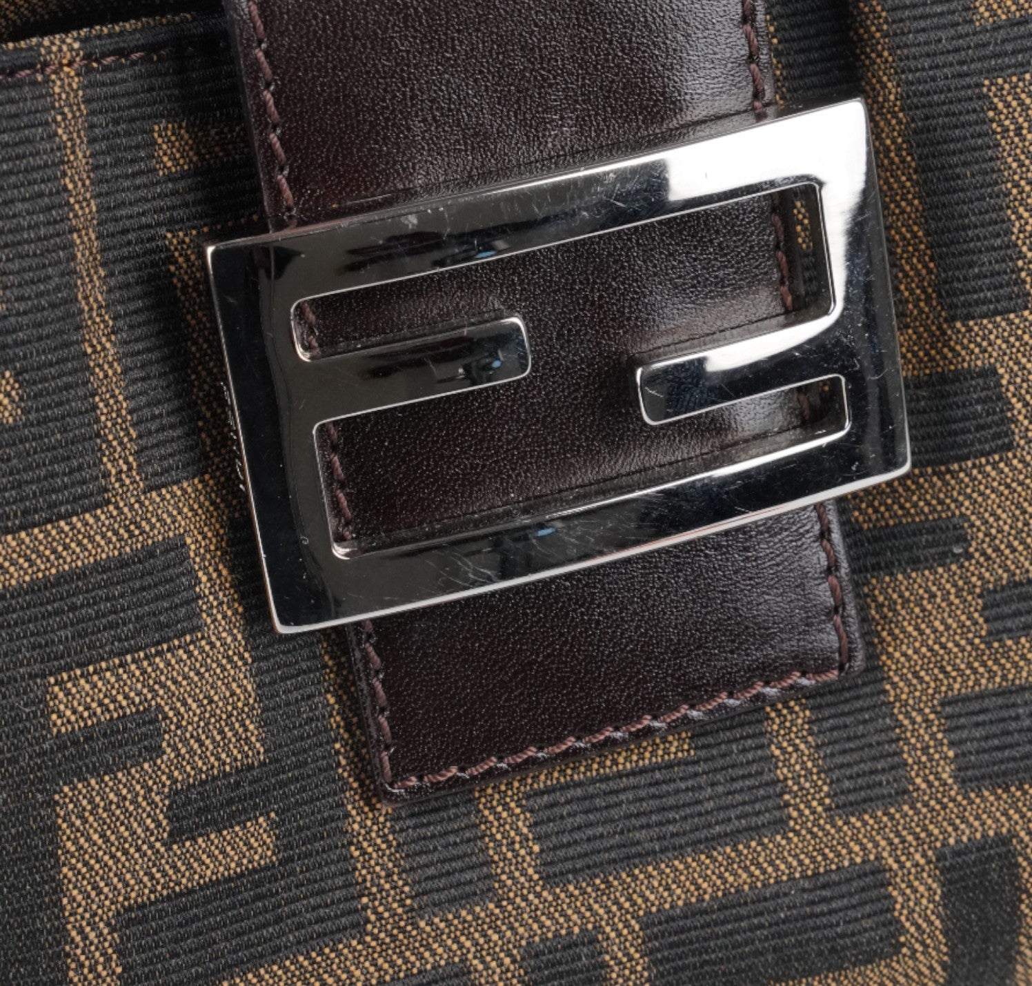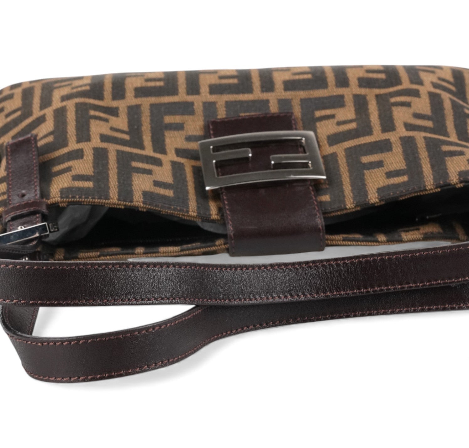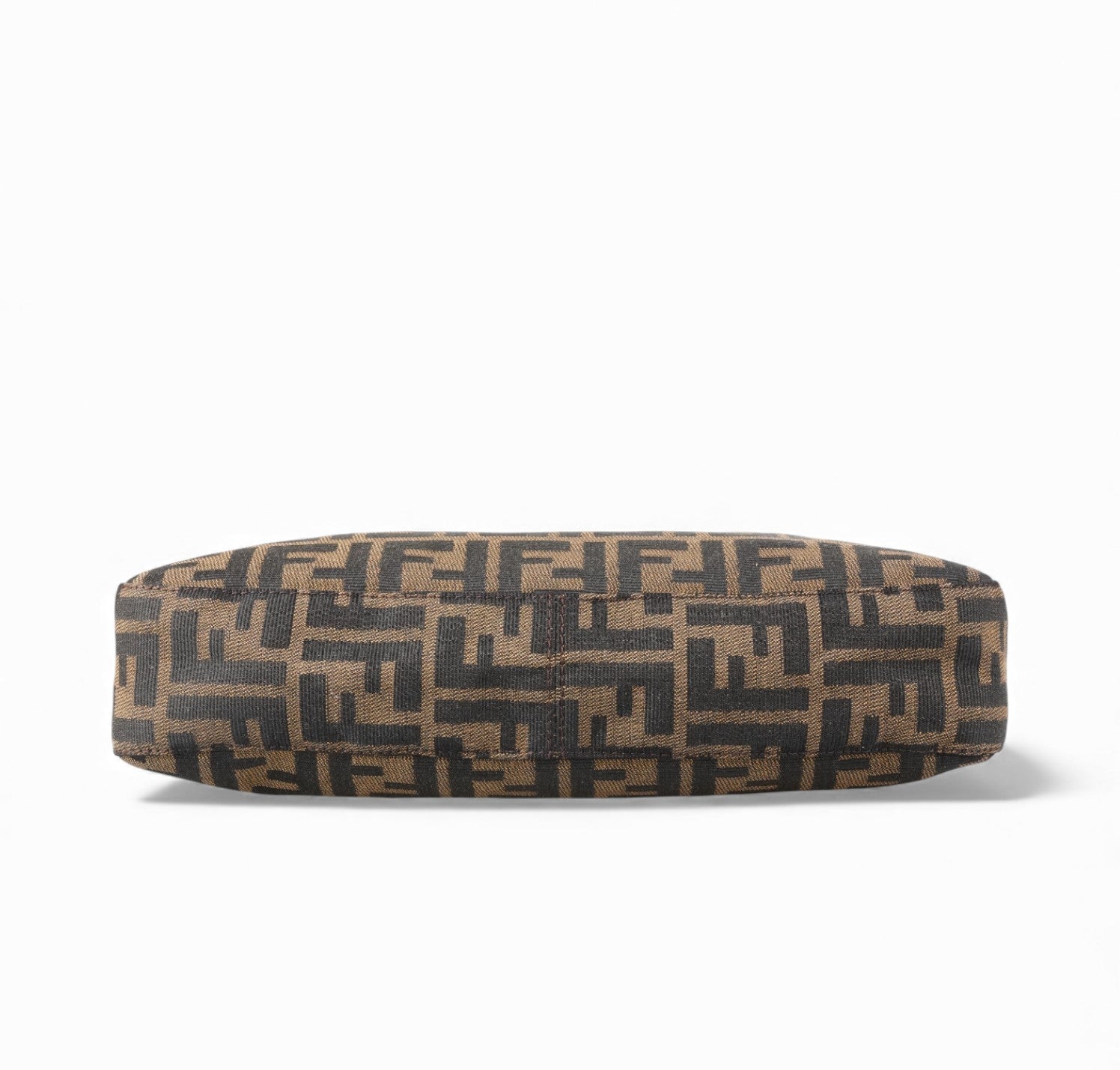 Borsa Fendi, modello Mamma Baguette Moon Half, realizzata in Tela Monogram con dettagli in pelle marrone. Chiusura frontale con iconica fibbia FF in metallo Argento. Interno foderato in tessuto con tasca con zip, parte superiore aperta. Munita di doppio manico superiore regolabile tramite fibbie per un utilizzo a spalla personalizzato. In ottimo stato generale con lievi segni d’uso su pelle e micro graffi e minimi segni su metalleria.