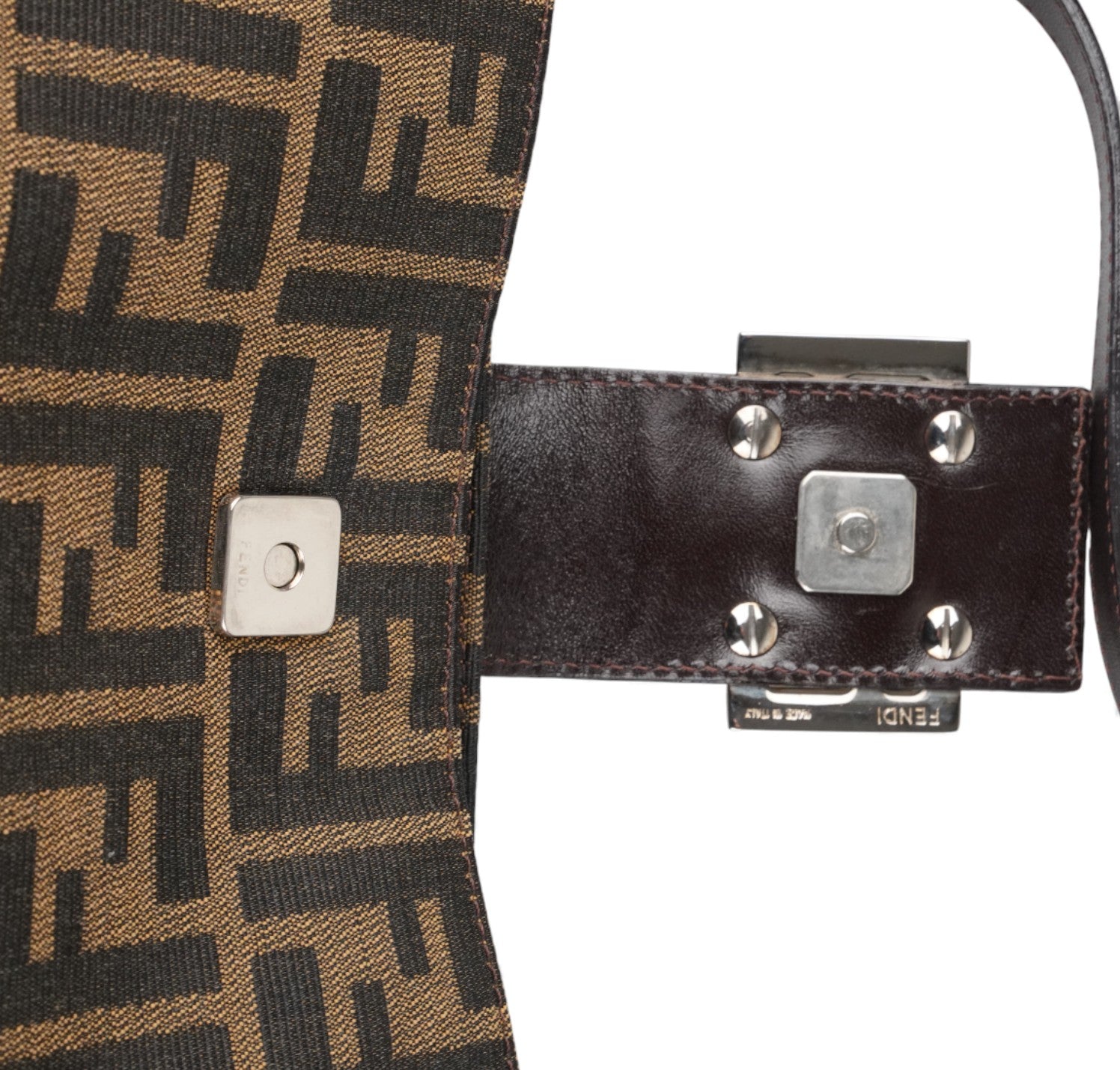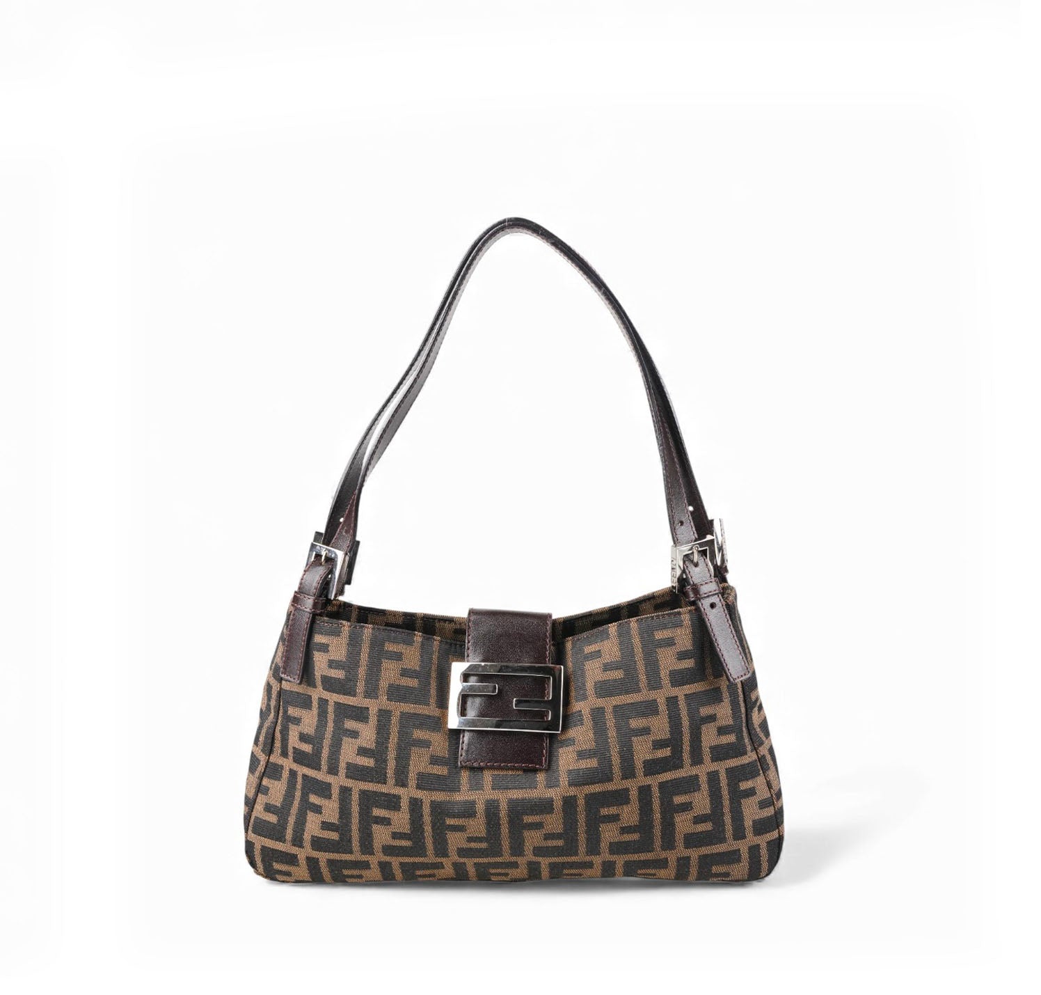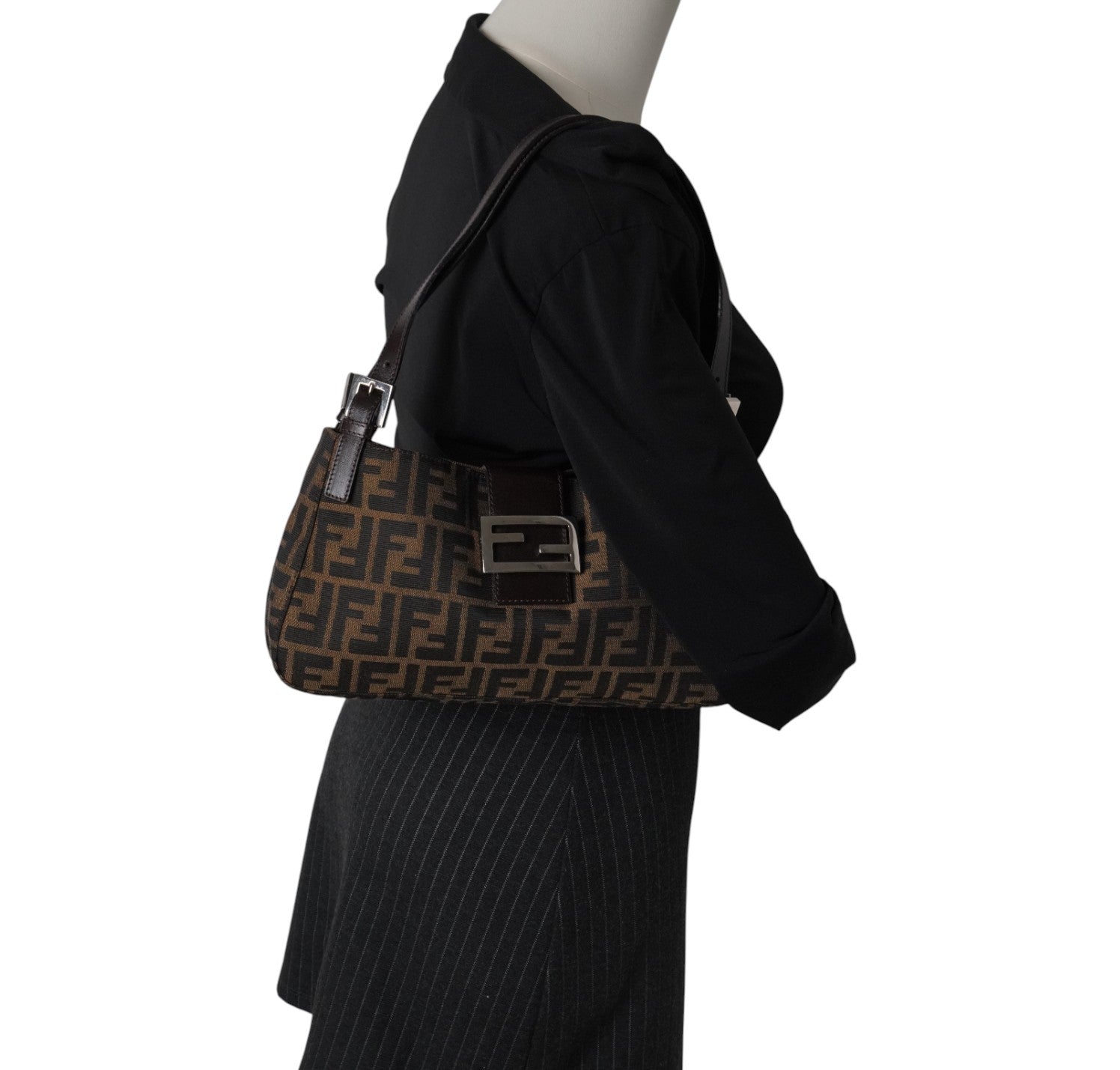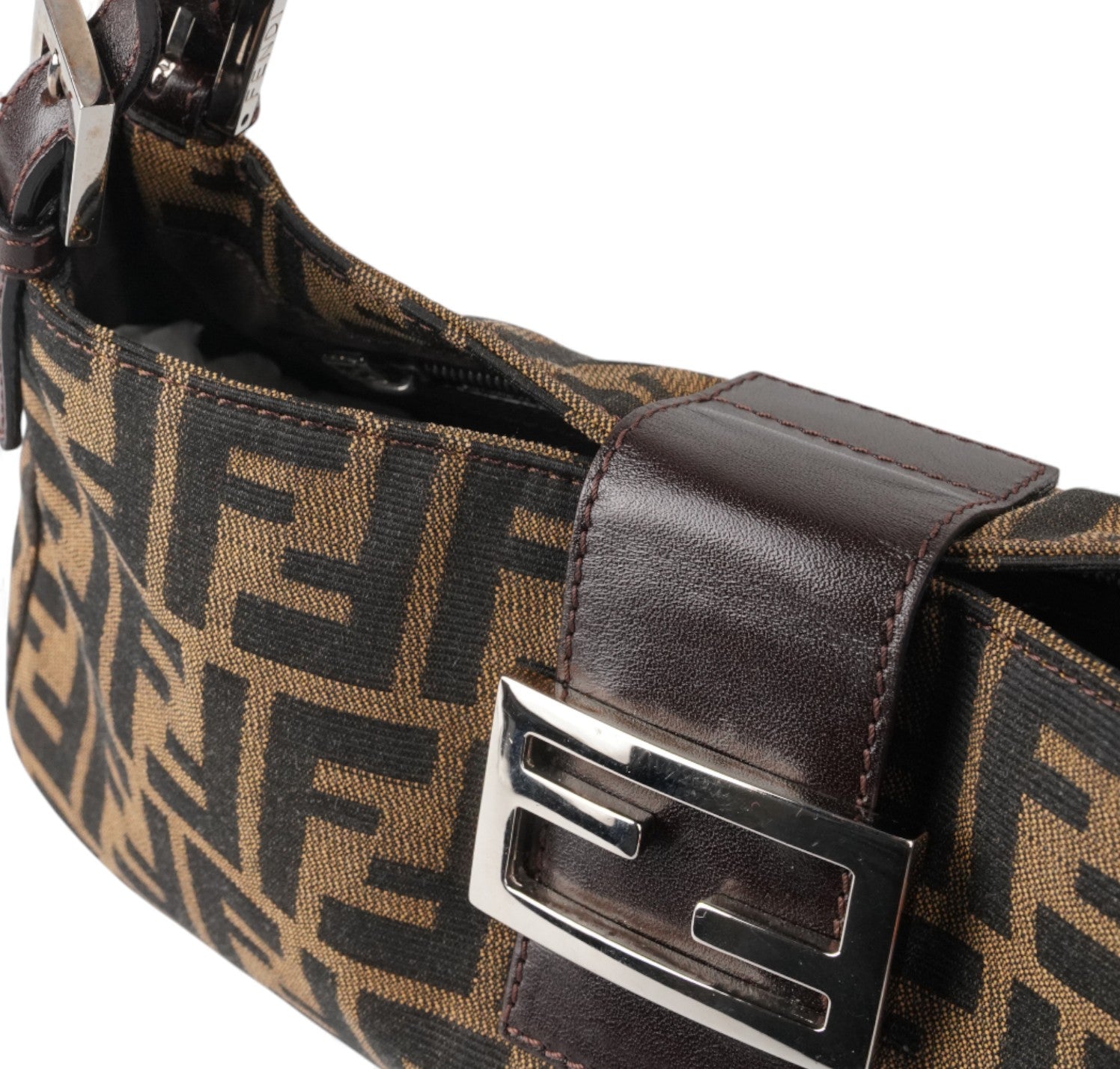 Borsa Fendi, modello Mamma Baguette Moon Half, realizzata in Tela Monogram con dettagli in pelle marrone. Chiusura frontale con iconica fibbia FF in metallo Argento. Interno foderato in tessuto con tasca con zip, parte superiore aperta. Munita di doppio manico superiore regolabile tramite fibbie per un utilizzo a spalla personalizzato. In ottimo stato generale con lievi segni d’uso su pelle e micro graffi e minimi segni su metalleria.