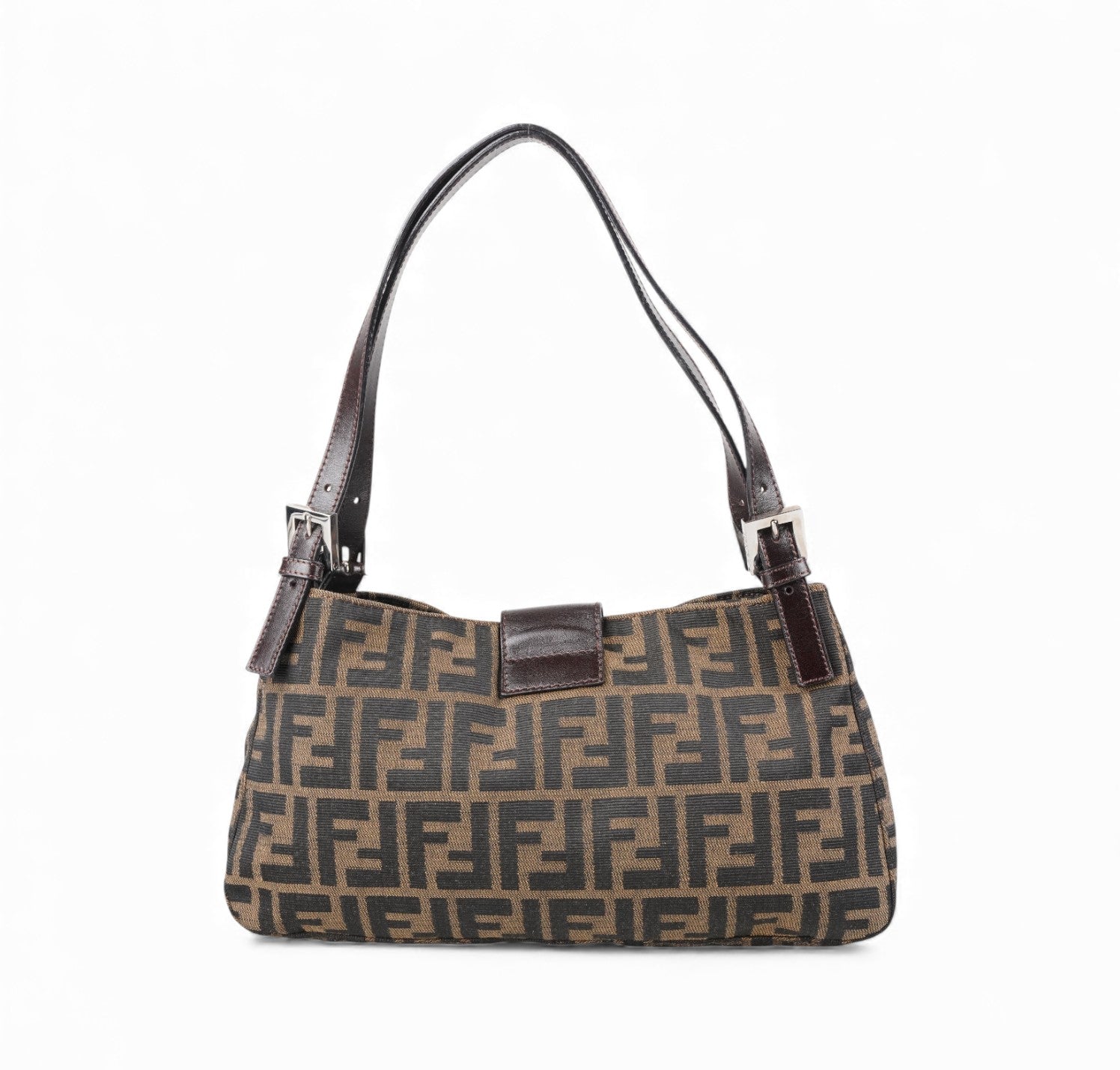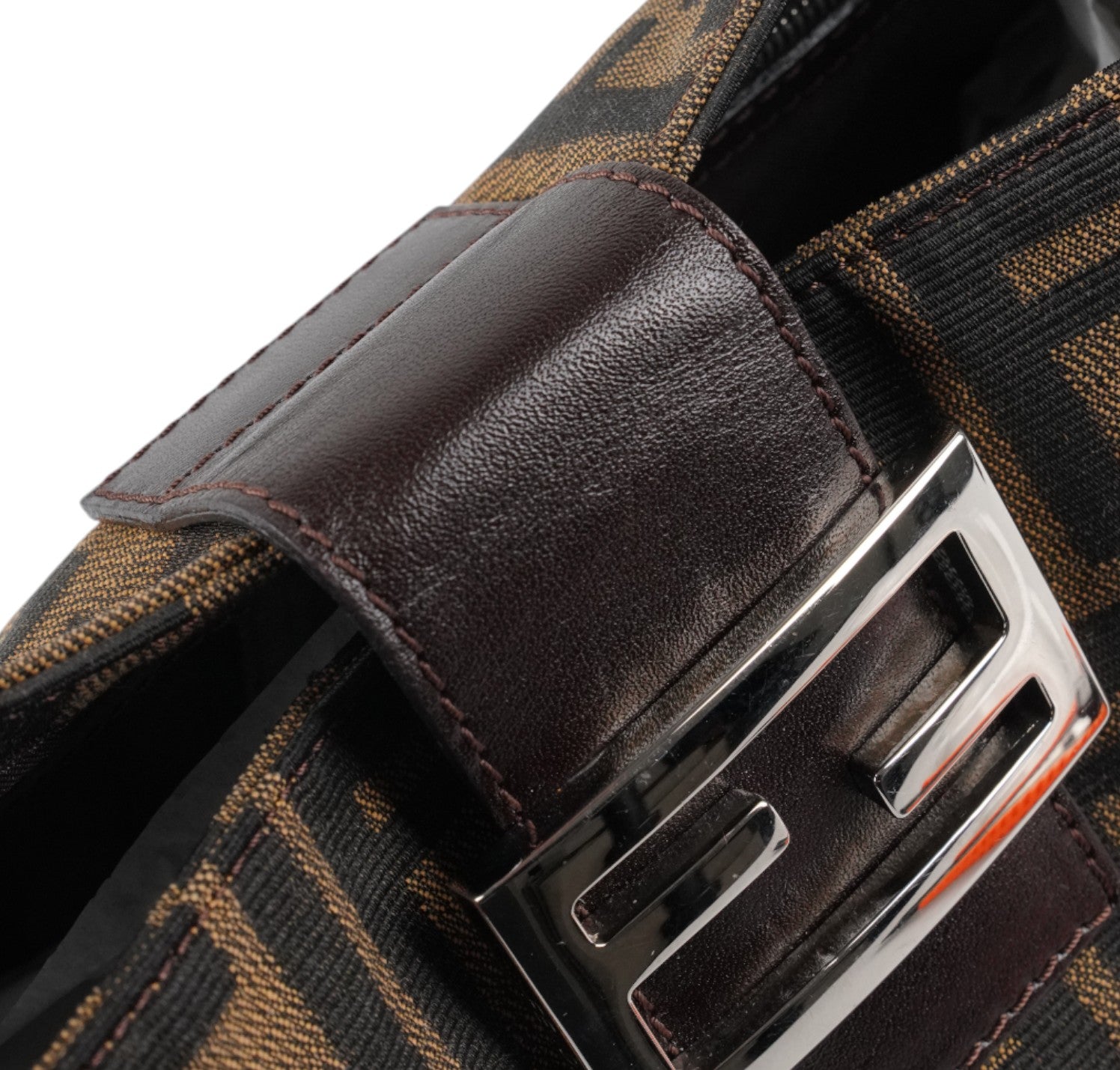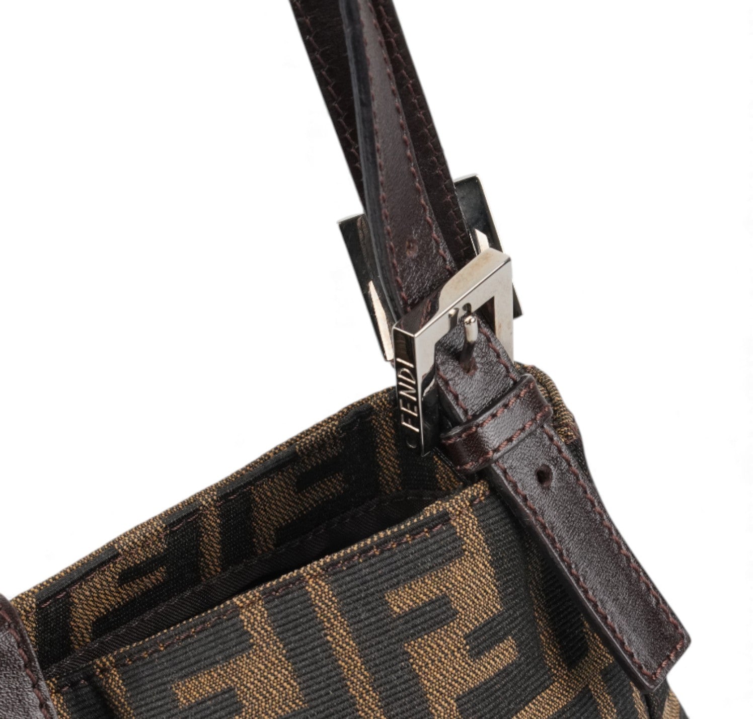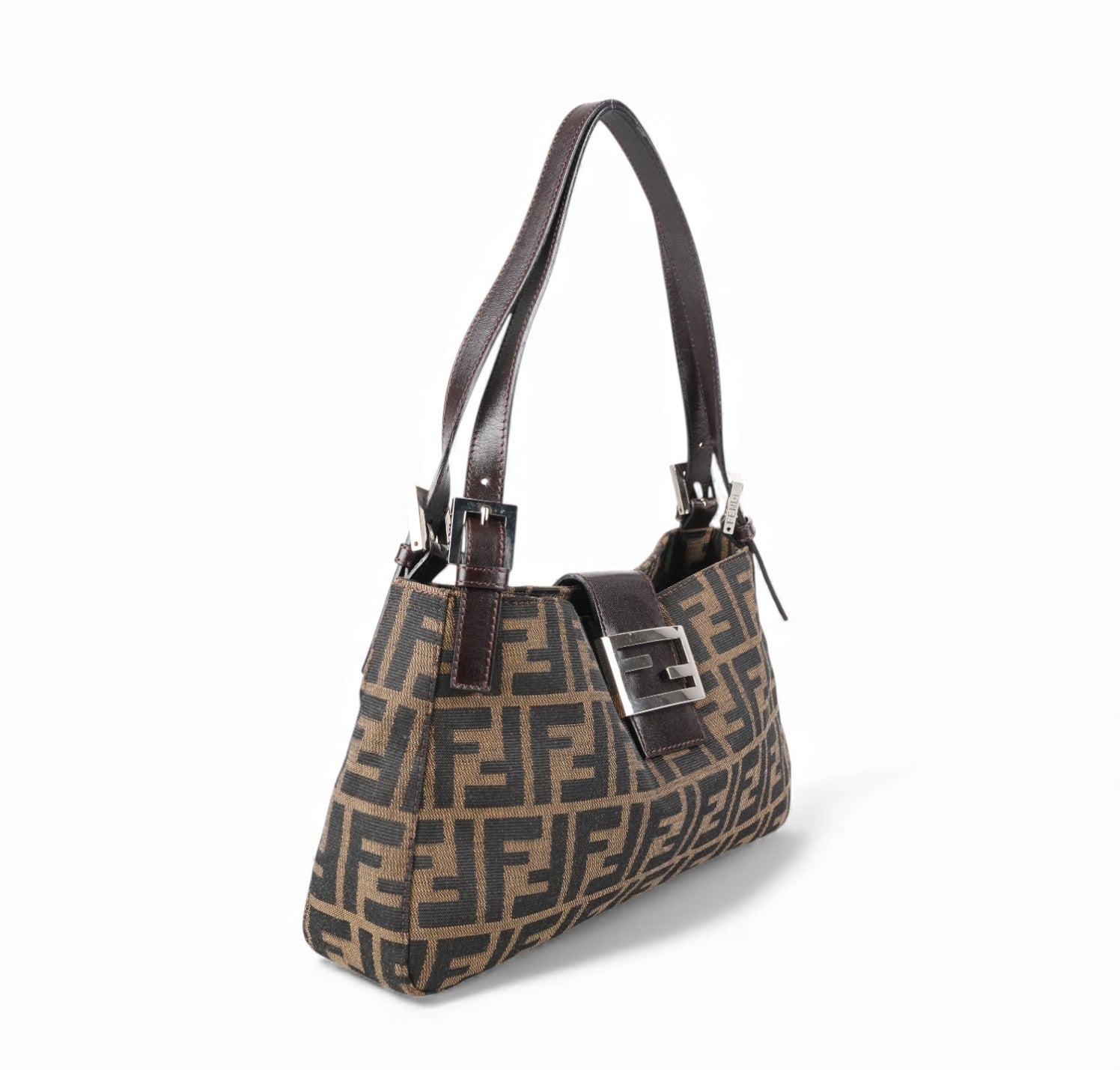 Borsa Fendi, modello Mamma Baguette Moon Half, realizzata in Tela Monogram con dettagli in pelle marrone. Chiusura frontale con iconica fibbia FF in metallo Argento. Interno foderato in tessuto con tasca con zip, parte superiore aperta. Munita di doppio manico superiore regolabile tramite fibbie per un utilizzo a spalla personalizzato. In ottimo stato generale con lievi segni d’uso su pelle e micro graffi e minimi segni su metalleria.