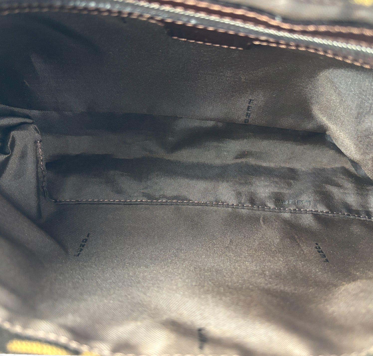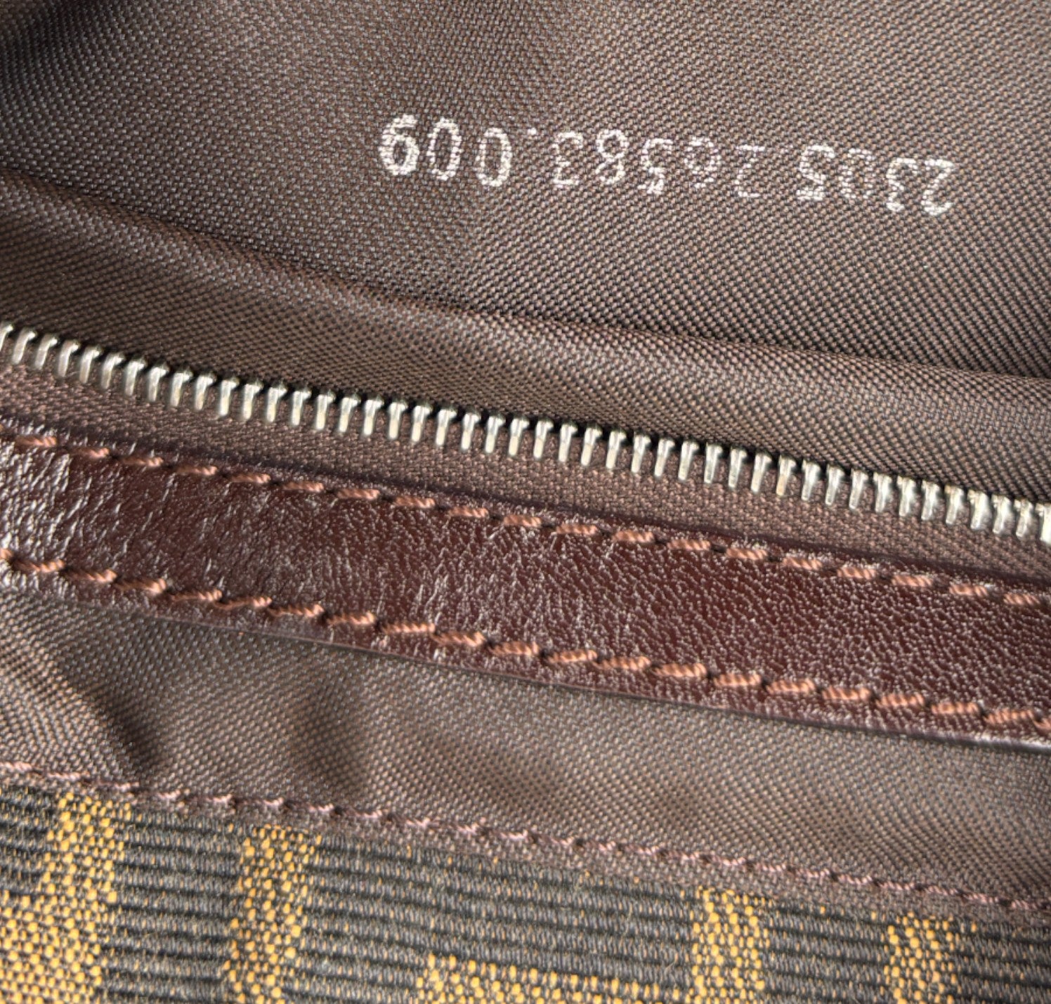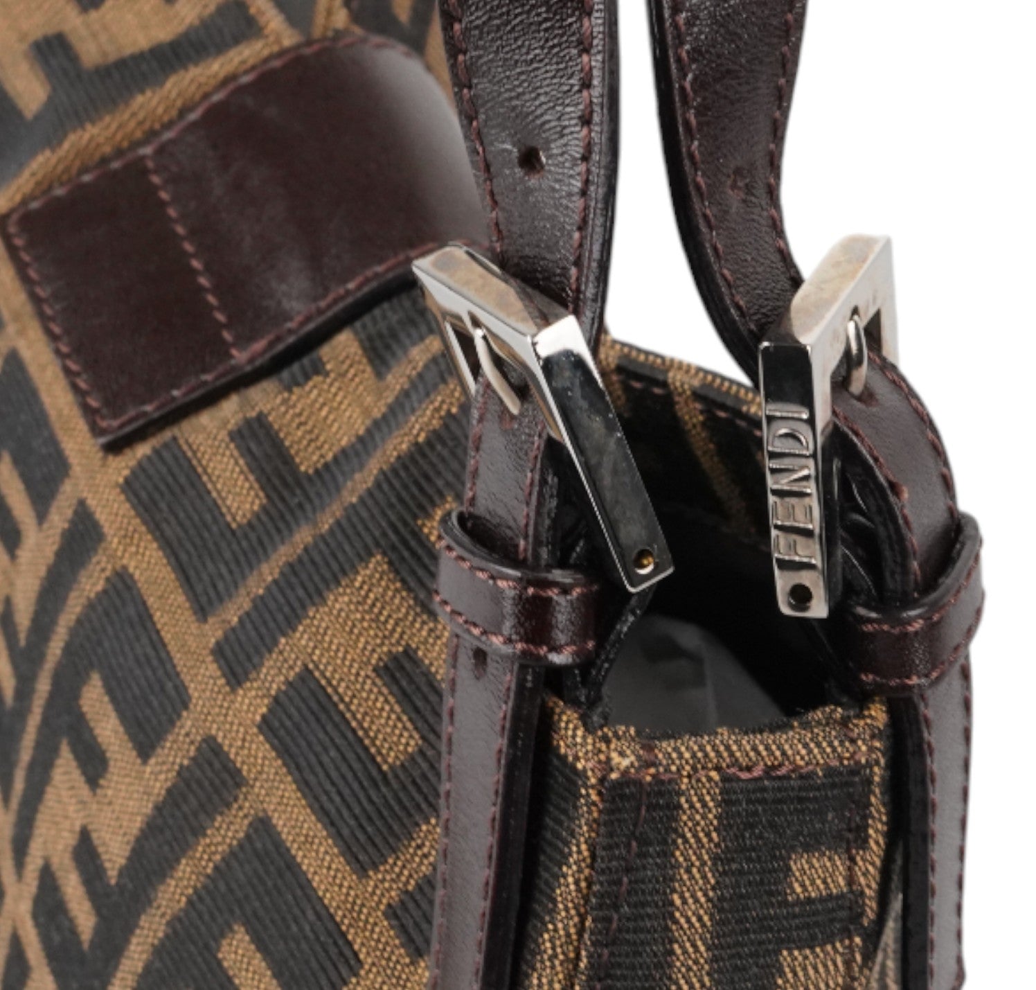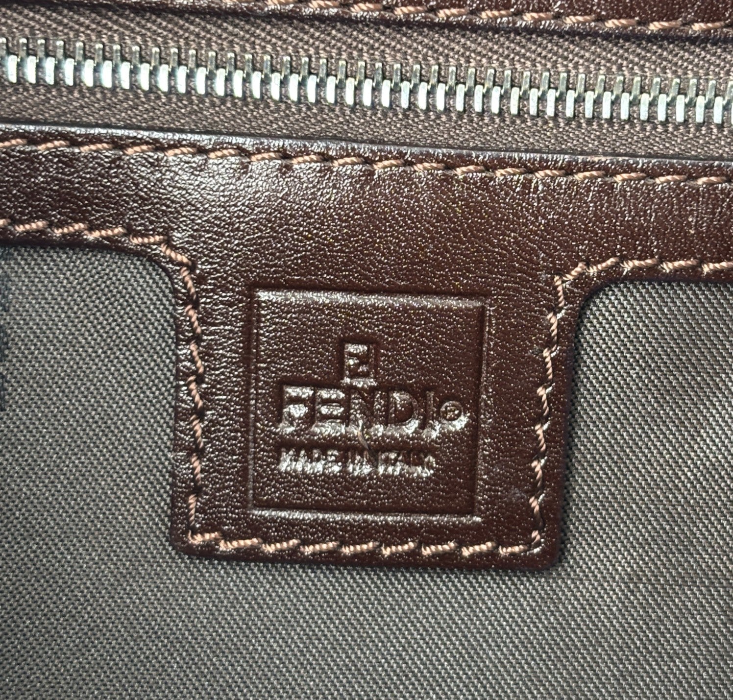 Borsa Fendi, modello Mamma Baguette Moon Half, realizzata in Tela Monogram con dettagli in pelle marrone. Chiusura frontale con iconica fibbia FF in metallo Argento. Interno foderato in tessuto con tasca con zip, parte superiore aperta. Munita di doppio manico superiore regolabile tramite fibbie per un utilizzo a spalla personalizzato. In ottimo stato generale con lievi segni d’uso su pelle e micro graffi e minimi segni su metalleria.