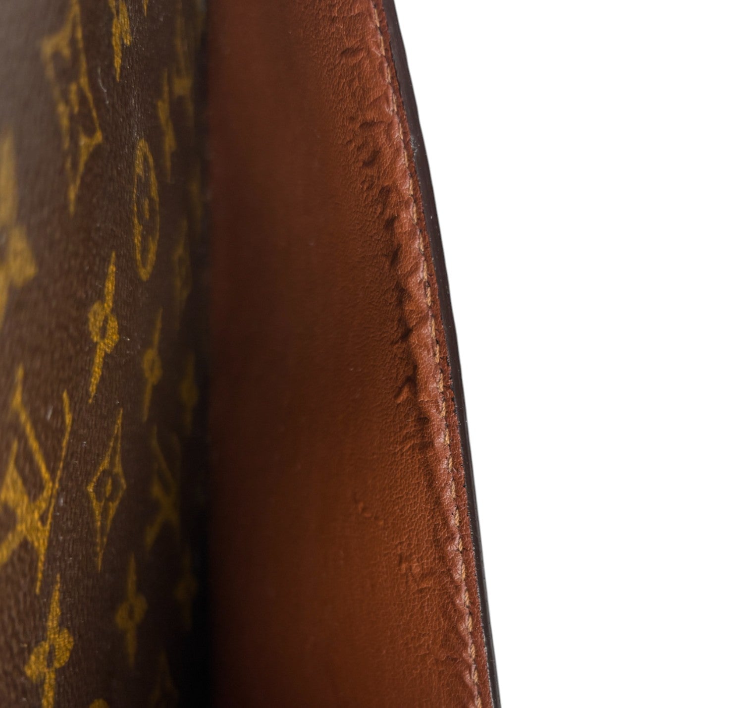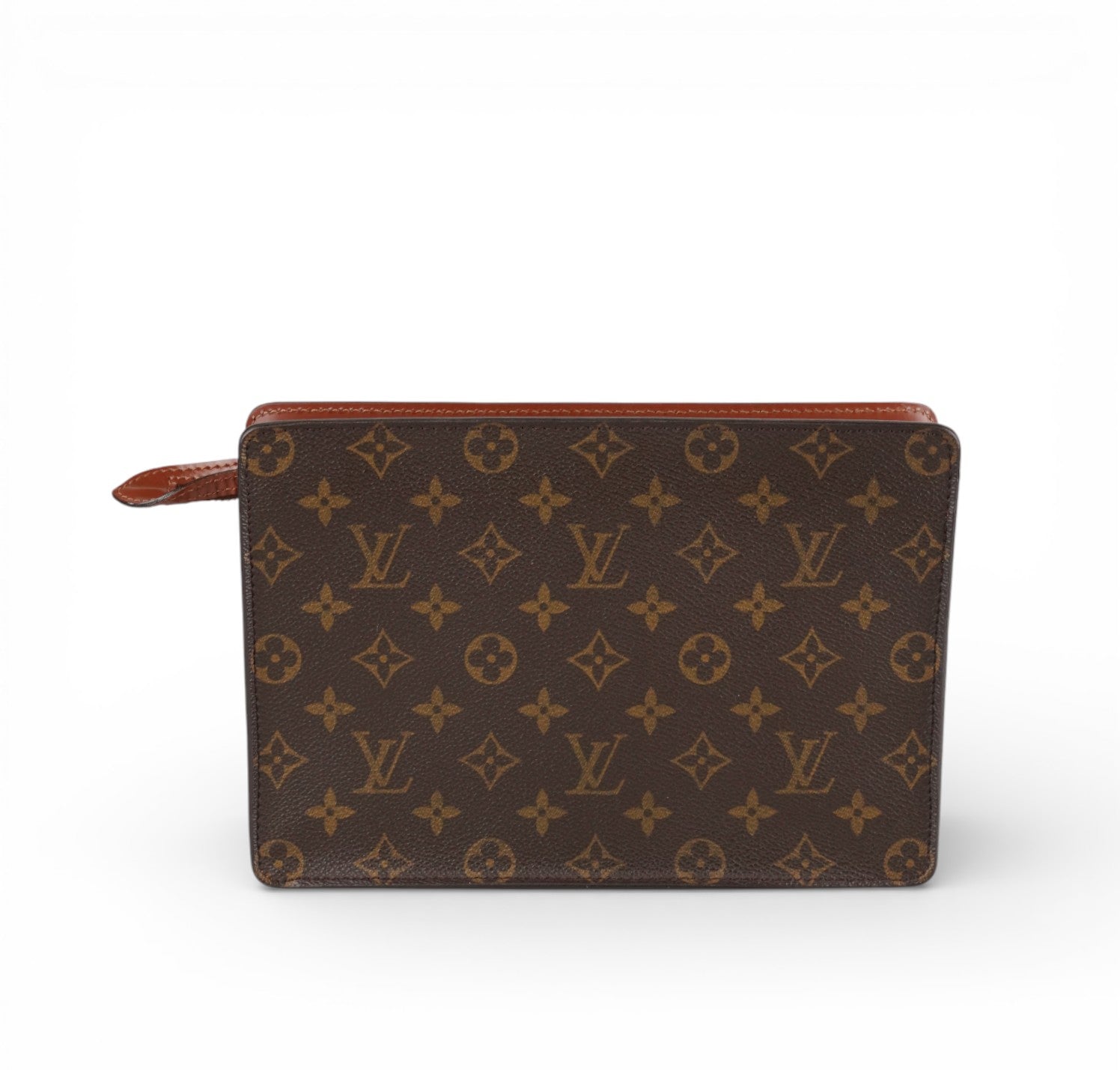 Louis Vuitton, Homme, clutch bag in Monogram canvas. Brown leather trim. Gold-tone brass hardware. Fully lined interior in hammered leather. Features a convenient flat pocket without closure on the front. Thanks to its practical and compact shape, it adds style to any outfit without sacrificing comfort. Features slight general signs of use, micro scratches on leather, hardware.