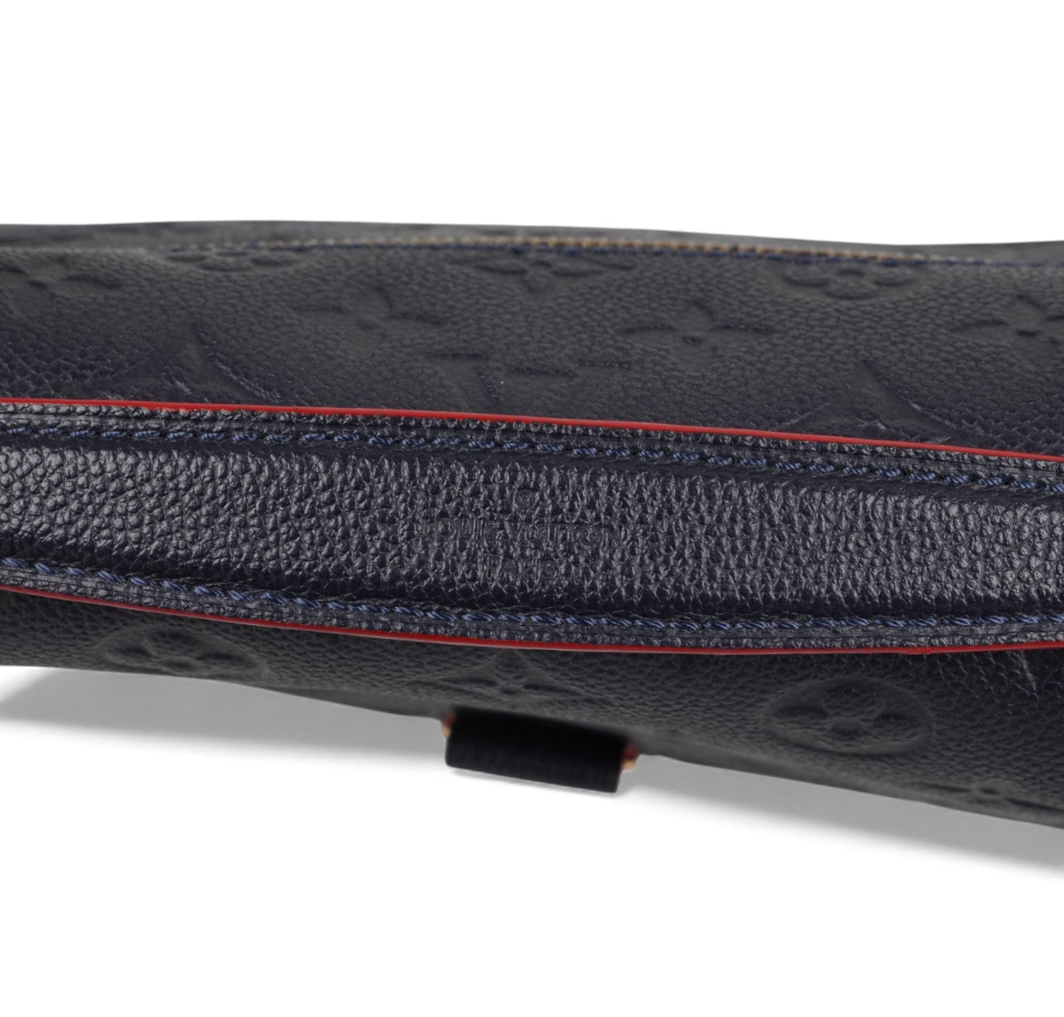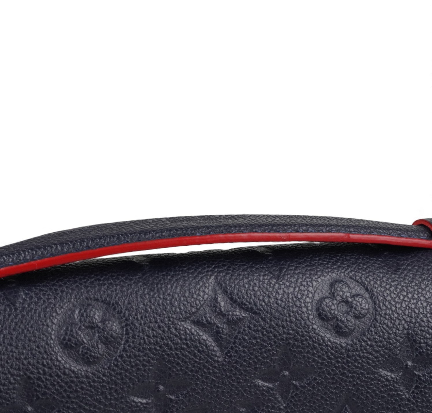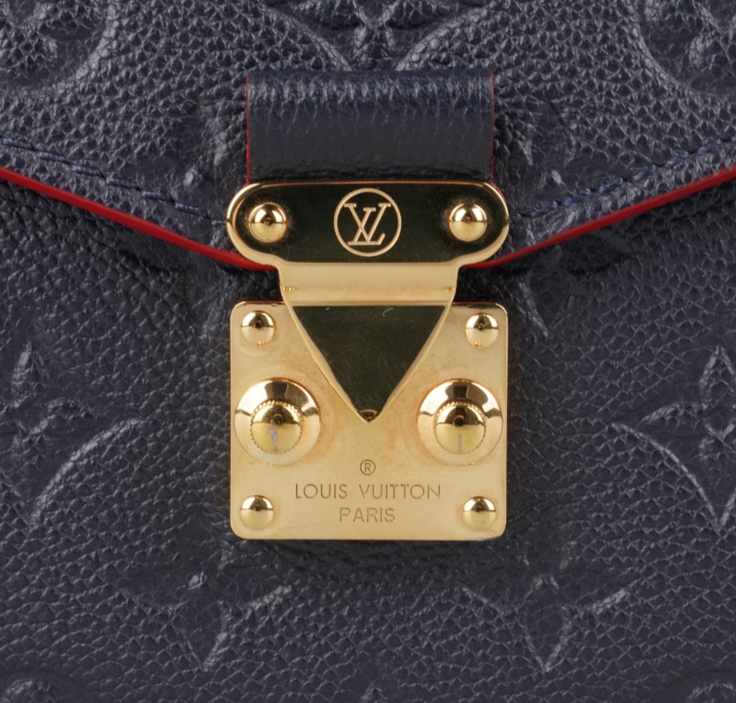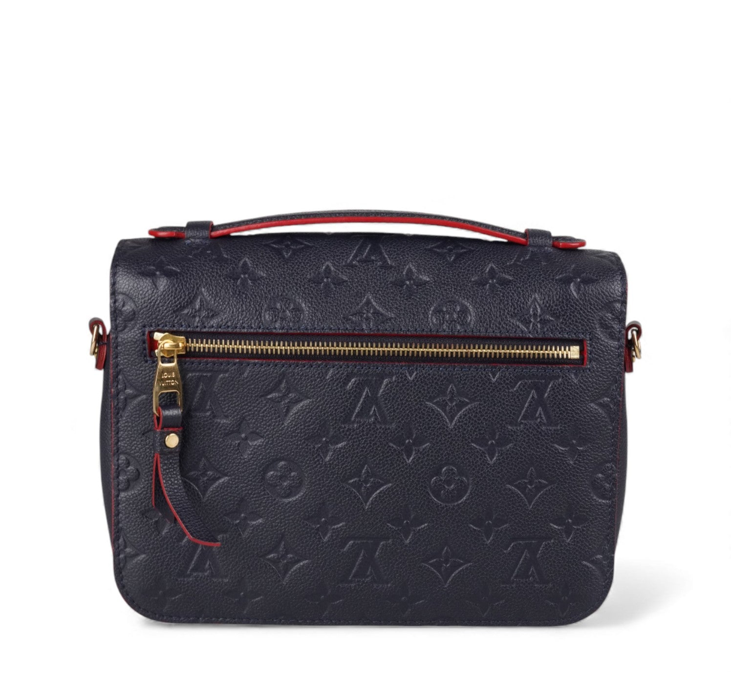 Louis Vuitton handbag, Pochette Métis model, made of Monogram Empreint leather in Navy Blue. Contrasting red finishes. Gold-colored hardware. Interior lined in red microfiber with contrasting stripes, divided into three practical compartments. In-place closure system on front flap. Equipped with adjustable shoulder strap to wear it on the shoulder or crossbody. Convenient zip pocket on the back. Slight signs of use on sealing wax due to use and opening of the bag. Slight micro scratches on hardware. Slight general signs of use.