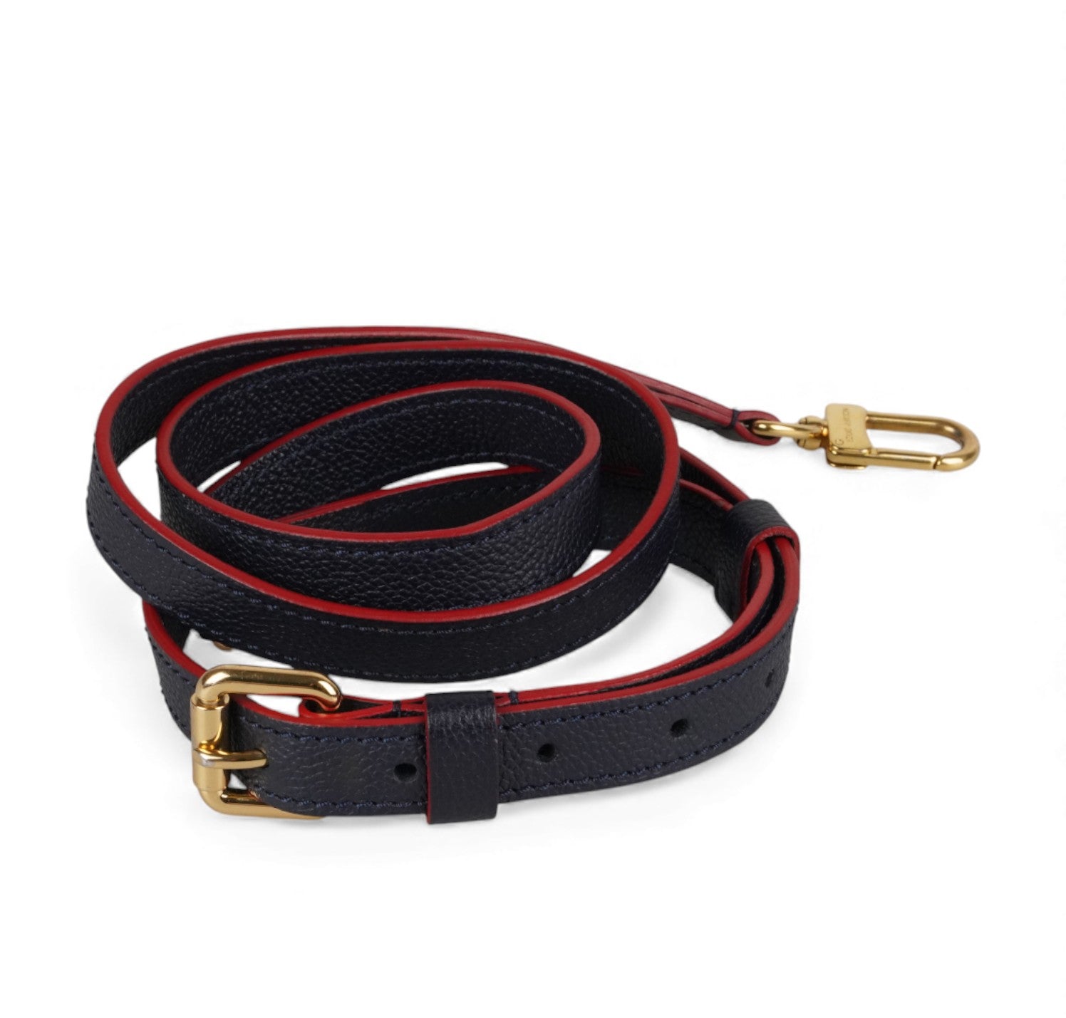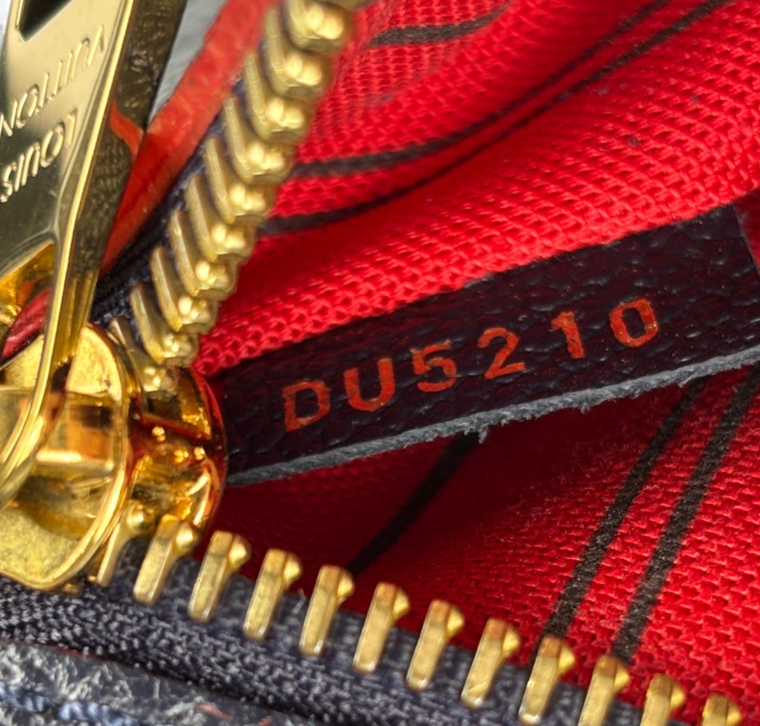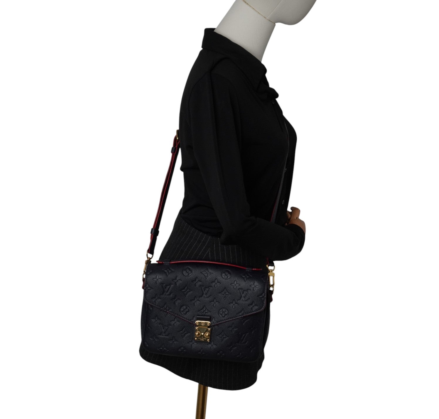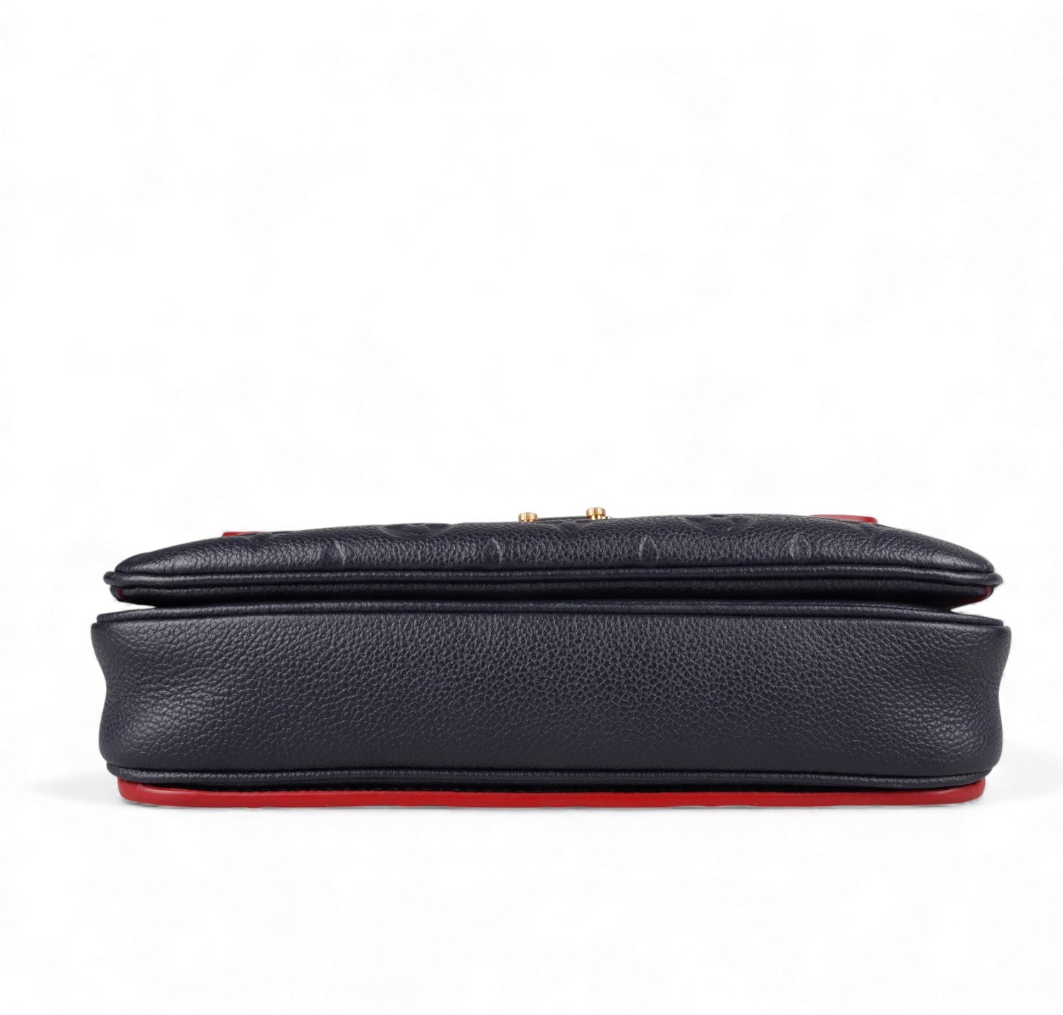 Louis Vuitton handbag, Pochette Métis model, made of Monogram Empreint leather in Navy Blue. Contrasting red finishes. Gold-colored hardware. Interior lined in red microfiber with contrasting stripes, divided into three practical compartments. In-place closure system on front flap. Equipped with adjustable shoulder strap to wear it on the shoulder or crossbody. Convenient zip pocket on the back. Slight signs of use on sealing wax due to use and opening of the bag. Slight micro scratches on hardware. Slight general signs of use.