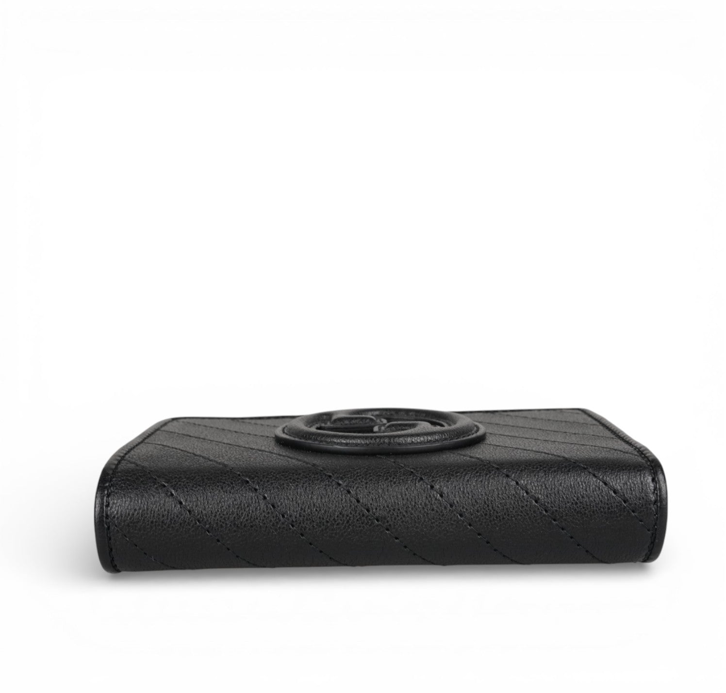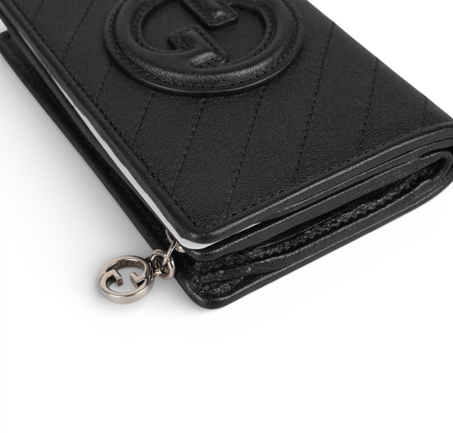 Portafoglio Gucci, modello Blondie, realizzato in Pelle Nera impreziosita da impunture diagonali e logo GG in rilievo. Parti metalliche color Argento. Chiusura esterna con cerniera. Si apre su un interno ben organizzato con slot portacarte, tasca banconote e taschini laterali. Pari al nuovo. Potrebbe presentare micro segni di stoccaggio.