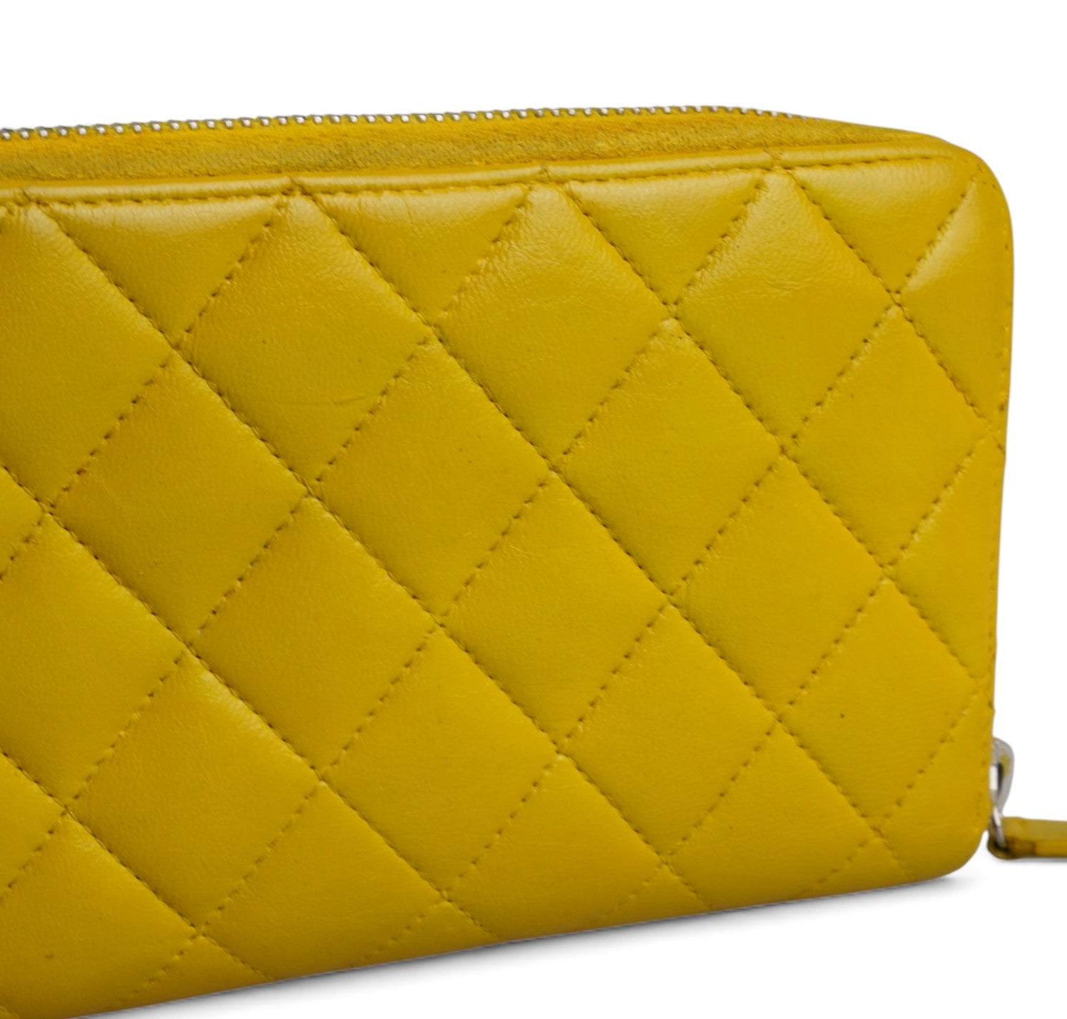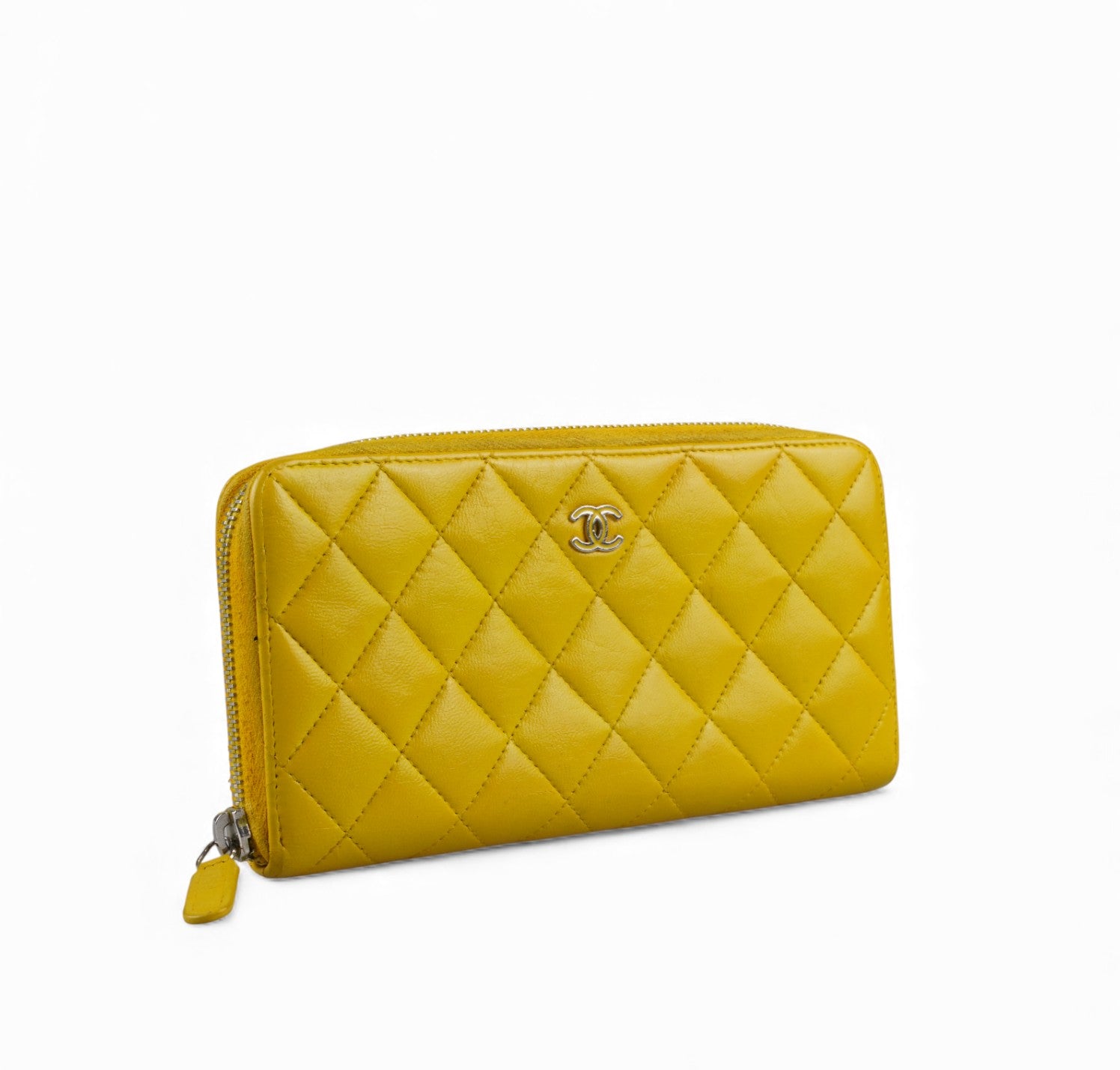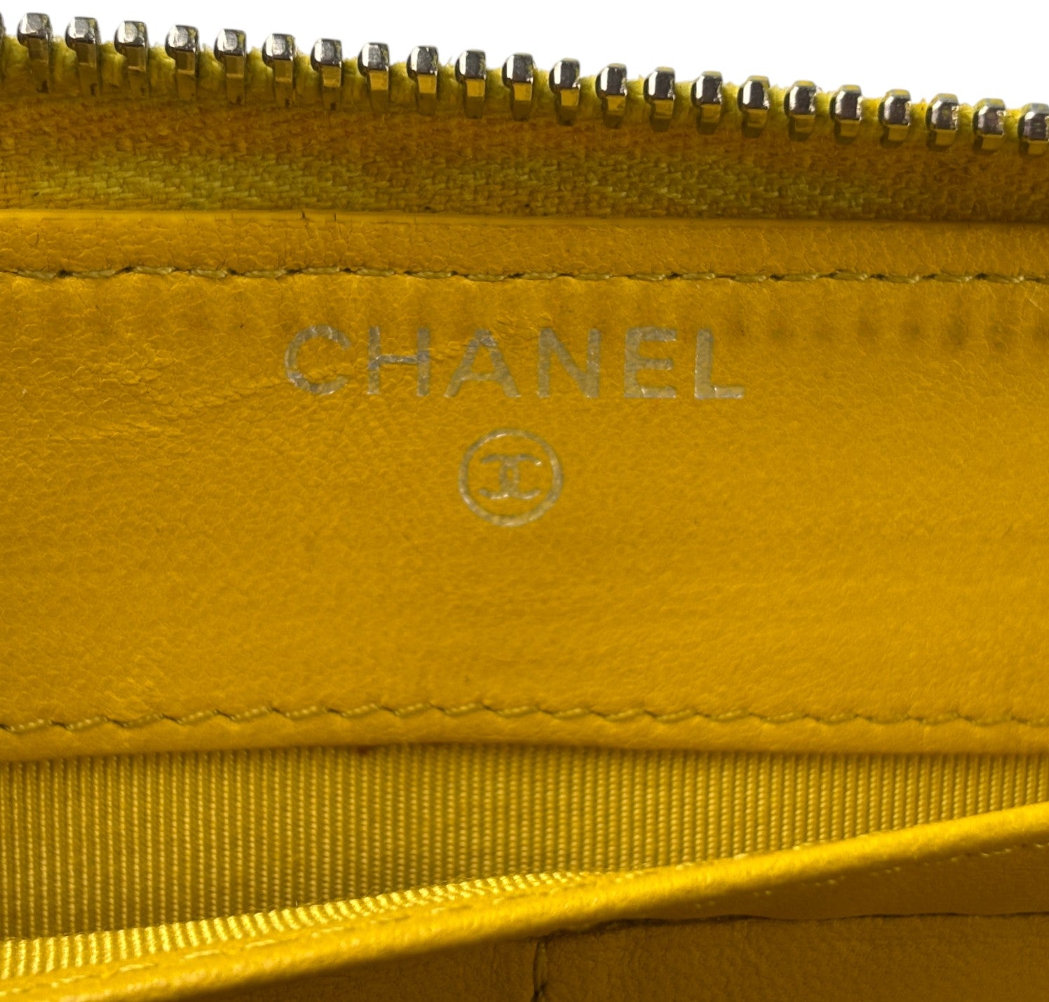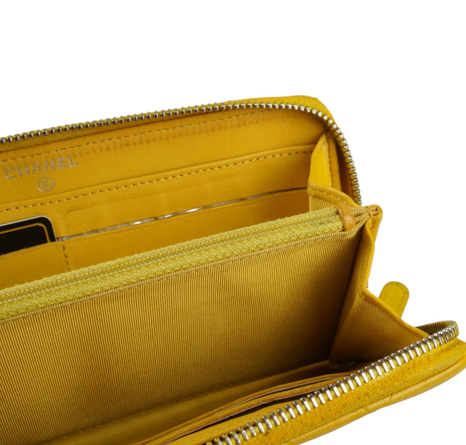 Portafoglio CHANEL, modello Classico Zip-Around, realizzato in Pelle colore Giallo Senape impreziosito da logo CC. Metalleria argentata. Chiusura con zip con tiralampo in pelle. Interno in pelle e tessuto tono su tono con slot portacarte, scomparti per banconote e portamonete con zip. Presenta lievi aloni nelle tasche interne dovuti al normale utilizzo con monete (già pulito e igienizzato). Riprese di colore in alcuni punti esterni. Segni del tempo generali ma buono stato complessivo.