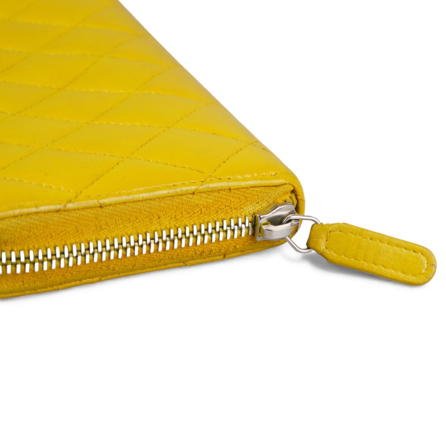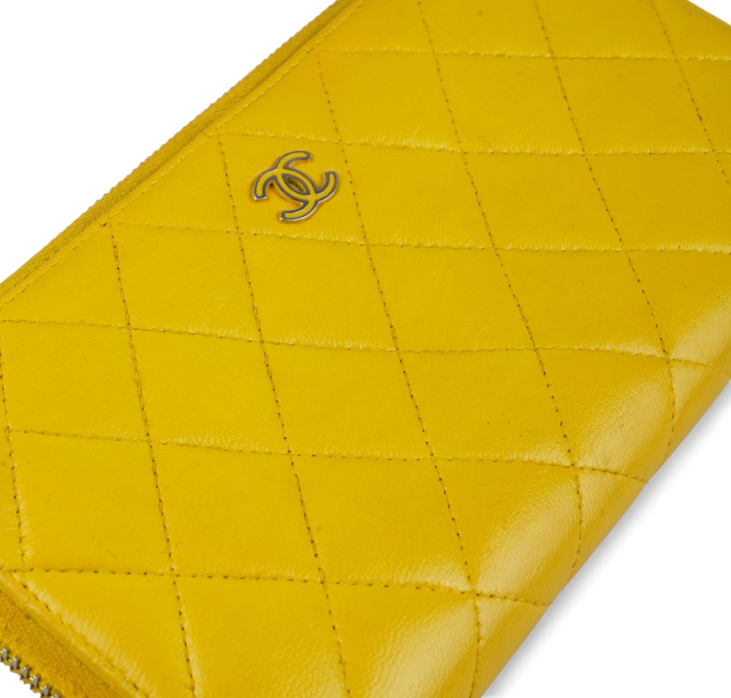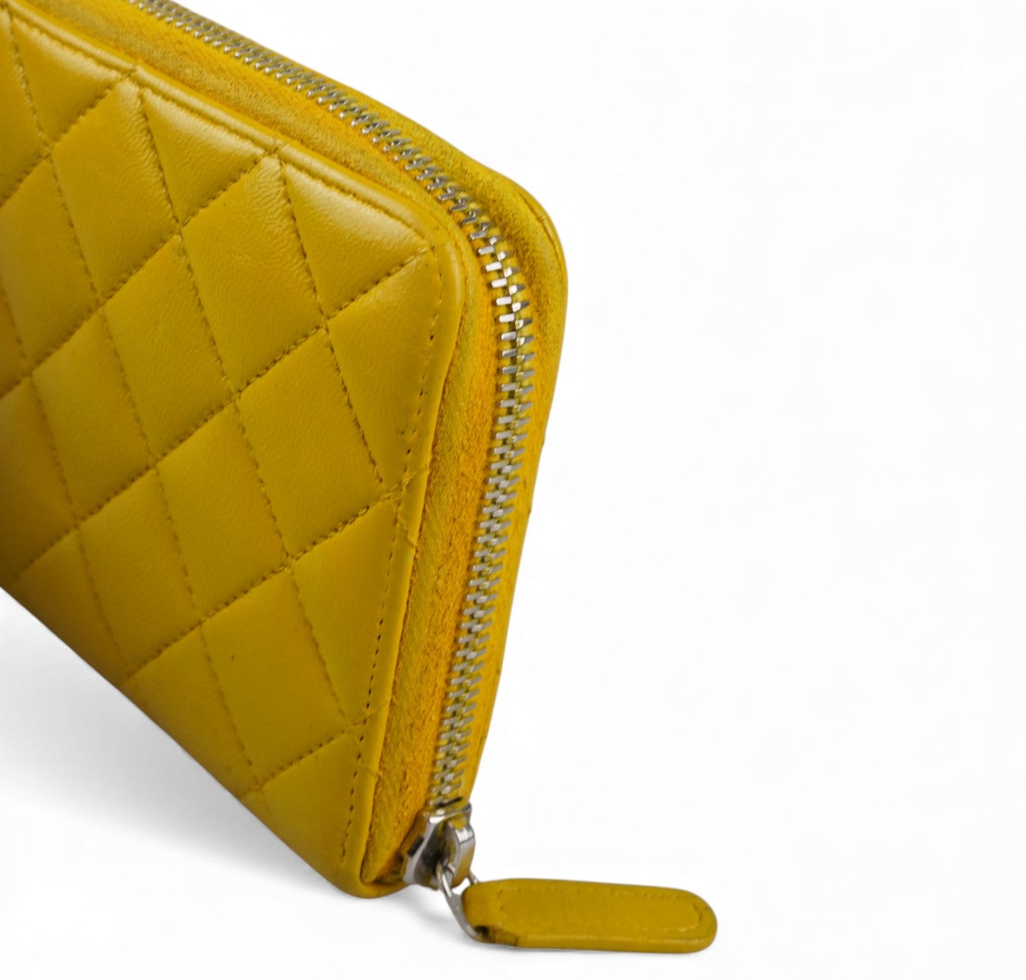 Portafoglio CHANEL, modello Classico Zip-Around, realizzato in Pelle colore Giallo Senape impreziosito da logo CC. Metalleria argentata. Chiusura con zip con tiralampo in pelle. Interno in pelle e tessuto tono su tono con slot portacarte, scomparti per banconote e portamonete con zip. Presenta lievi aloni nelle tasche interne dovuti al normale utilizzo con monete (già pulito e igienizzato). Riprese di colore in alcuni punti esterni. Segni del tempo generali ma buono stato complessivo.
