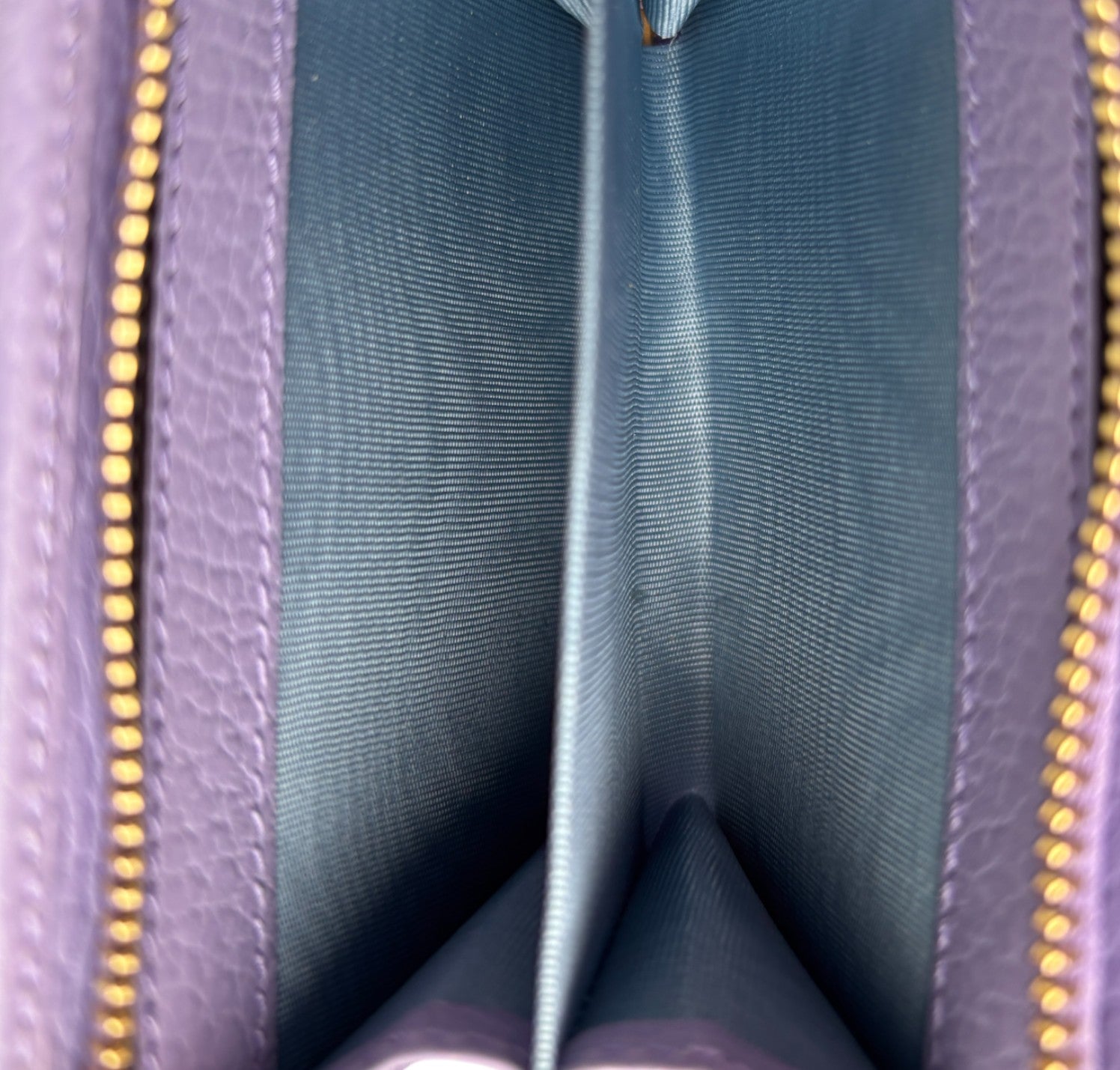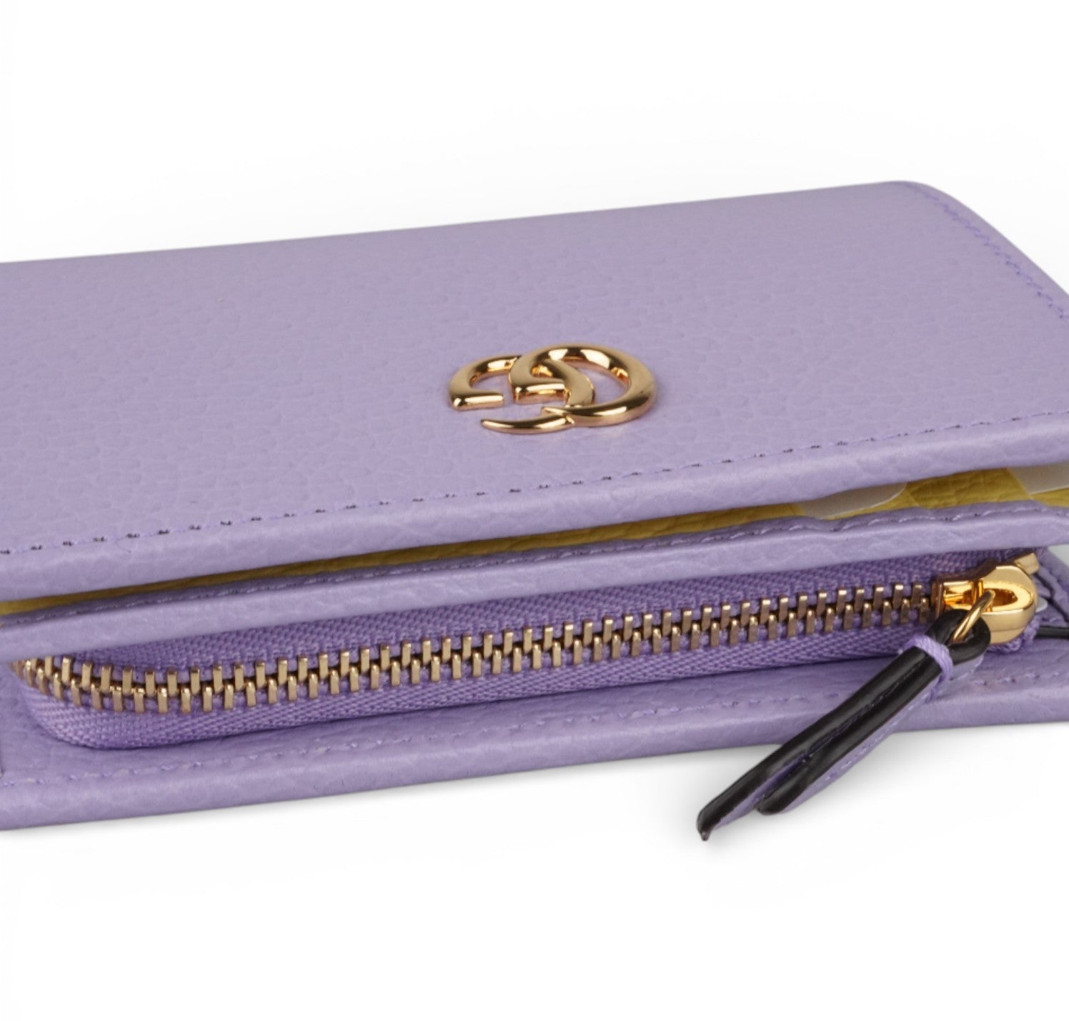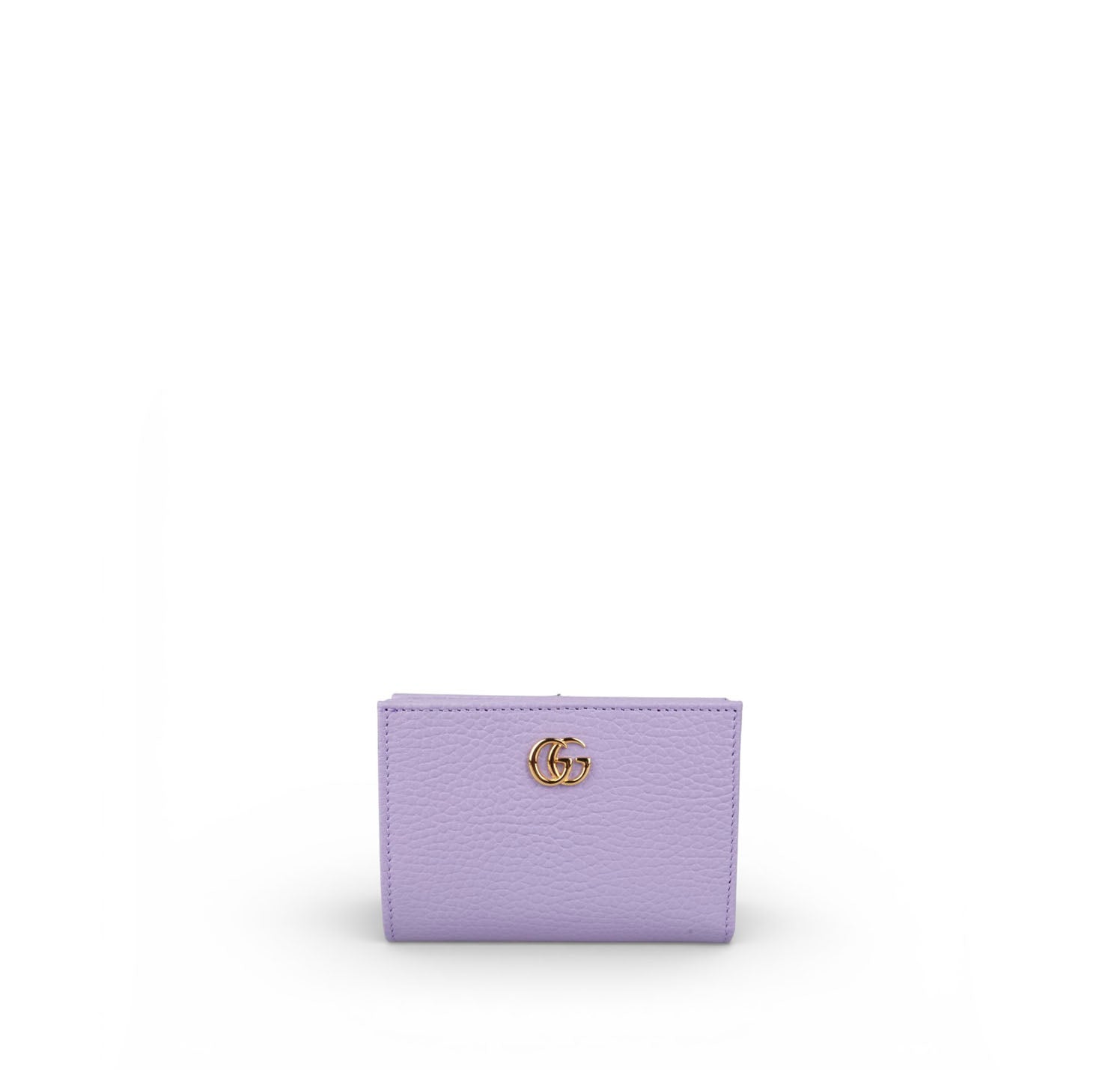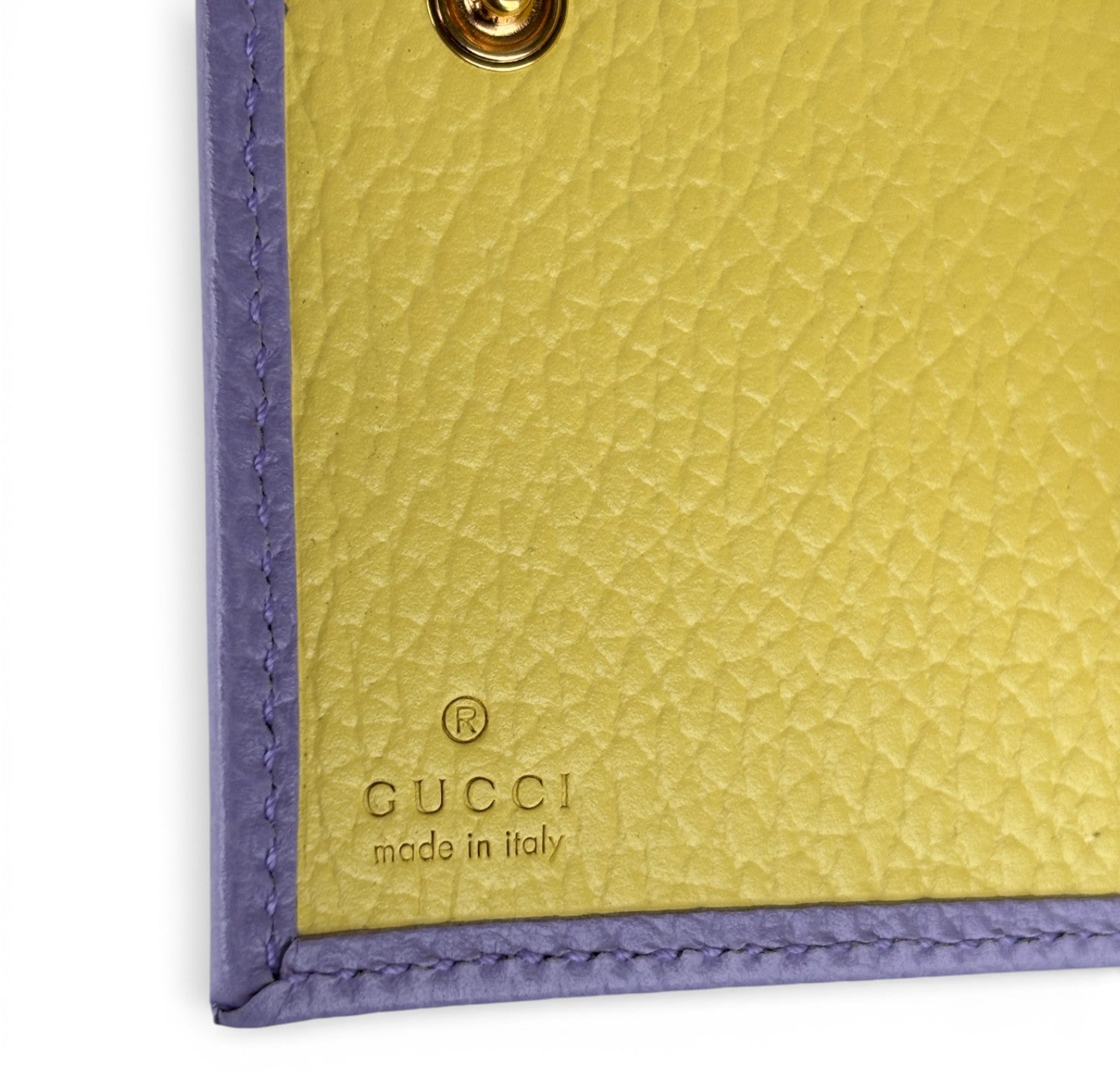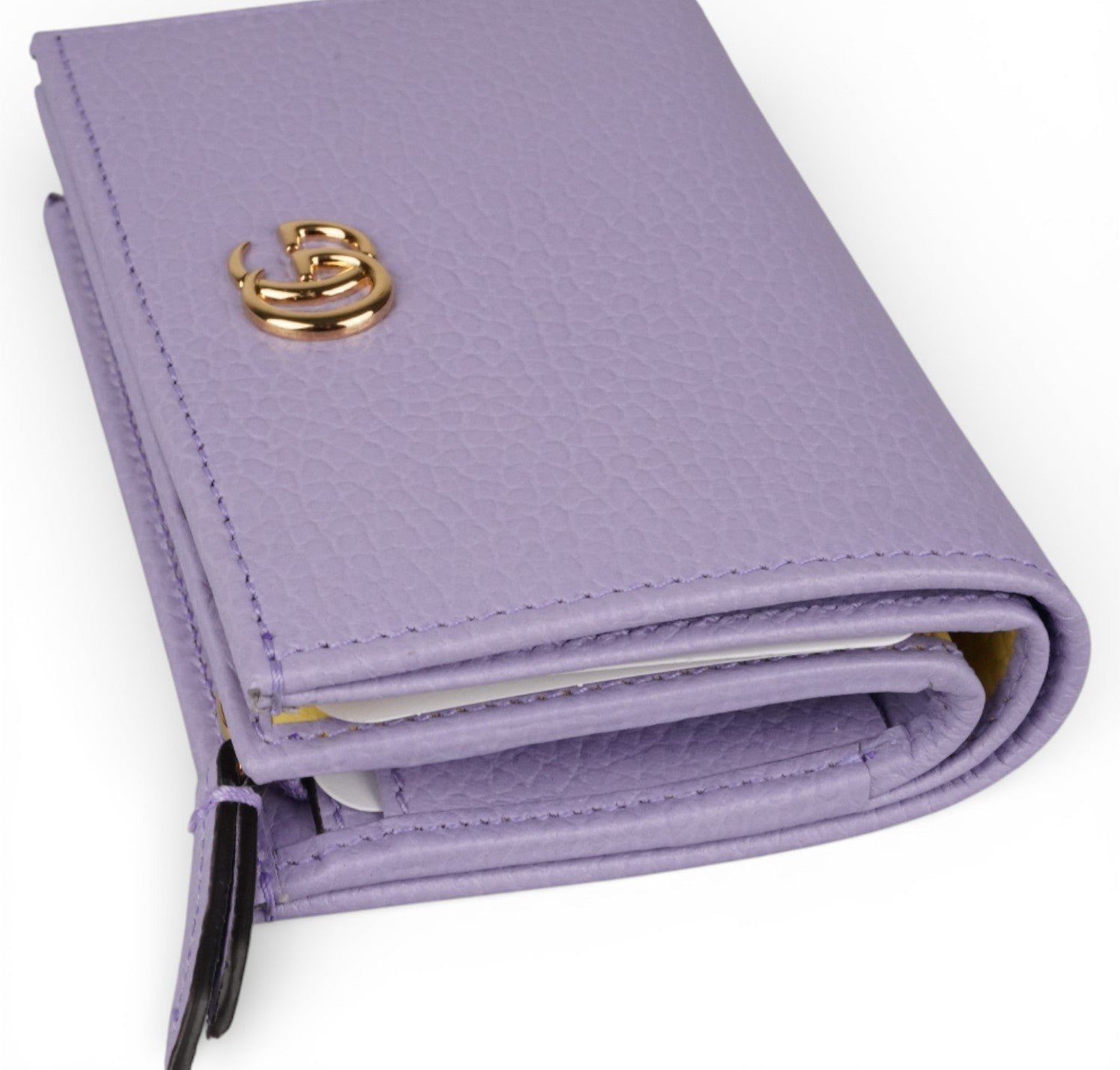 Portafoglio Gucci GG Marmont, realizzato in Pelle martellata color Lilla con interno a contrasto Giallo Pastello. Design compatto e raffinato, impreziosito da logo Double G in metallo color Oro sulla parte frontale. Chiusura con bottone a pressione, interno ben organizzato con scomparti per carte, banconote e tasca portamonete con zip. Come nuovo, in condizioni eccellenti.