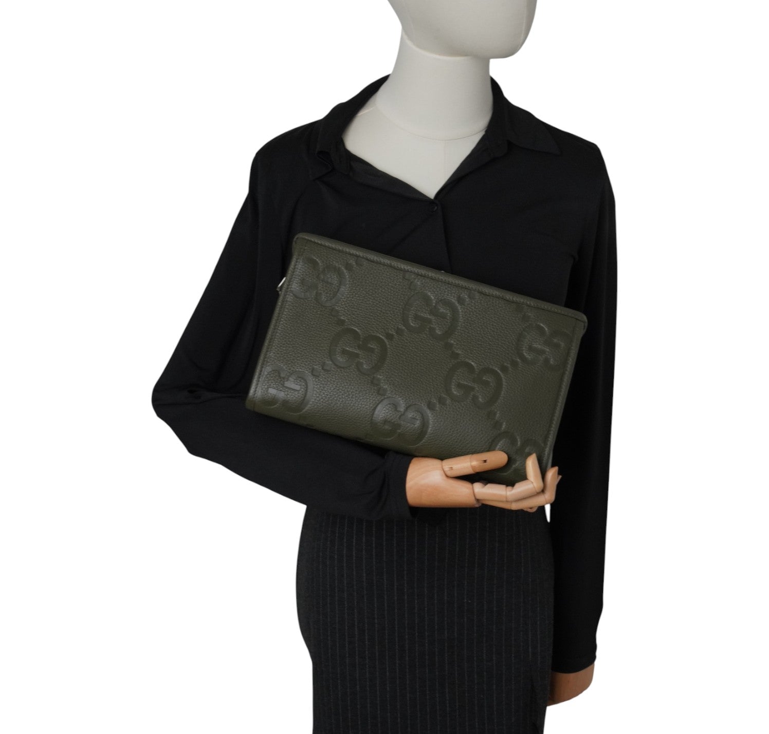 Pouch Gucci, modello Jumbo GG, realizzata in Pelle Verde Oliva. Caratterizzata dall’iconico motivo e da un profilo leggermente strutturato. Hardware color argento. Apertura superiore con zip e interno foderato in tessuto chiaro con tasca con zip. Ideale come clutch o come organizer da inserire in borsa. Condizioni eccellenti, come se non fosse mai stata indossata. Potrebbero essere presenti micro segni di stoccaggio.
