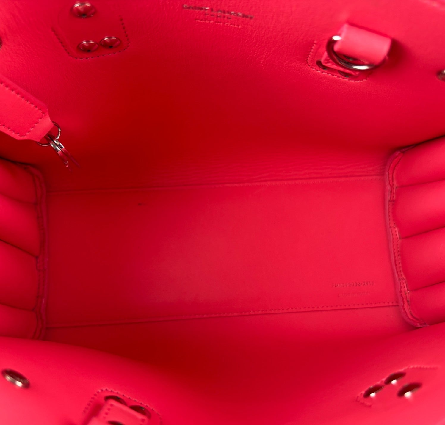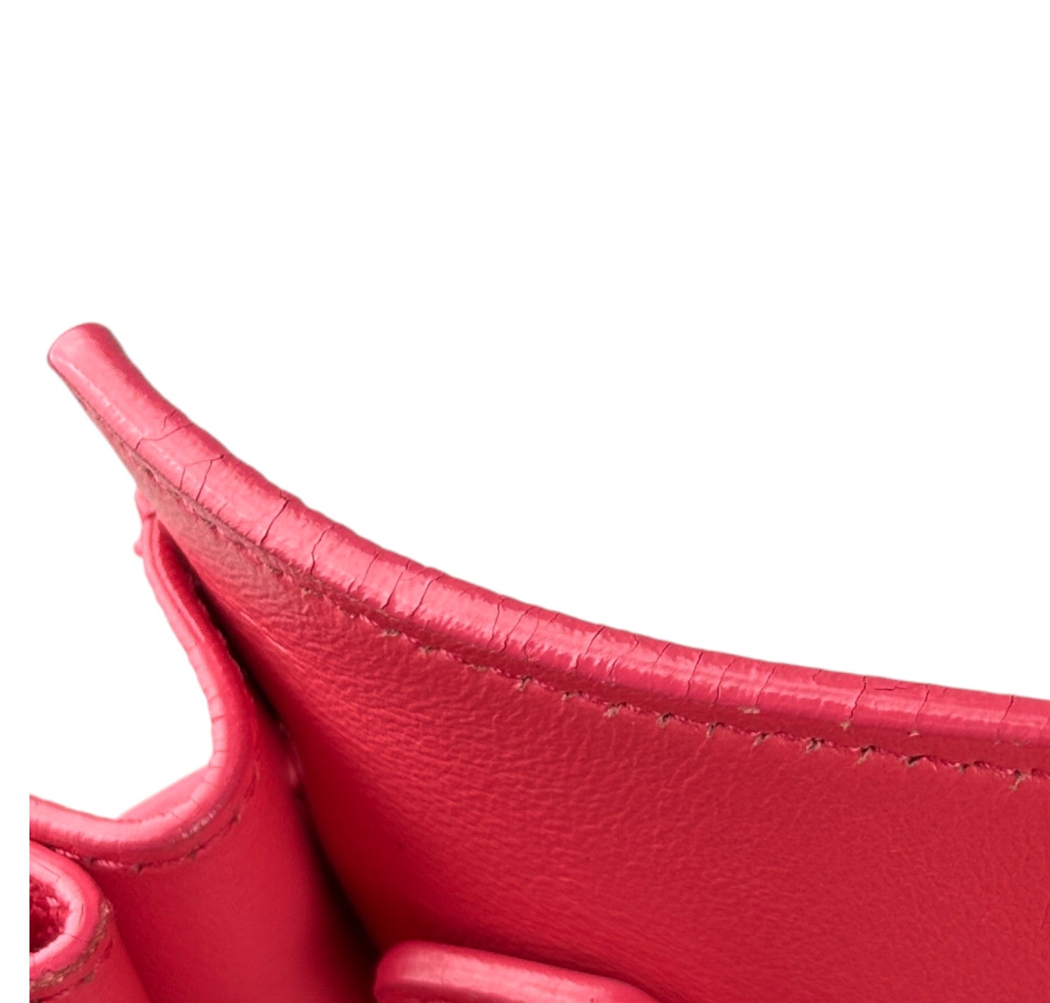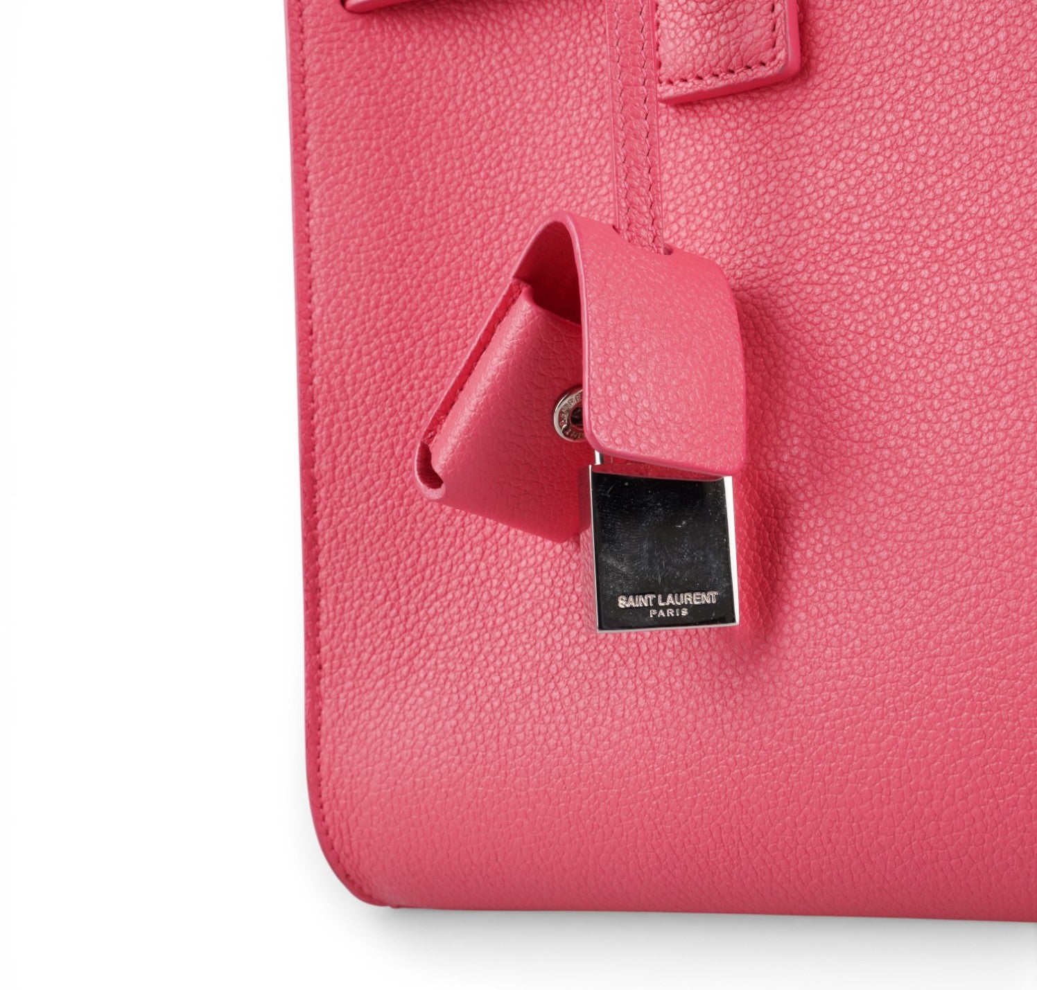 Borsa Saint Laurent, modello Sac de Jour, misura Baby in pelle tonalità Rose Lipstick. Caratterizzata da linee strutturate e forma rigida. Parti metalliche argento. Doppi manici superiori e tracolla rimovibile e regolabile per l'indosso a spalla o crossbody. Interno spazioso con scomparti e zip centrale. Priva di chiusura superiore. Presenta qualche micro graffio generale dovuto al normale utilizzo ma si trova in ottimo stato complessivo. Un modello intramontabile, attualmente ancora presente nelle collezioni Saint Laurent, perfetto per completare look eleganti o daily chic.