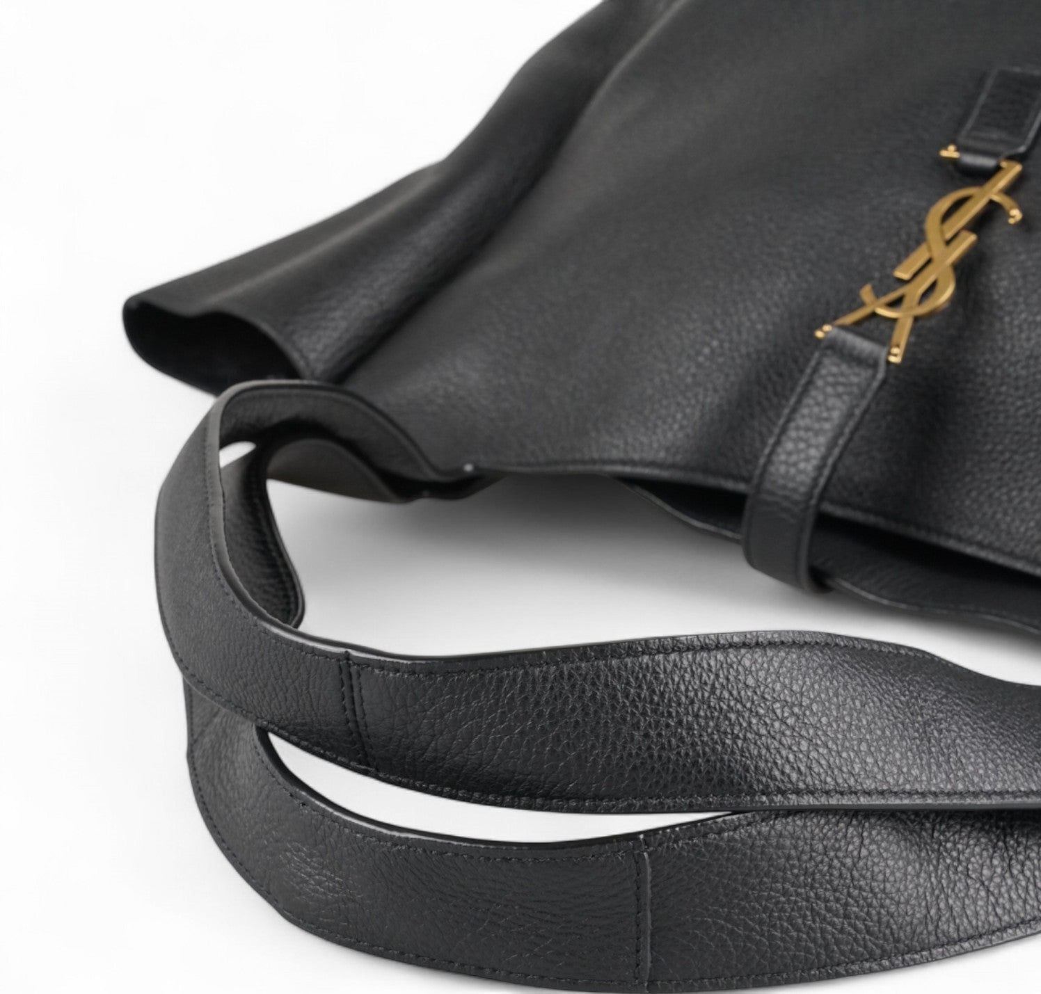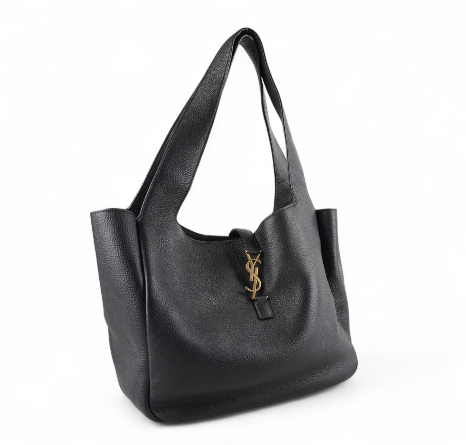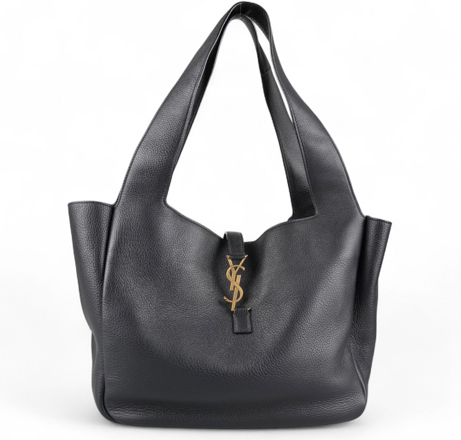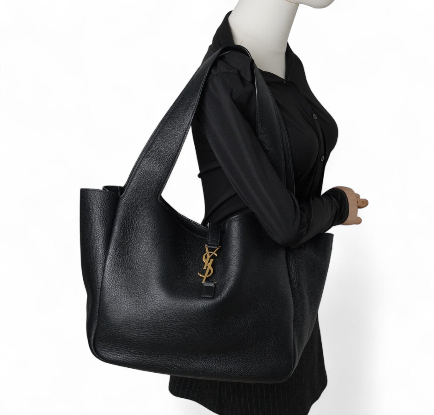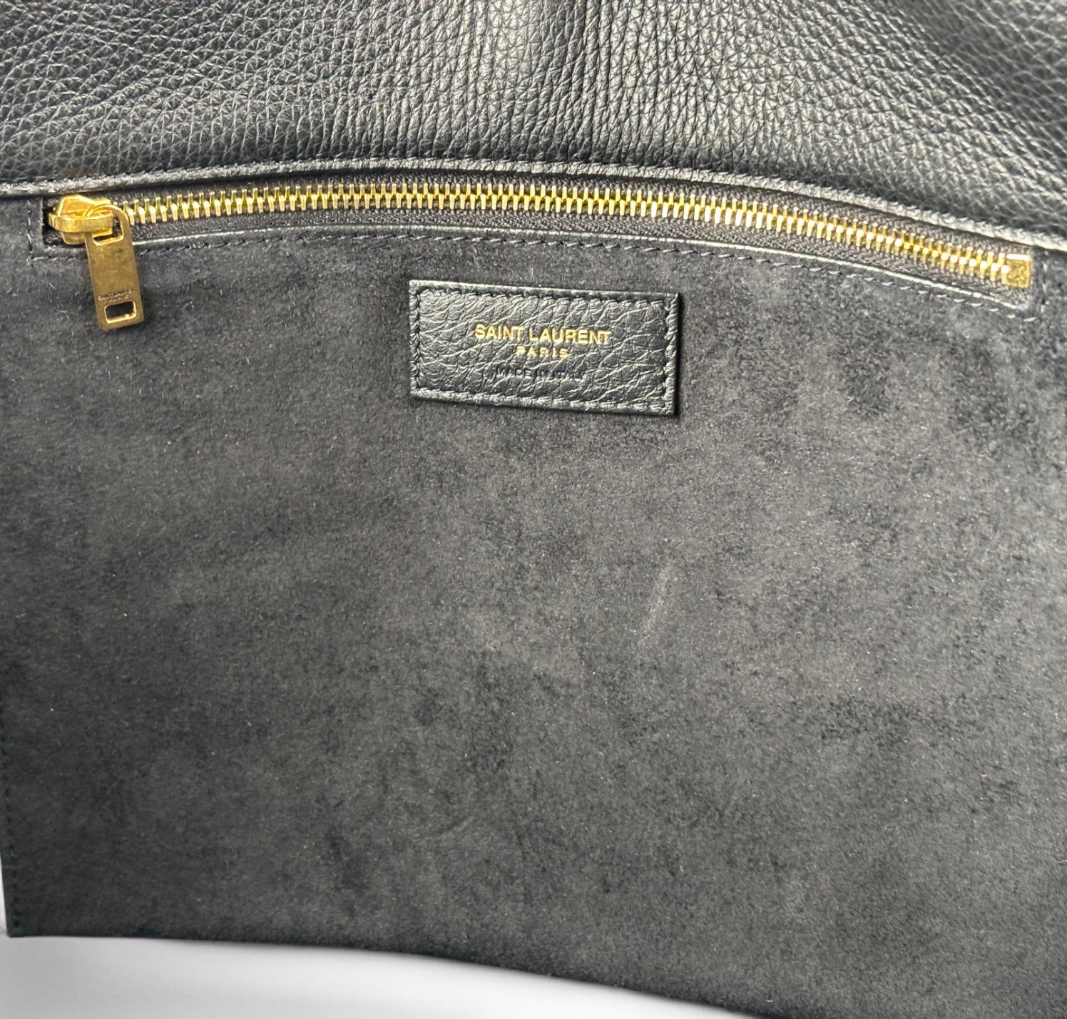 Maxi Borsa Saint Laurent, modello Le 5 à 7 Bea, realizzata in pelle martellata Nera, con iconica chiusura YSL dorata sul davanti. Silhouette morbida e capiente perfetta per l’uso quotidiano. Doppio manico ampio che consente di portarla comodamente a spalla. Interno in suede tono su tono, ben rifinito e con una tasca con zip. Mai indossata, ma potrebbe presentare micro segni di stoccaggio.