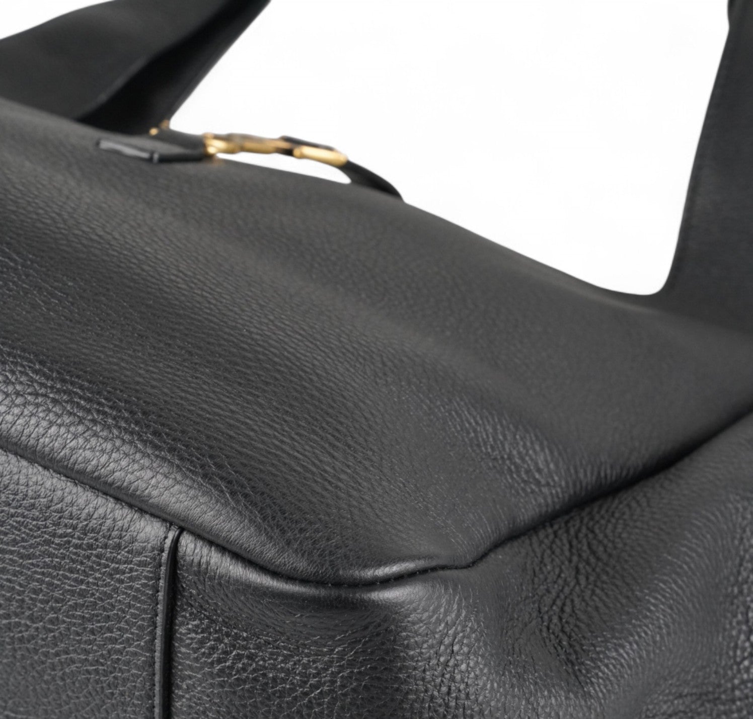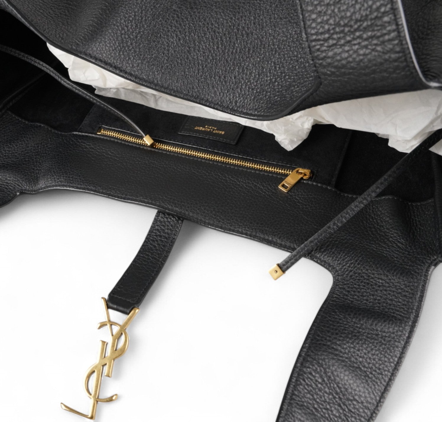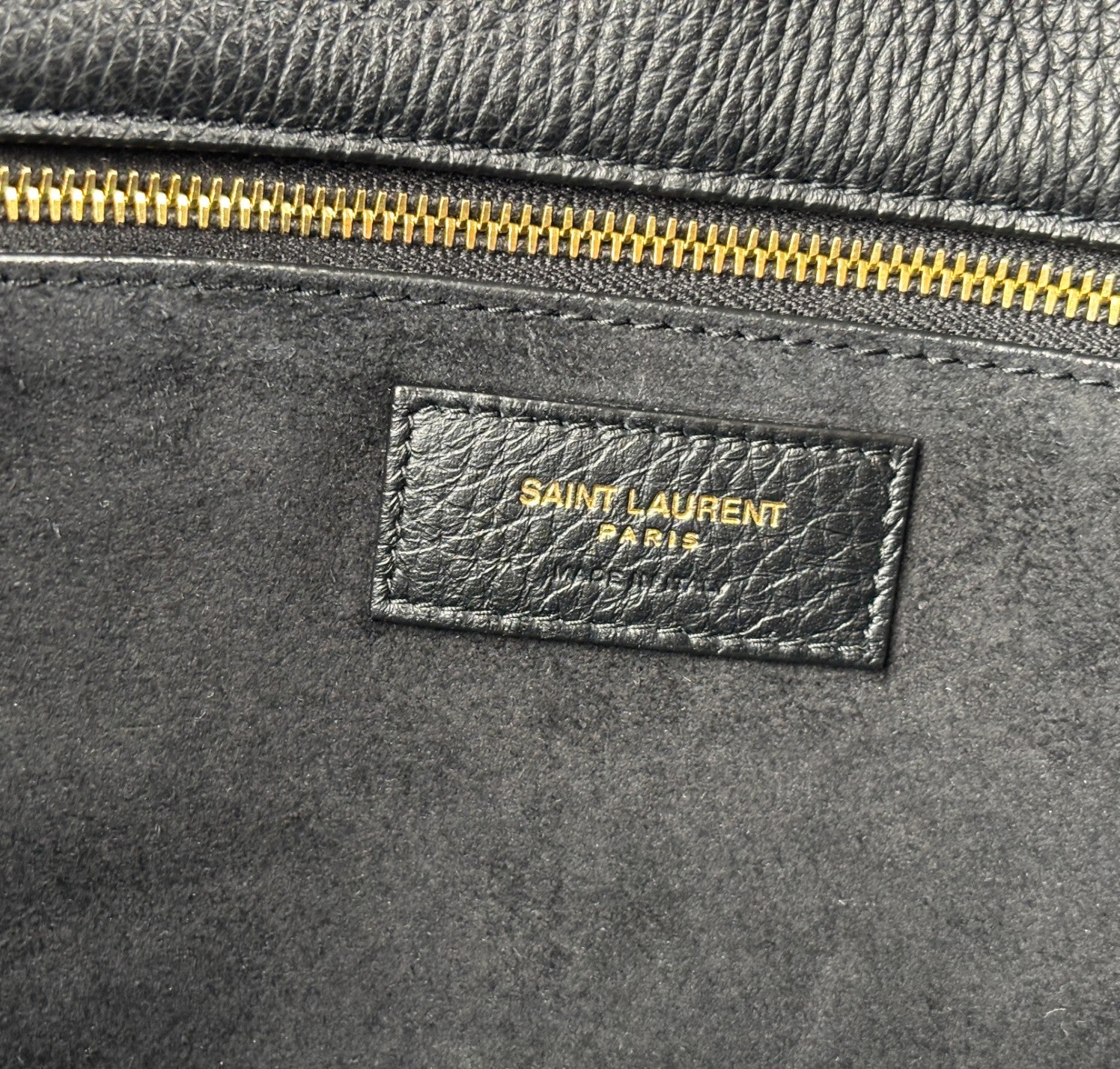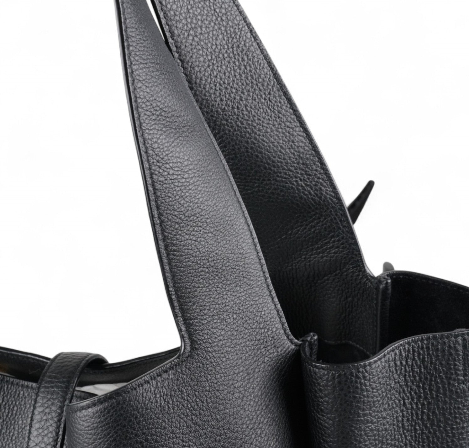 Maxi Borsa Saint Laurent, modello Le 5 à 7 Bea, realizzata in pelle martellata Nera, con iconica chiusura YSL dorata sul davanti. Silhouette morbida e capiente perfetta per l’uso quotidiano. Doppio manico ampio che consente di portarla comodamente a spalla. Interno in suede tono su tono, ben rifinito e con una tasca con zip. Mai indossata, ma potrebbe presentare micro segni di stoccaggio.