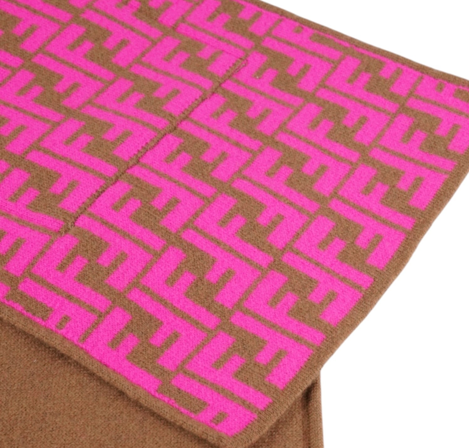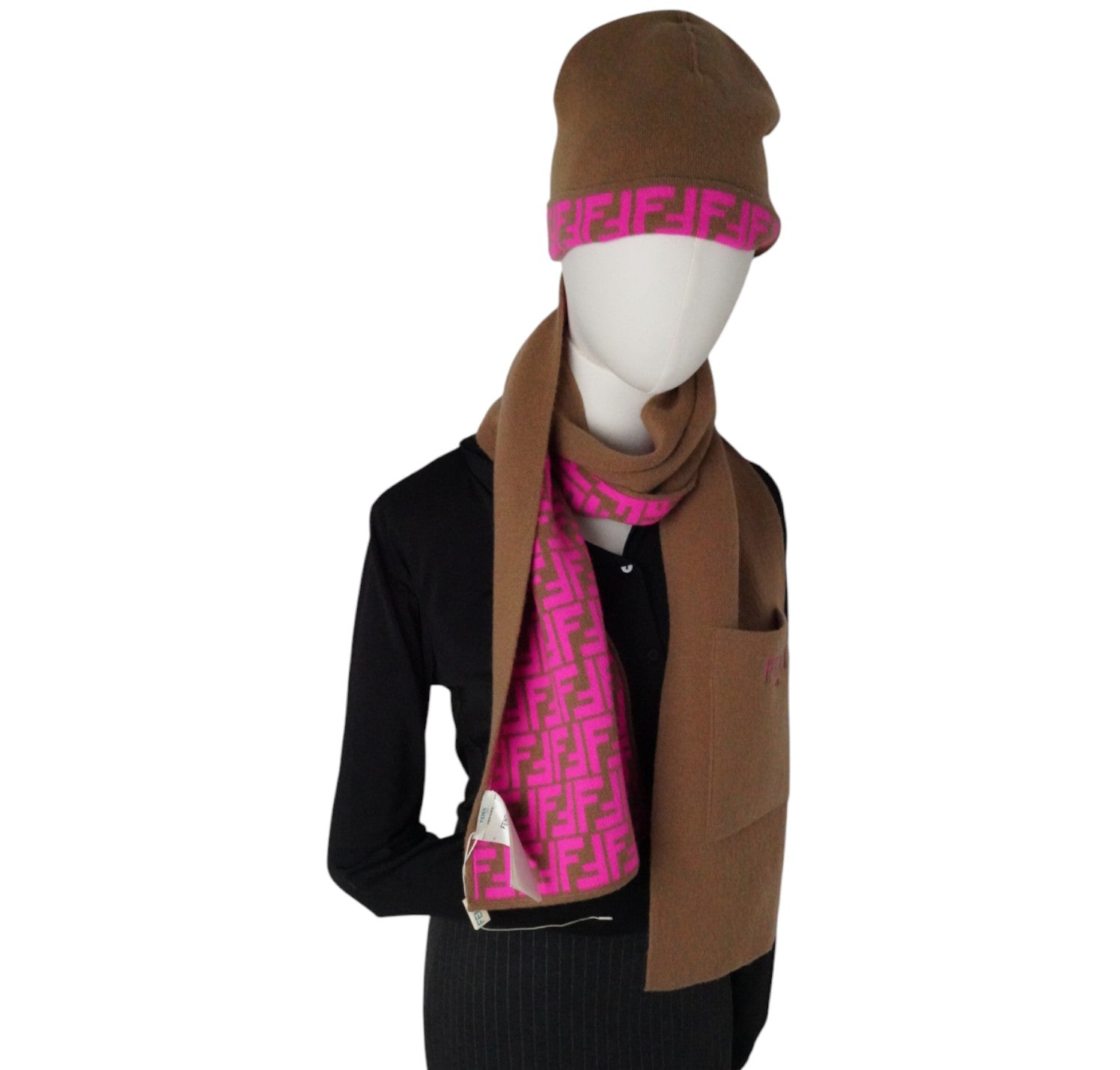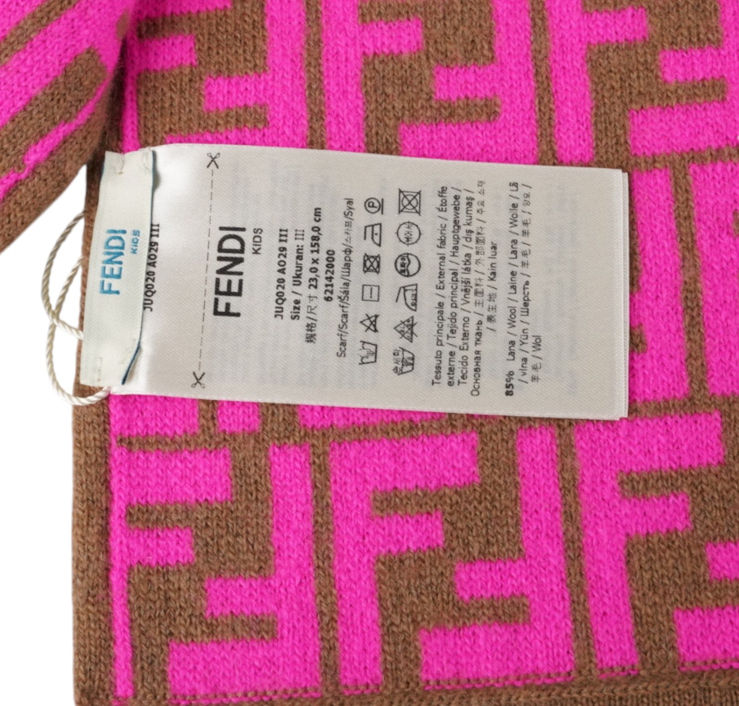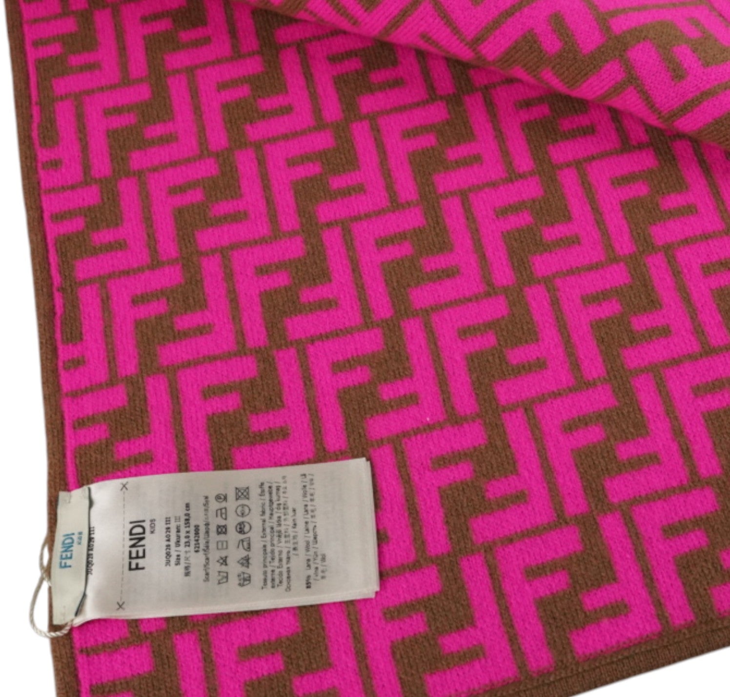 Set Fendi Kids, composto da sciarpa e cappello in morbida lana con aggiunta di cashmere, caldo e confortevole, Presenta da un lato il classico motivo FF in una vivace combinazione di cammello e rosa acceso (Fucsia), dall'altro un tessuto neutro con stampa Fendi Roma a contrasto ricamato su taschino. È l'accessorio perfetto per dare carattere ai look invernali. Presenta qualche segno di stoccaggio su etichetta interna del cappello. Nonostante sia indicato come linea Kids, le proporzioni lo rendono adatto a ogni età. Acquistati separatamente, il cartellino indica solo il prezzo del cappellino.
