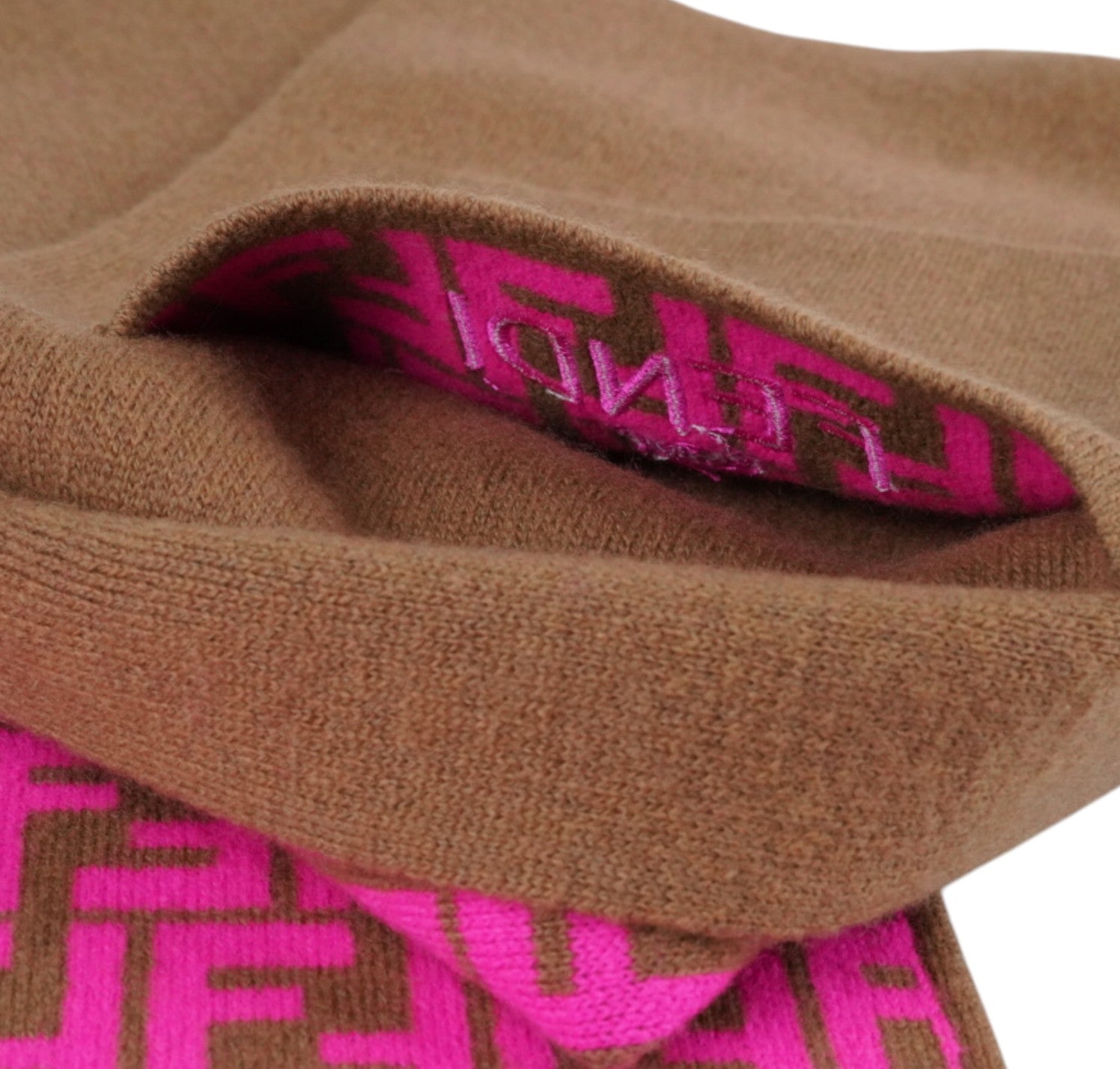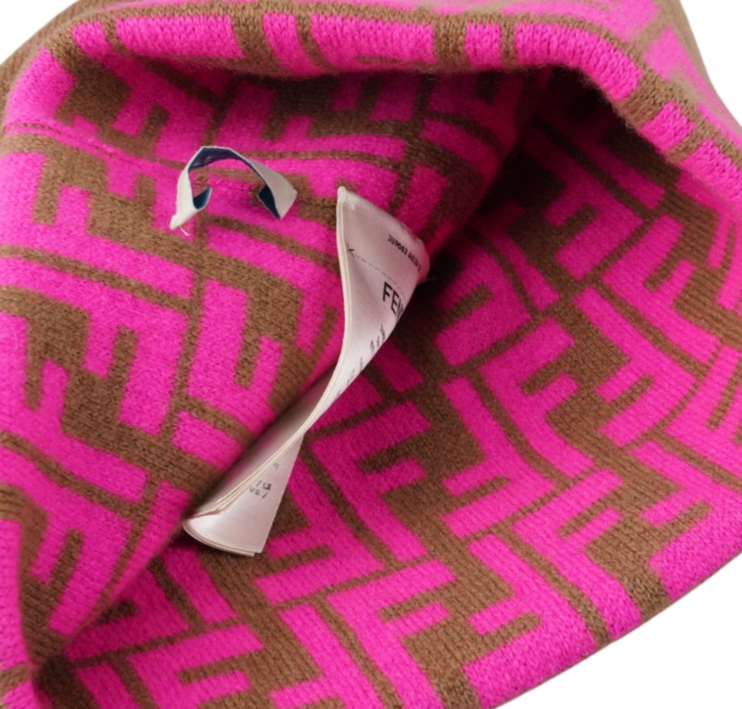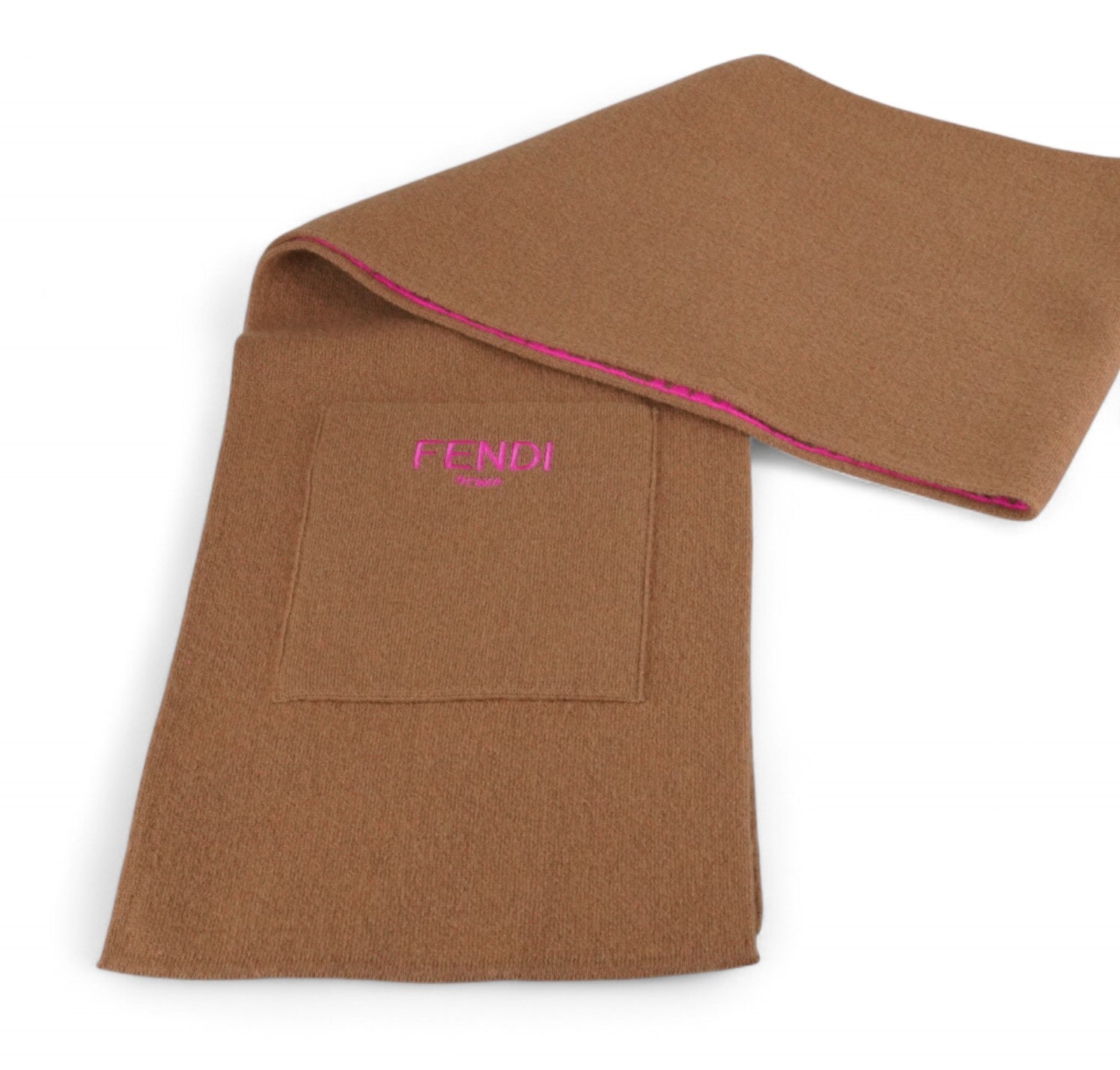 Set Fendi Kids, composto da sciarpa e cappello in morbida lana con aggiunta di cashmere, caldo e confortevole, Presenta da un lato il classico motivo FF in una vivace combinazione di cammello e rosa acceso (Fucsia), dall'altro un tessuto neutro con stampa Fendi Roma a contrasto ricamato su taschino. È l'accessorio perfetto per dare carattere ai look invernali. Presenta qualche segno di stoccaggio su etichetta interna del cappello. Nonostante sia indicato come linea Kids, le proporzioni lo rendono adatto a ogni età. Acquistati separatamente, il cartellino indica solo il prezzo del cappellino.