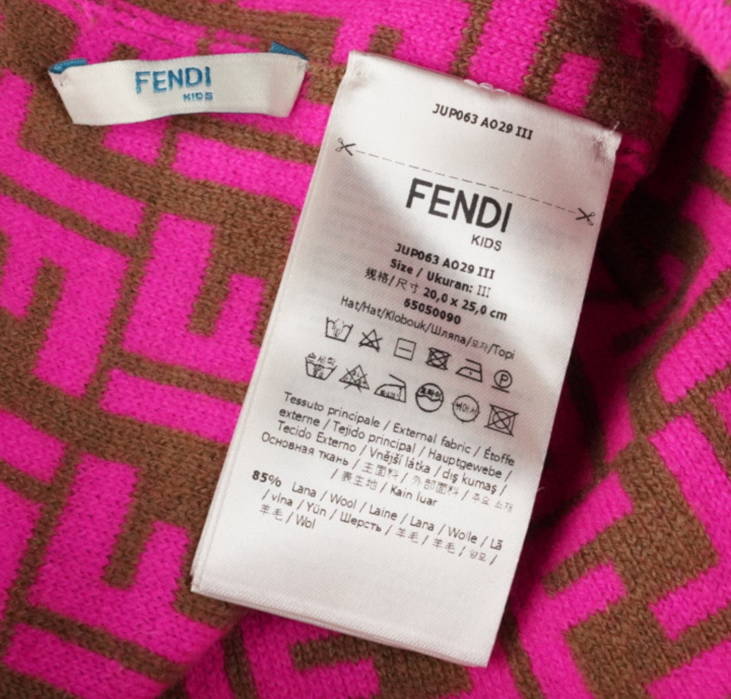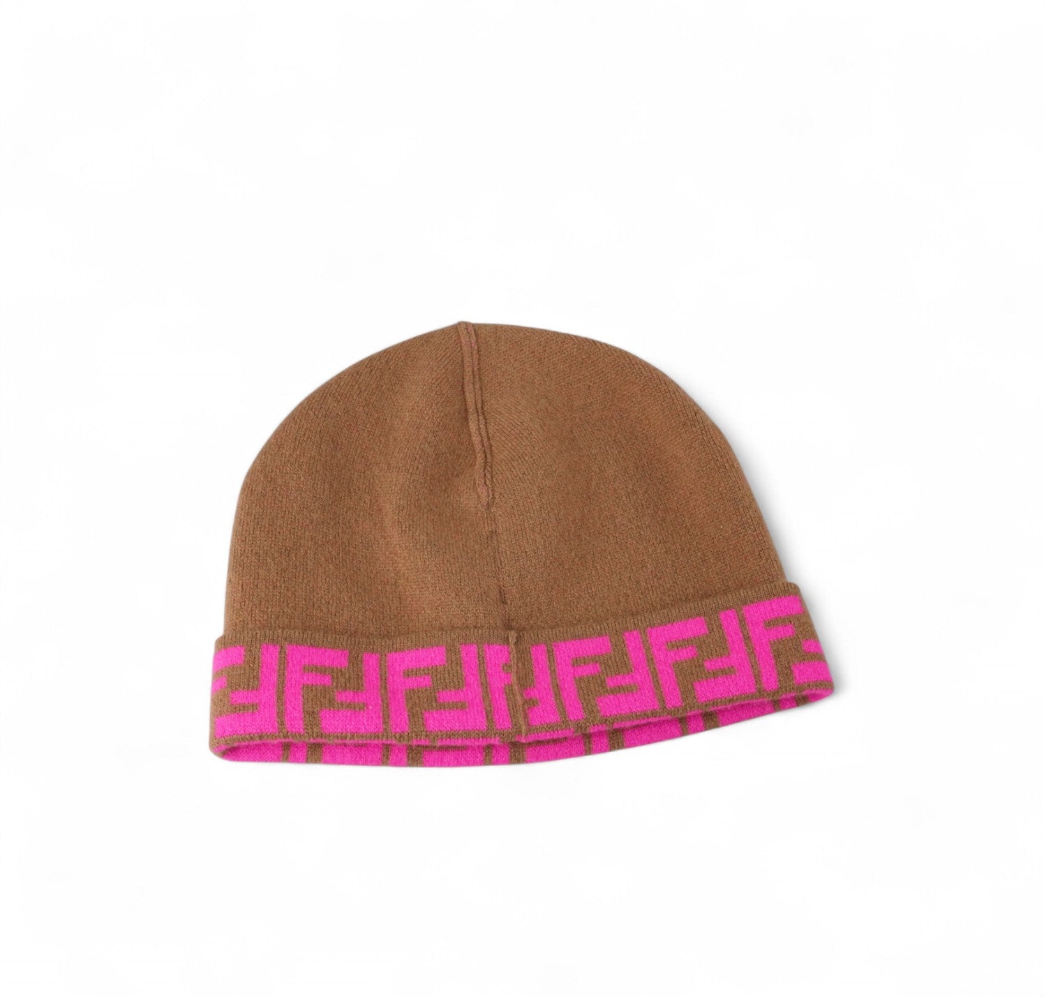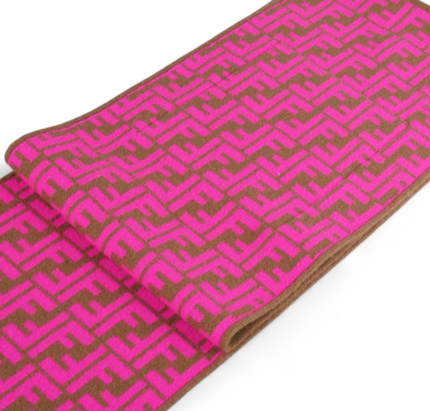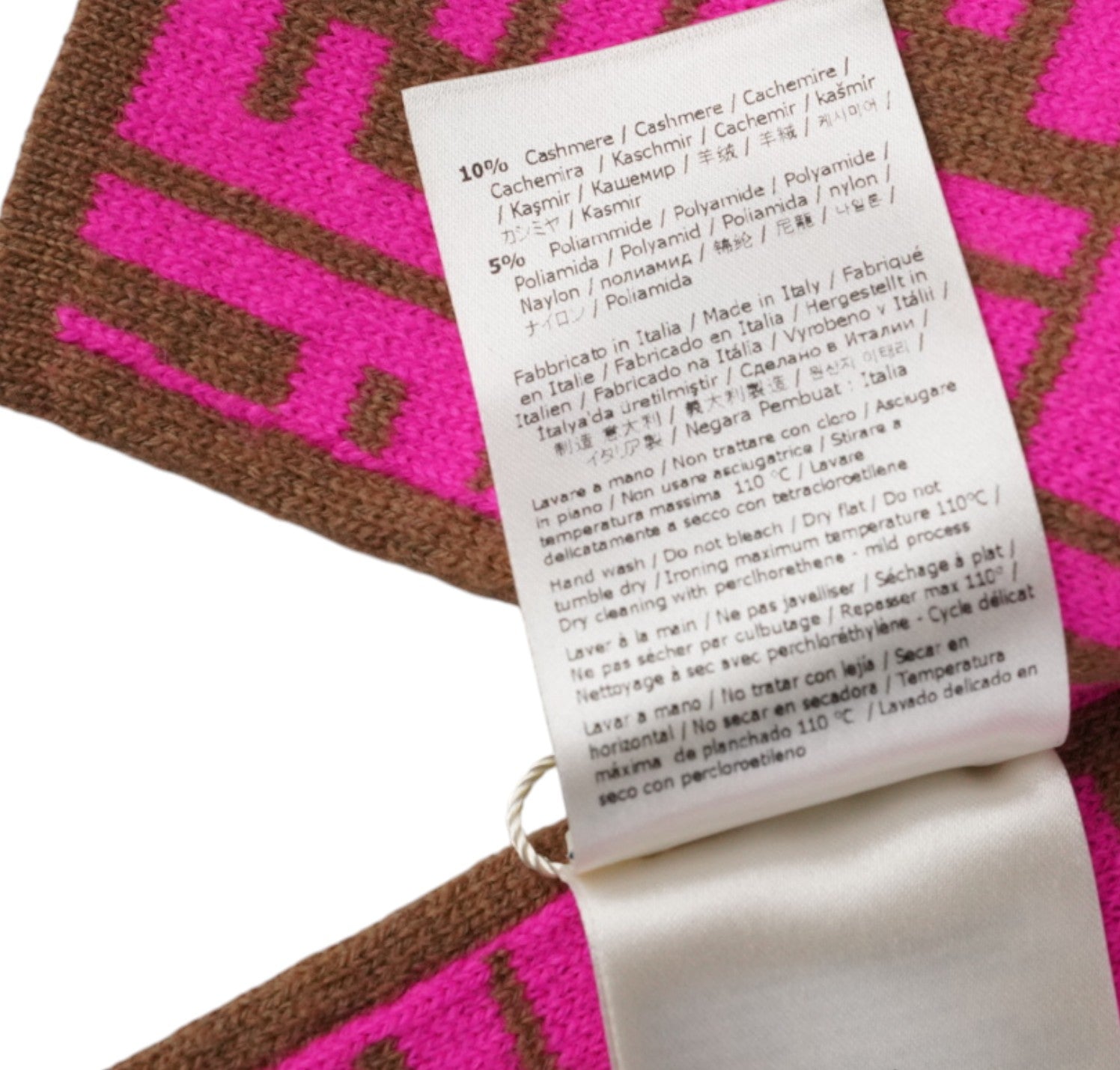 Set Fendi Kids, composto da sciarpa e cappello in morbida lana con aggiunta di cashmere, caldo e confortevole, Presenta da un lato il classico motivo FF in una vivace combinazione di cammello e rosa acceso (Fucsia), dall'altro un tessuto neutro con stampa Fendi Roma a contrasto ricamato su taschino. È l'accessorio perfetto per dare carattere ai look invernali. Presenta qualche segno di stoccaggio su etichetta interna del cappello. Nonostante sia indicato come linea Kids, le proporzioni lo rendono adatto a ogni età. Acquistati separatamente, il cartellino indica solo il prezzo del cappellino.