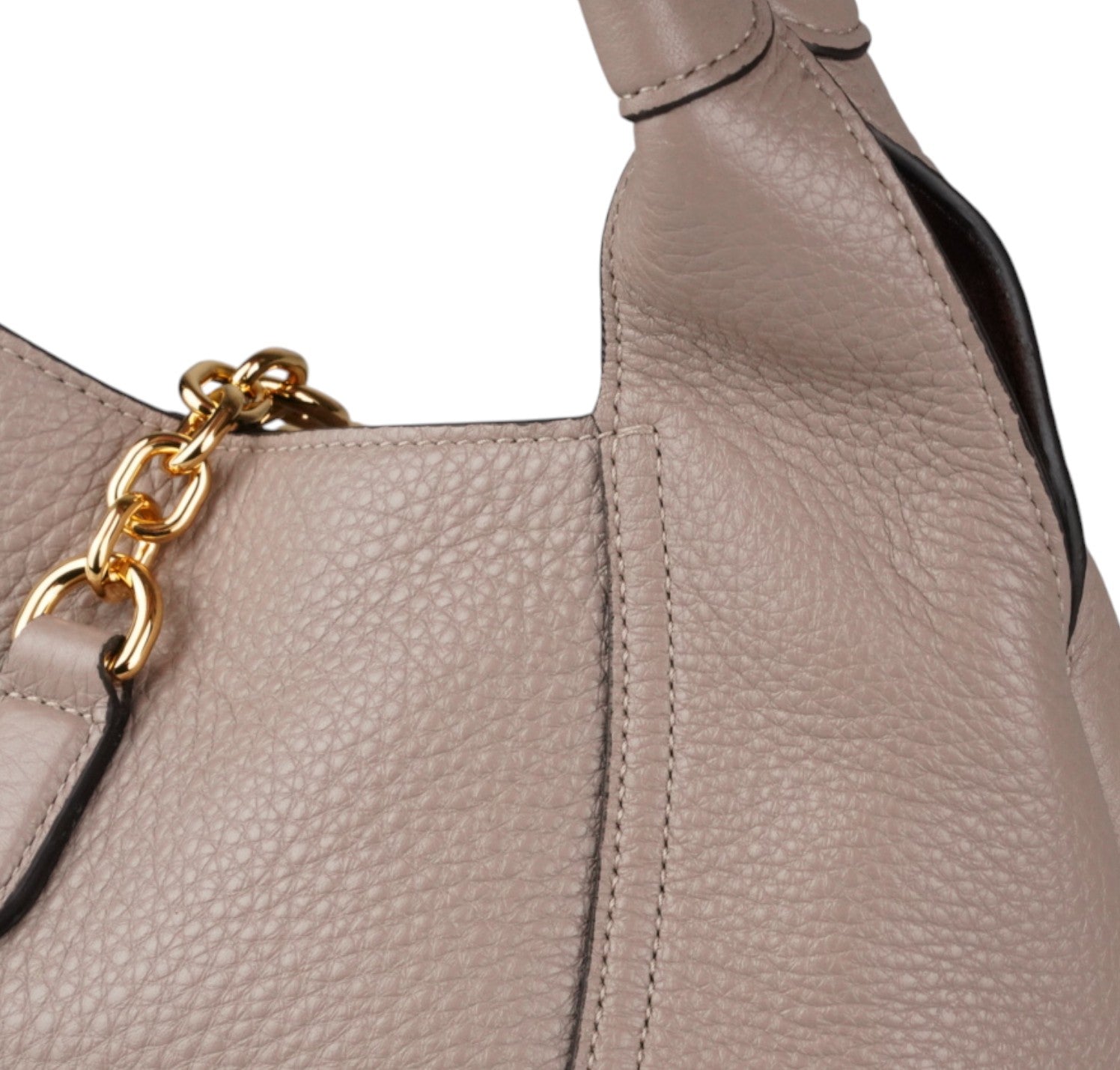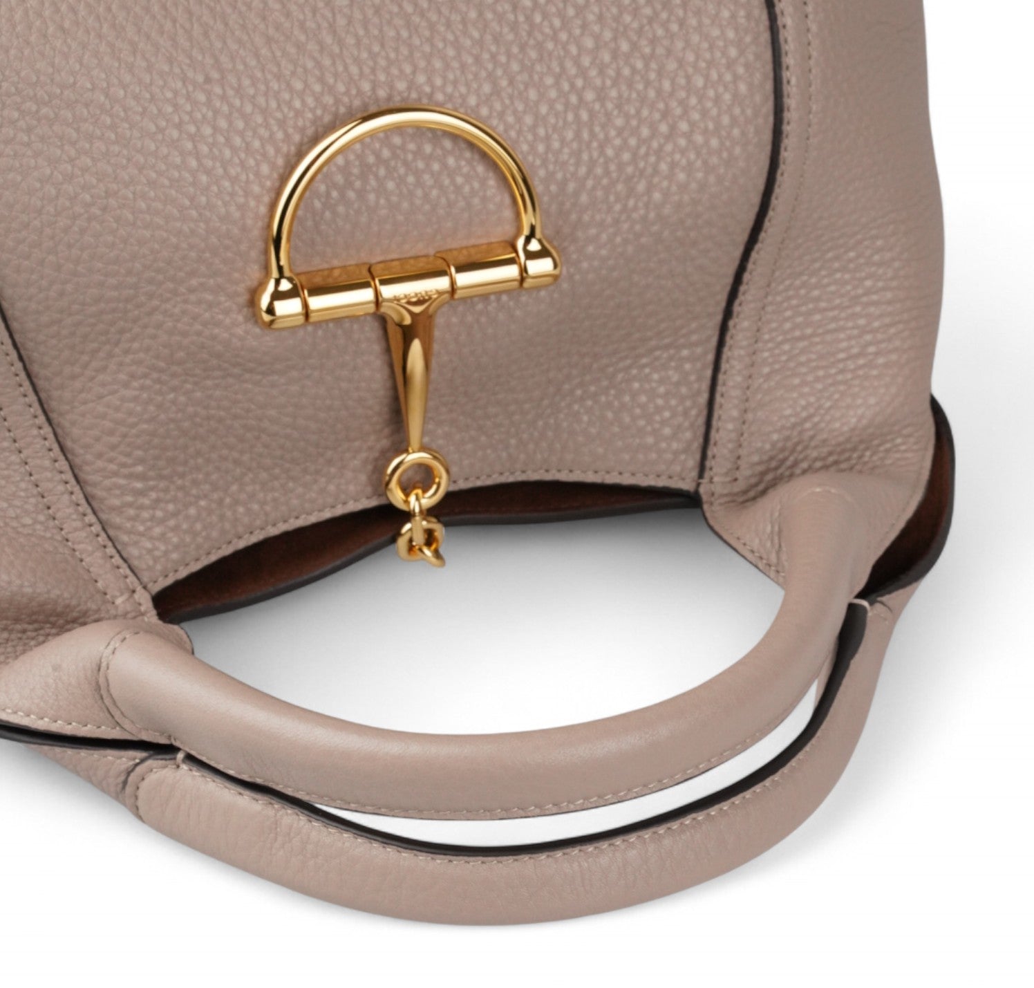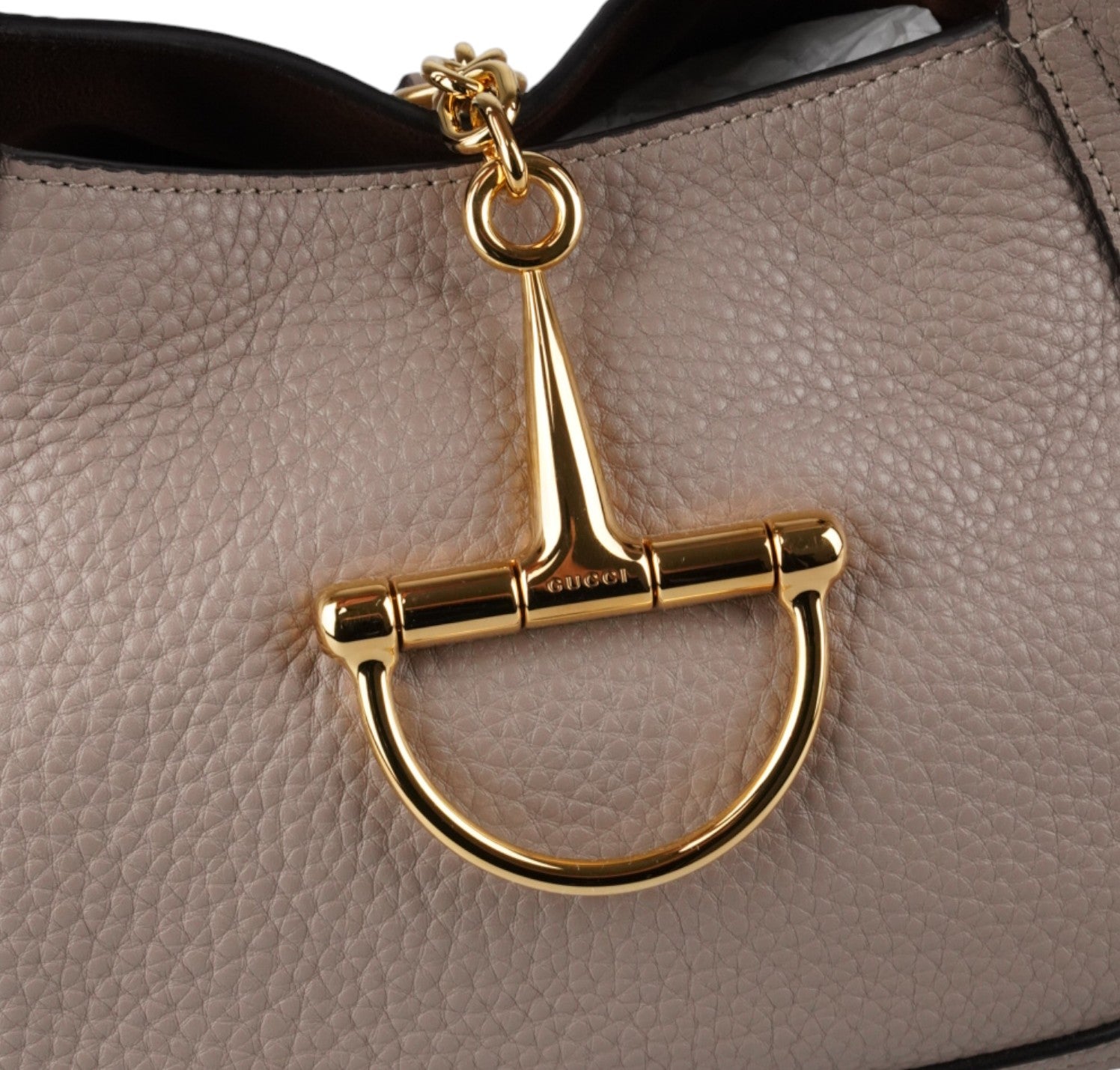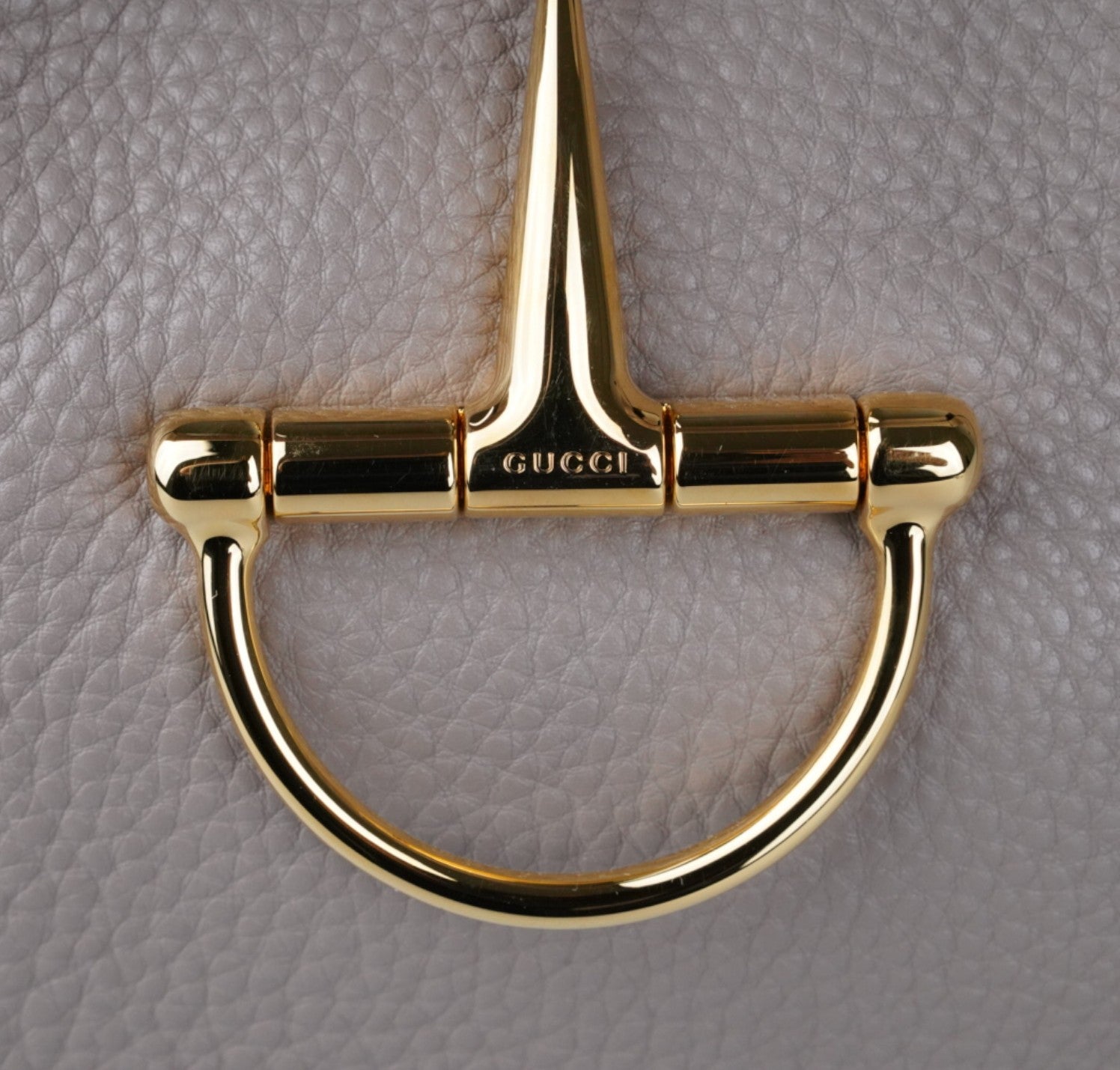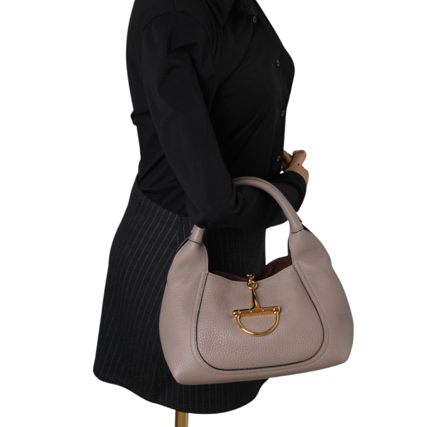 Borsa a spalla Gucci, modello Softbit, misura Media, realizzata in Pelle Granata (grainy) Tortora con chiusura a mezza fibbia Horsebit oversize. Finiture in metallo dorato. Interno in microfibra marrone. Manici superiori per il trasporto a braccio o mano. Modello nuova collezione, di produzione recente. Non presenta segni d'uso ma potrebbe comunque presentare micro segni di stoccaggio.