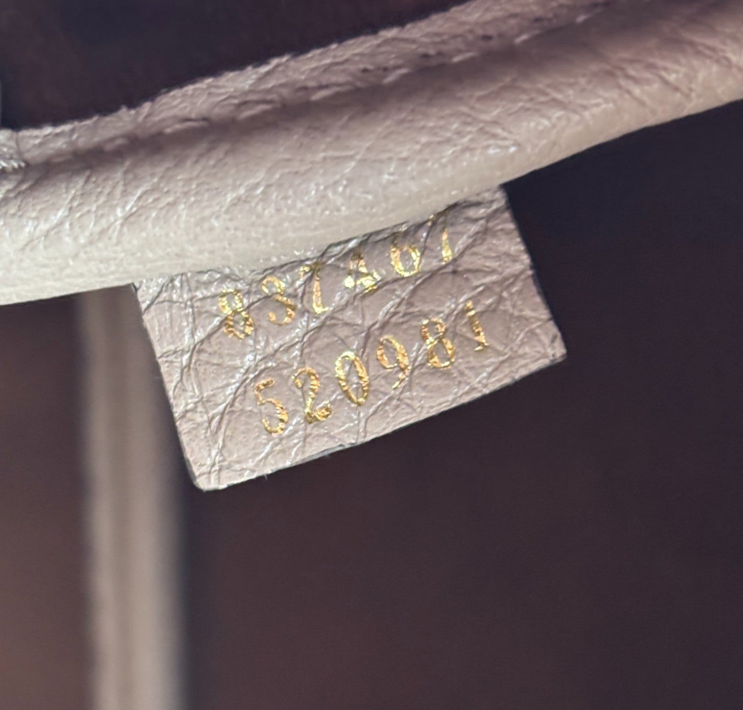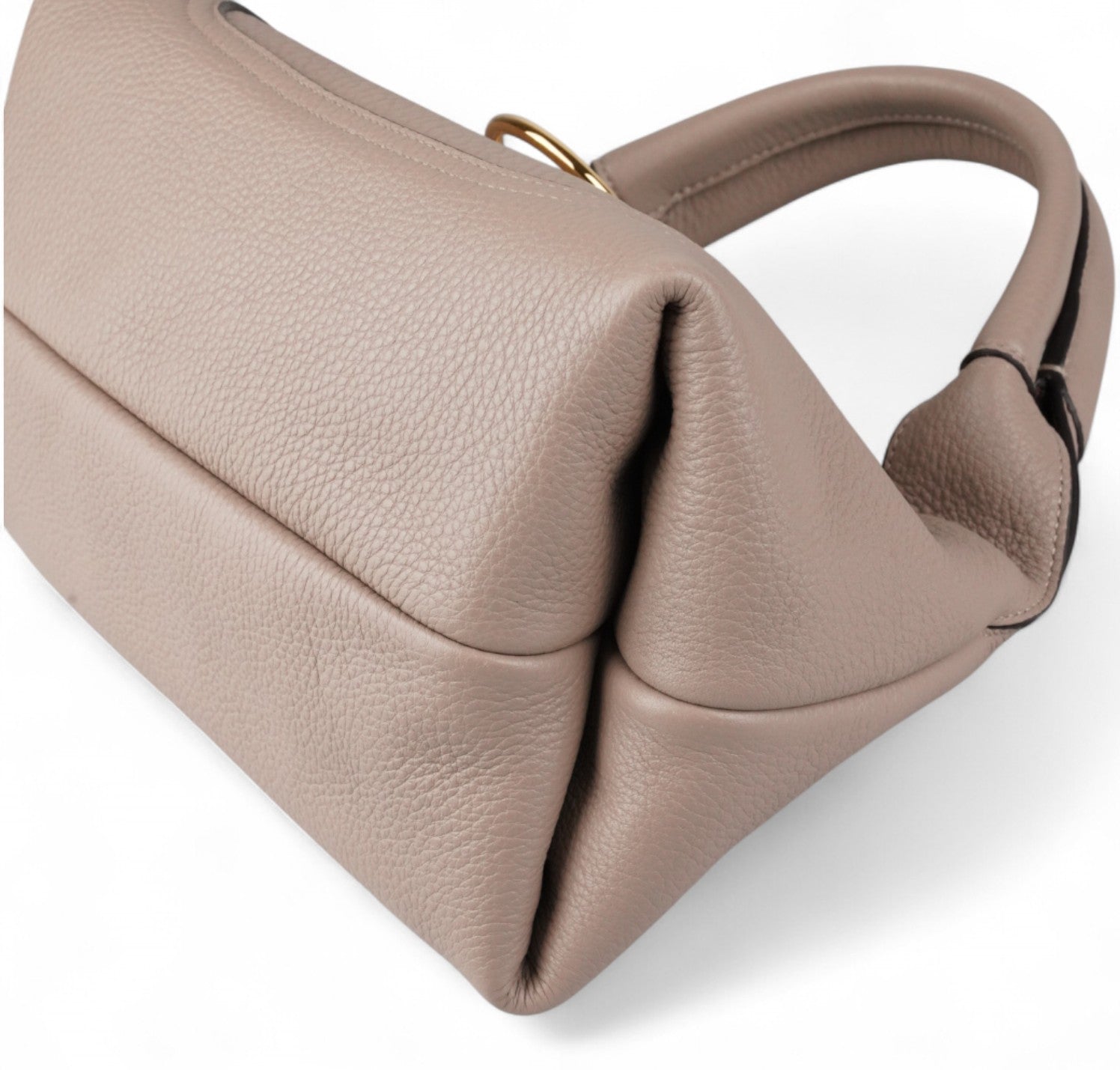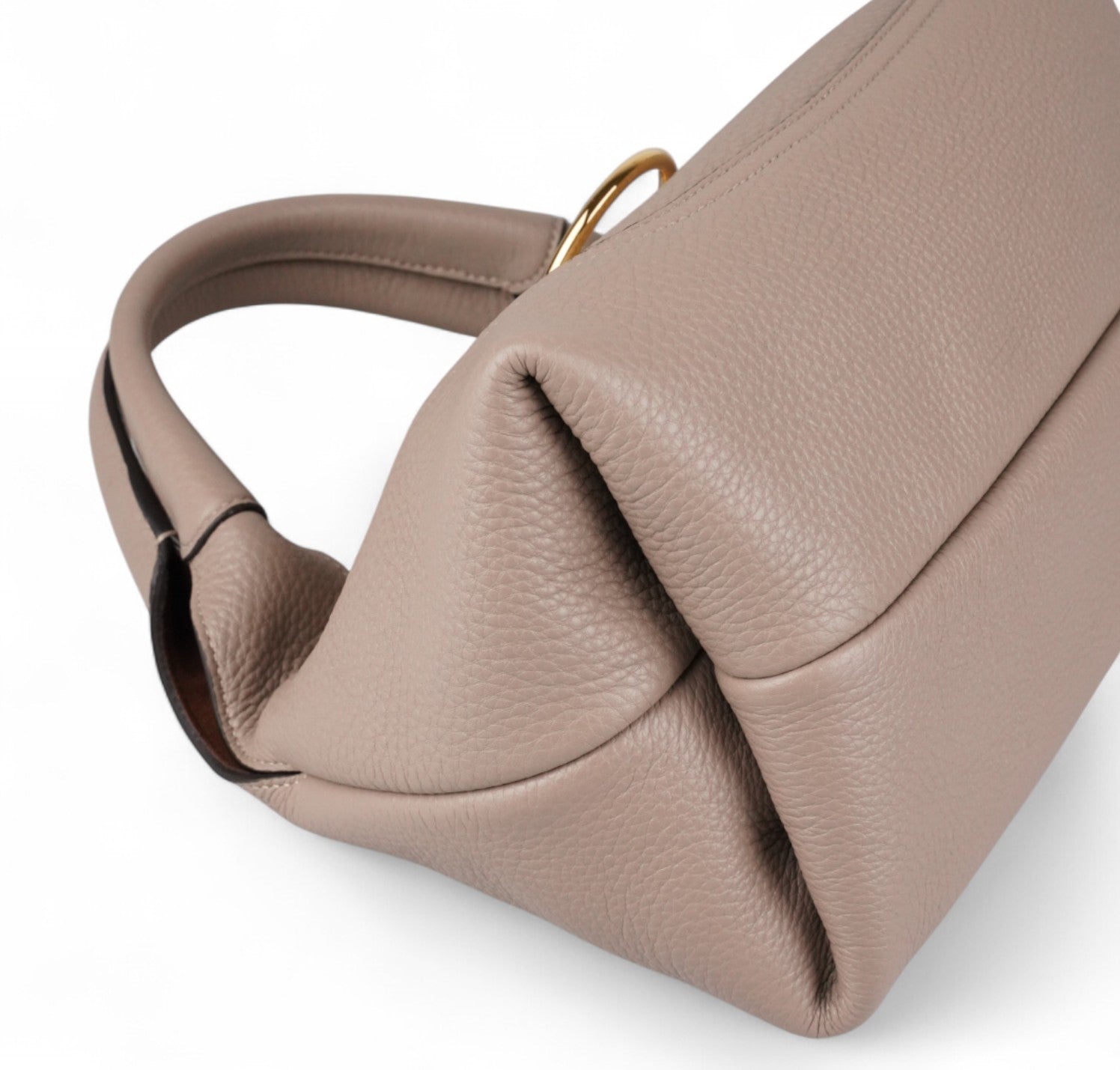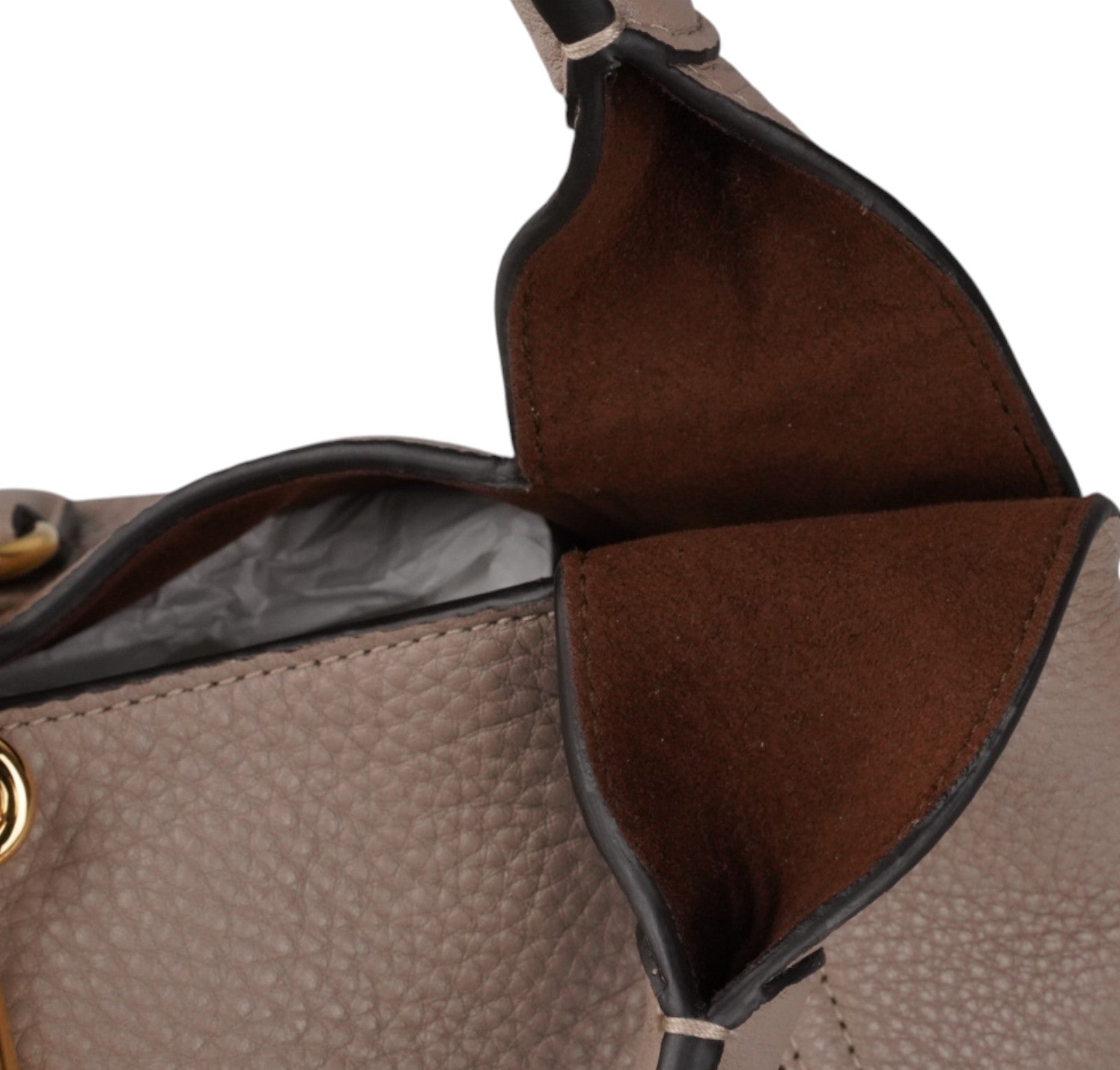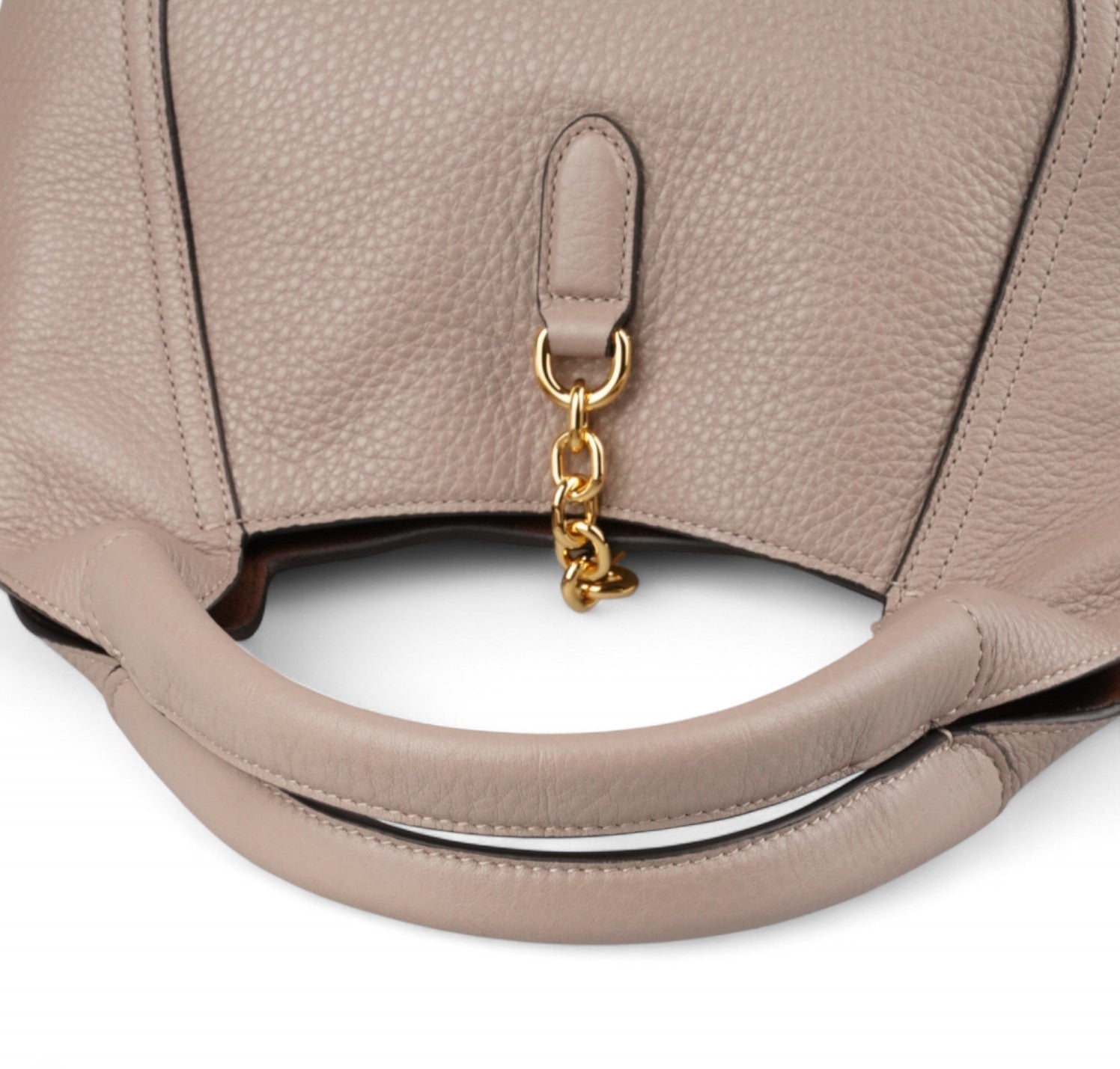 Borsa a spalla Gucci, modello Softbit, misura Media, realizzata in Pelle Granata (grainy) Tortora con chiusura a mezza fibbia Horsebit oversize. Finiture in metallo dorato. Interno in microfibra marrone. Manici superiori per il trasporto a braccio o mano. Modello nuova collezione, di produzione recente. Non presenta segni d'uso ma potrebbe comunque presentare micro segni di stoccaggio.