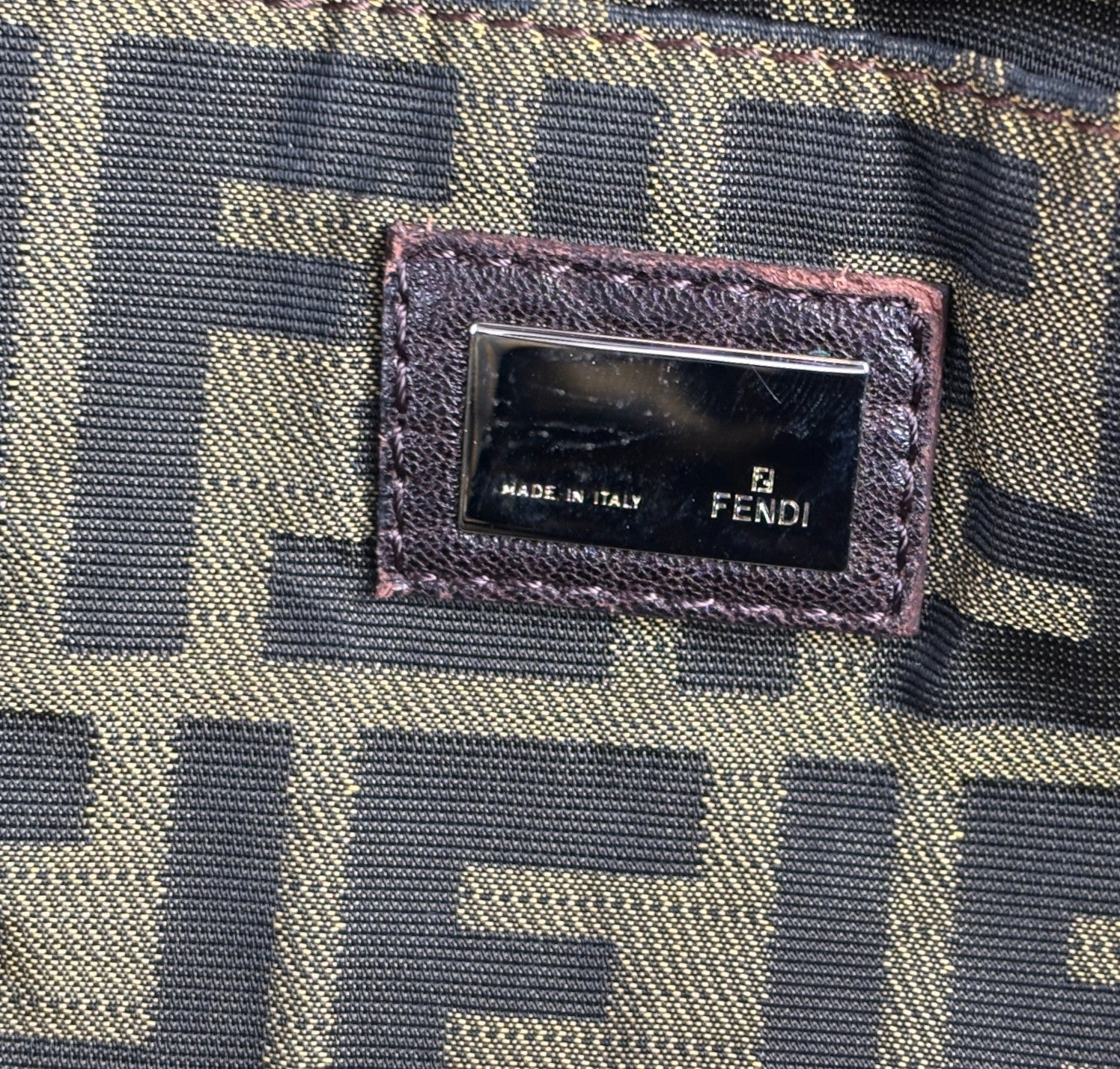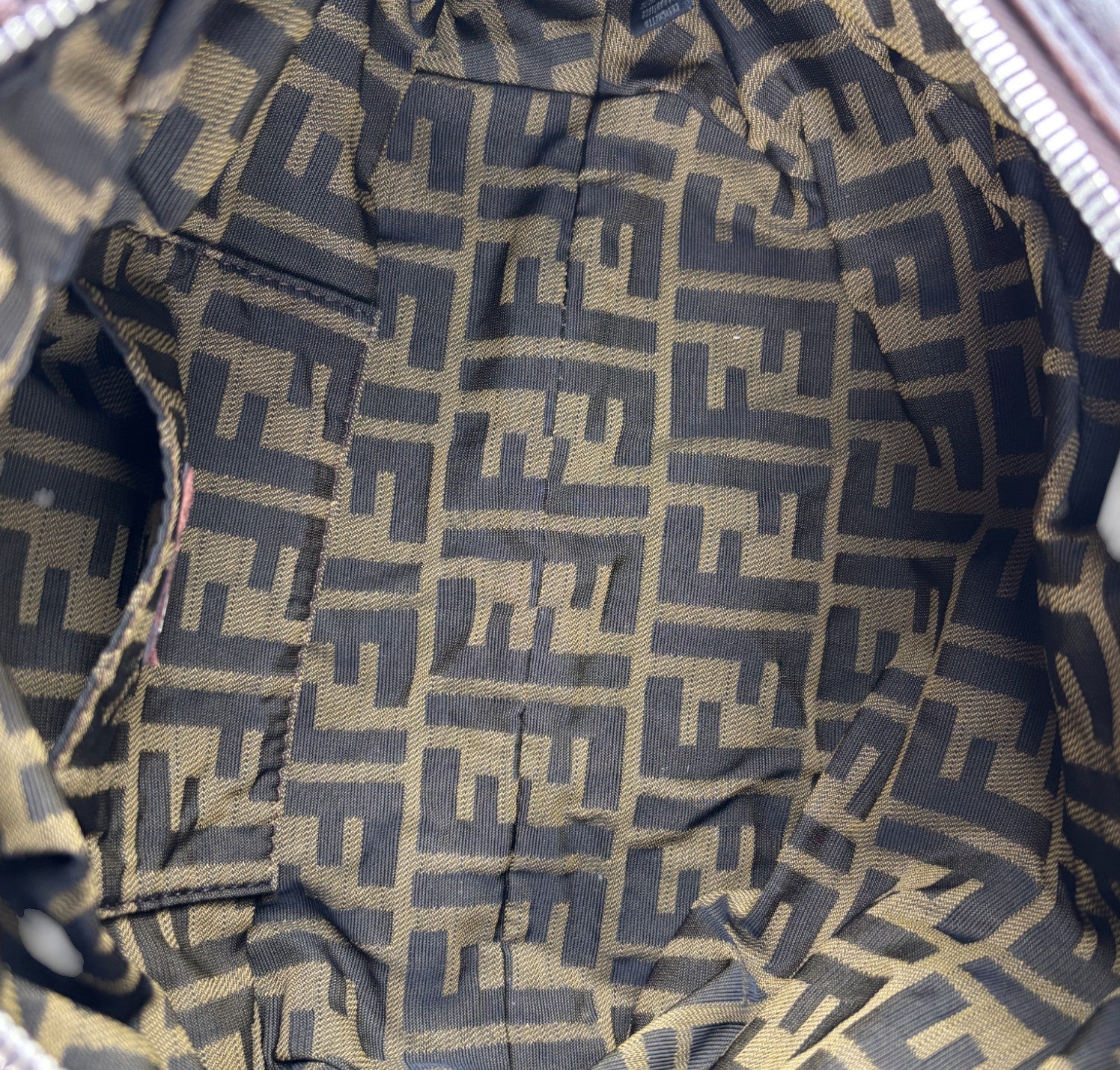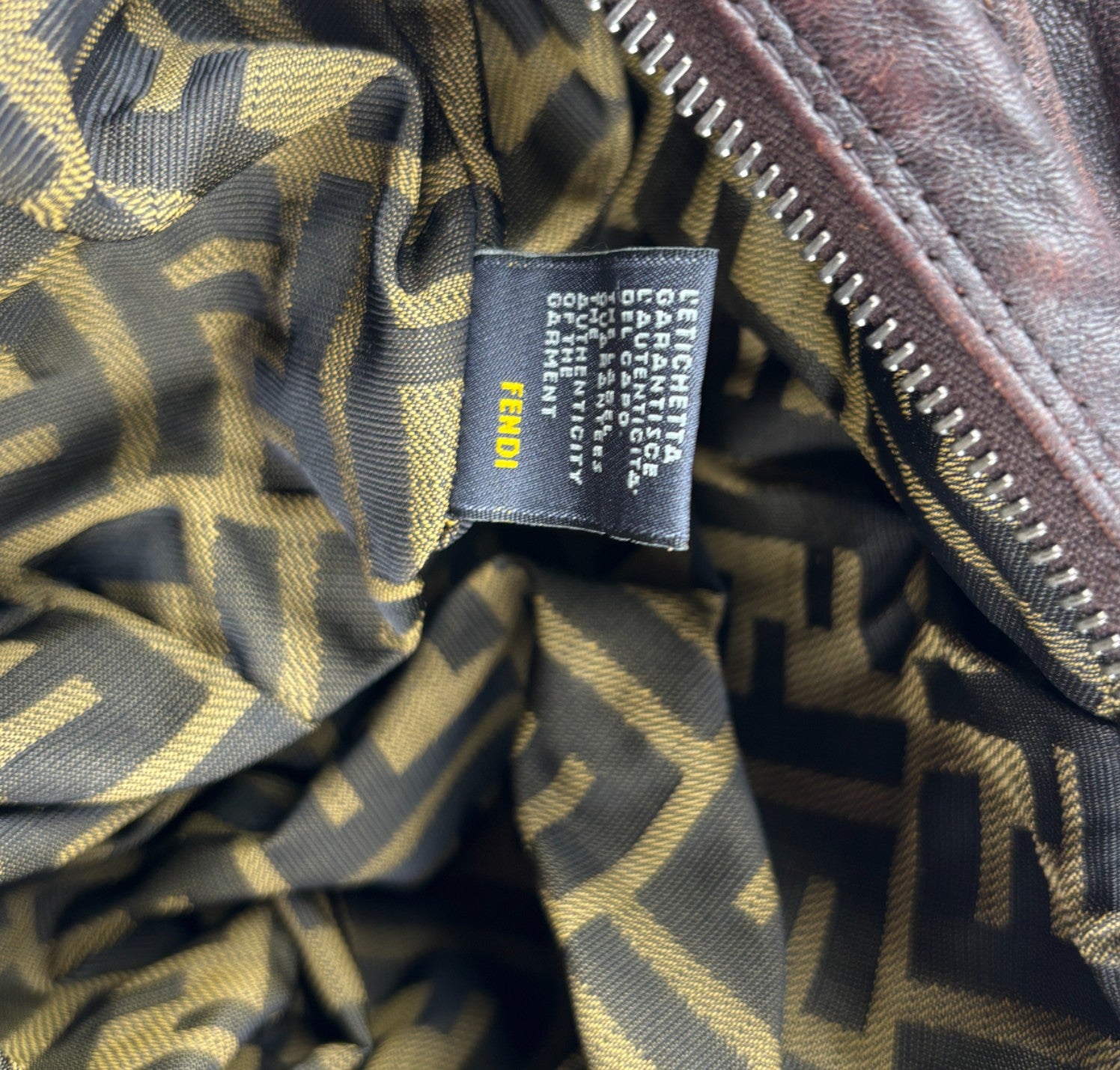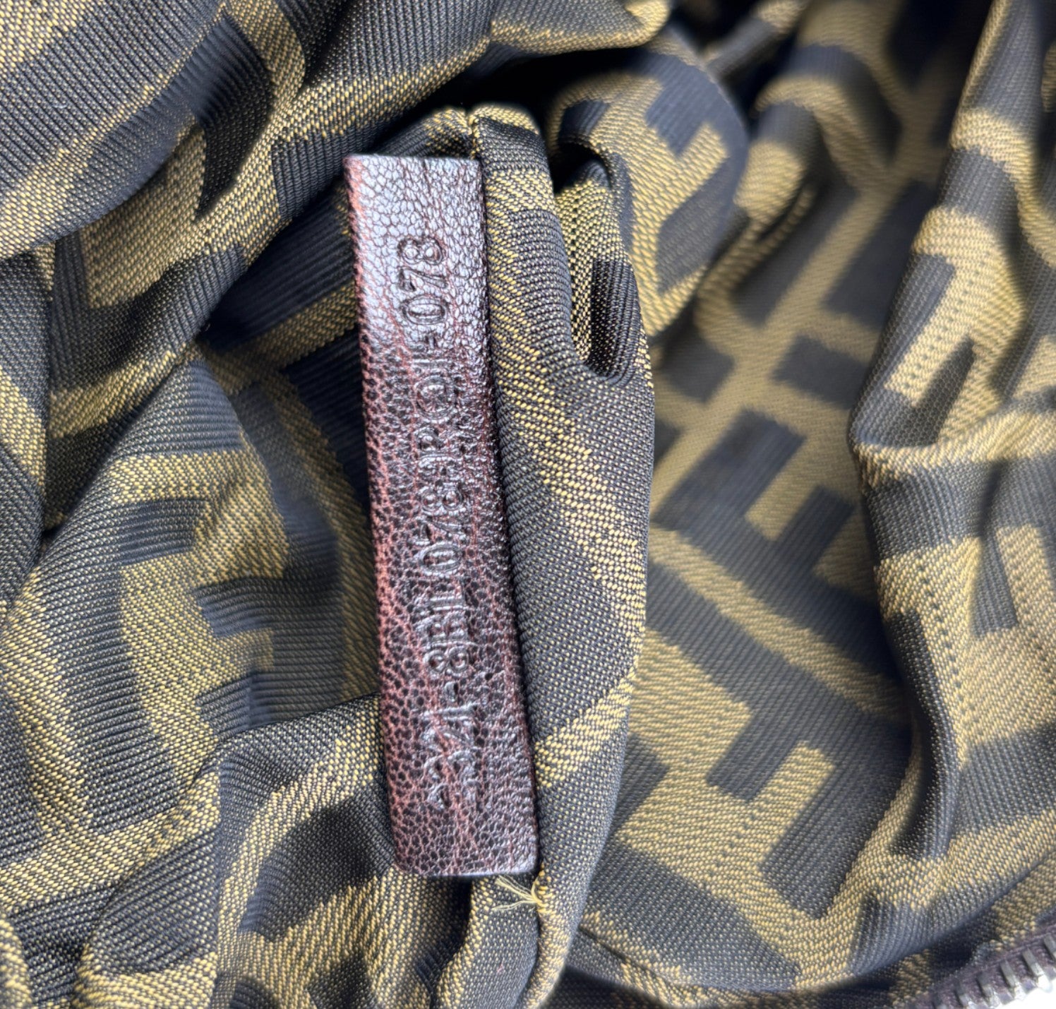 Fendi bag, Spy Vintage model, made of Monogram Zucca Canvas. Tobacco Brown Leather finishes. Gold-colored metal parts. Equipped with special woven upper handles. Upper closure with zip and maxi logo puller. Interior lined in Beige Fabric, pocket. With a soft and rounded shape, slightly crescent shape that makes it roomy and comfortable. Ideal for a casual-chic look. Minimal general signs of aging on the leather, micro scratches, slight general signs of aging.