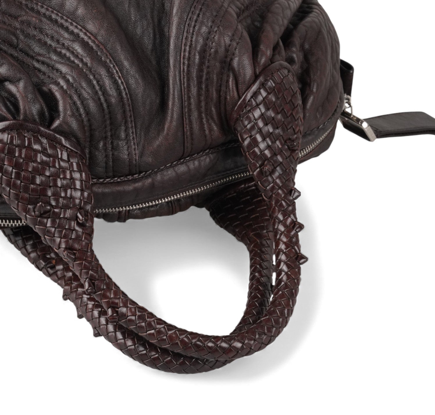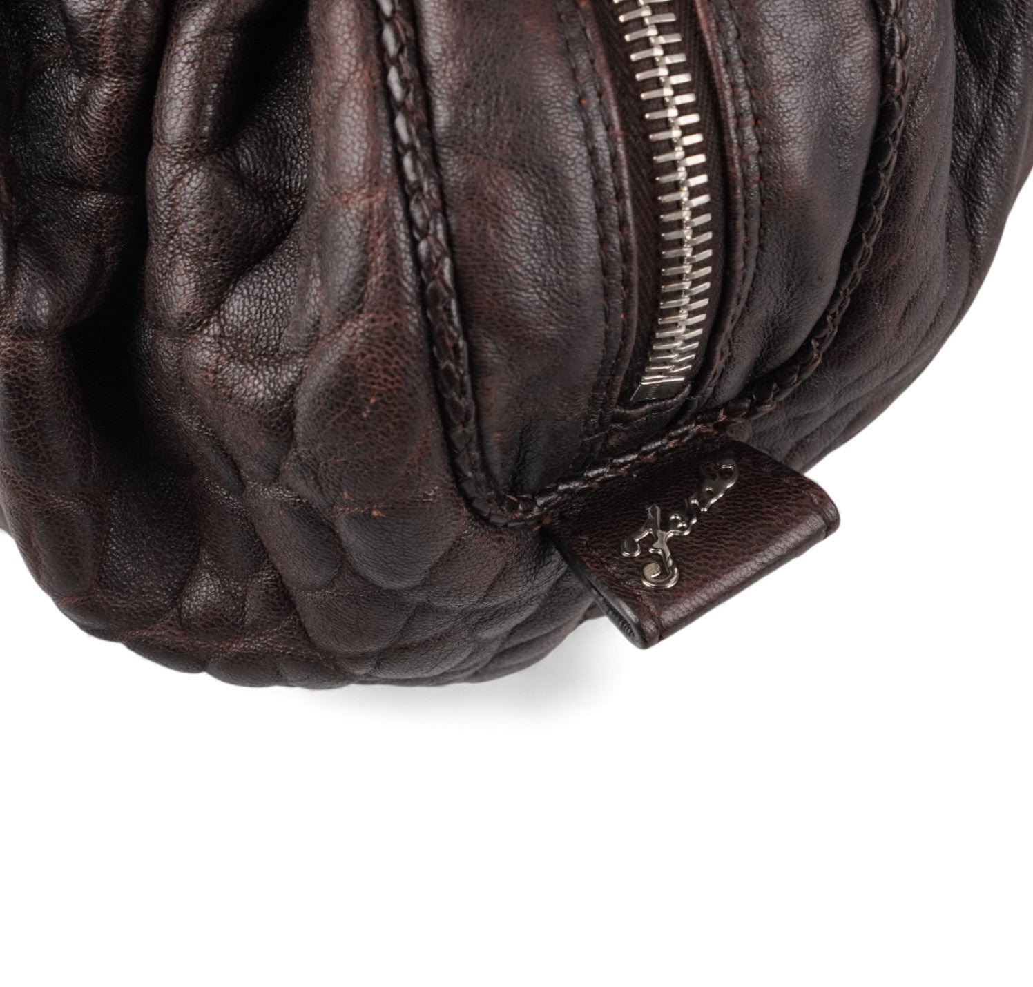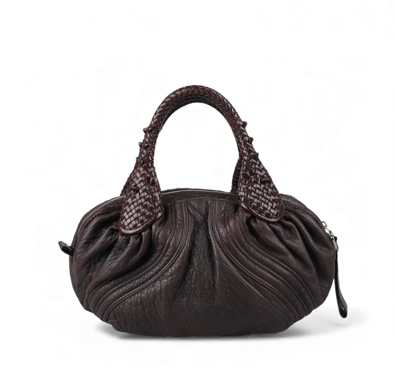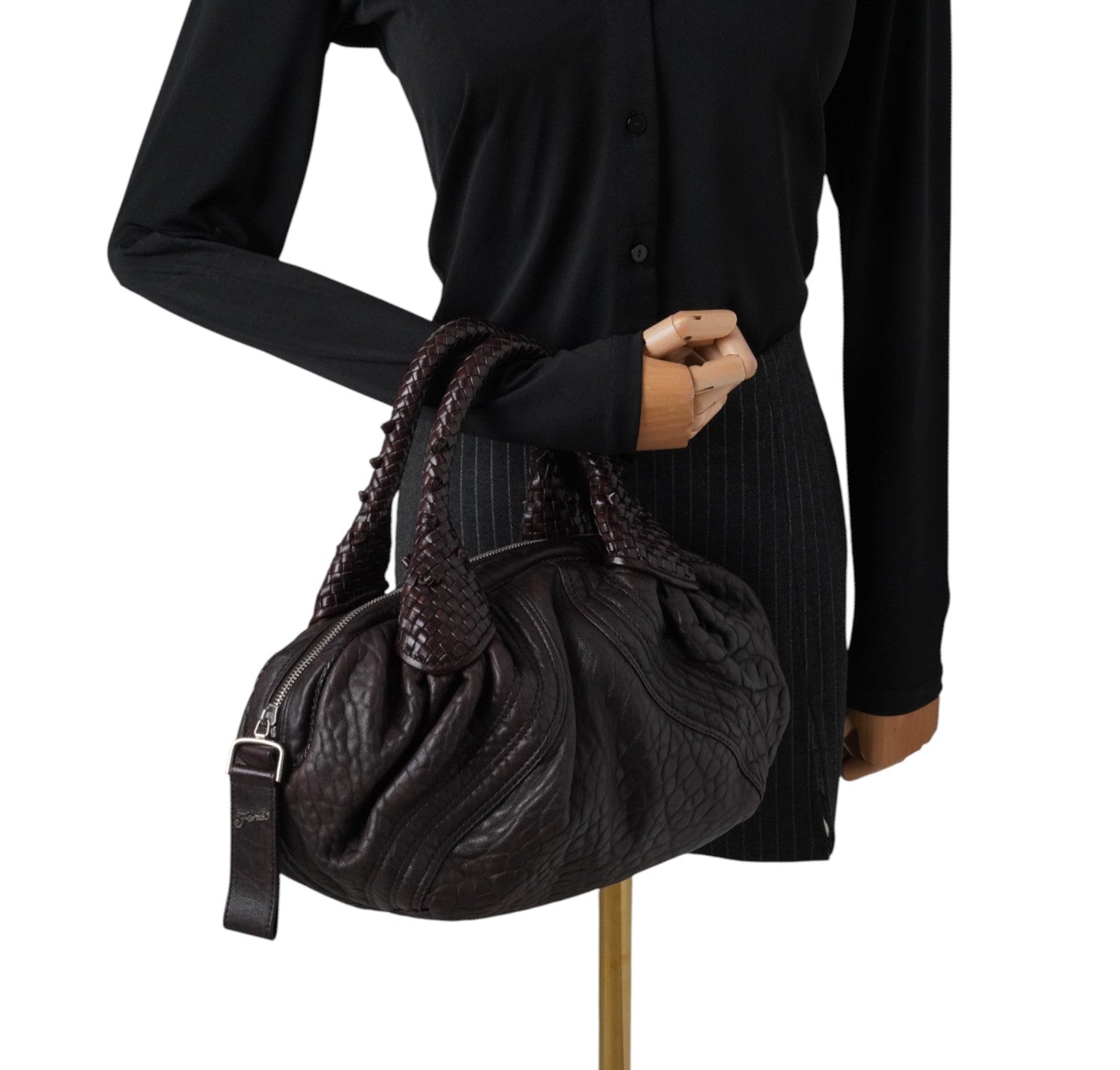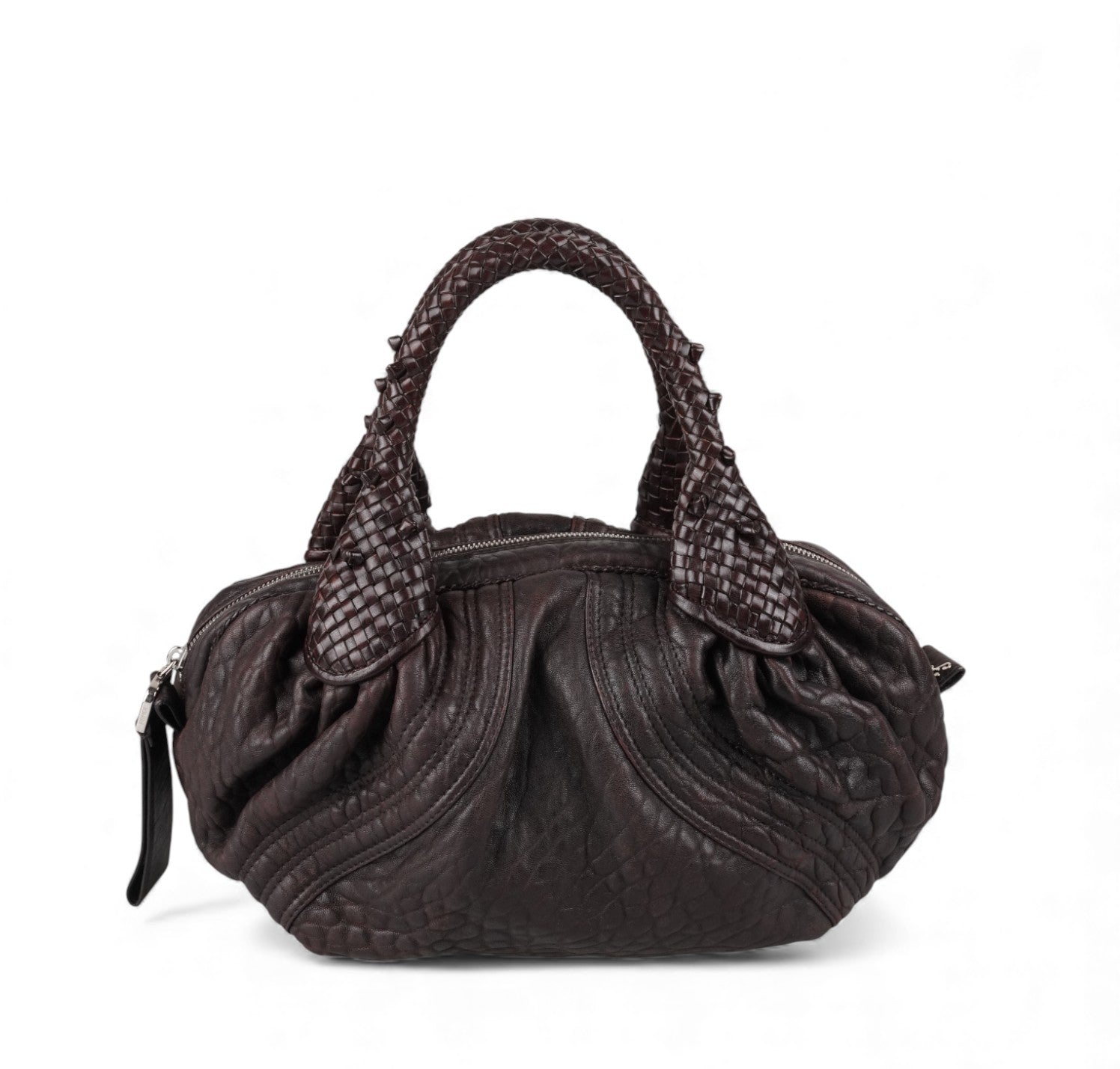 Fendi bag, Spy Vintage model, made of Monogram Zucca Canvas. Tobacco Brown Leather finishes. Gold-colored metal parts. Equipped with special woven upper handles. Upper closure with zip and maxi logo puller. Interior lined in Beige Fabric, pocket. With a soft and rounded shape, slightly crescent shape that makes it roomy and comfortable. Ideal for a casual-chic look. Minimal general signs of aging on the leather, micro scratches, slight general signs of aging.
