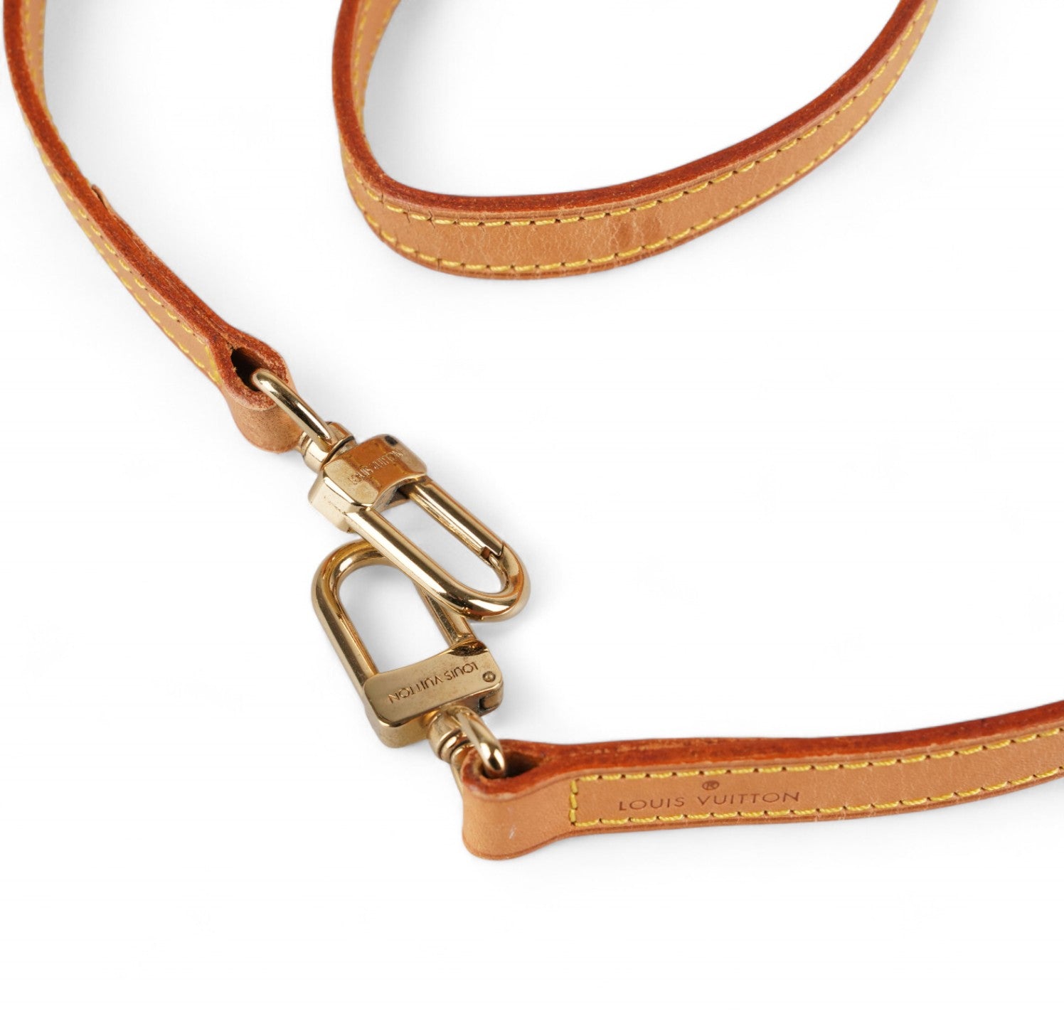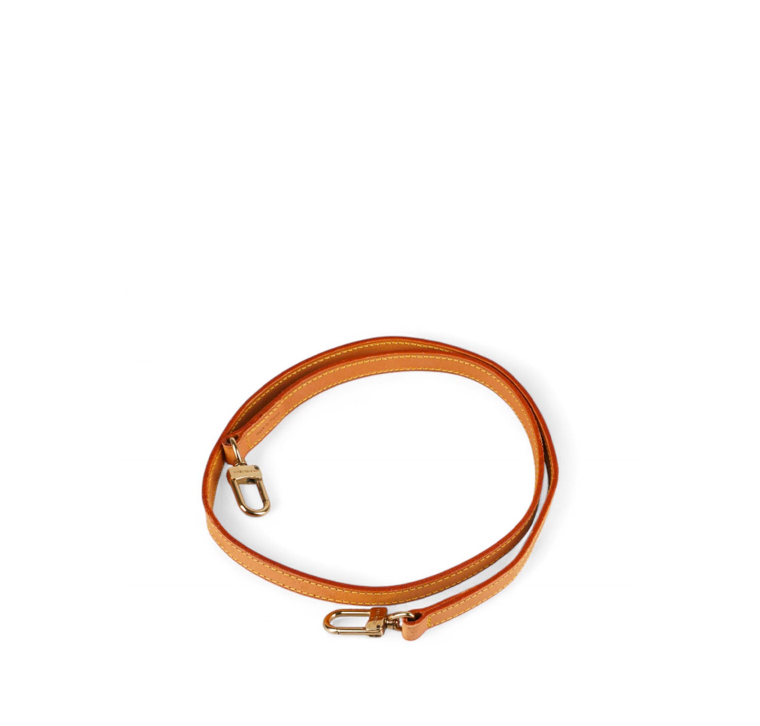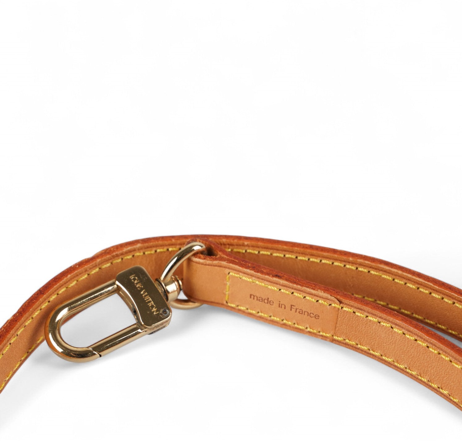 Tracolla Louis Vuitton realizzata in Vacchetta Naturale Mielata. L'hardware è composto da ganci in metallo, finitura oro, caratterizzati dal logo minimal Louis Vuitton. Le dimensioni (esclusi gli hardware) sono: 100 cm di lunghezza e 1.5 cm di altezza. Grazie al suo design universale e minimal, si adatta perfettamente a molteplici modelli di borse Louis Vuitton. Non è regolabile. Presenta lievi aloni sulla pelle, normali segni di utilizzo e micro graffi alla metalleria.
