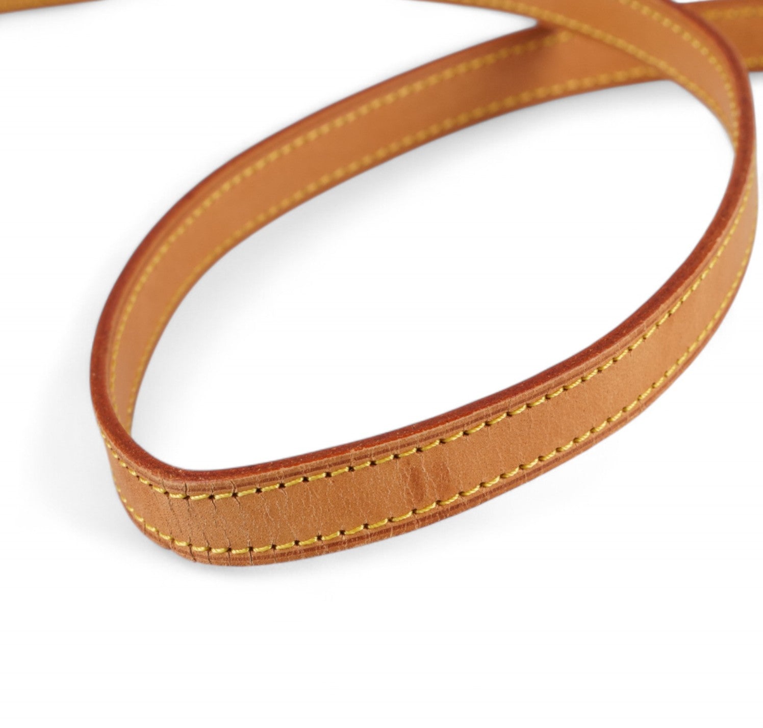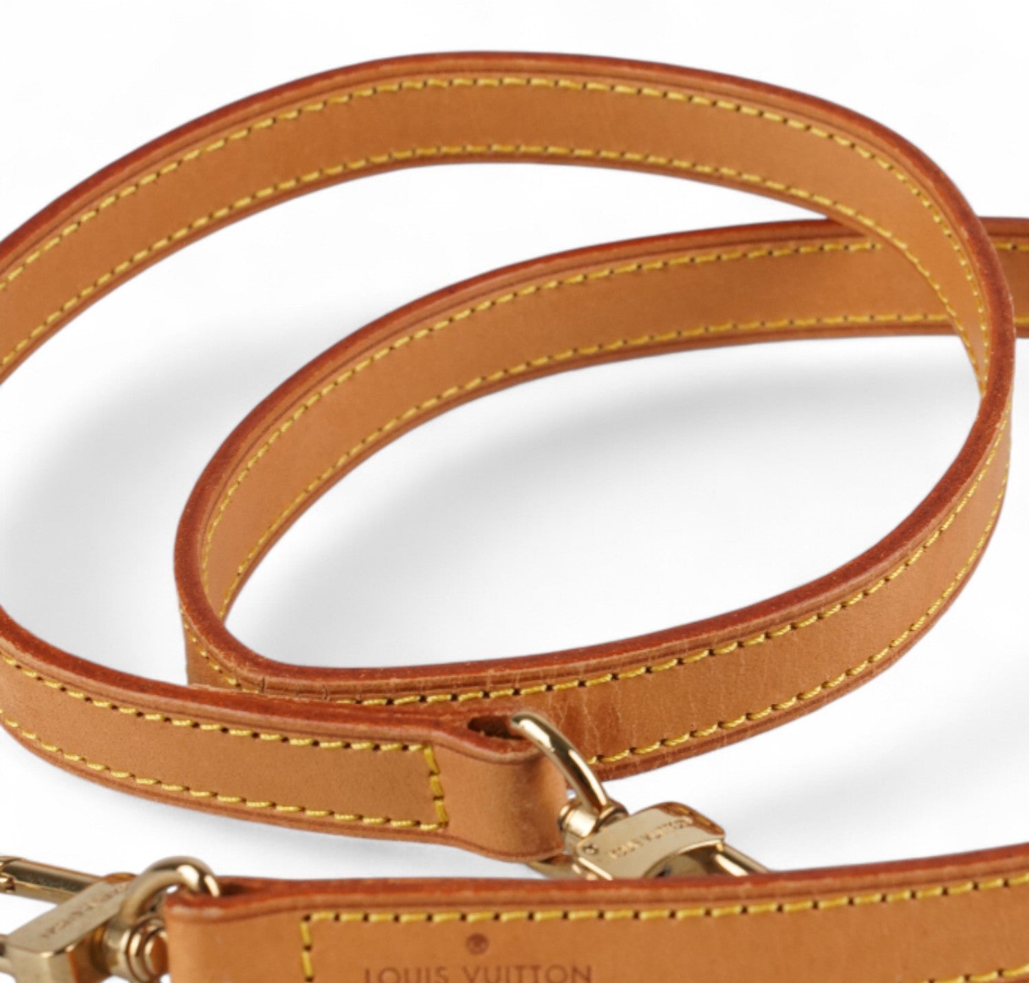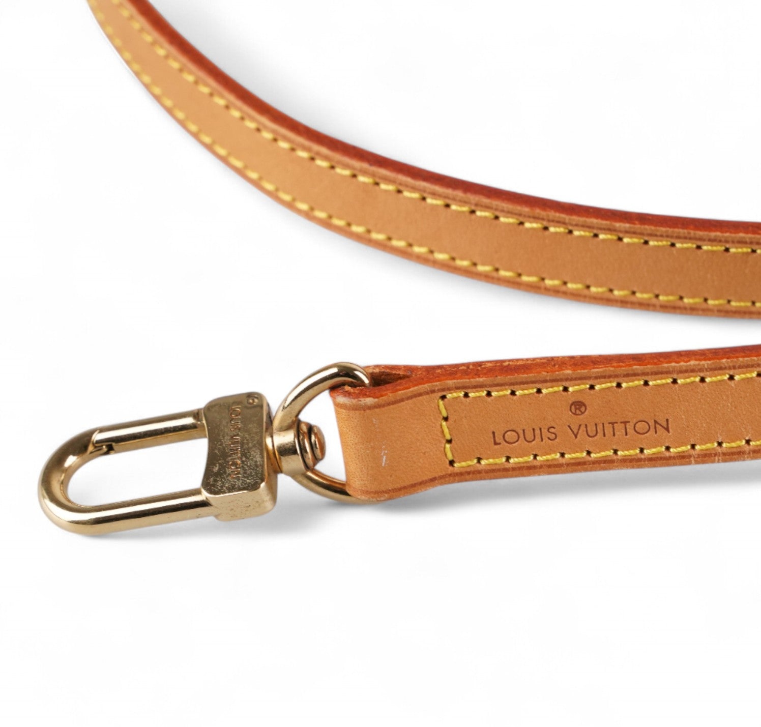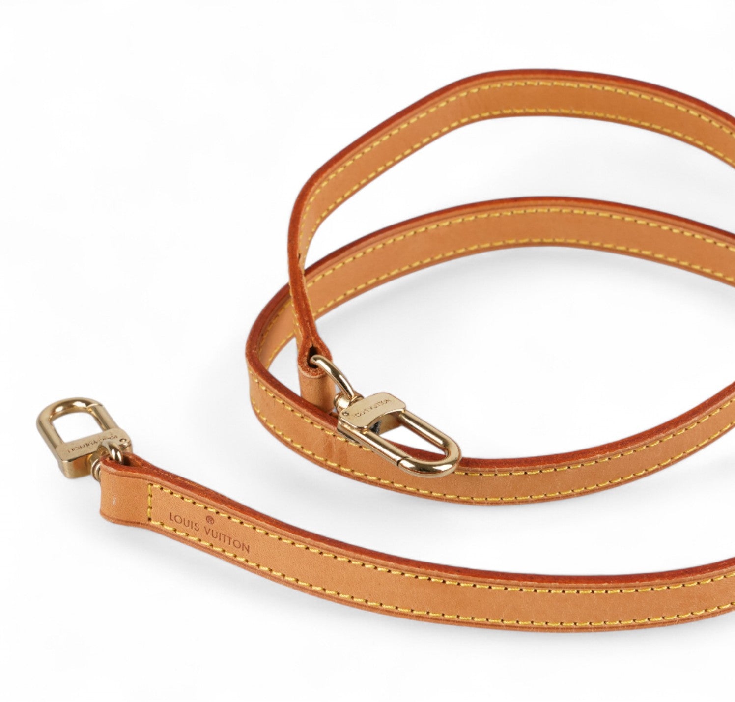 Tracolla Louis Vuitton realizzata in Vacchetta Naturale Mielata. L'hardware è composto da ganci in metallo, finitura oro, caratterizzati dal logo minimal Louis Vuitton. Le dimensioni (esclusi gli hardware) sono: 100 cm di lunghezza e 1.5 cm di altezza. Grazie al suo design universale e minimal, si adatta perfettamente a molteplici modelli di borse Louis Vuitton. Non è regolabile. Presenta lievi aloni sulla pelle, normali segni di utilizzo e micro graffi alla metalleria.