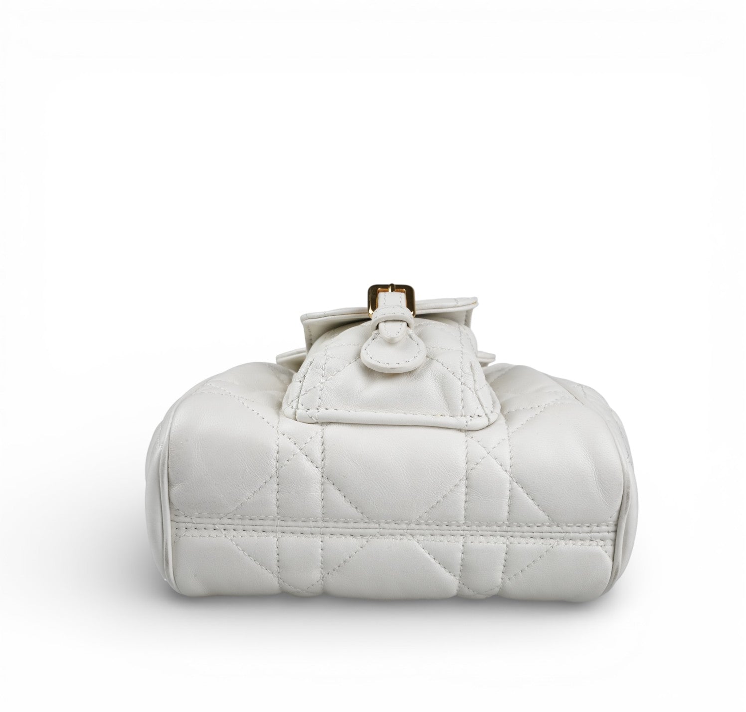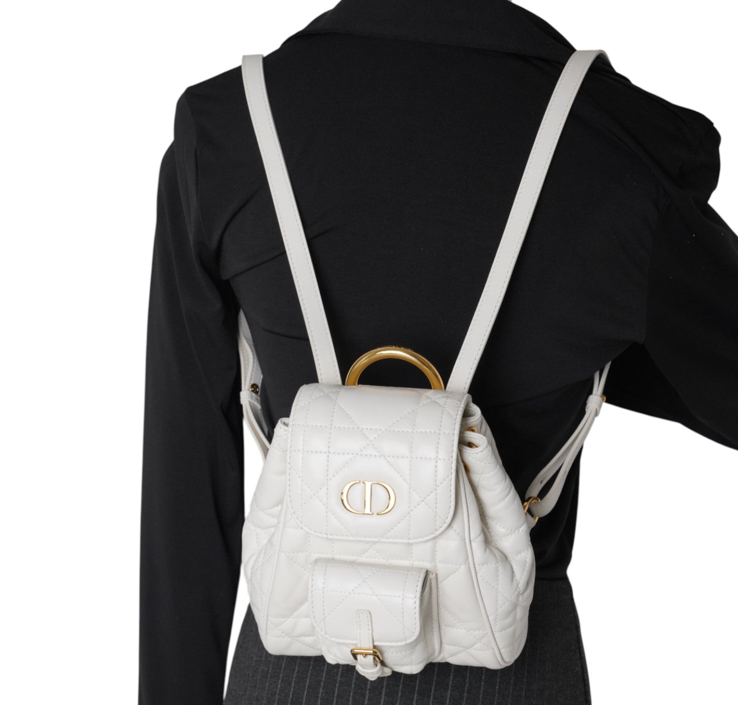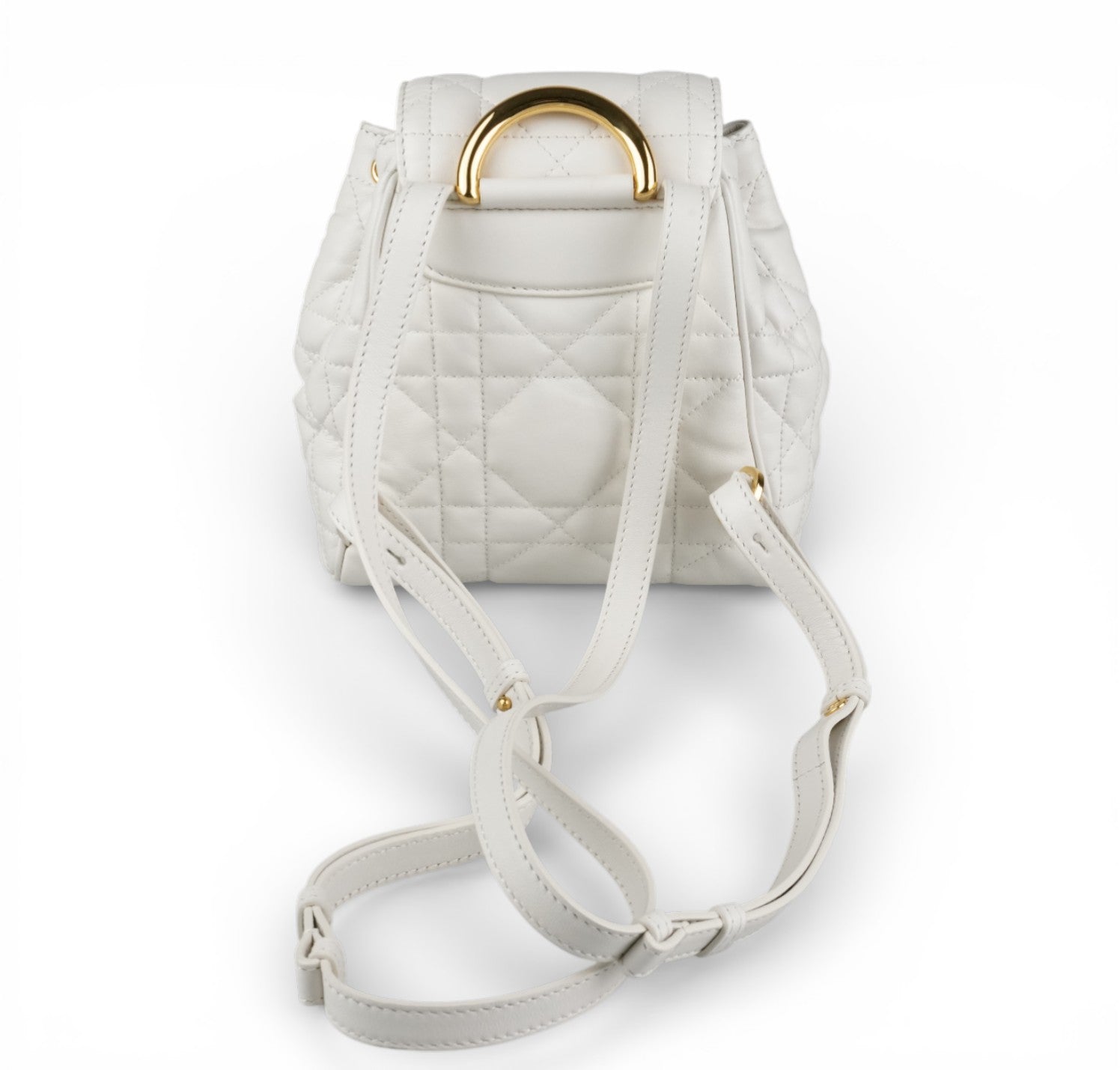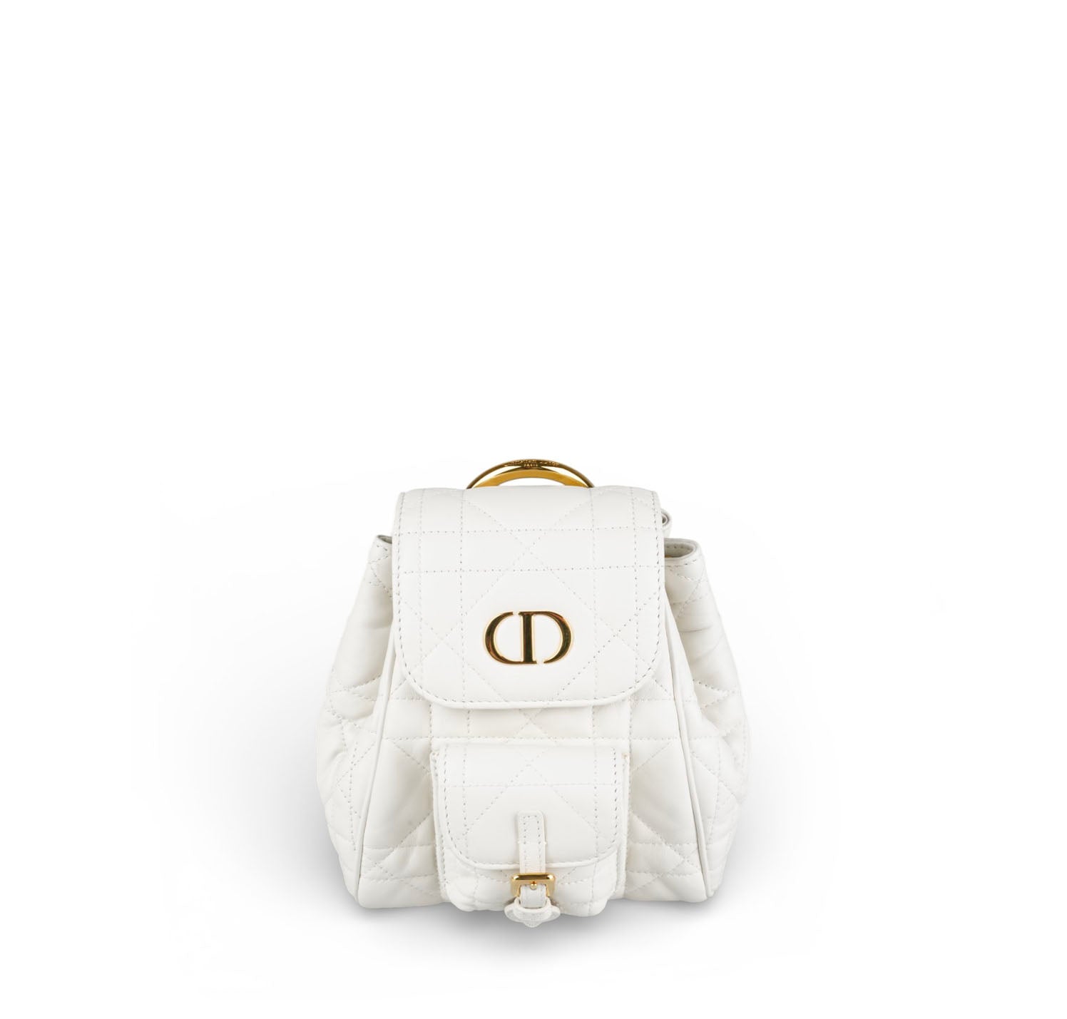 Zaino Dior, modello Caro, misura Piccola, realizzato in pelle Macrocannage tonalità Latte (bianco) con motivo trapuntato. Presenta dettagli metallici color Oro effetto anticato e spallacci posteriori regolabili in pelle. Interno capiente per l'essenziale, foderato in pelle con unico scomparto munito di piccola tasca laterale. Chiusura con pattina magnetica arricchita da logo CD e coulisse. Condizioni pari al nuovo, senza segni di utilizzo. Potrebbe presentare micro segni di stoccaggio. Retail €3.050.