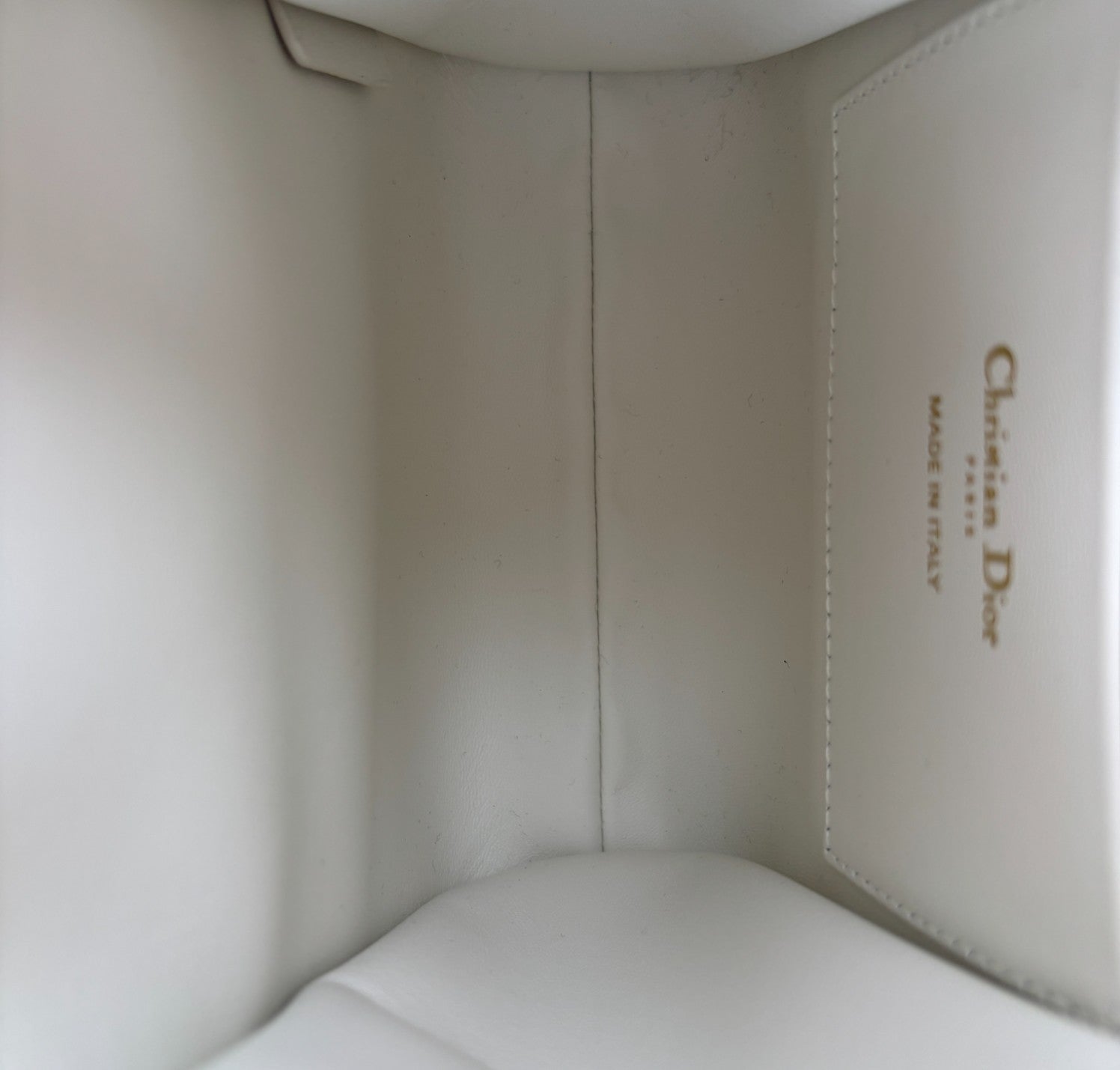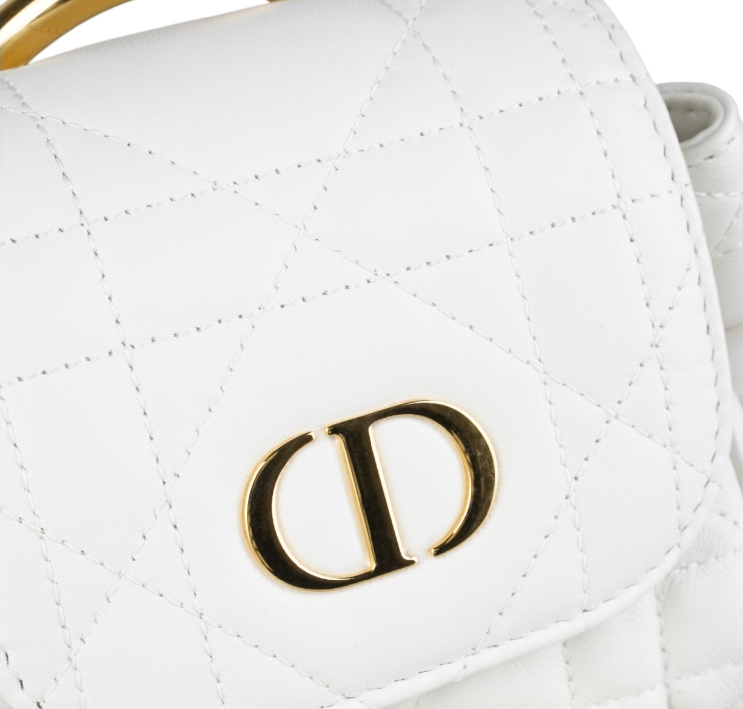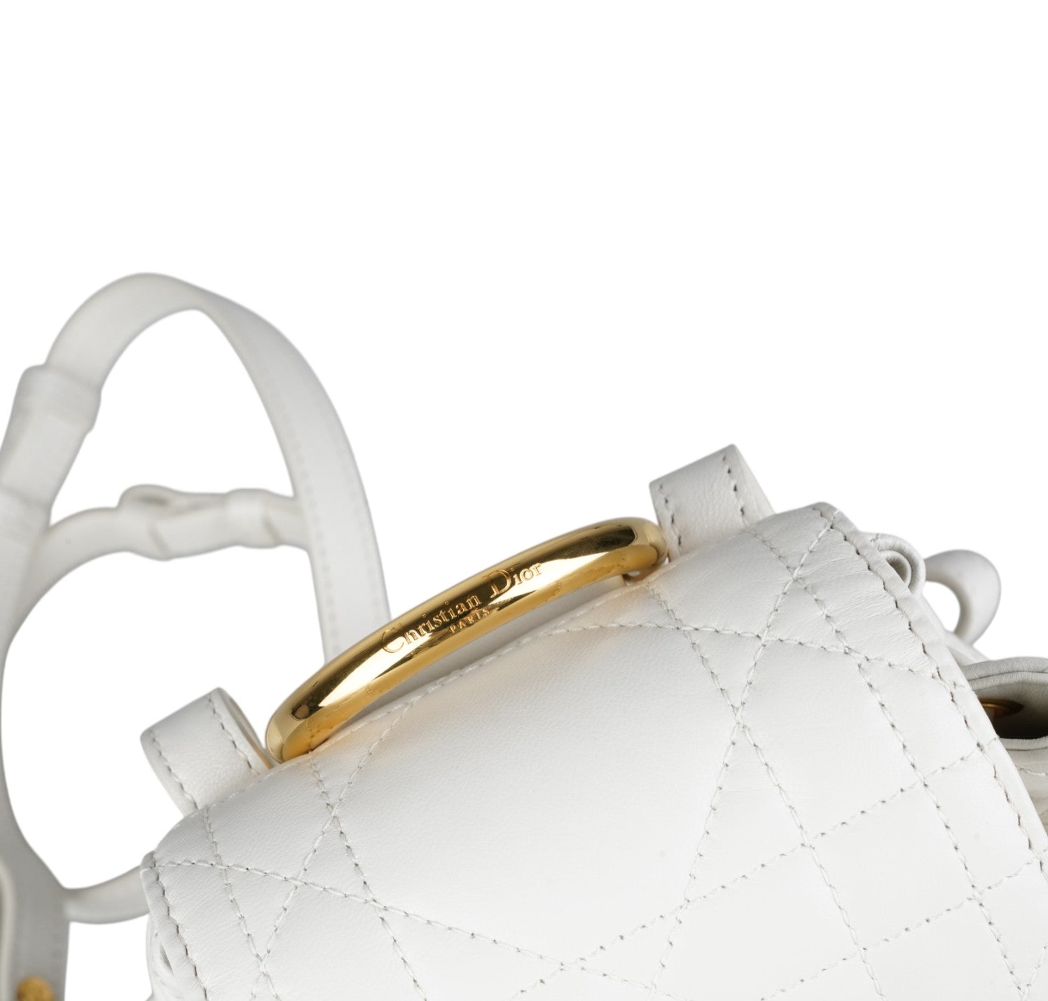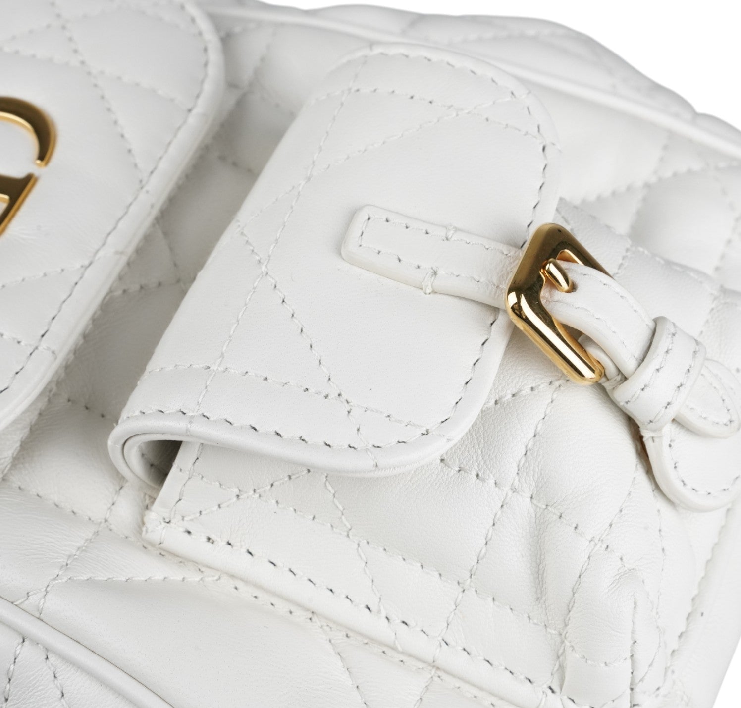 Zaino Dior, modello Caro, misura Piccola, realizzato in pelle Macrocannage tonalità Latte (bianco) con motivo trapuntato. Presenta dettagli metallici color Oro effetto anticato e spallacci posteriori regolabili in pelle. Interno capiente per l'essenziale, foderato in pelle con unico scomparto munito di piccola tasca laterale. Chiusura con pattina magnetica arricchita da logo CD e coulisse. Condizioni pari al nuovo, senza segni di utilizzo. Potrebbe presentare micro segni di stoccaggio. Retail €3.050.