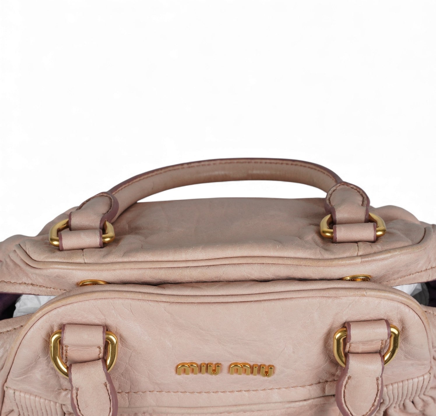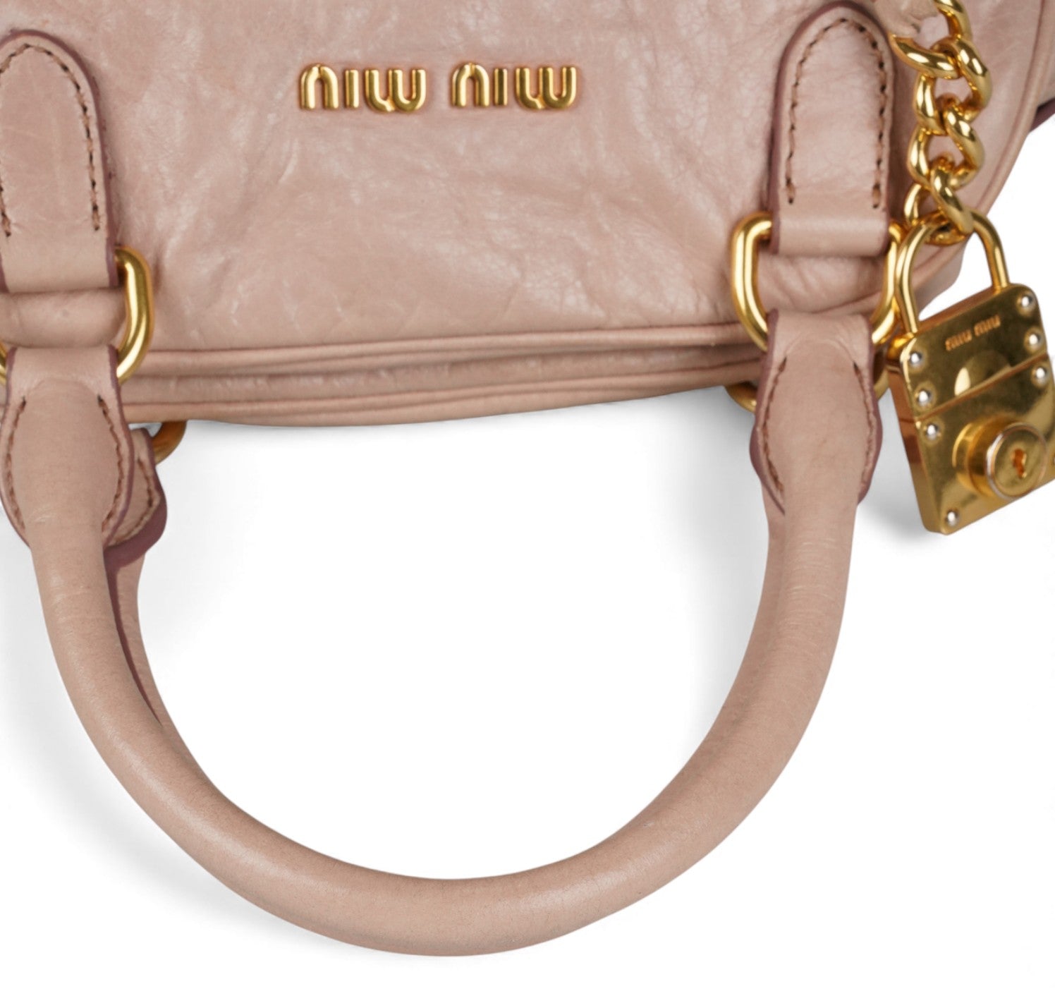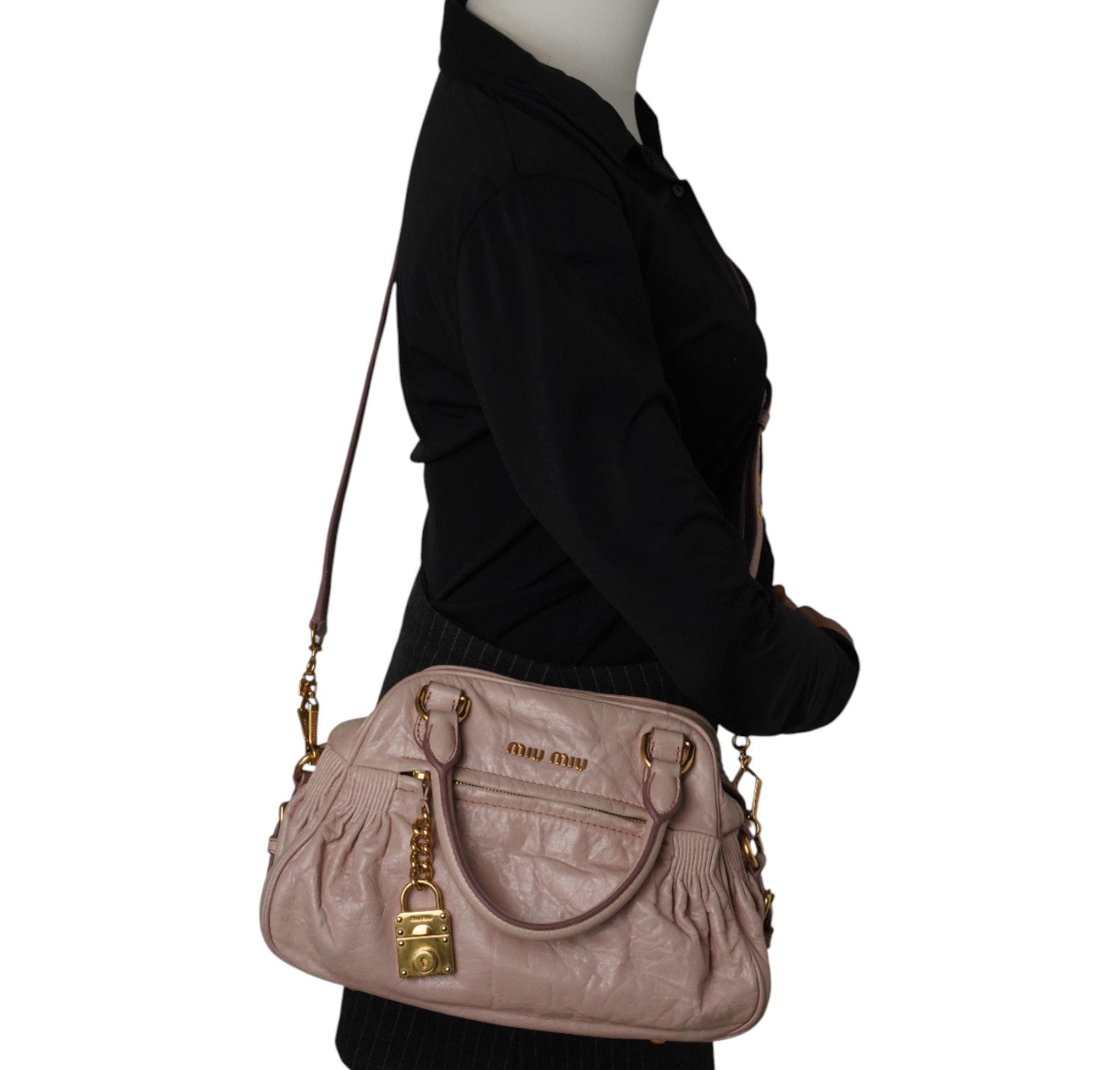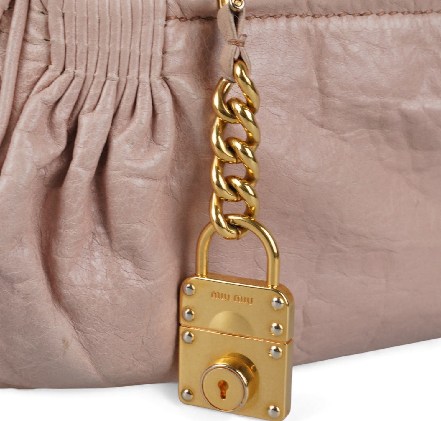Borsa Miu Miu, modello 2 Way, realizzata in morbida pelle “shine” color Cipria con dettagli arricciati laterali e charm lucchetto dorato frontale. Metalleria in finitura oro, doppi manici superiori e tracolla regolabile e rimovibile per portabilità a mano o a spalla. Tasca frontale con zip, interno foderato in tessuto viola con scomparto capiente ideale per uso quotidiano. Piedini metallici di protezione sul fondo. Chiusura superiore a pressione. Minimi segni d’uso sulla pelle, minimi segni d'uso metalleria, micrograffi. Condizioni complessive ottime.
