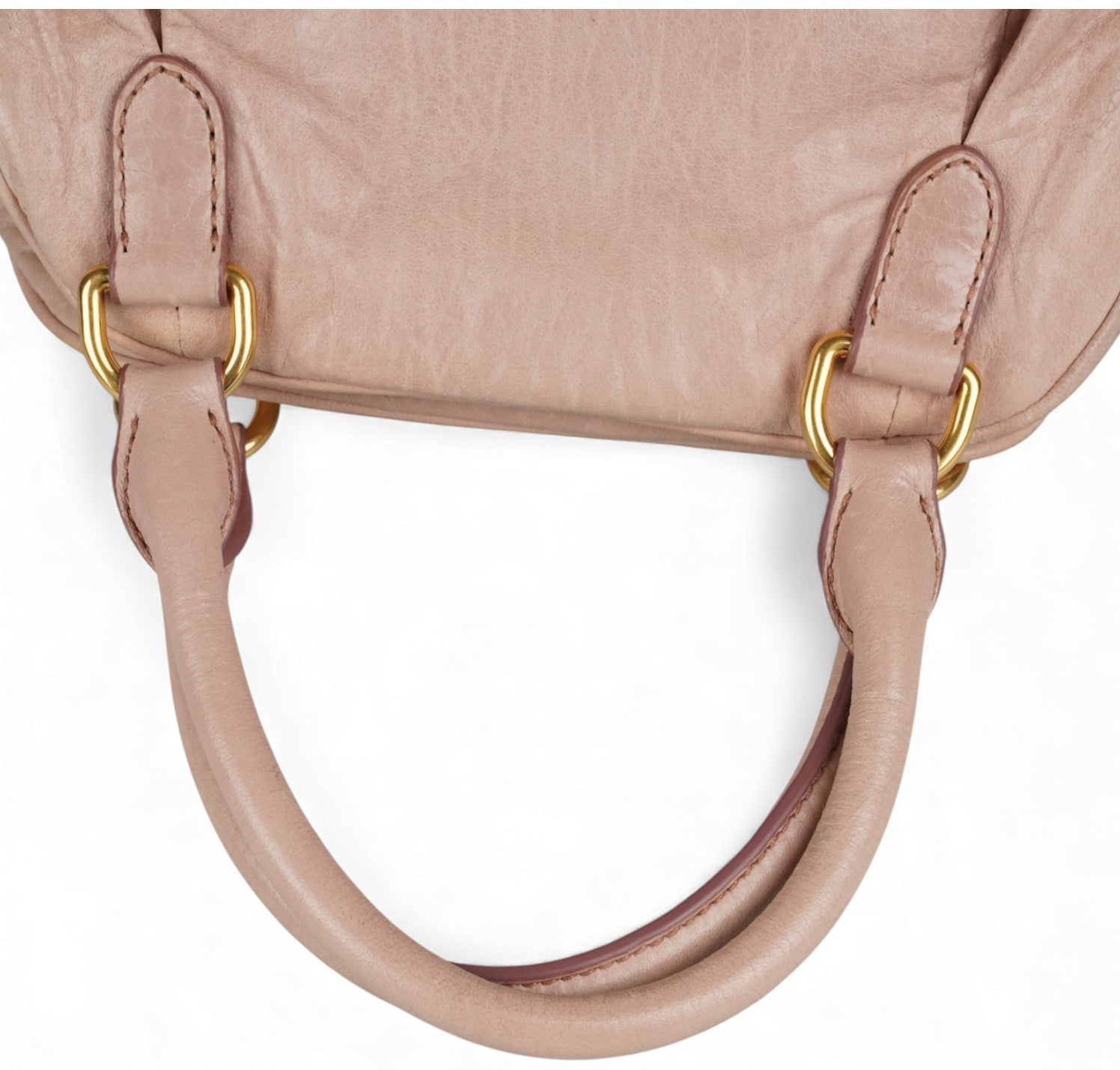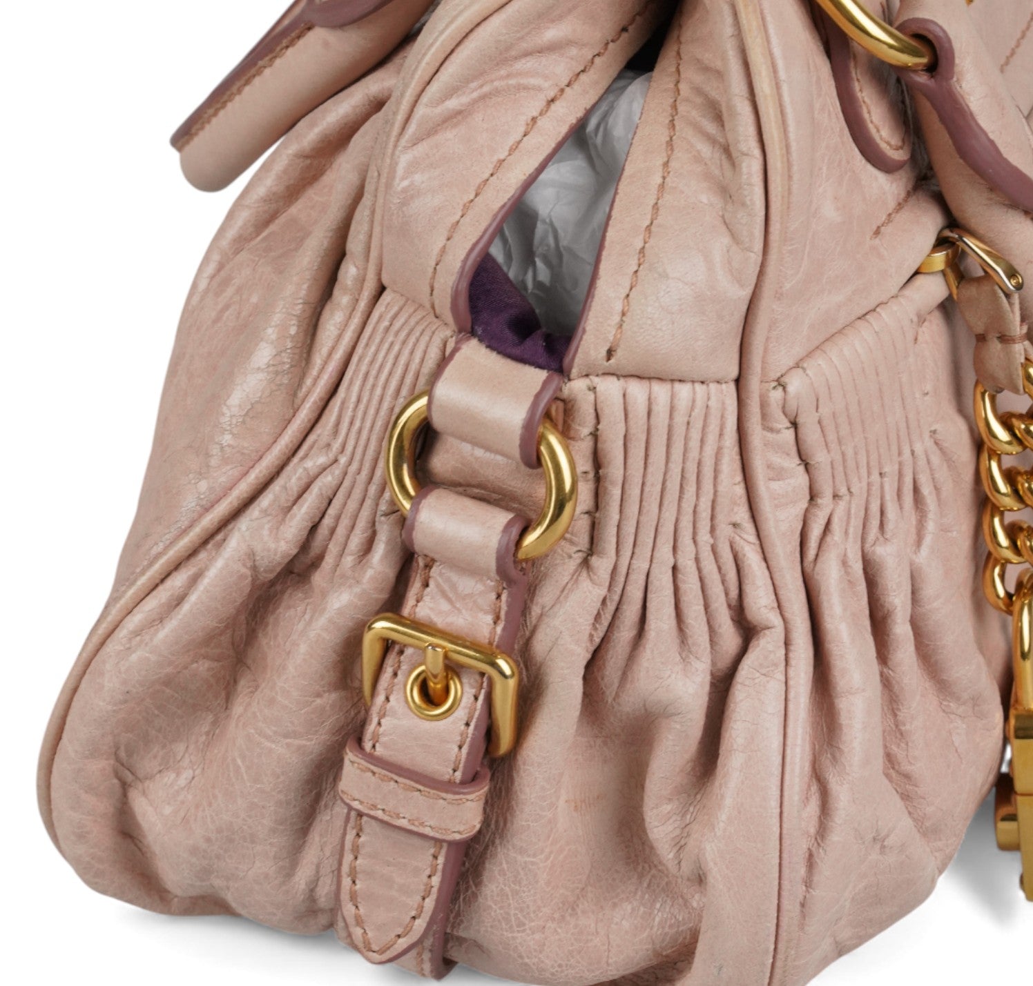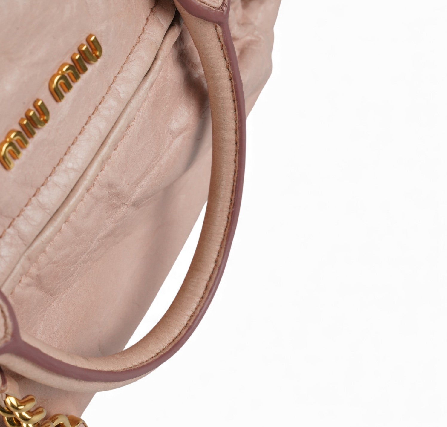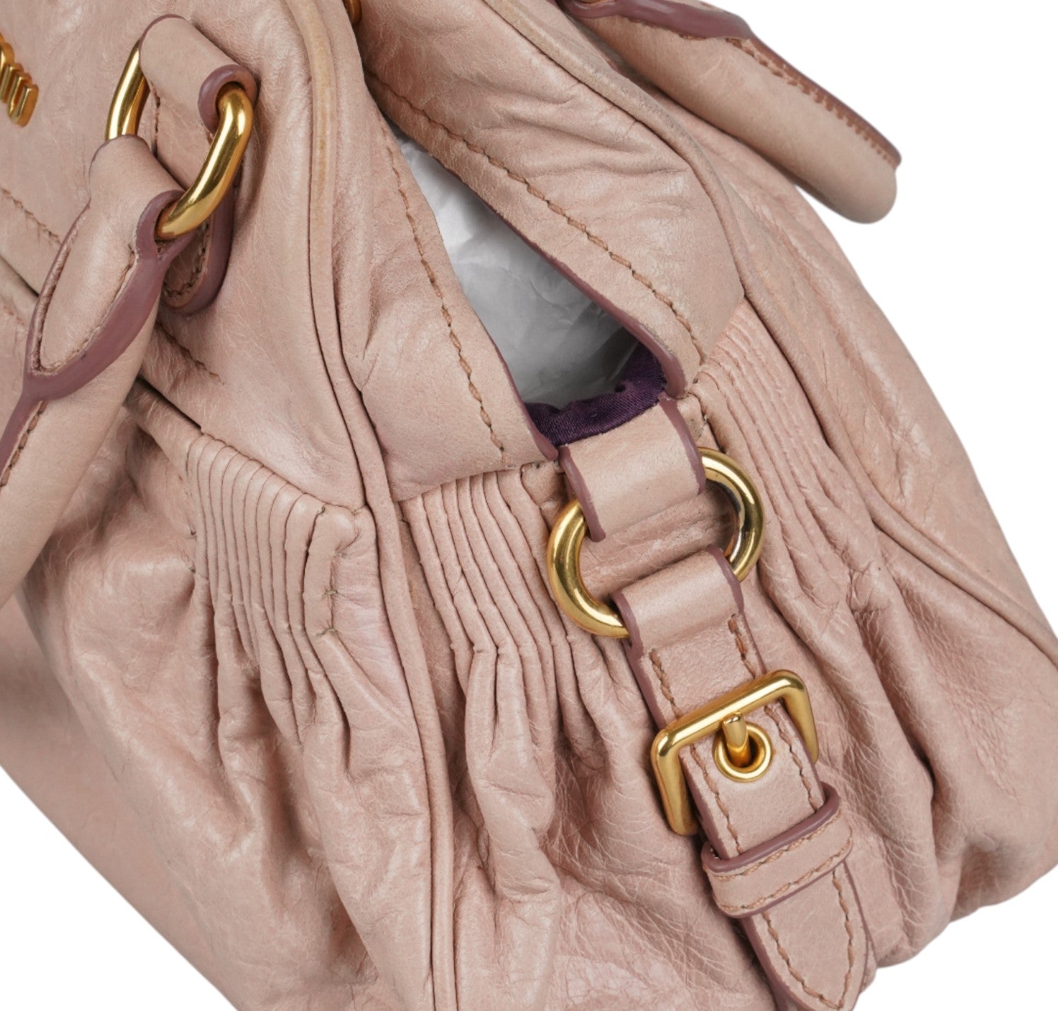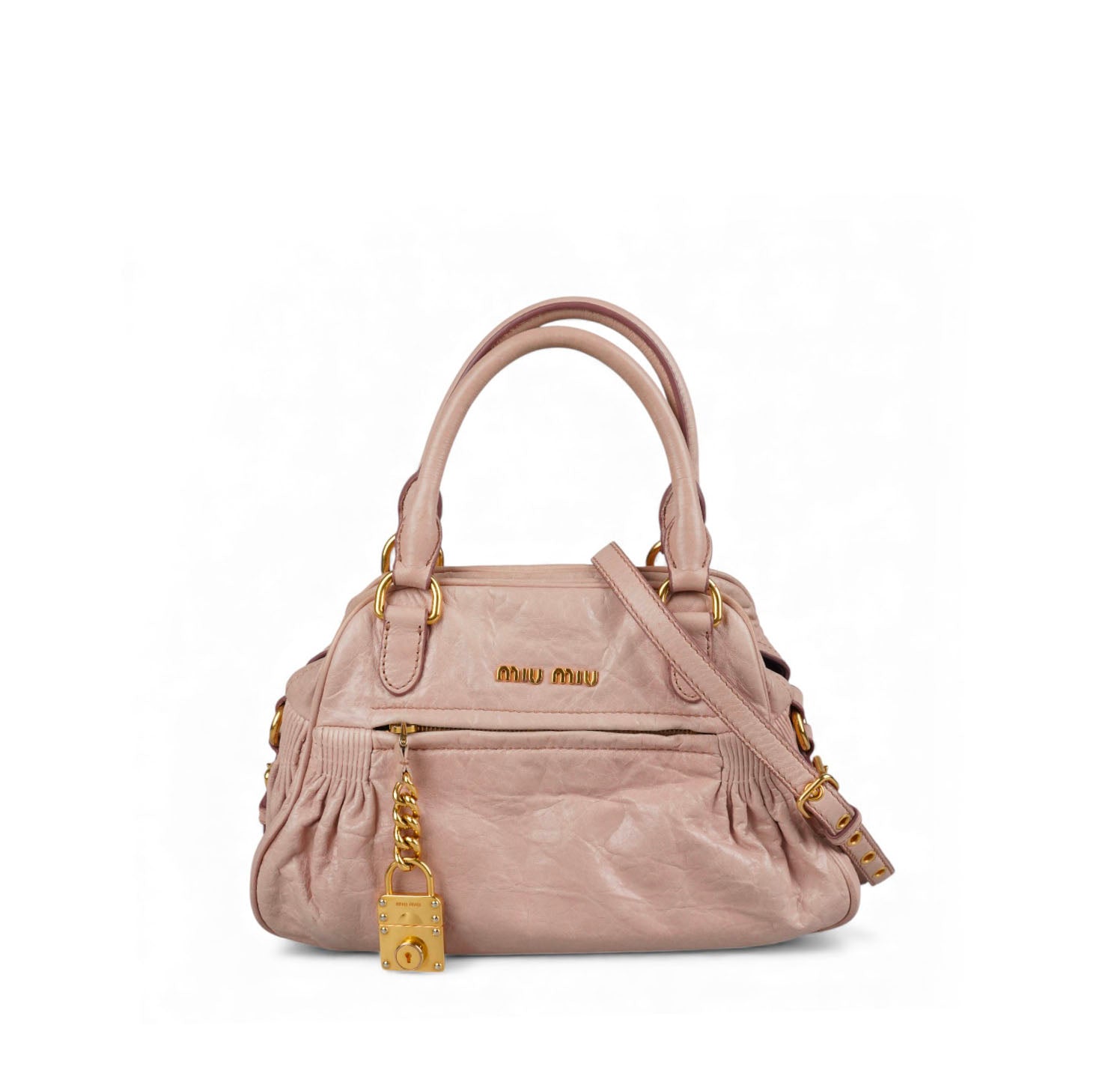 Borsa Miu Miu, modello 2 Way, realizzata in morbida pelle “shine” color Cipria con dettagli arricciati laterali e charm lucchetto dorato frontale. Metalleria in finitura oro, doppi manici superiori e tracolla regolabile e rimovibile per portabilità a mano o a spalla. Tasca frontale con zip, interno foderato in tessuto viola con scomparto capiente ideale per uso quotidiano. Piedini metallici di protezione sul fondo. Chiusura superiore a pressione. Minimi segni d’uso sulla pelle, minimi segni d'uso metalleria, micrograffi. Condizioni complessive ottime.
