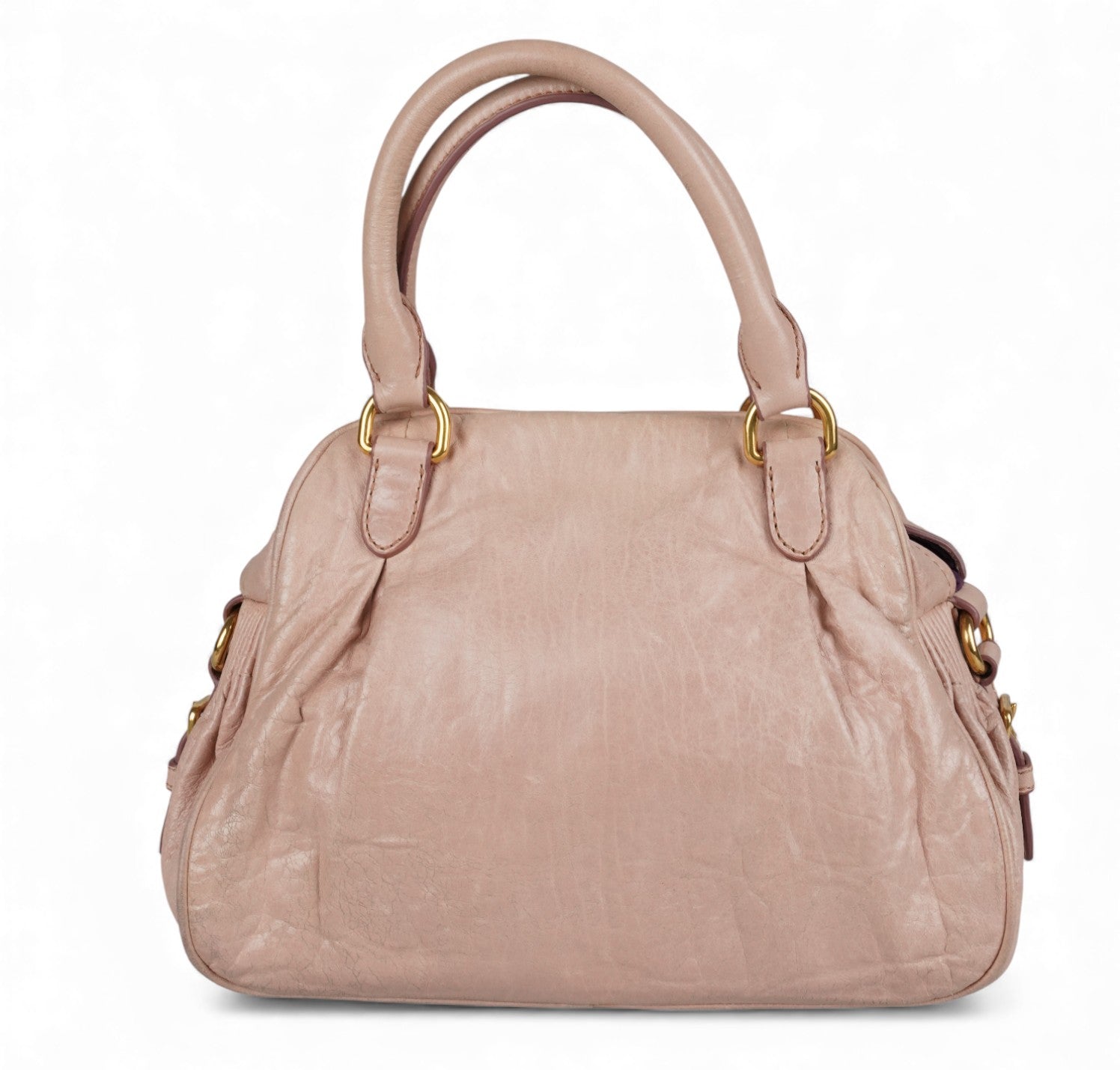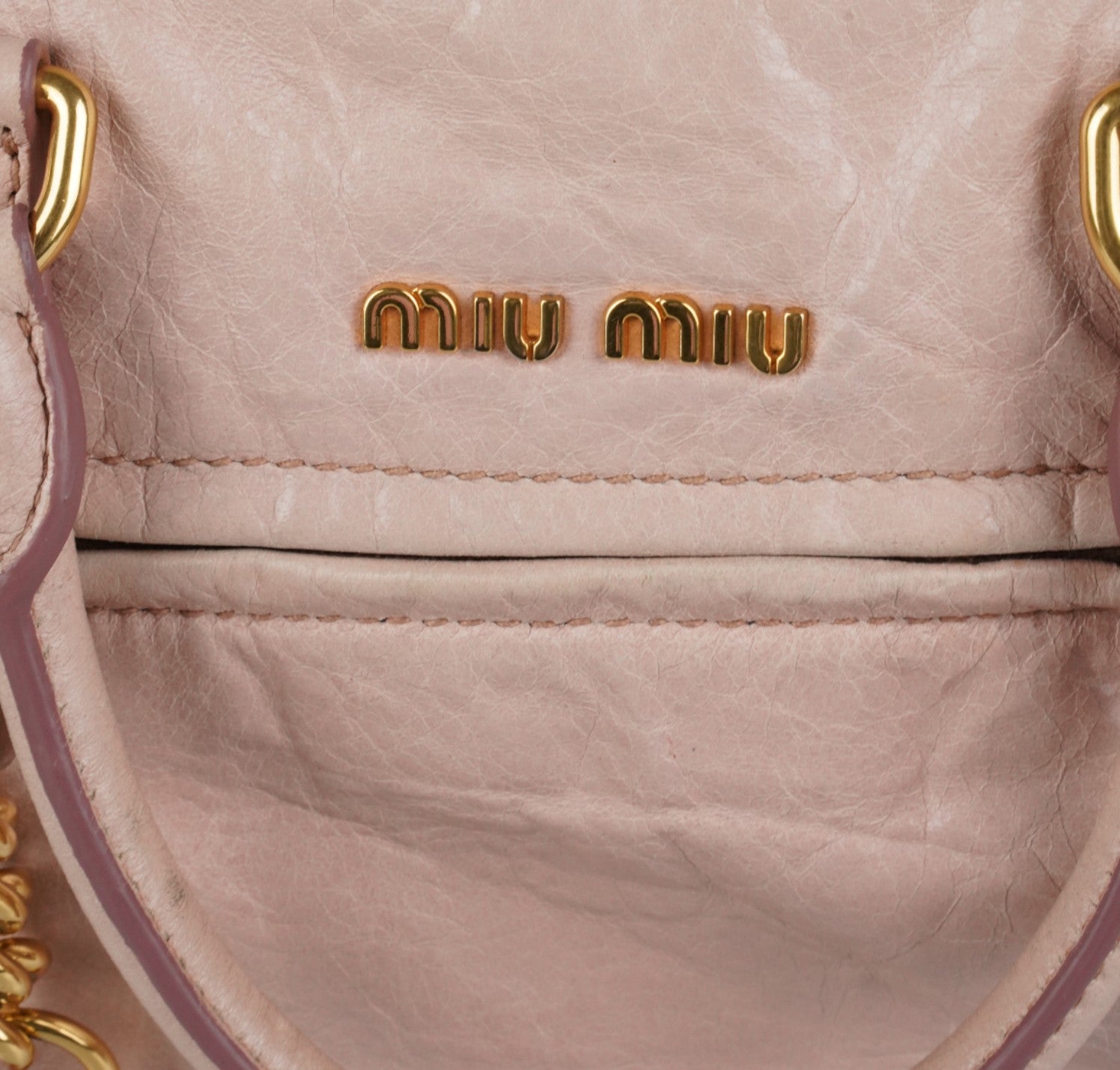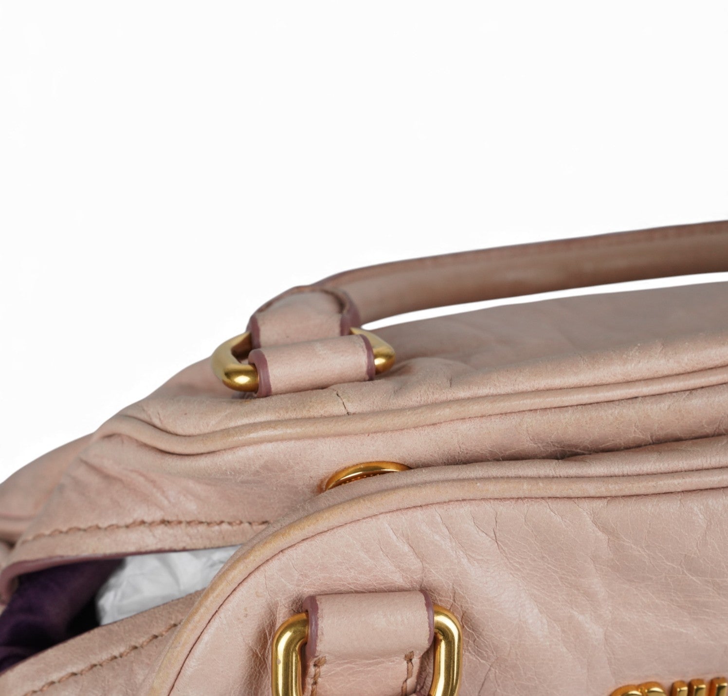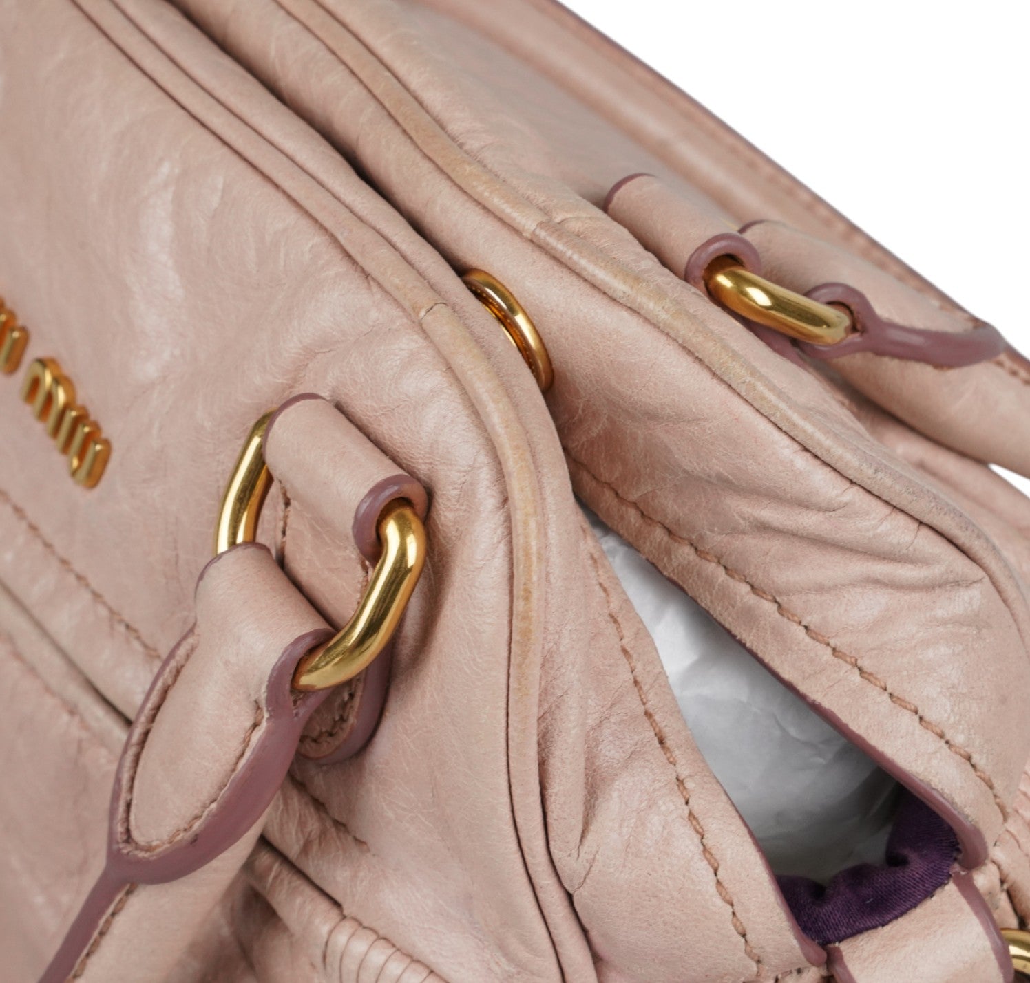 Borsa Miu Miu, modello 2 Way, realizzata in morbida pelle “shine” color Cipria con dettagli arricciati laterali e charm lucchetto dorato frontale. Metalleria in finitura oro, doppi manici superiori e tracolla regolabile e rimovibile per portabilità a mano o a spalla. Tasca frontale con zip, interno foderato in tessuto viola con scomparto capiente ideale per uso quotidiano. Piedini metallici di protezione sul fondo. Chiusura superiore a pressione. Minimi segni d’uso sulla pelle, minimi segni d'uso metalleria, micrograffi. Condizioni complessive ottime.